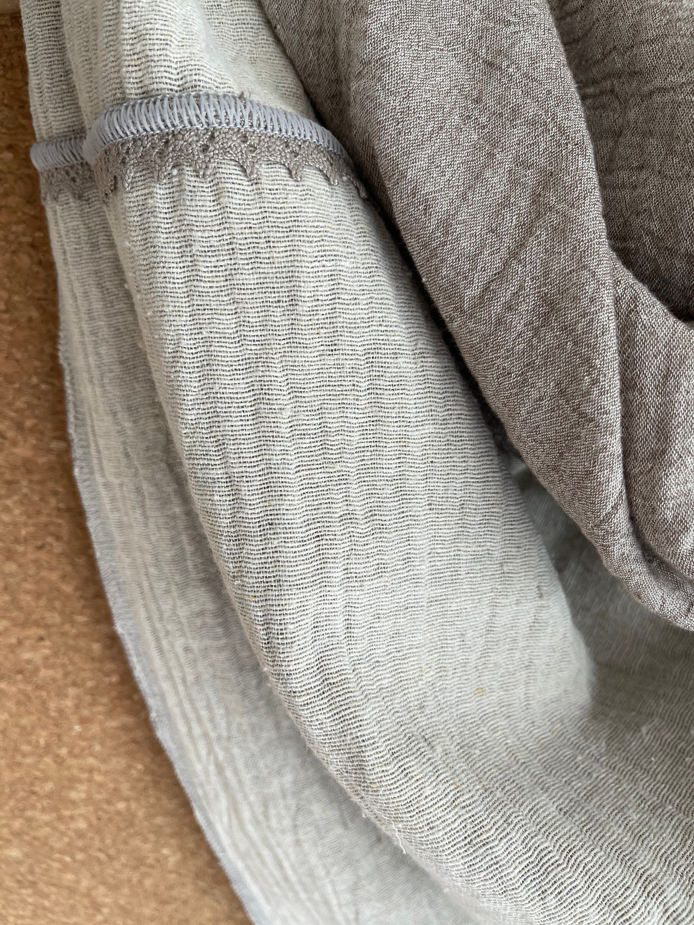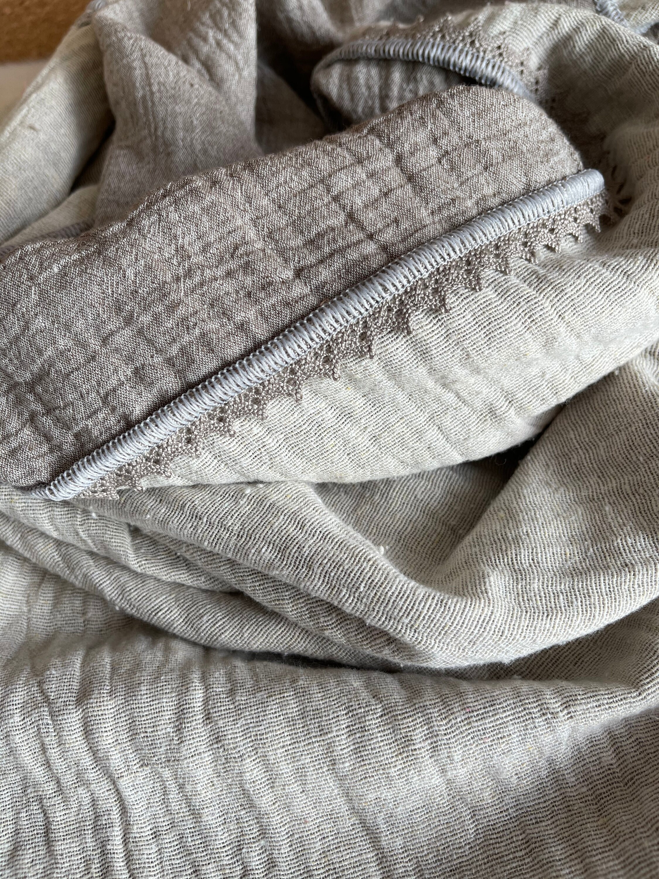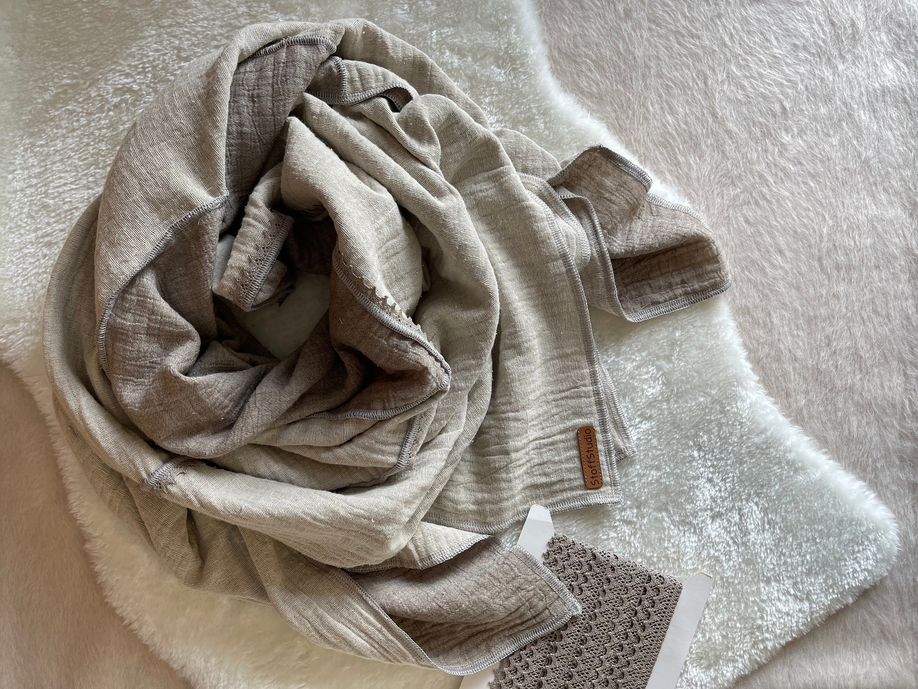 Modisches, extra großes Musselintuch vielseitig einsetzbar als Halstuch, Strandtuch, Krabbeldecke und Kuscheldecke. Die Overlocknähte aus Bauschgarn sorgen für einen tollen, individuellen Look.