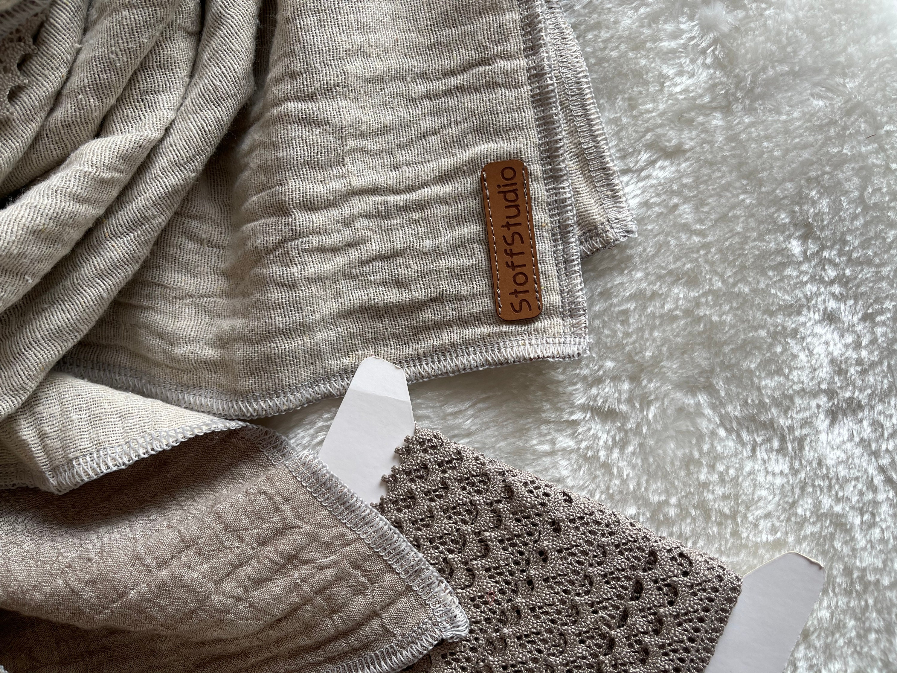 Der Musselin mit seinem super weichen und geschmeidigen Griff besteht zu 100% aus Baumwolle. Die einzelnen Teile werden per Hand fadengerade zugeschnitten und auf unseren Babylocks in liebevoller Handarbeit zusammengenäht.