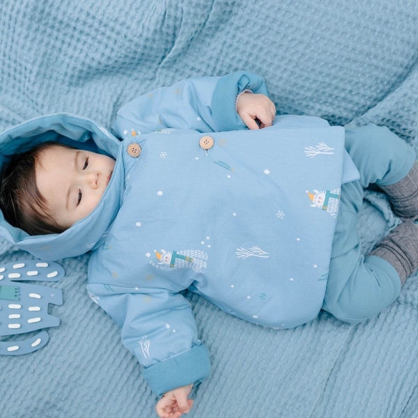 Stoff aus 100% Baumwolle mit Motiven von Yetis und Schneemännern auf blauem Grund. Toll für winterliche Accessoires wie Taschen, Kissen, Geschenke und Accessoires.