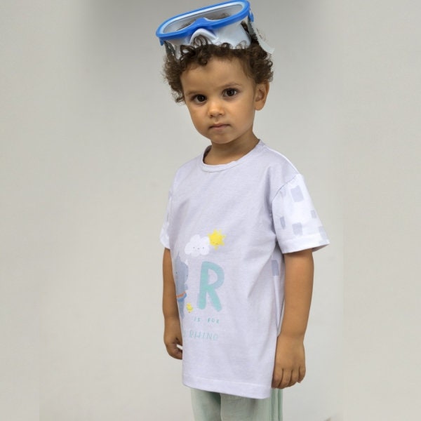 Grey sweat with a large rhinoceros, cloud, sun, and cows and the saying "R is for HAPPY RHINO" is perfect for a front piece.