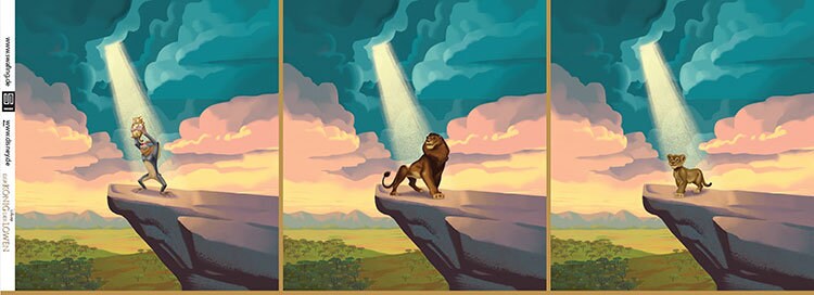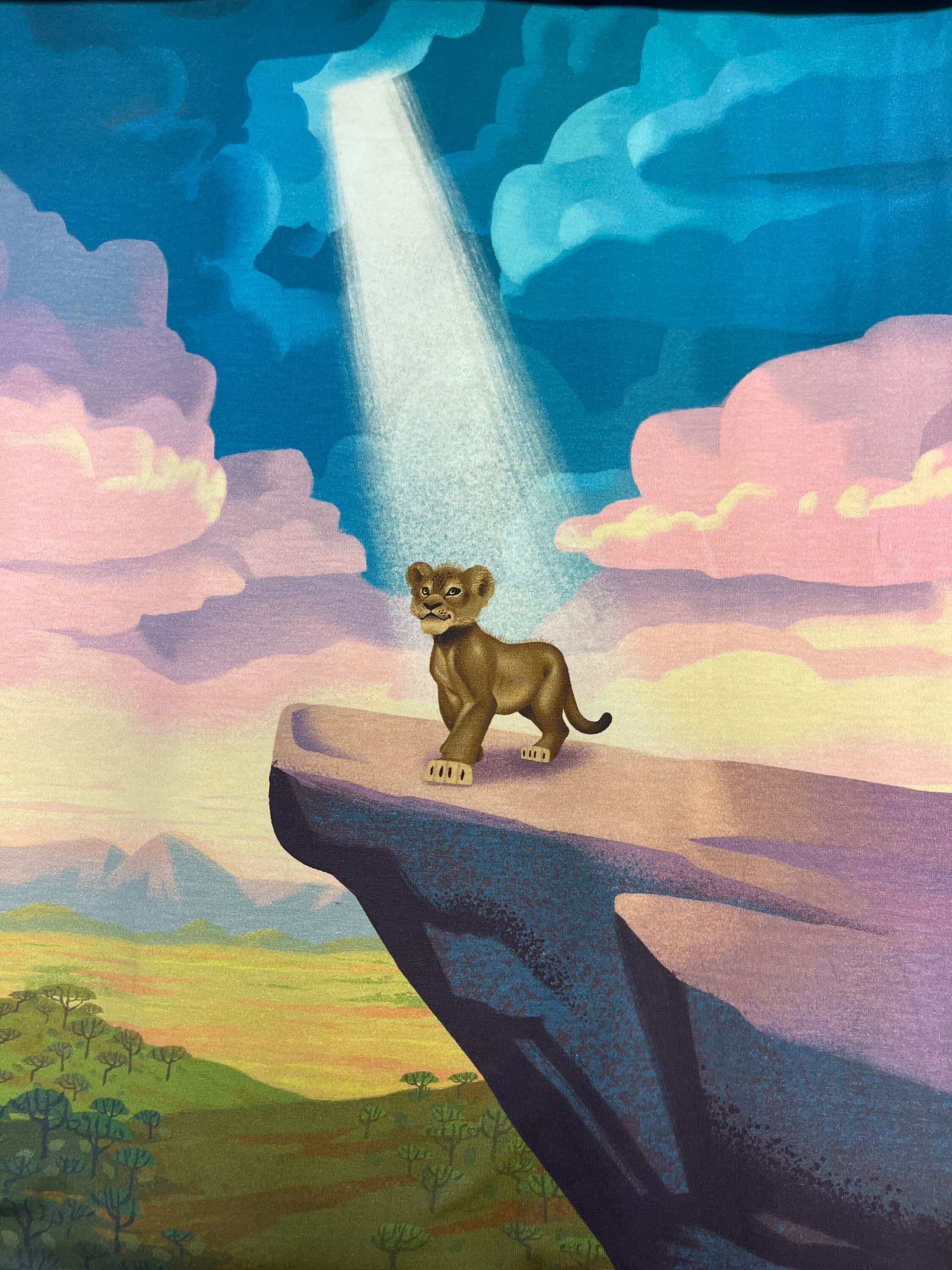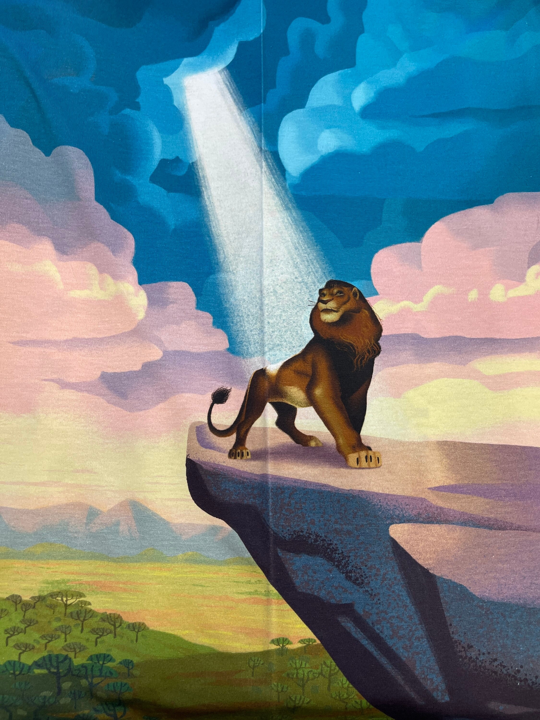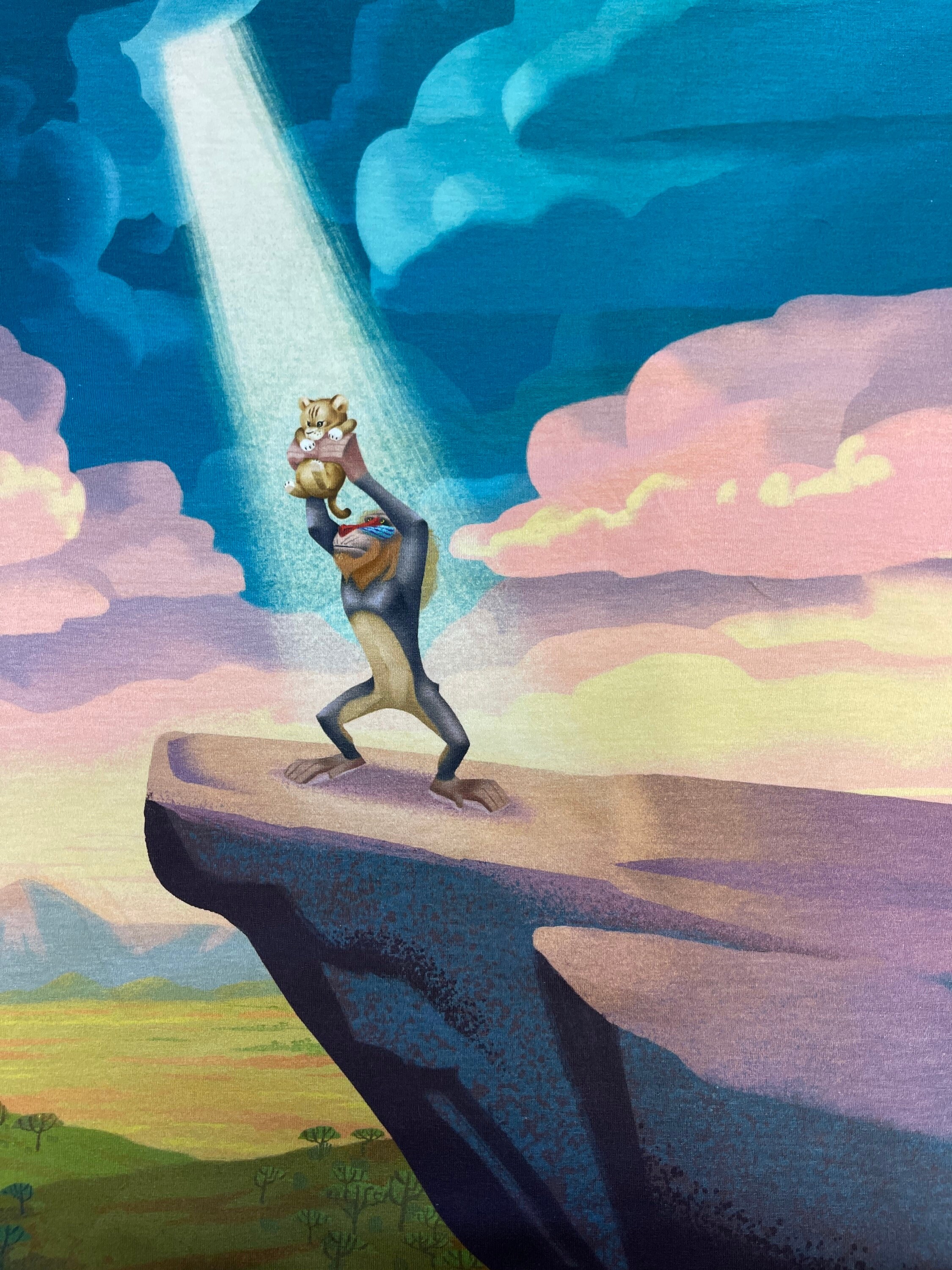 Auf jedem Panel Abschnitt ist Simba in einem anderen Alter, auch die berühmte Szene wie er dem Folk gezeigt wird ist dabei.
