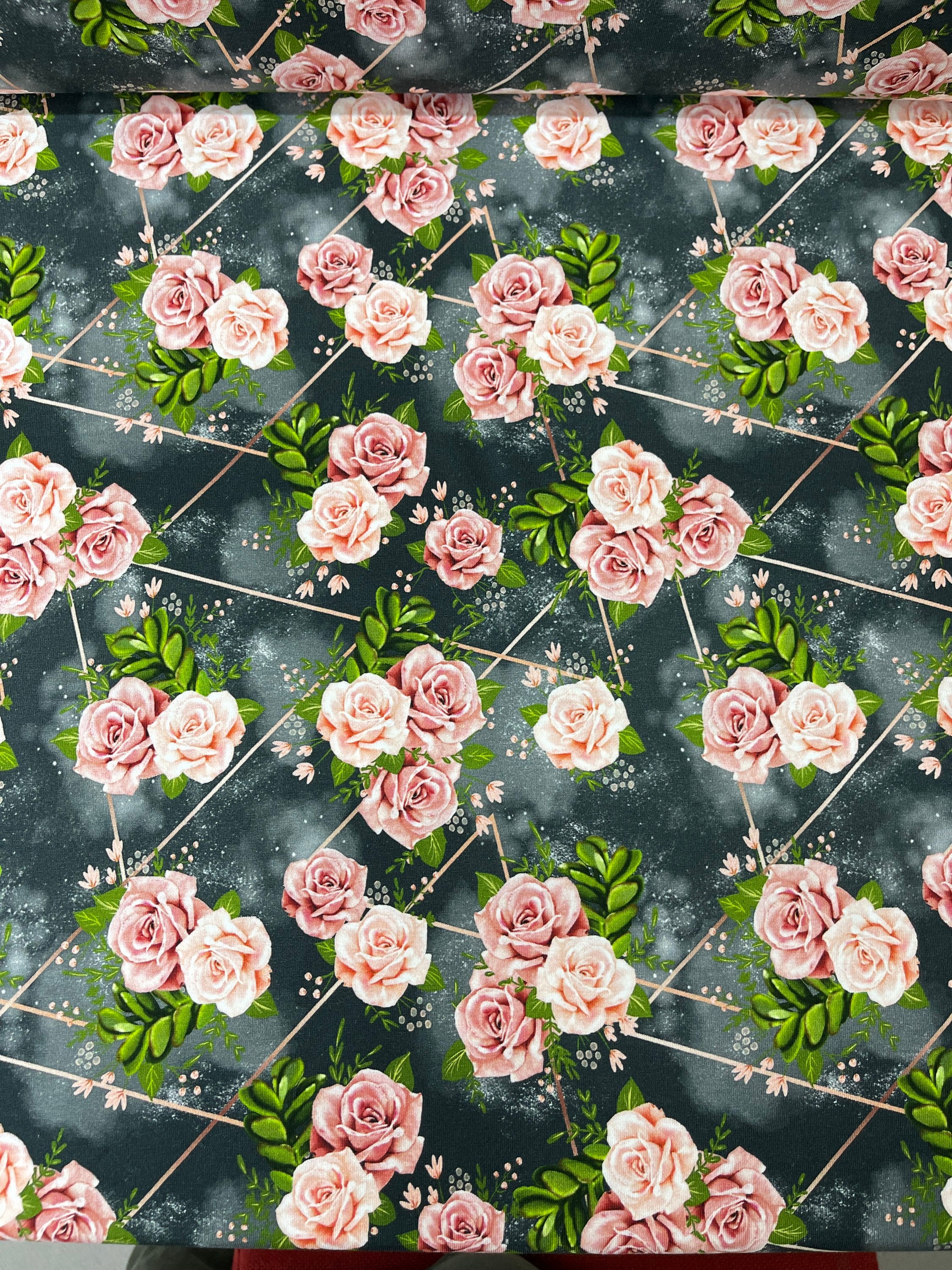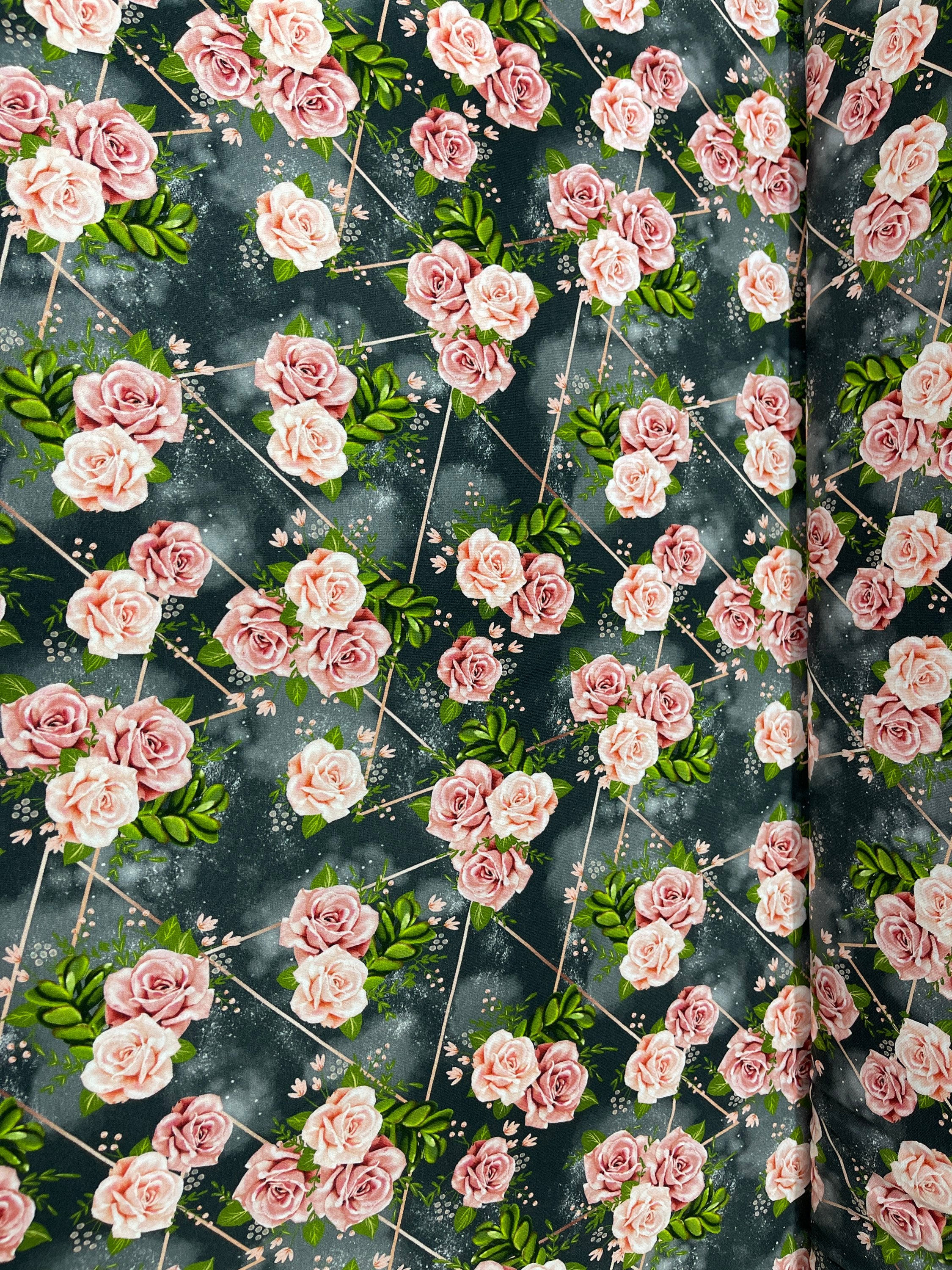 Der Jersey zeigt ein rosanes Rosenmuster mit grünen Blättern auf grauem Untergrund.