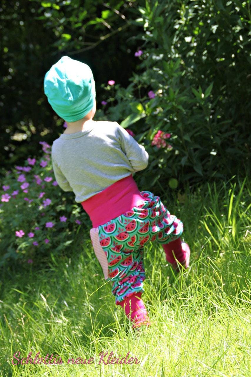 Discover the Lybstes. Bloomers 1.0 – an absolute must-have for little diaper-wearing bottoms! These comfortable bloomers offer your little ones maximum freedom of movement for kicking and romping. With an extra-wide waistband to keep the tummy and kidneys nice and warm, as well as extra-long leg cuffs, these pants are both functional and comfortable. The cut is perfect for patterned fabrics, as there are no annoying seams at the front or sides.