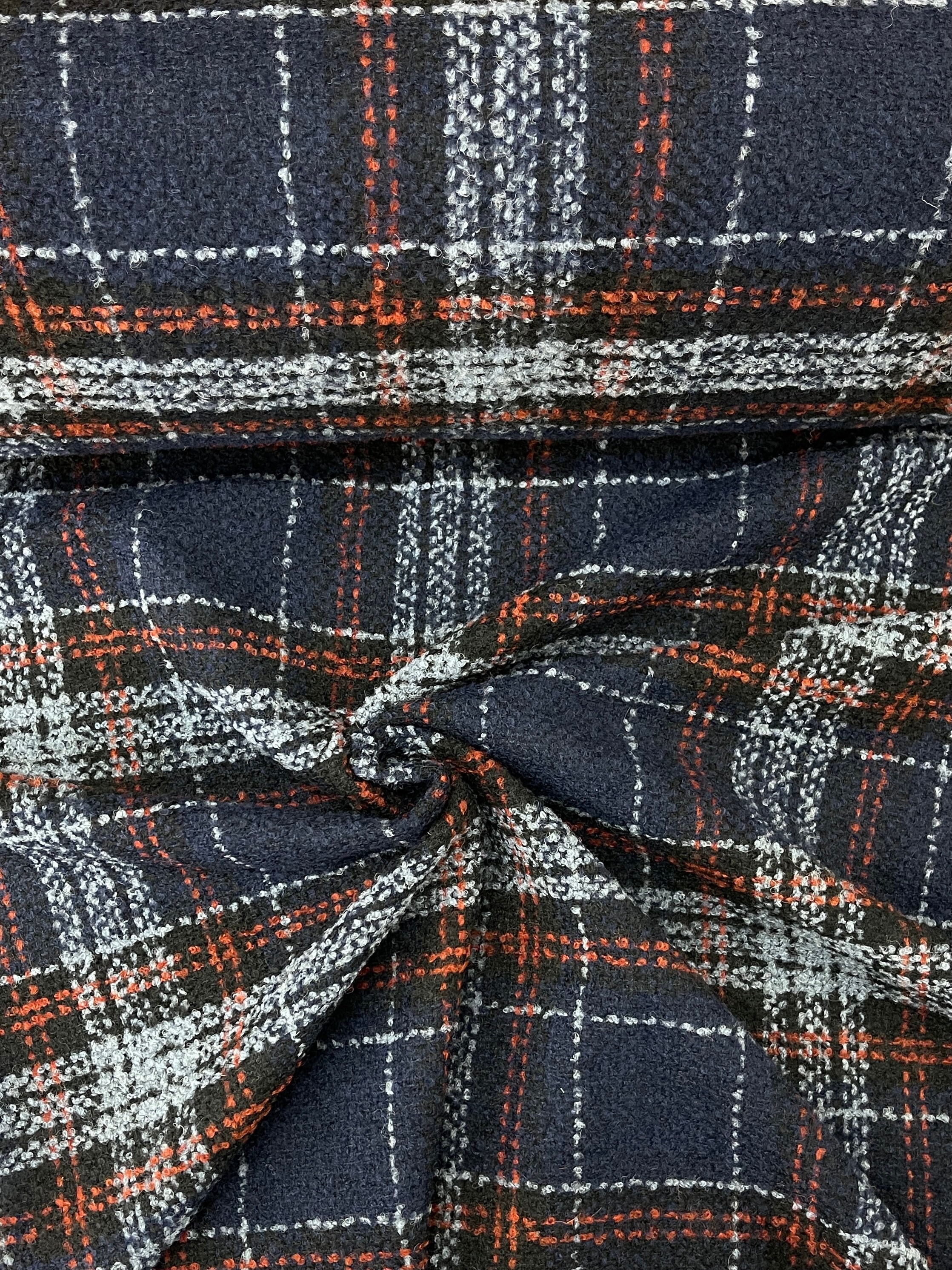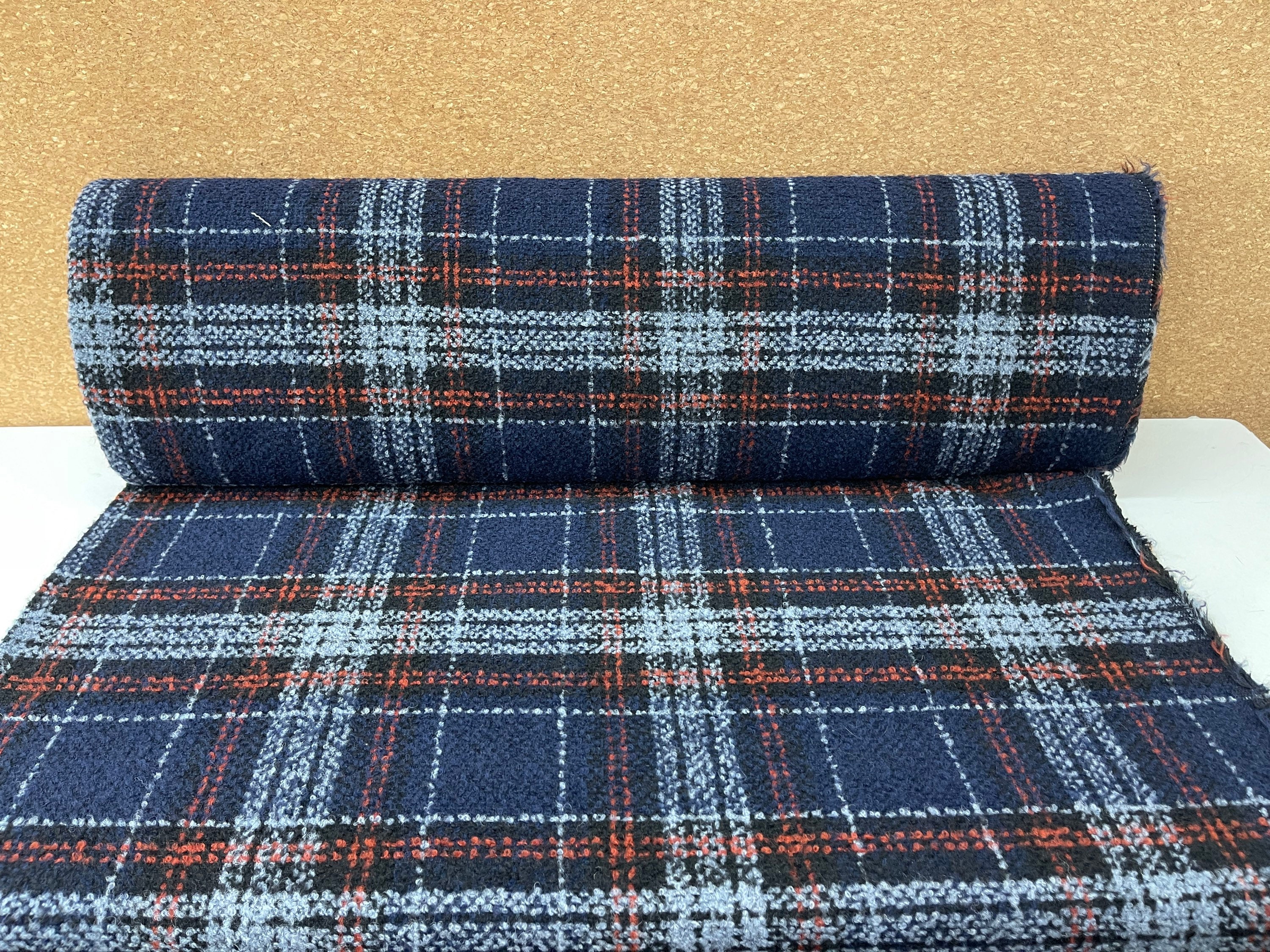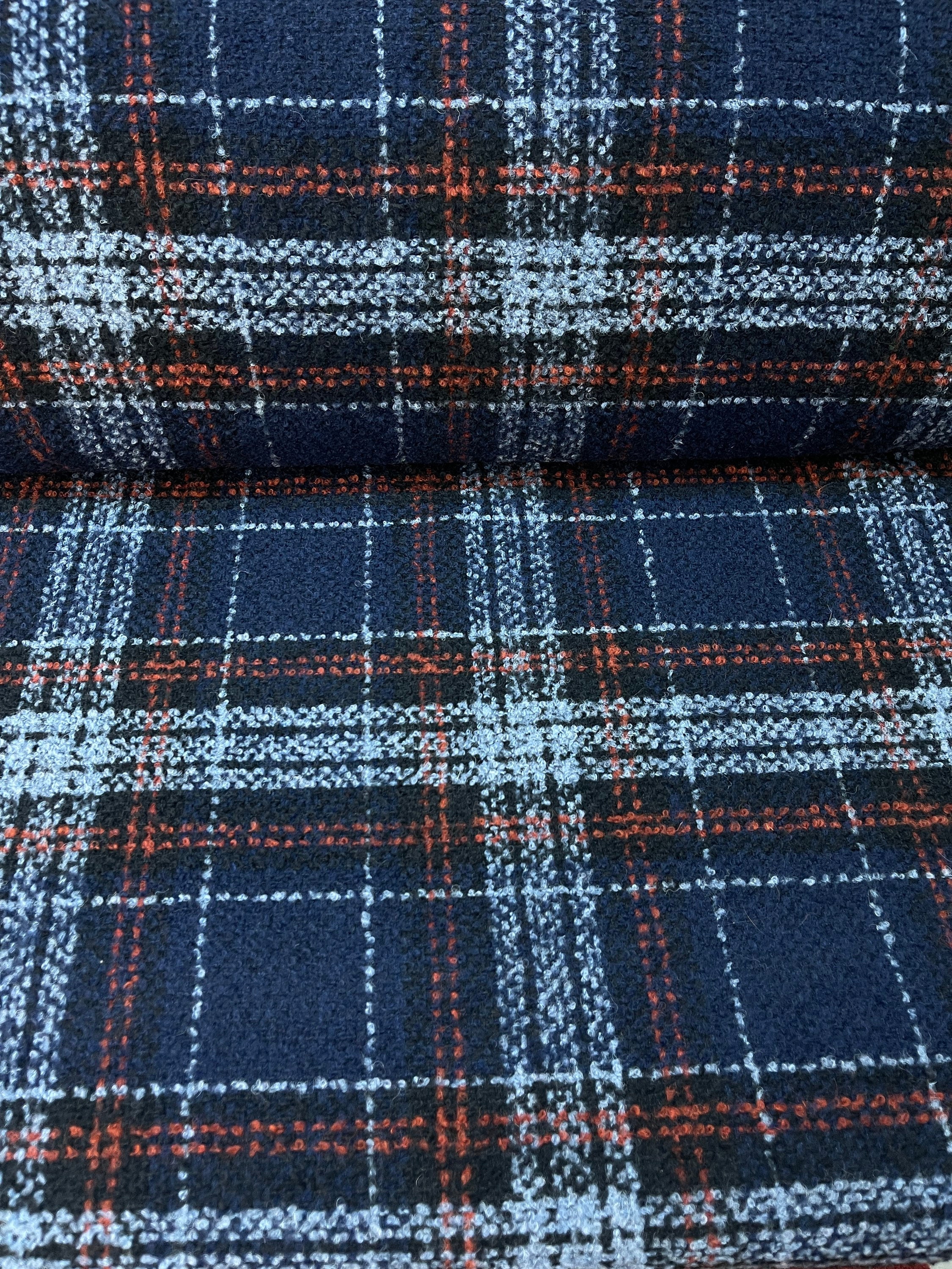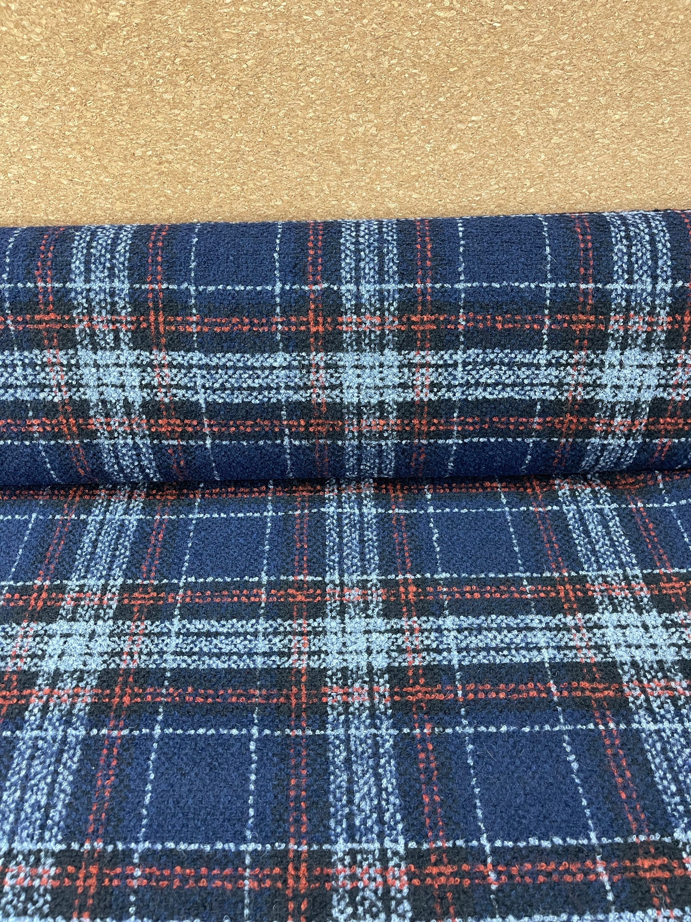 Toller karierter Mantelstoff in blau. Der Grund des Stoffes ist dunkel blau.