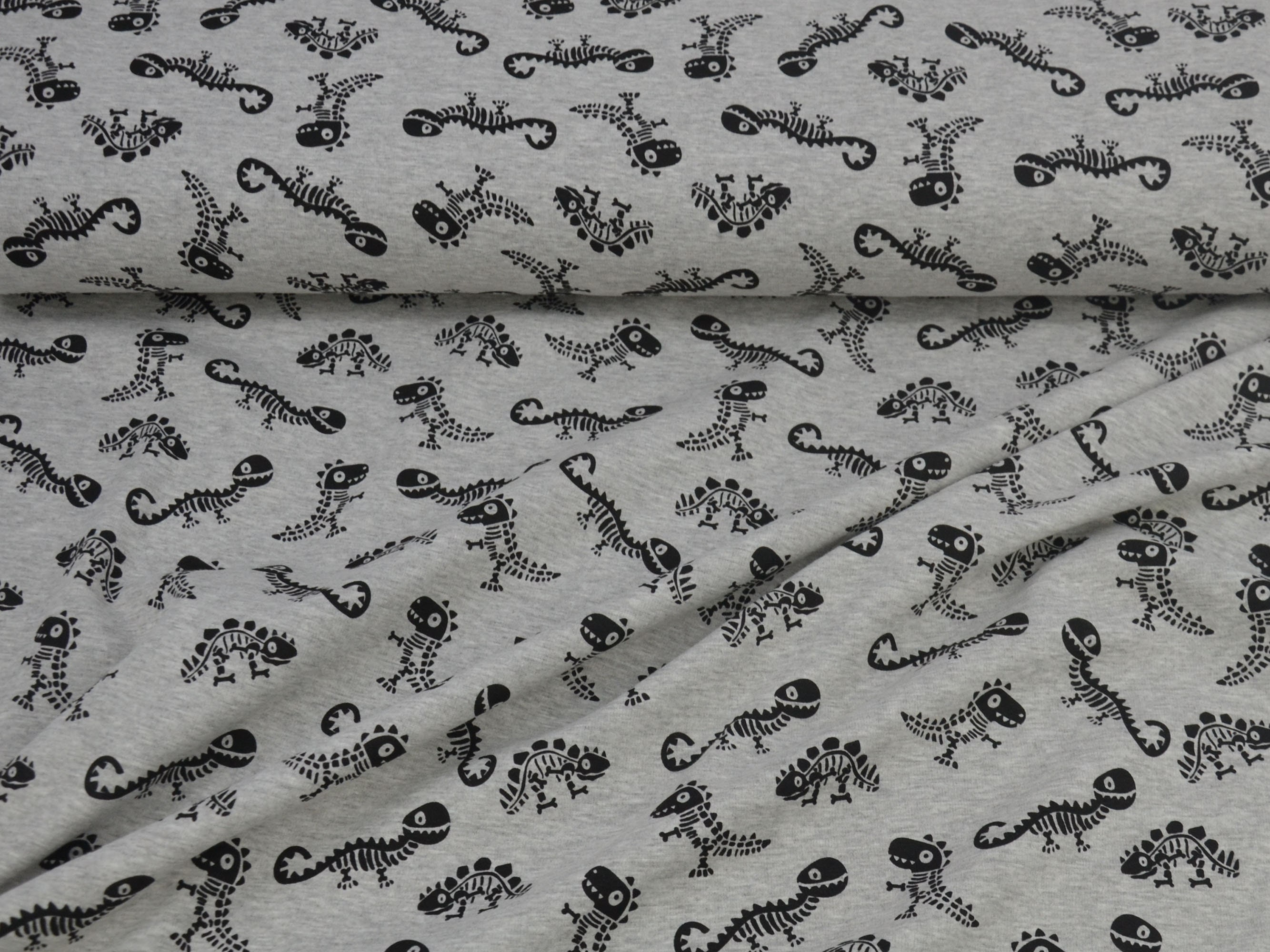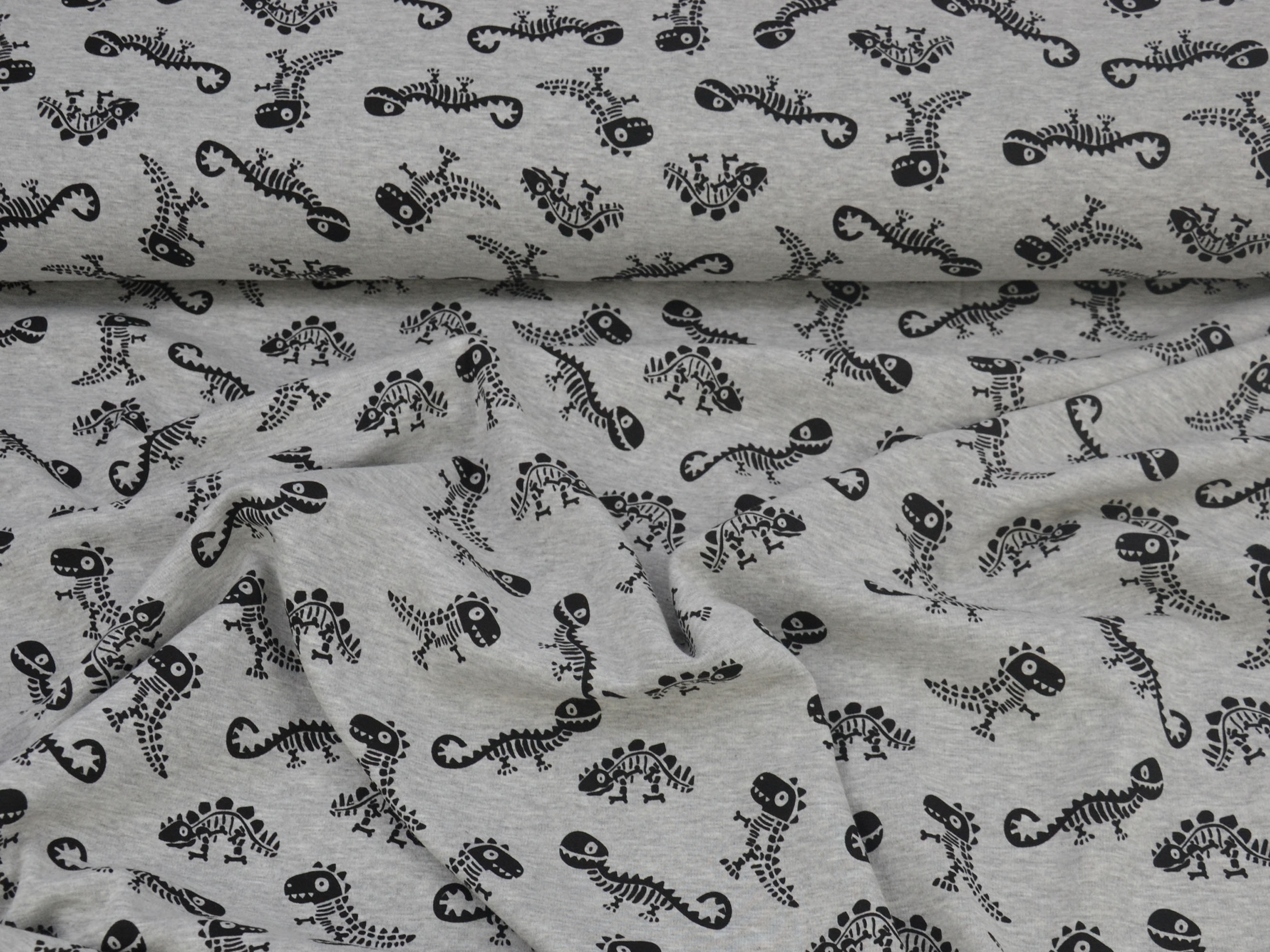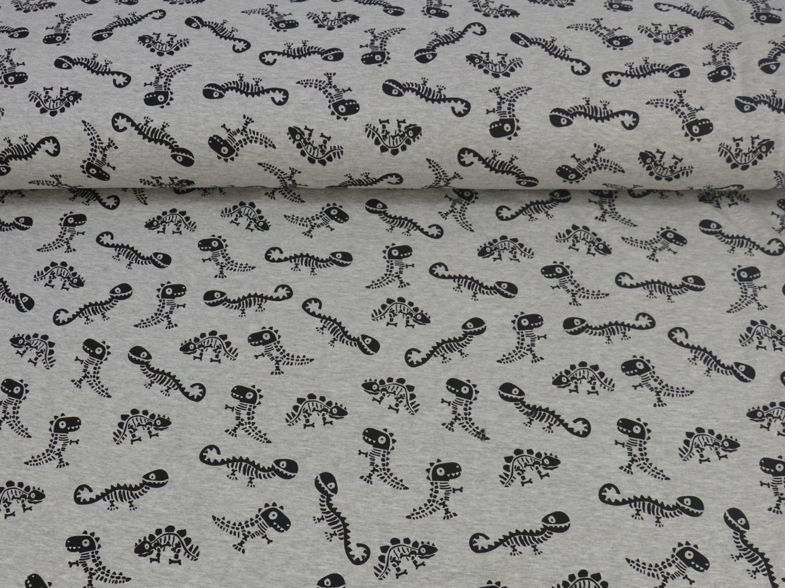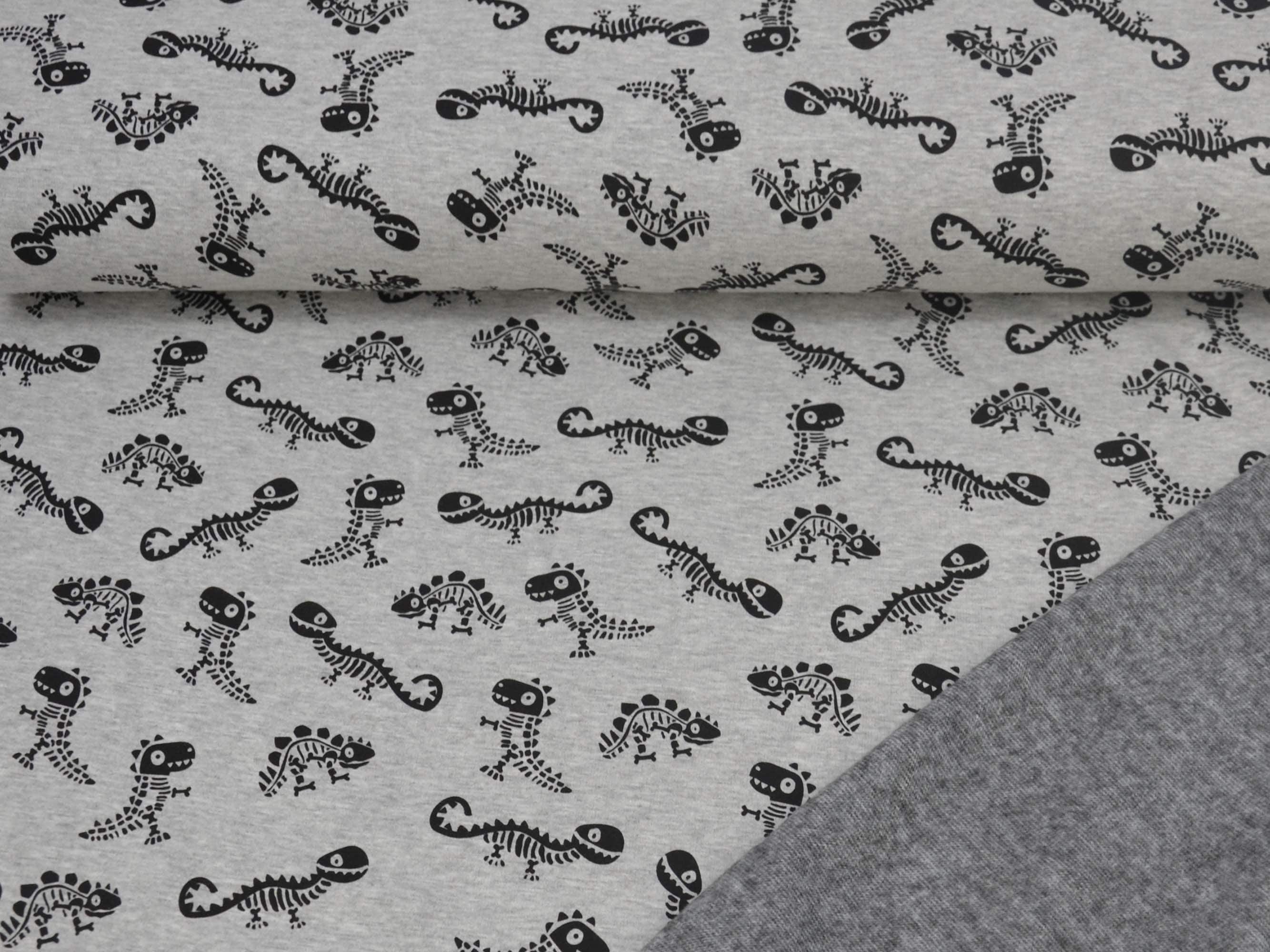 Alpine fleece with dinosaur skeletons. The fabric is mottled light gray. The inside is a slightly darker gray. Perfect for warm sweaters, scarves, sweatshirts, and much more.