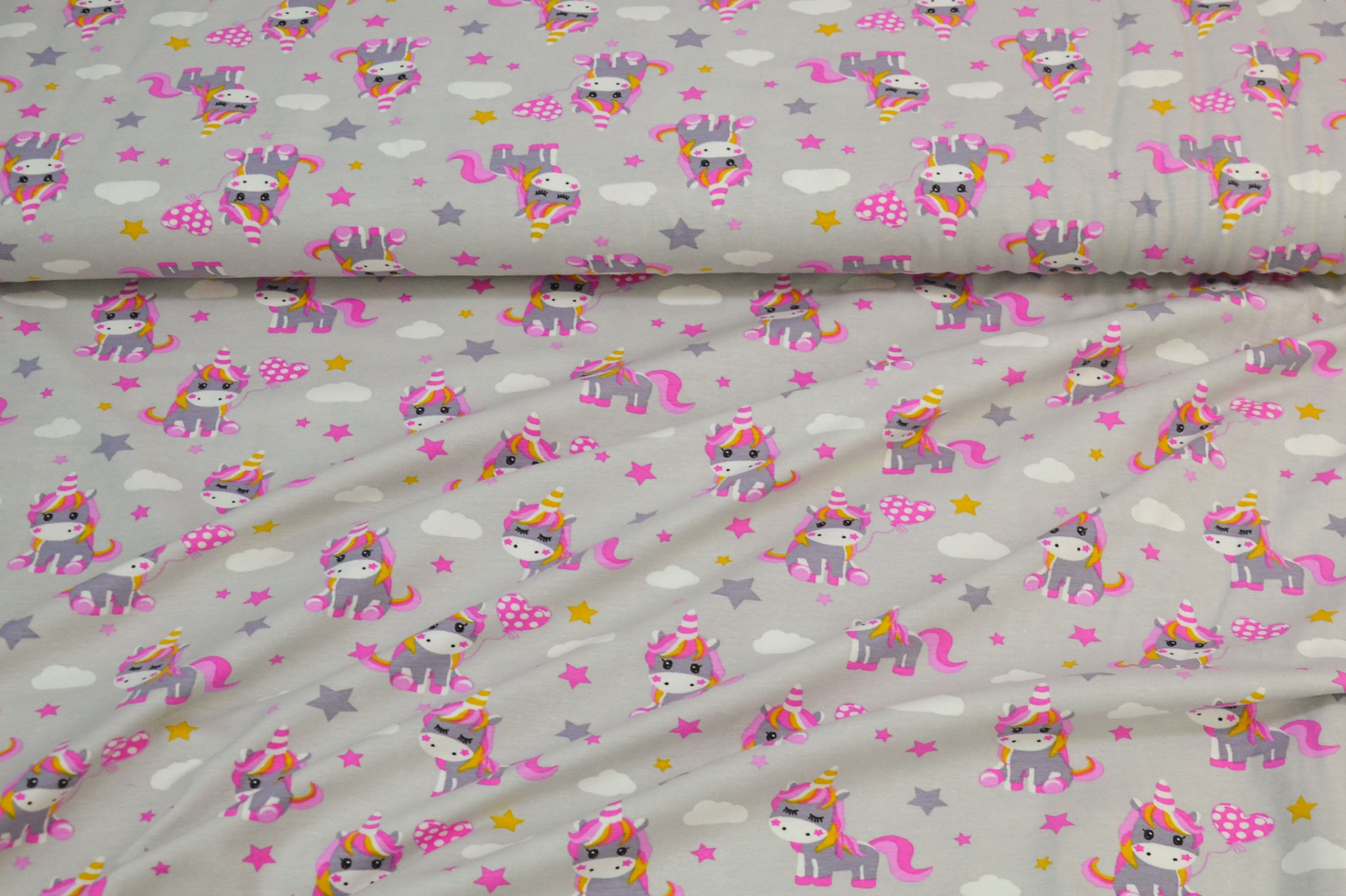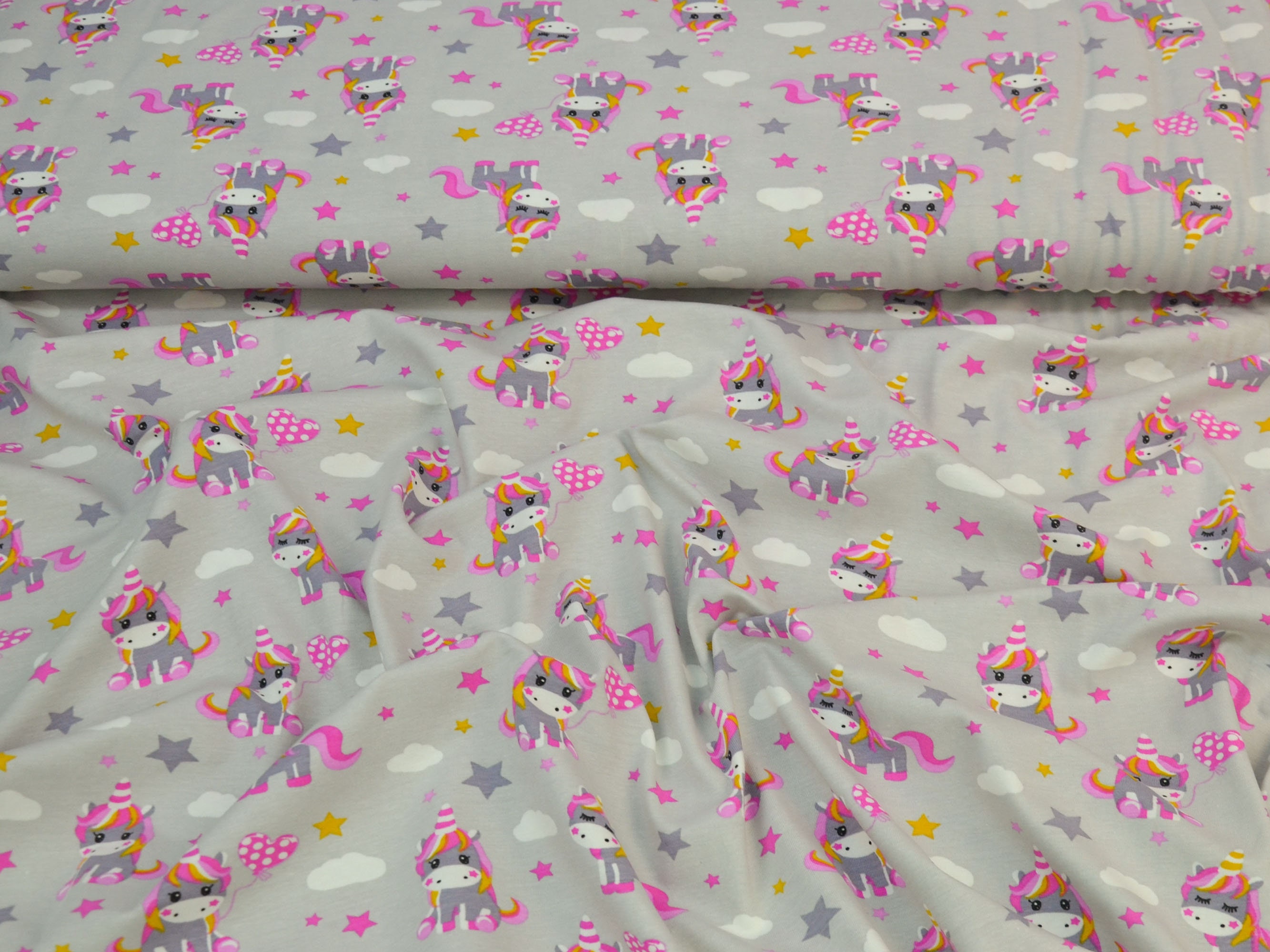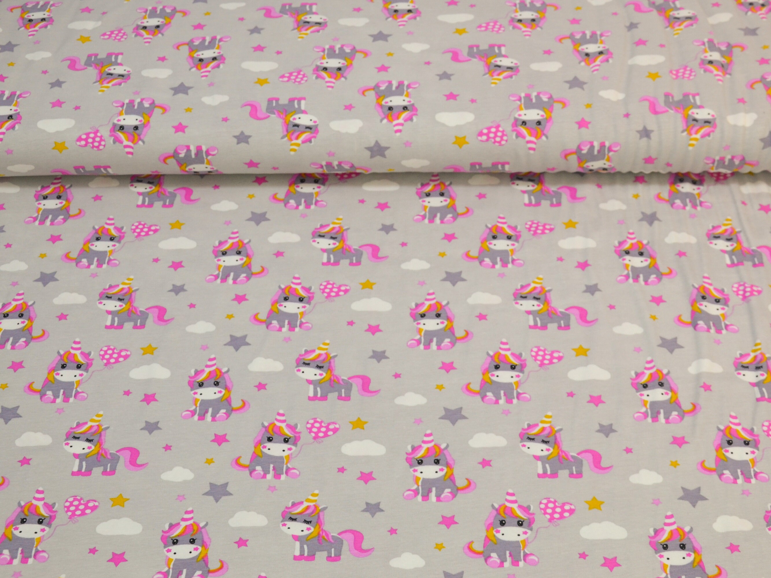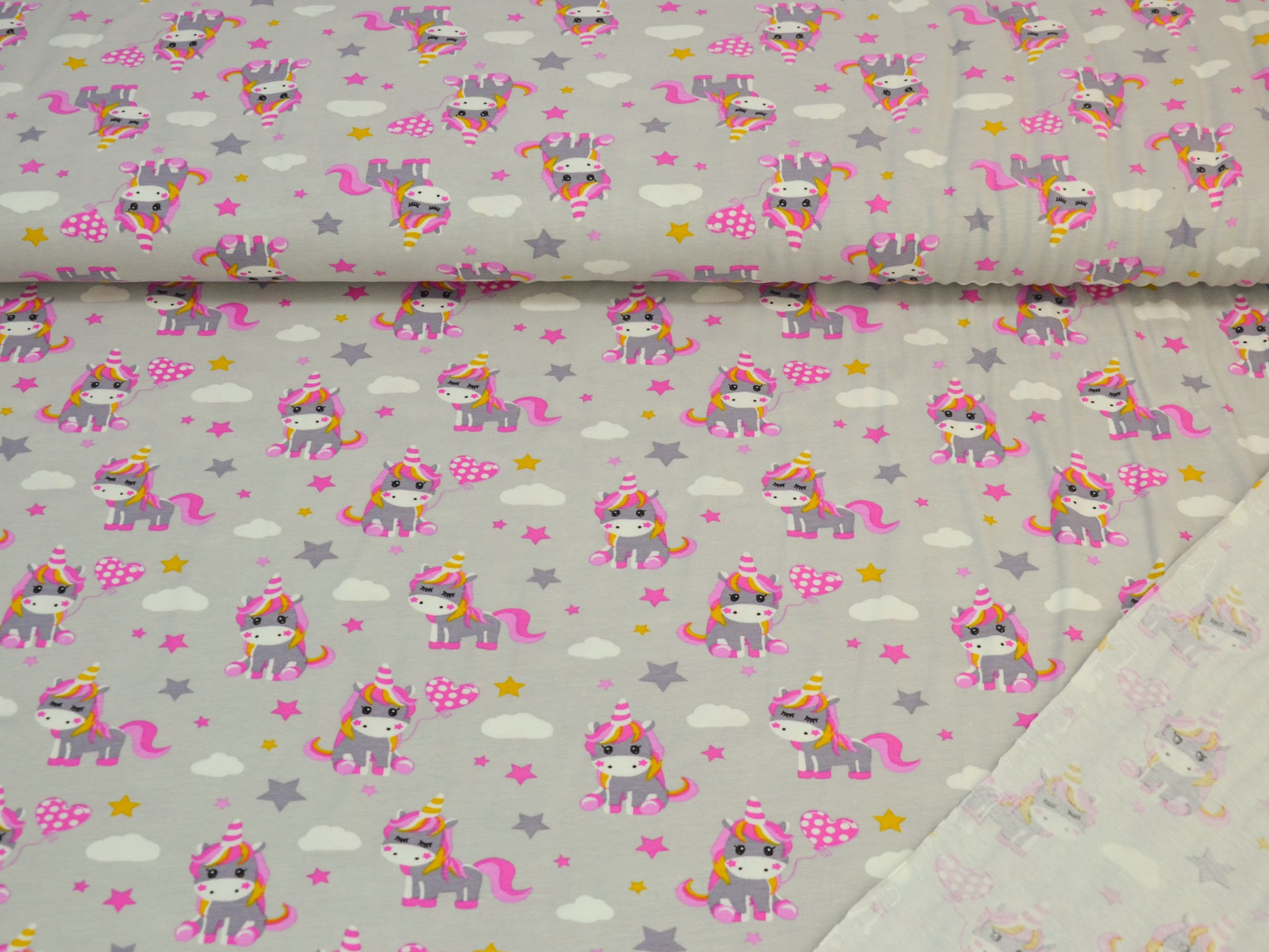 Jersey in grau mit Einhorn, Sternen, Wolken und Luftballons in Herzform. Wunderbar für T-Shirts, Schals, Mützen etc.