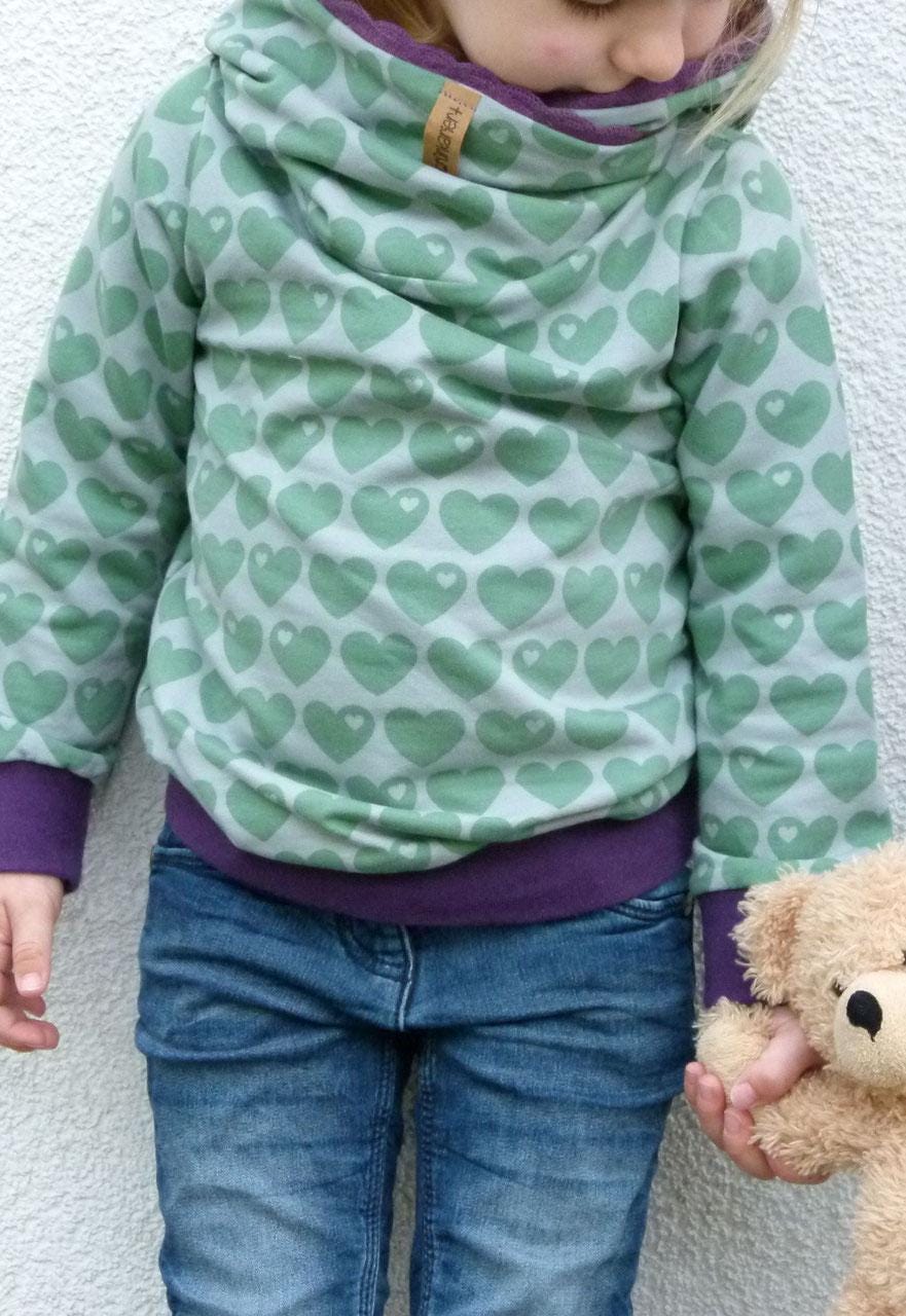 Sweat fabric and cuffs. Only use sweat fabrics with good stretch so it can be pulled over the head easily! The cut is designed for sweat fabric. If jersey is used, it will be looser and larger.