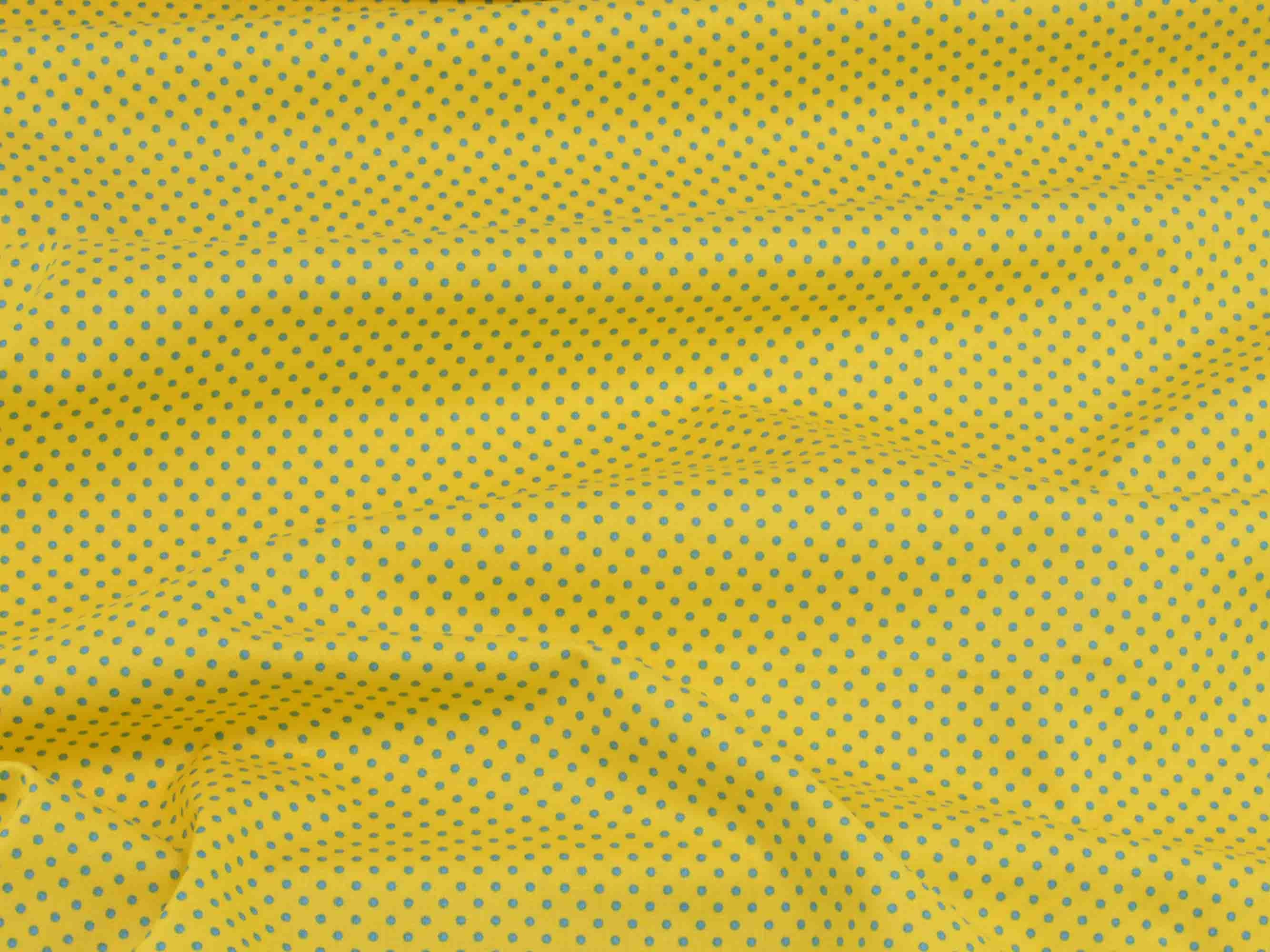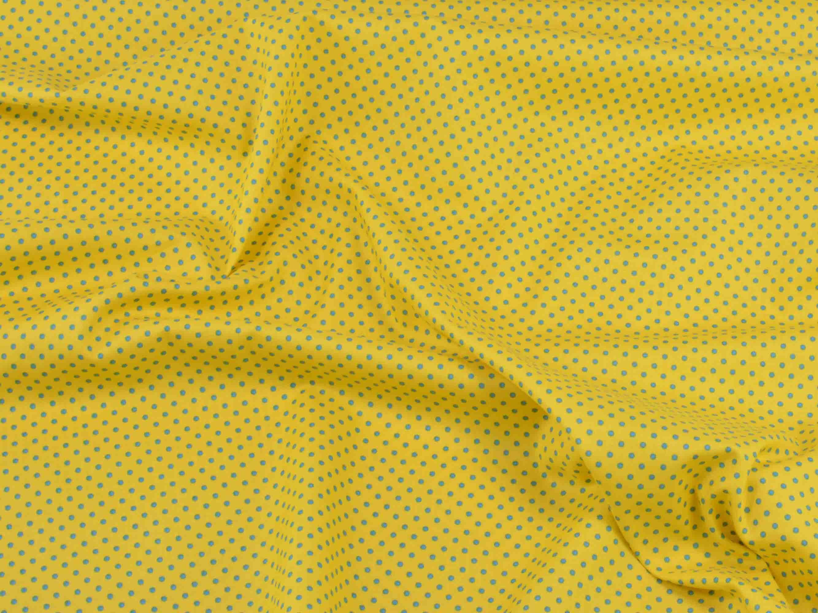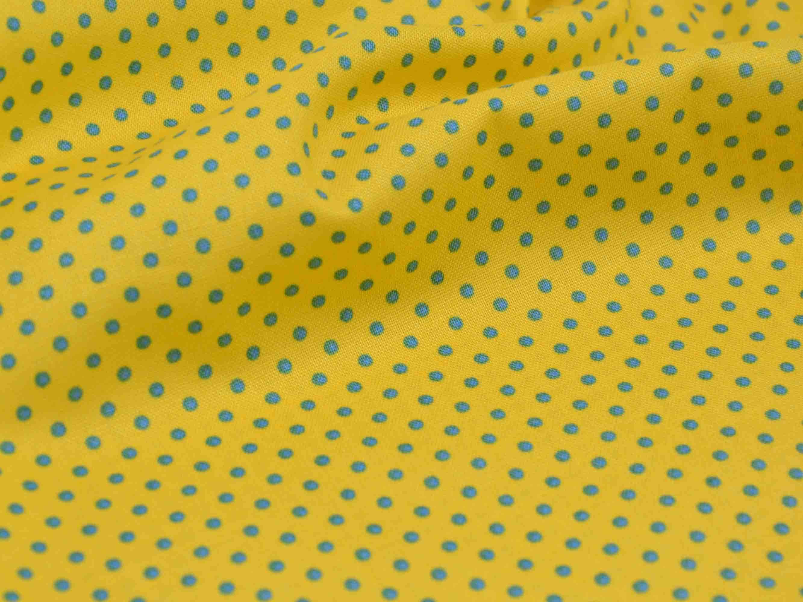Cotton fabric for patchwork with small blue dots on yellow fabric.