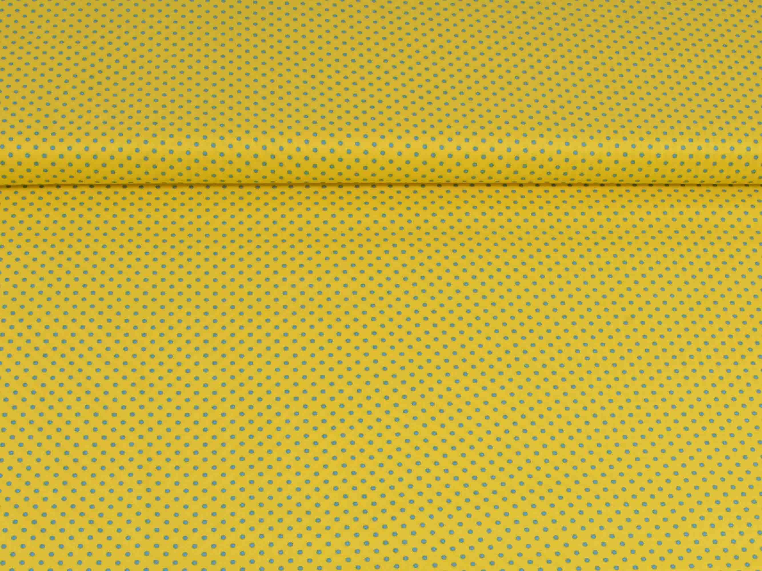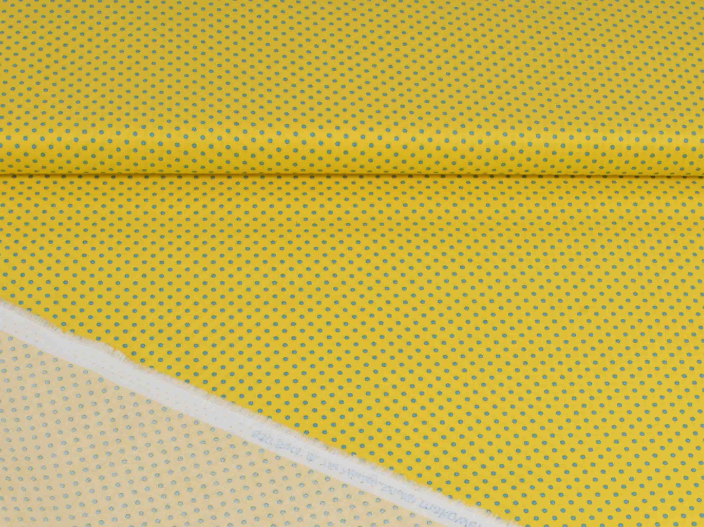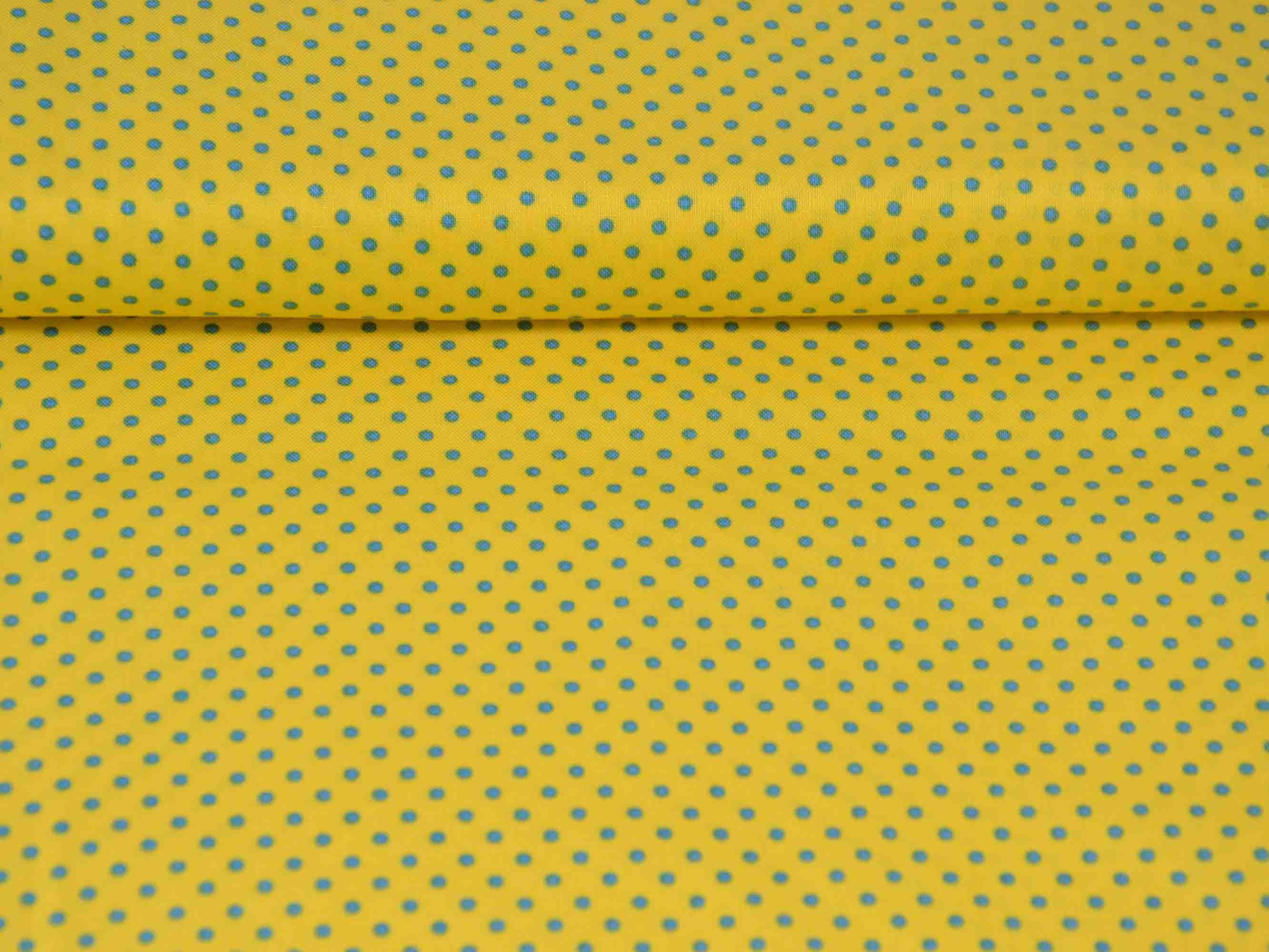 Cotton fabric for patchwork with small blue dots on yellow fabric.