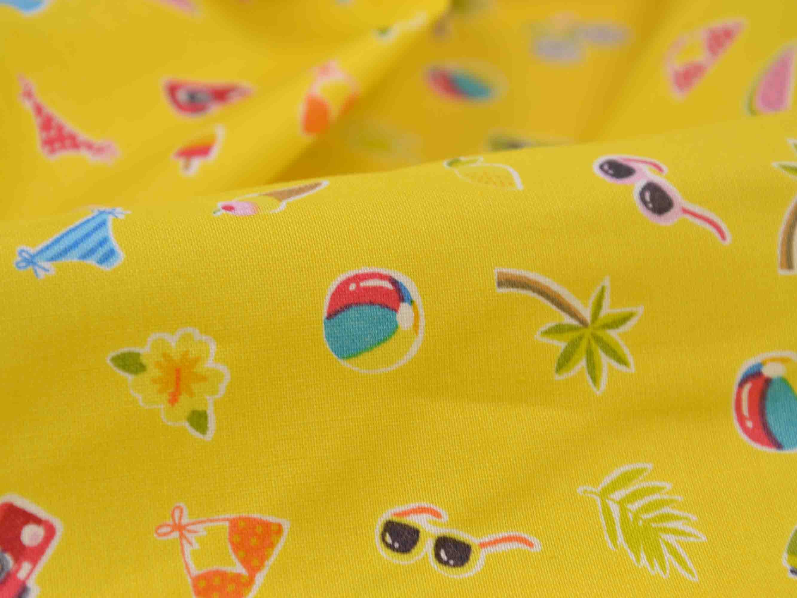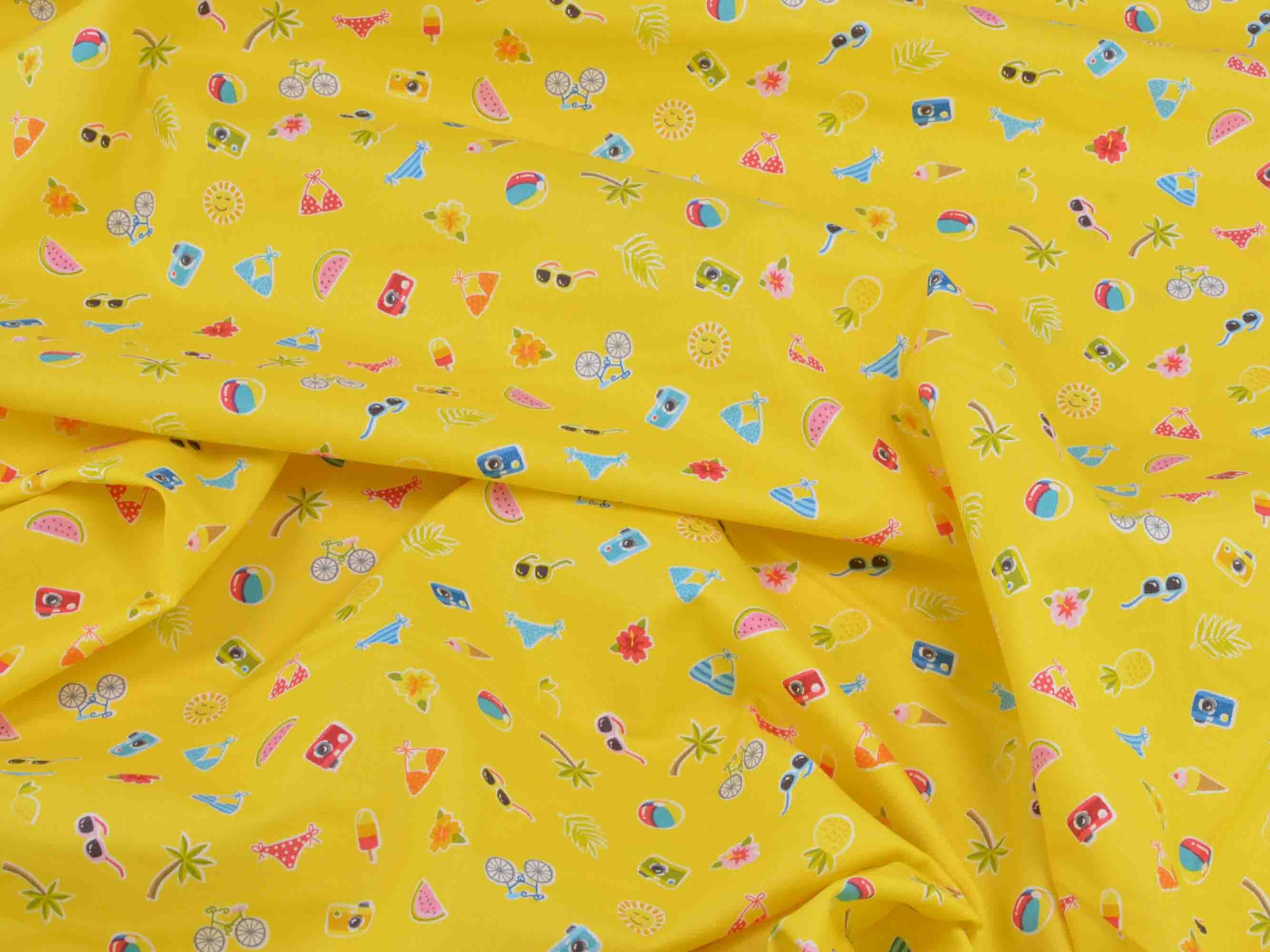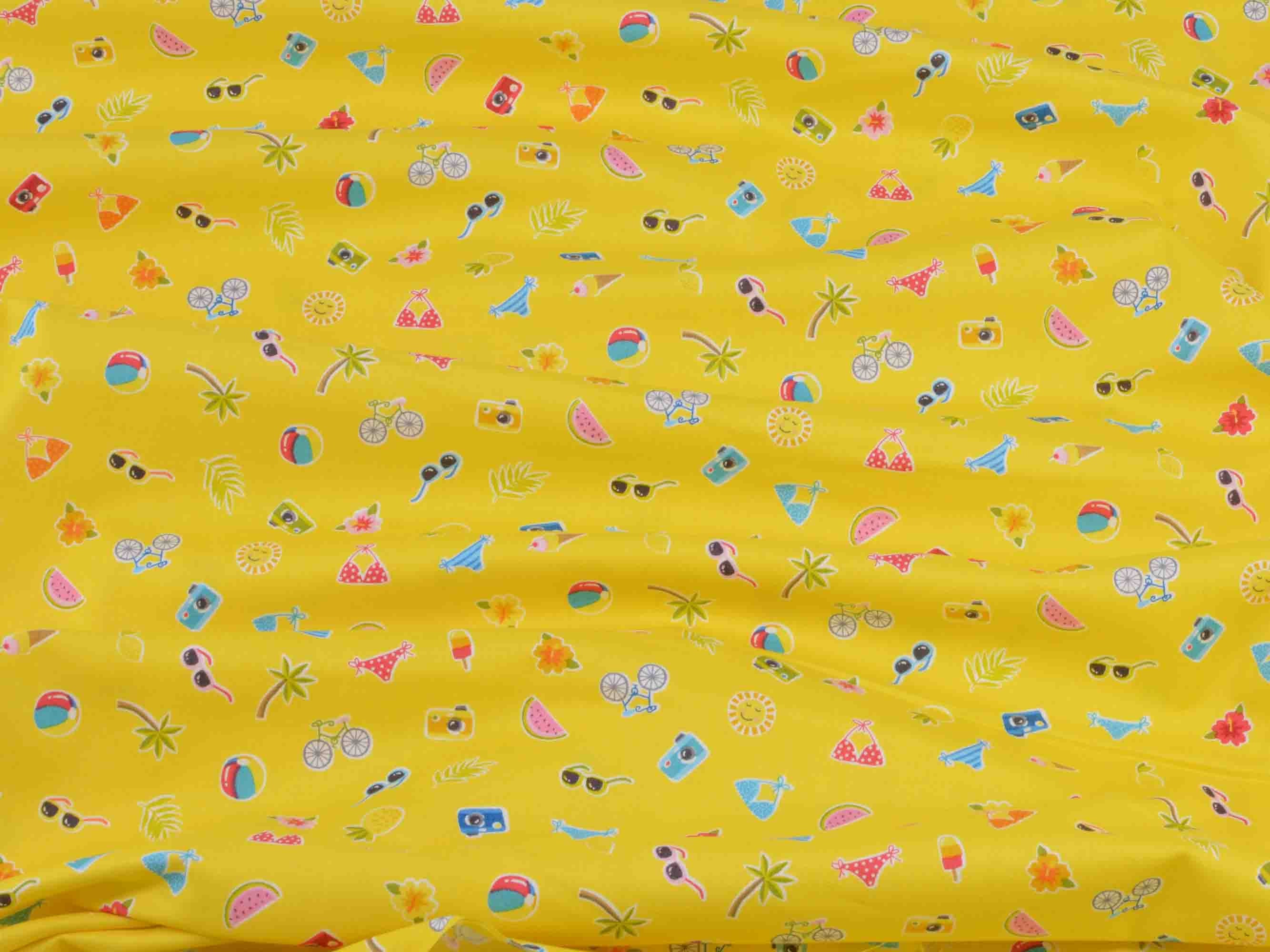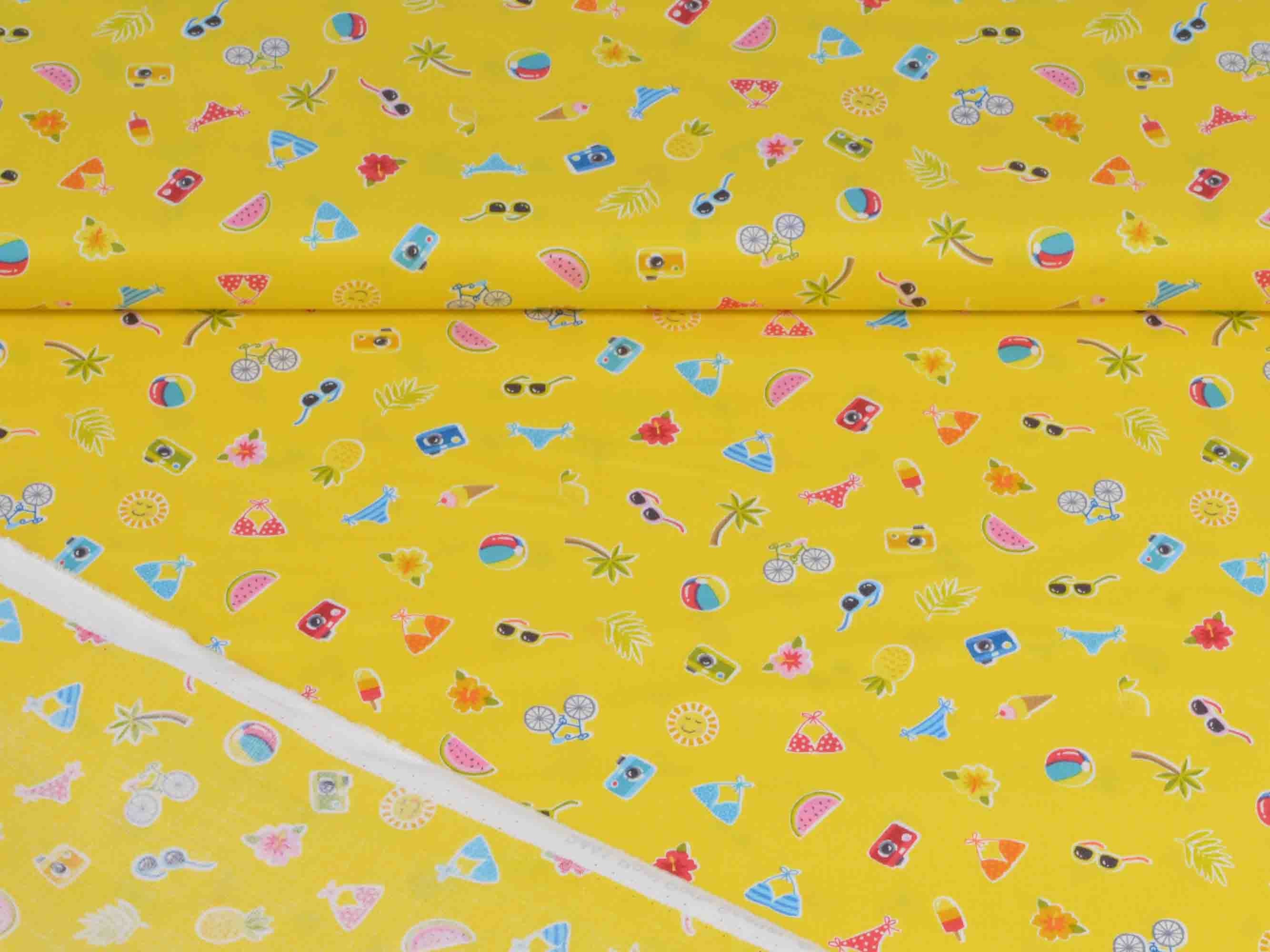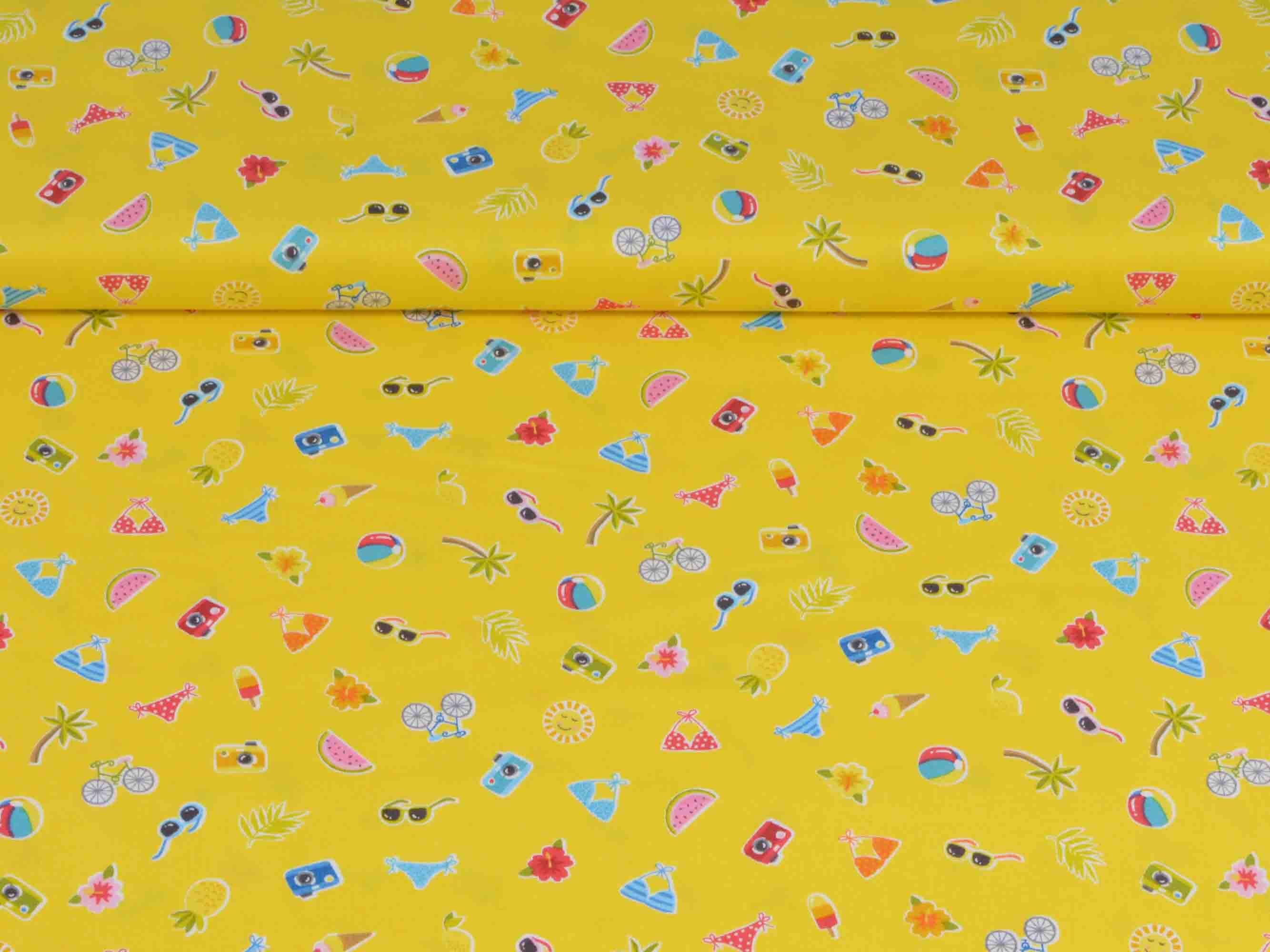Baumwollstoff mit kleinen Icons. Kamera, Sonnenbrille, Palme, Sonne, Fahrrad... dieser Stoff schreit nach Sommer. Aus der Kollektion "Pool Party" von Makower. Passt wunderbar zu diesem Stoff mit Segelbooten: