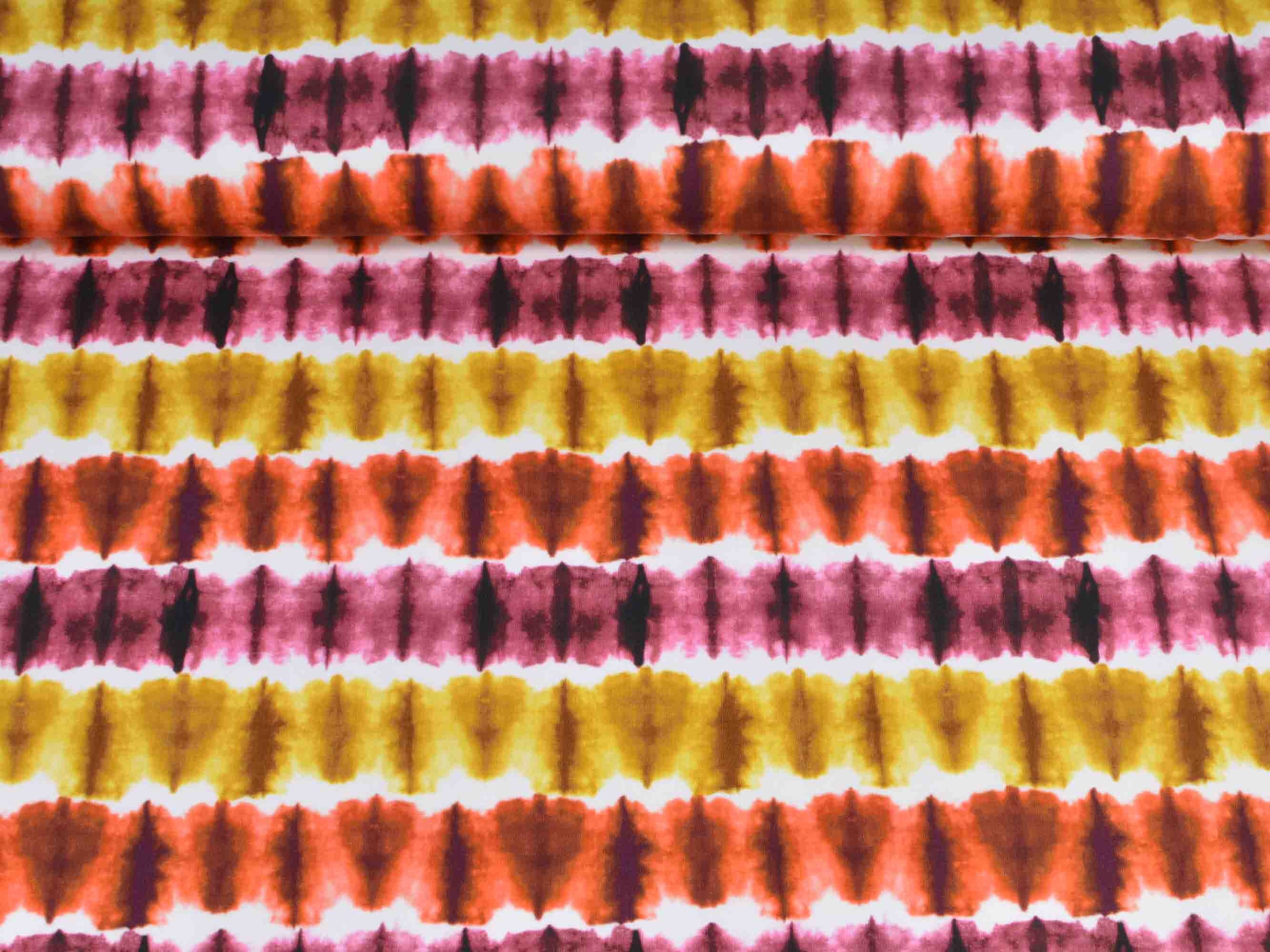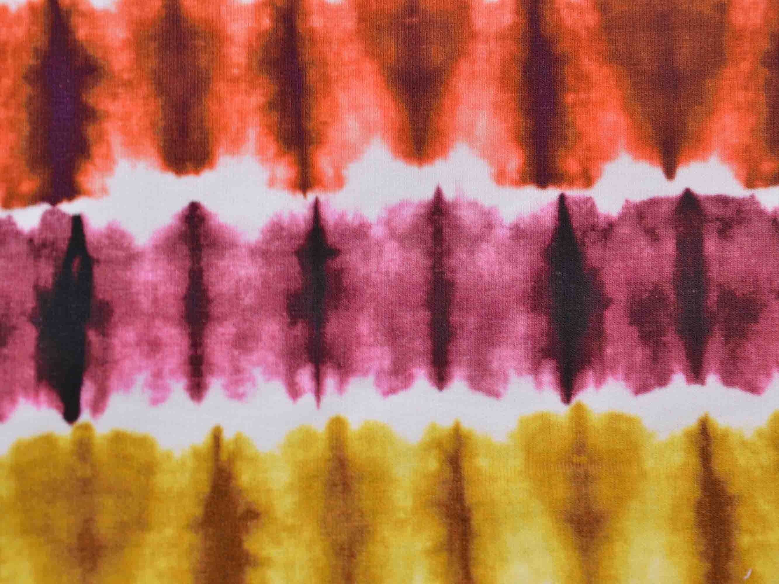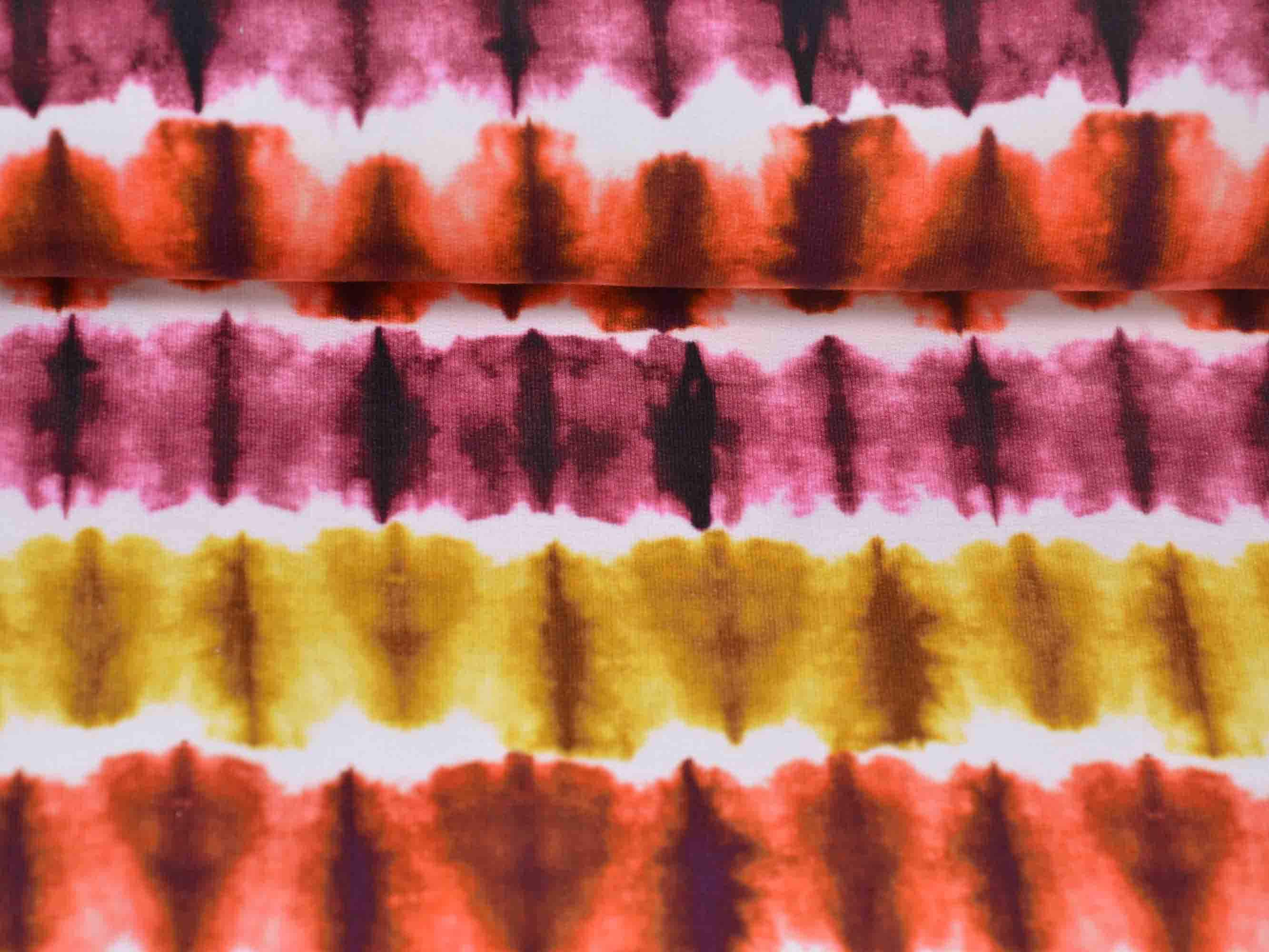 Sweatstoff Batik in pink, rosa, orange und weiß. Die Innenseite ist weiß. Schöner leichter Sweat für den Übergang.