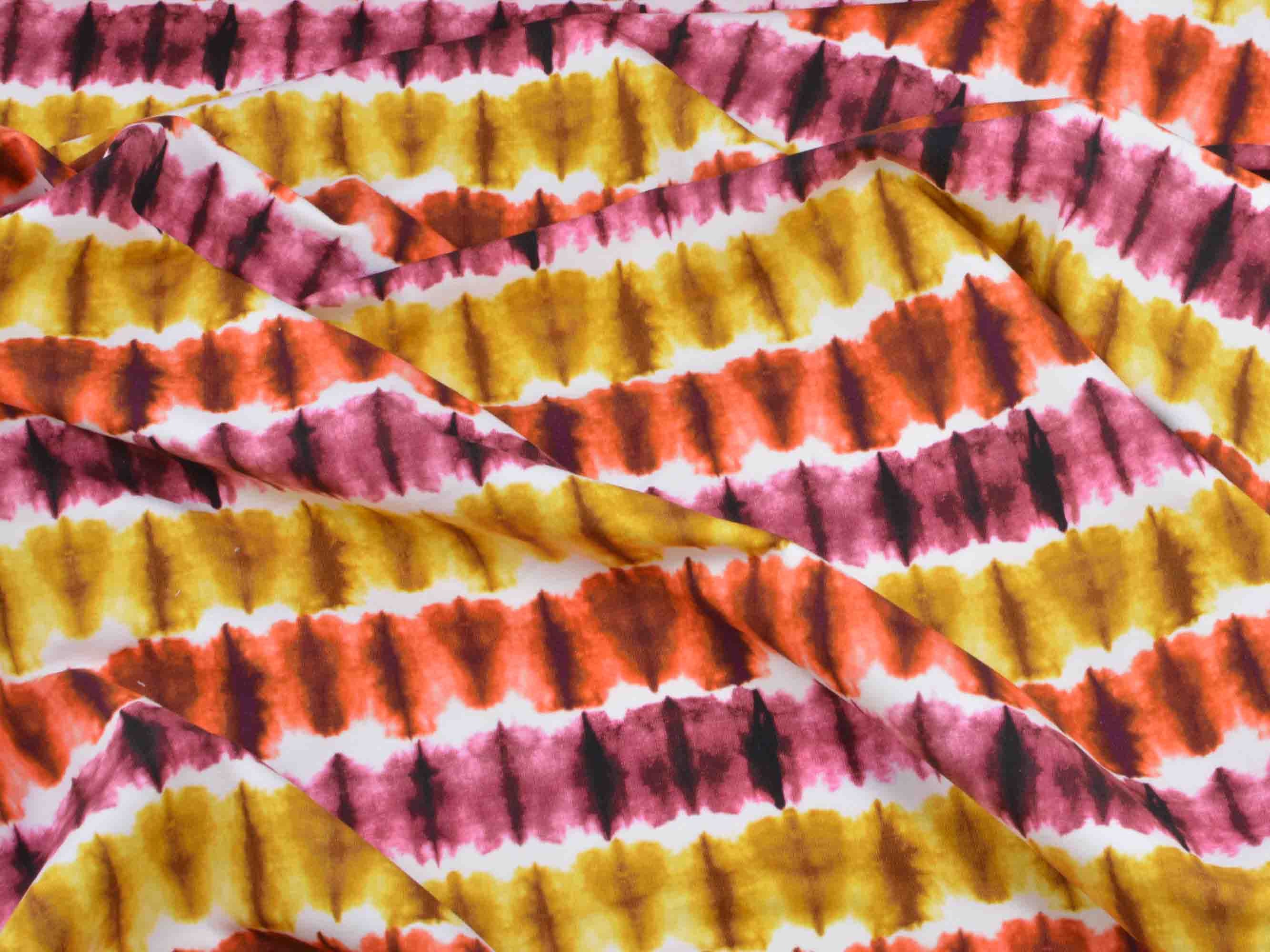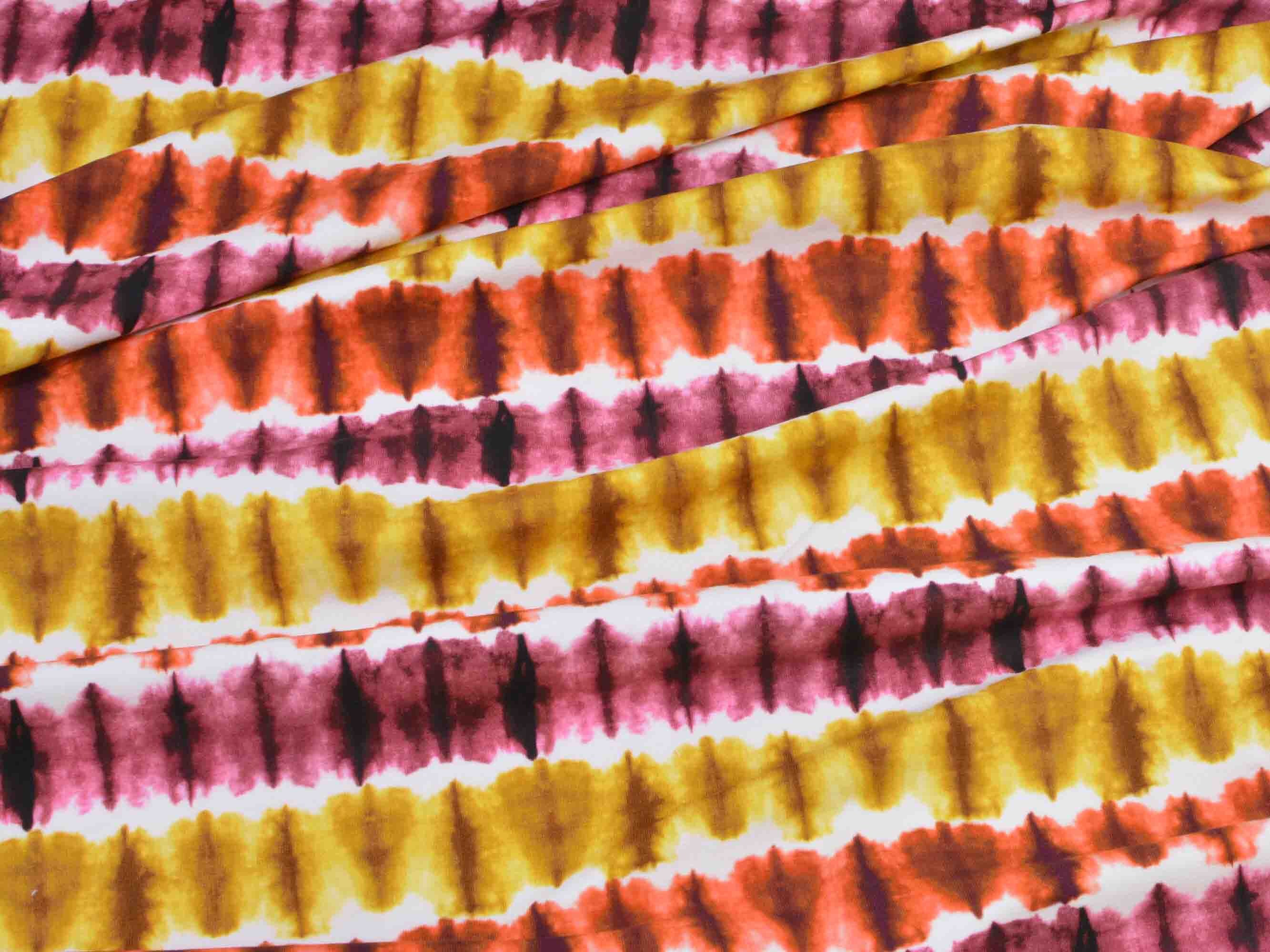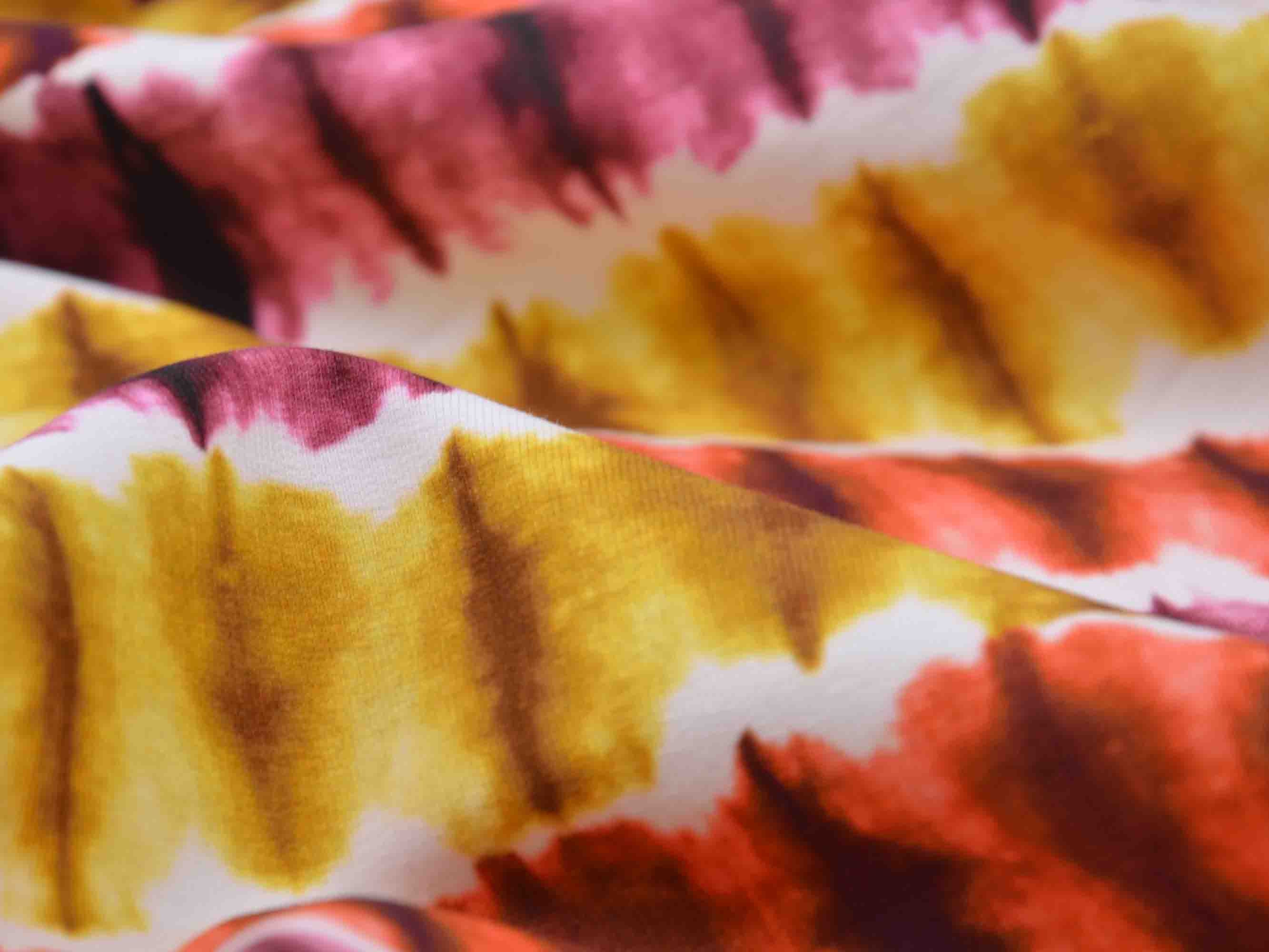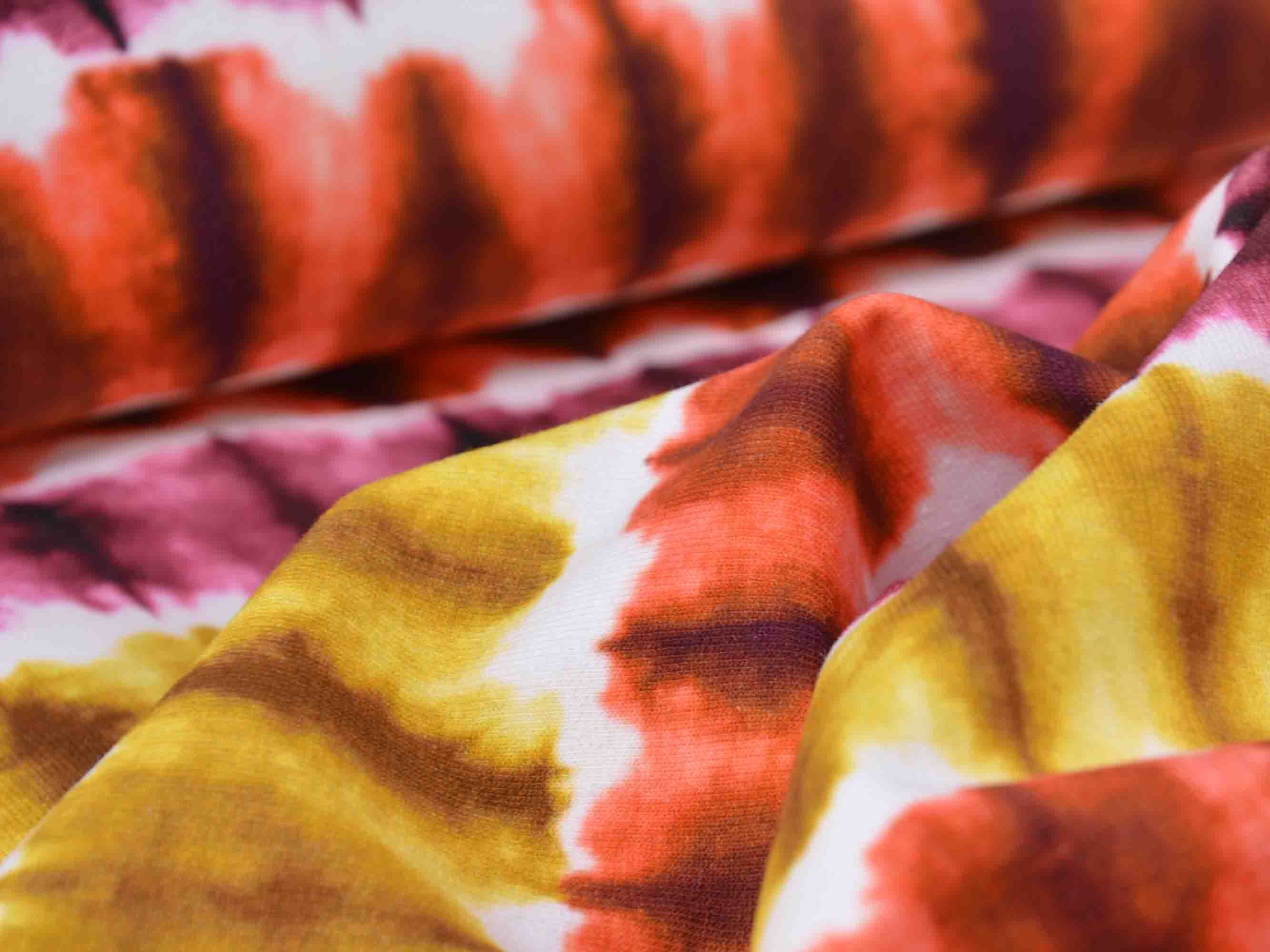 Sweatstoff Batik in pink, rosa, orange und weiß. Die Innenseite ist weiß. Schöner leichter Sweat für den Übergang.