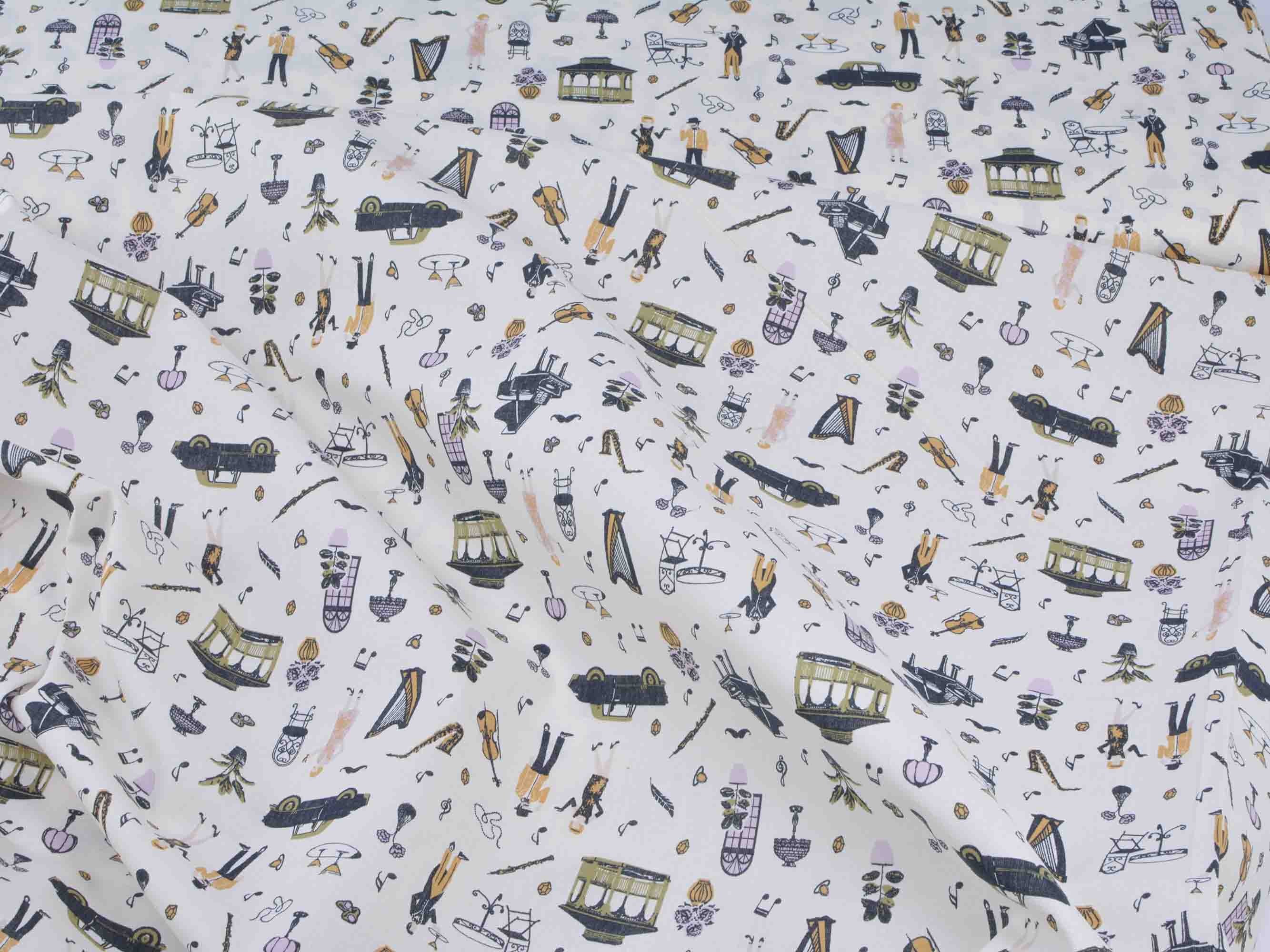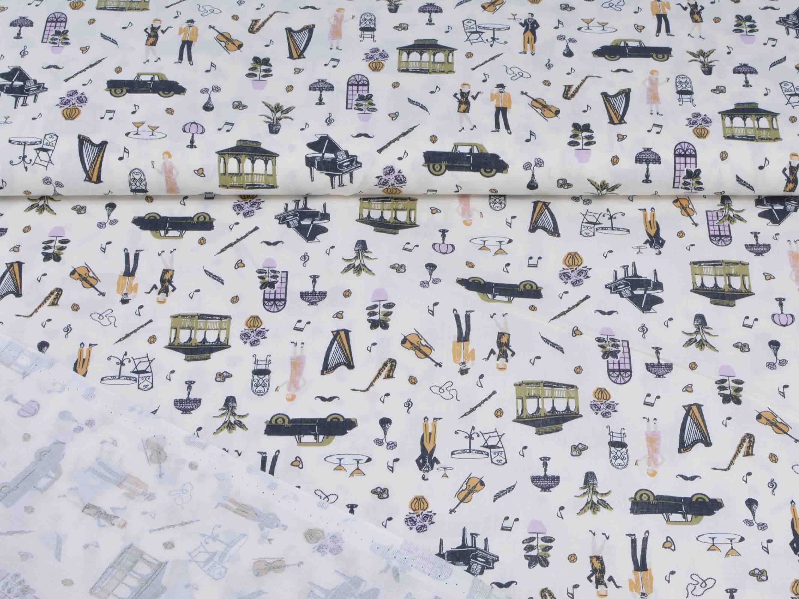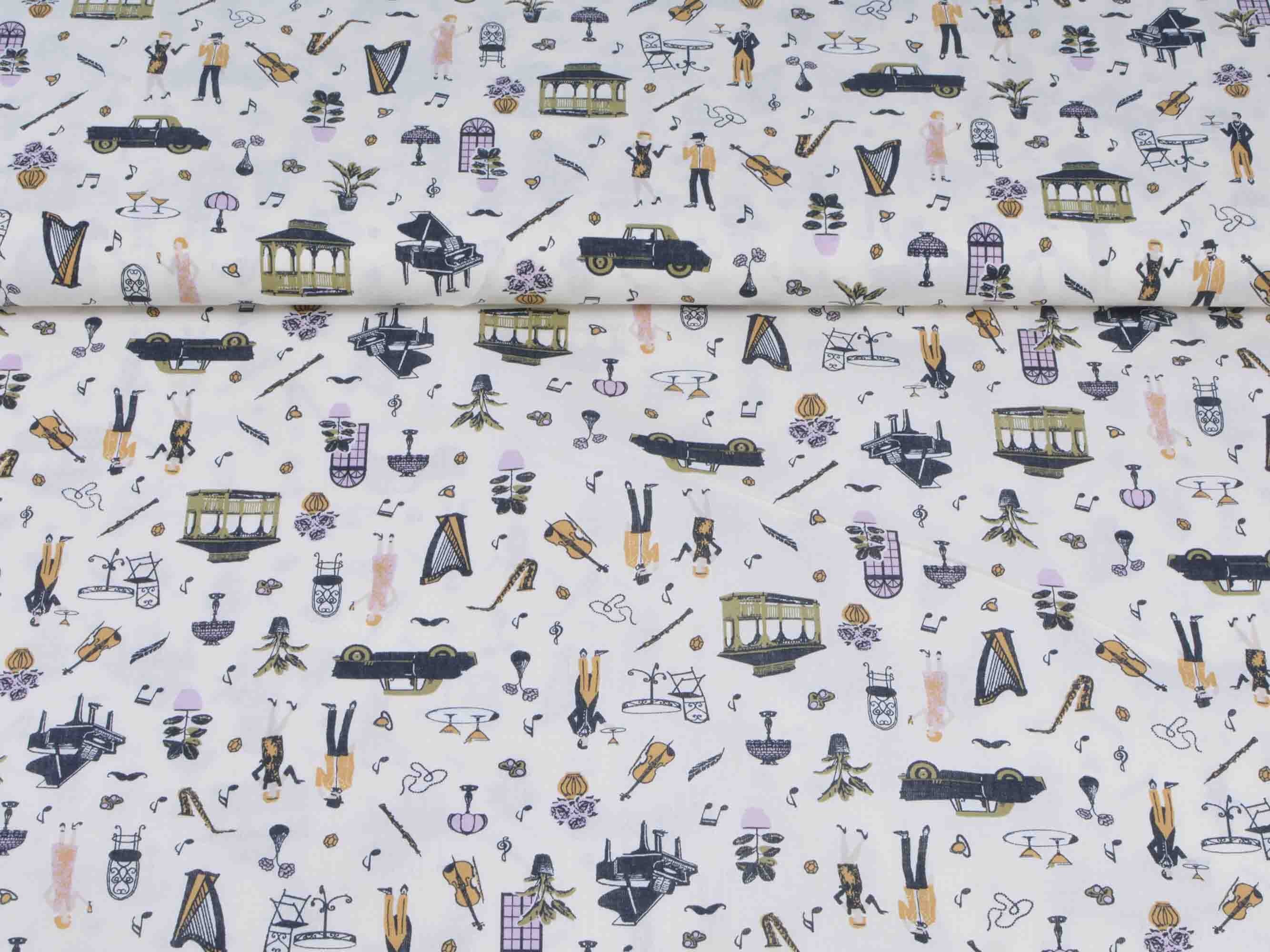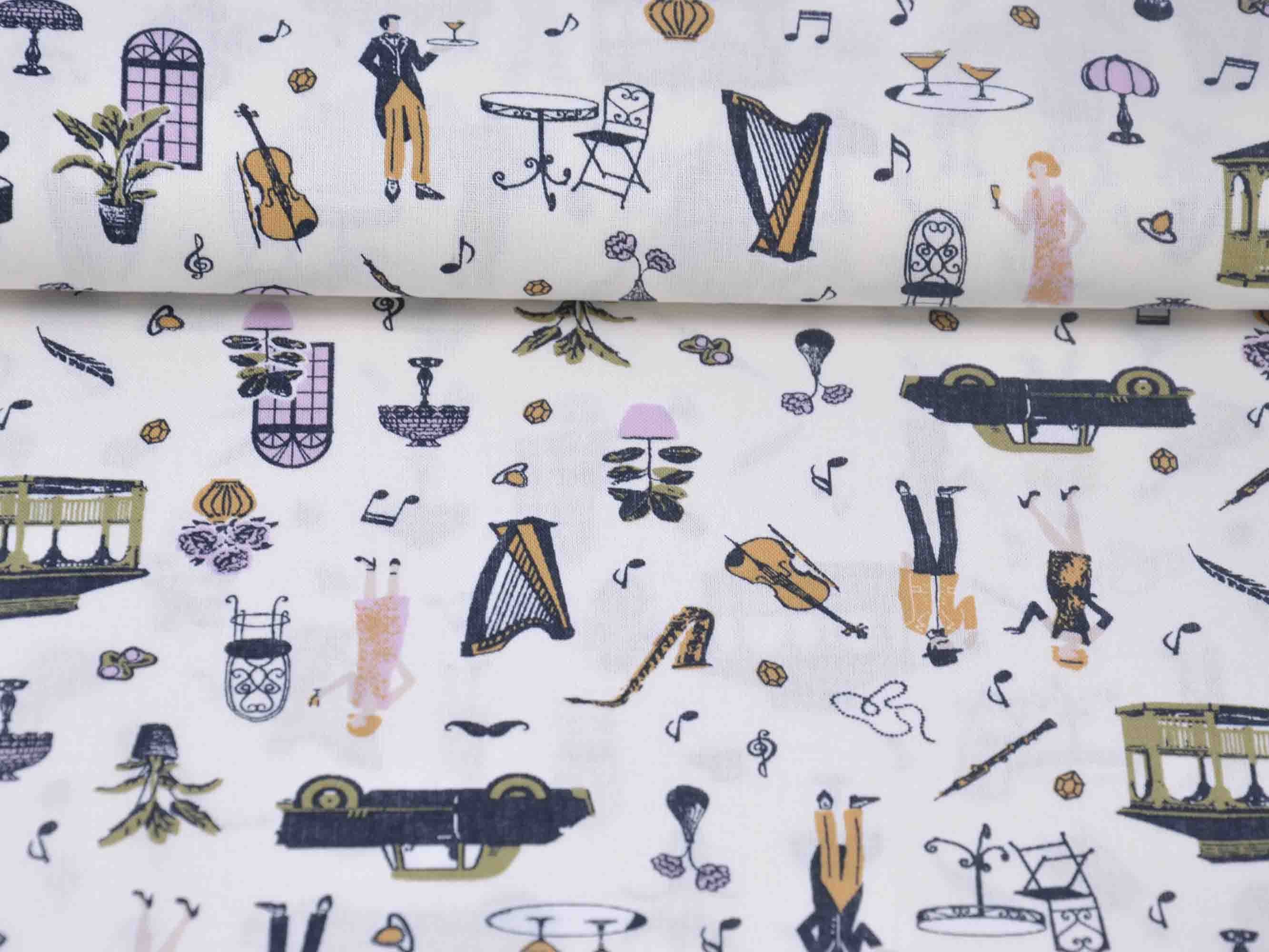 Druckstoff Salzburg von Westfalenstoffe. Hochwertiger Baumwollstoff mit Musikinstrumenten und Noten.