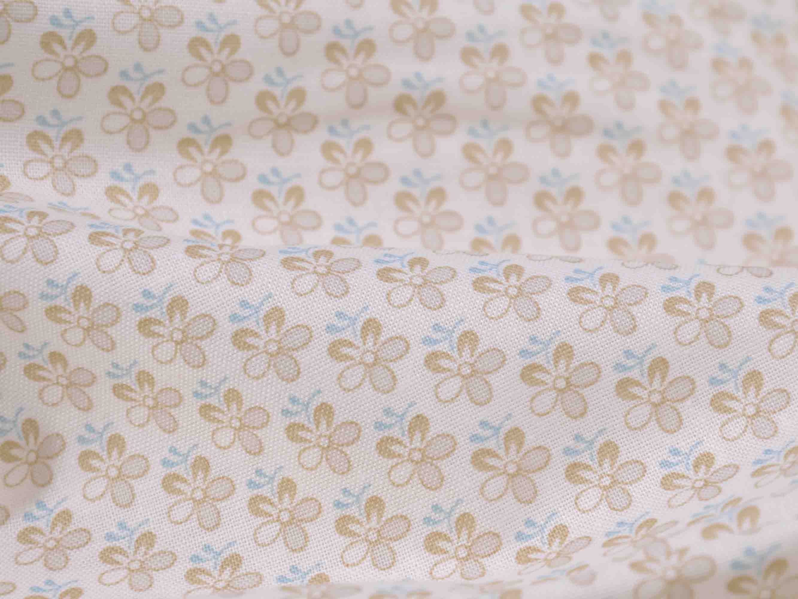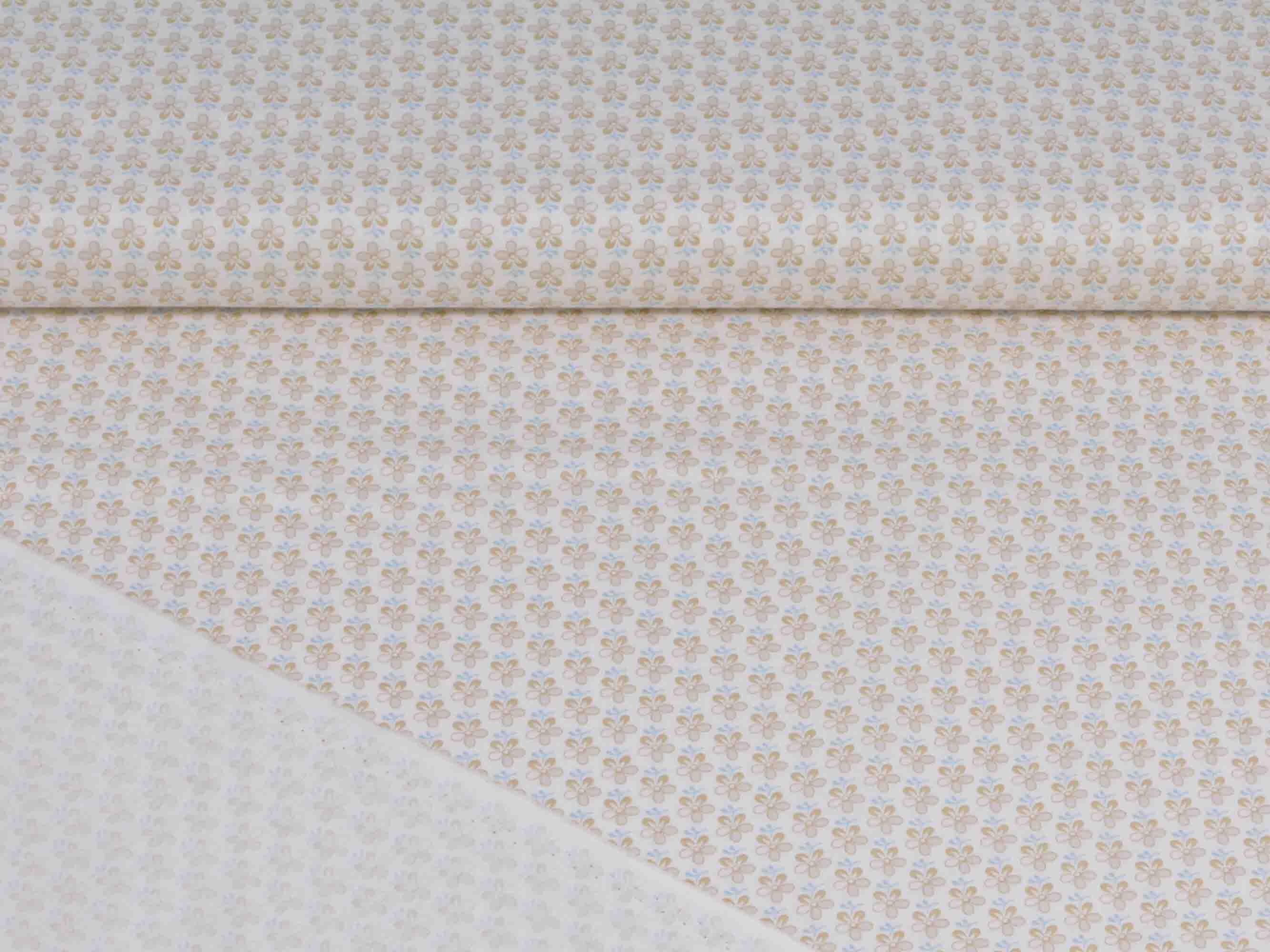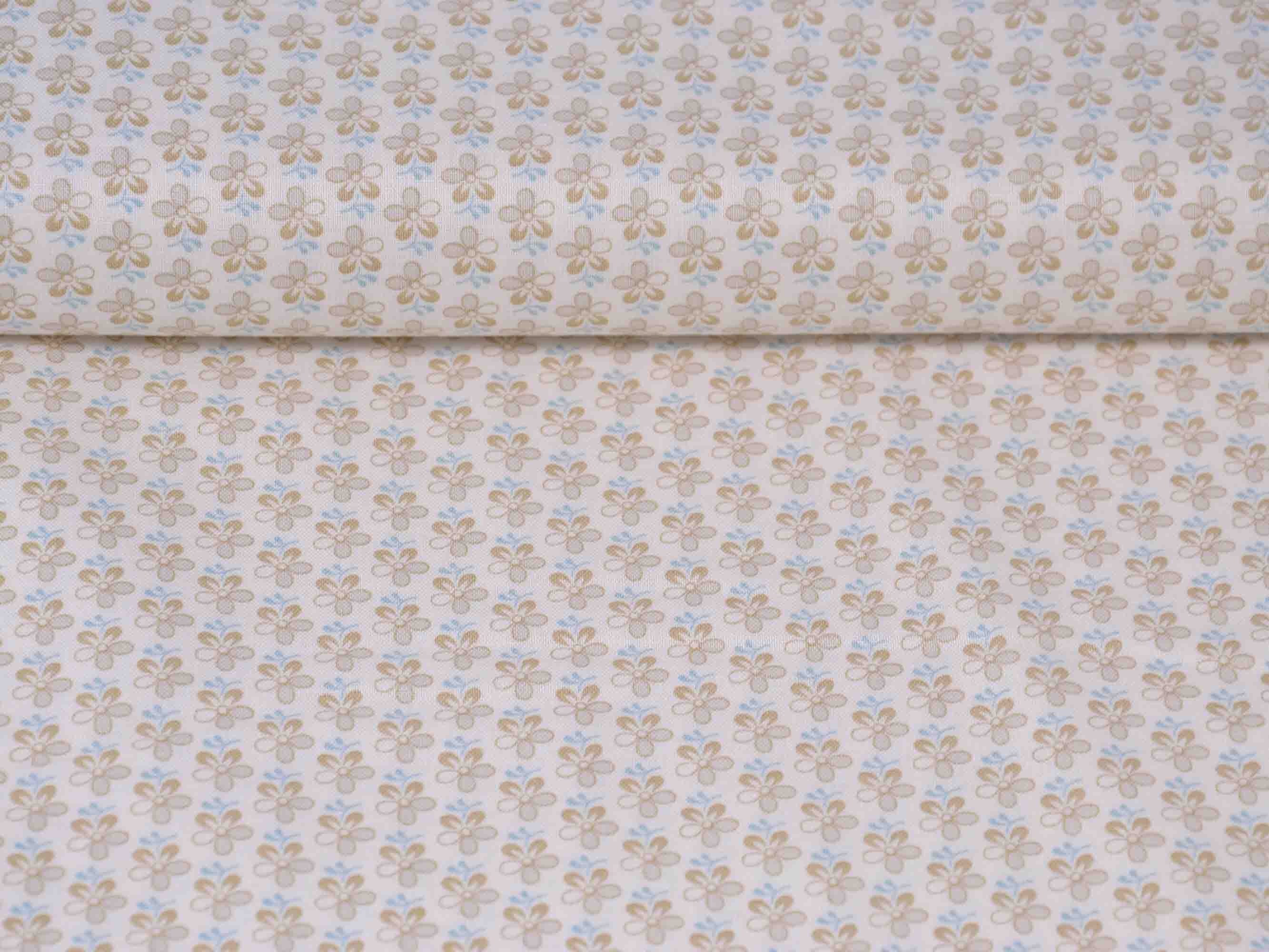 Small flowers and leaves in beige and light blue on beige fabric. A very subtle, minimalist pattern. Perfect for patchwork.