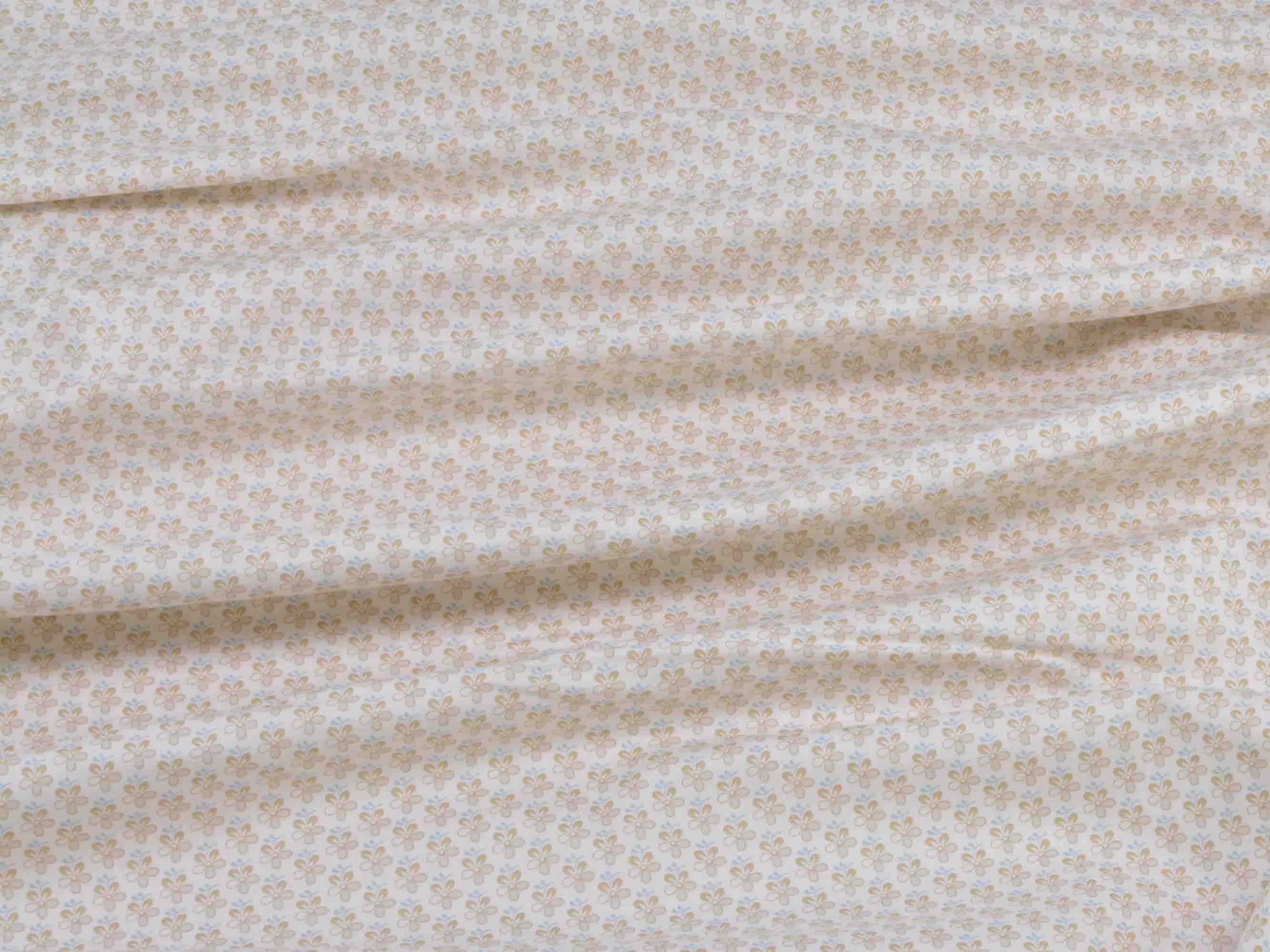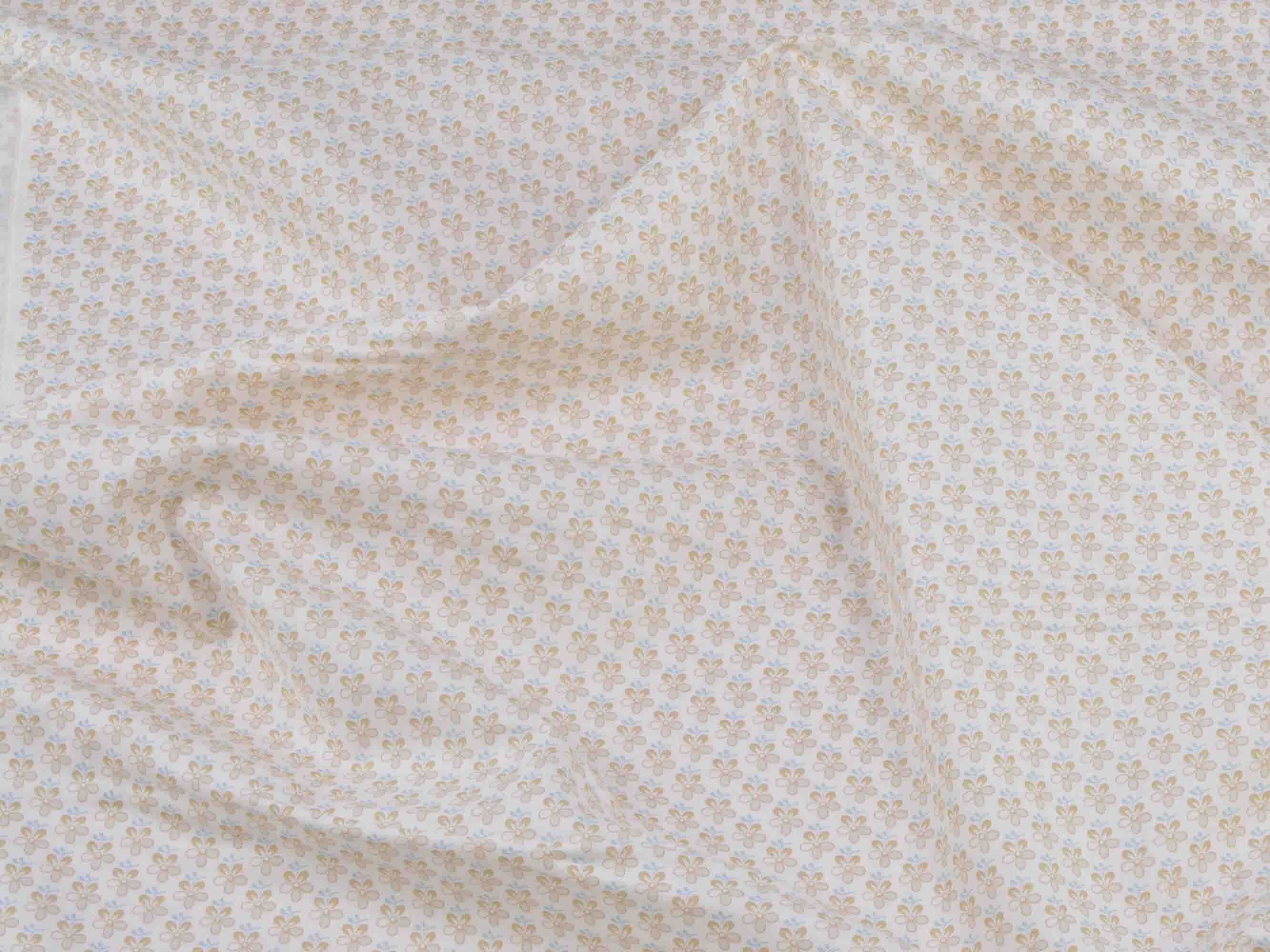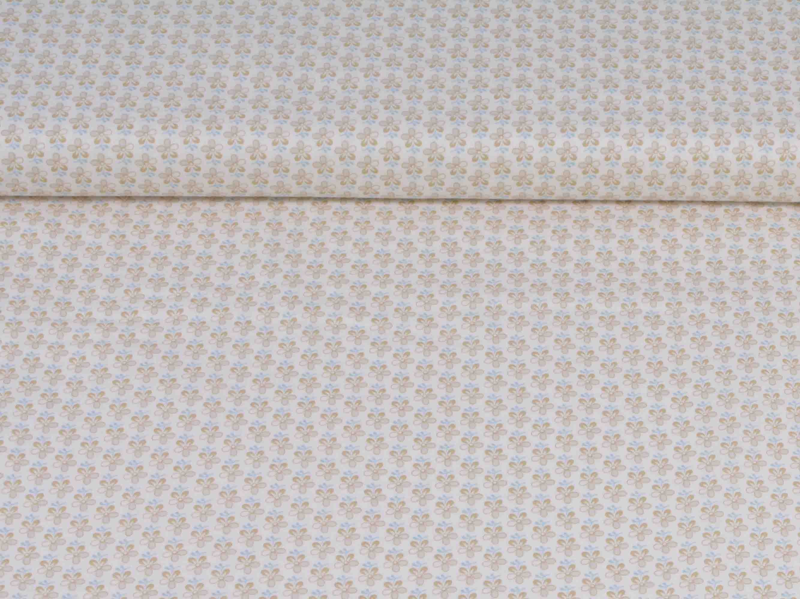 Small flowers and leaves in beige and light blue on beige fabric. A very subtle, minimalist pattern. Perfect for patchwork.