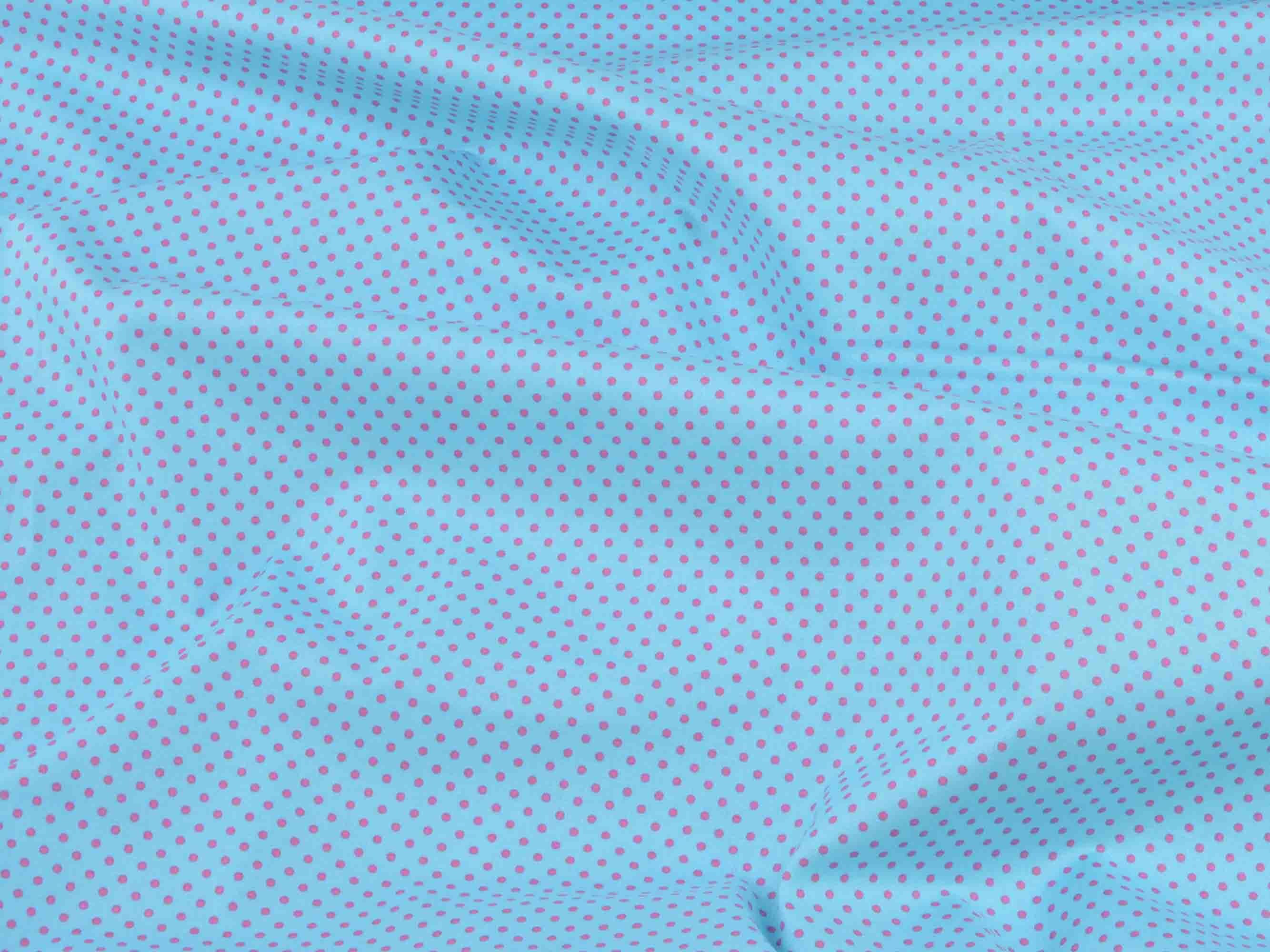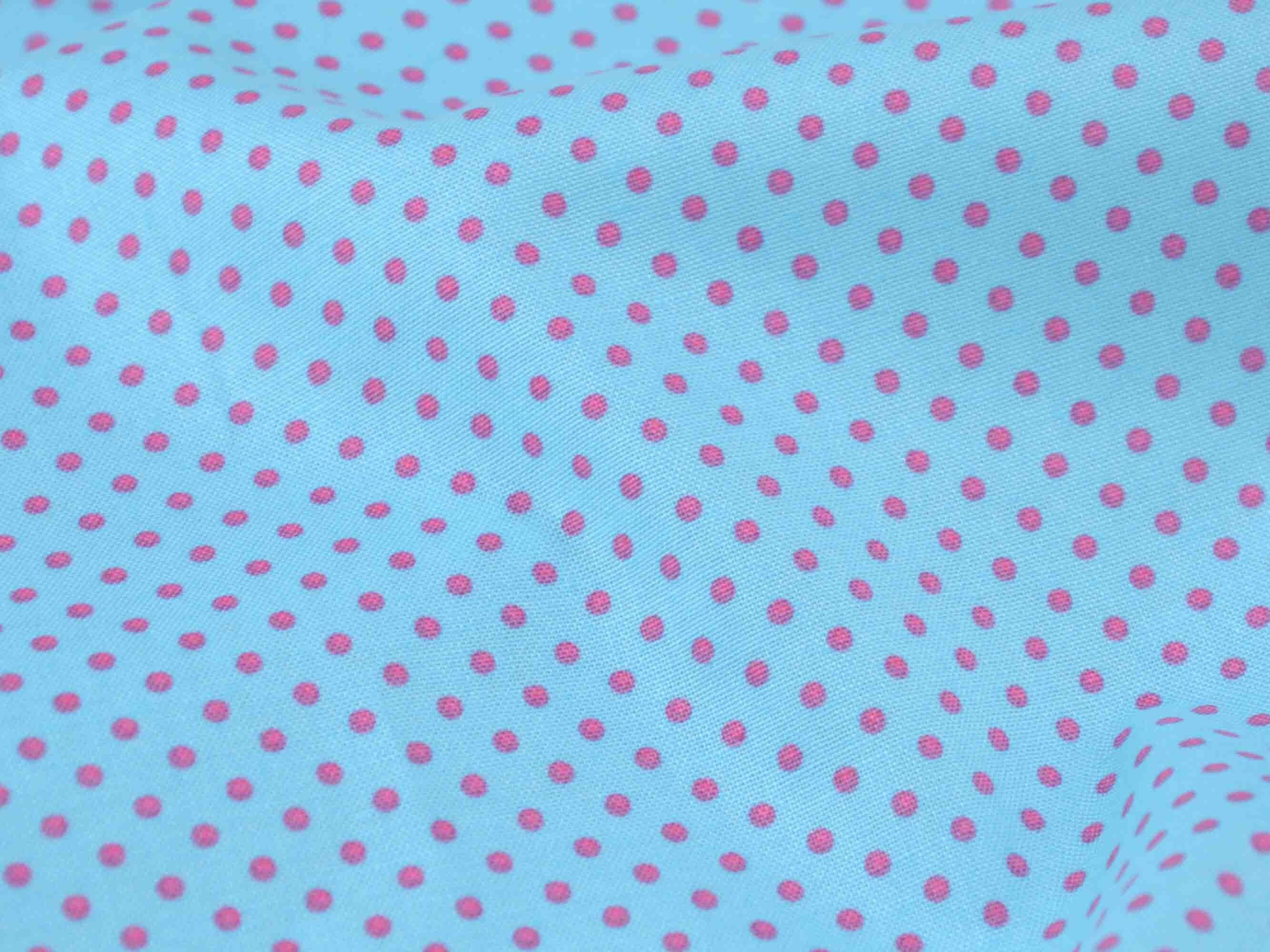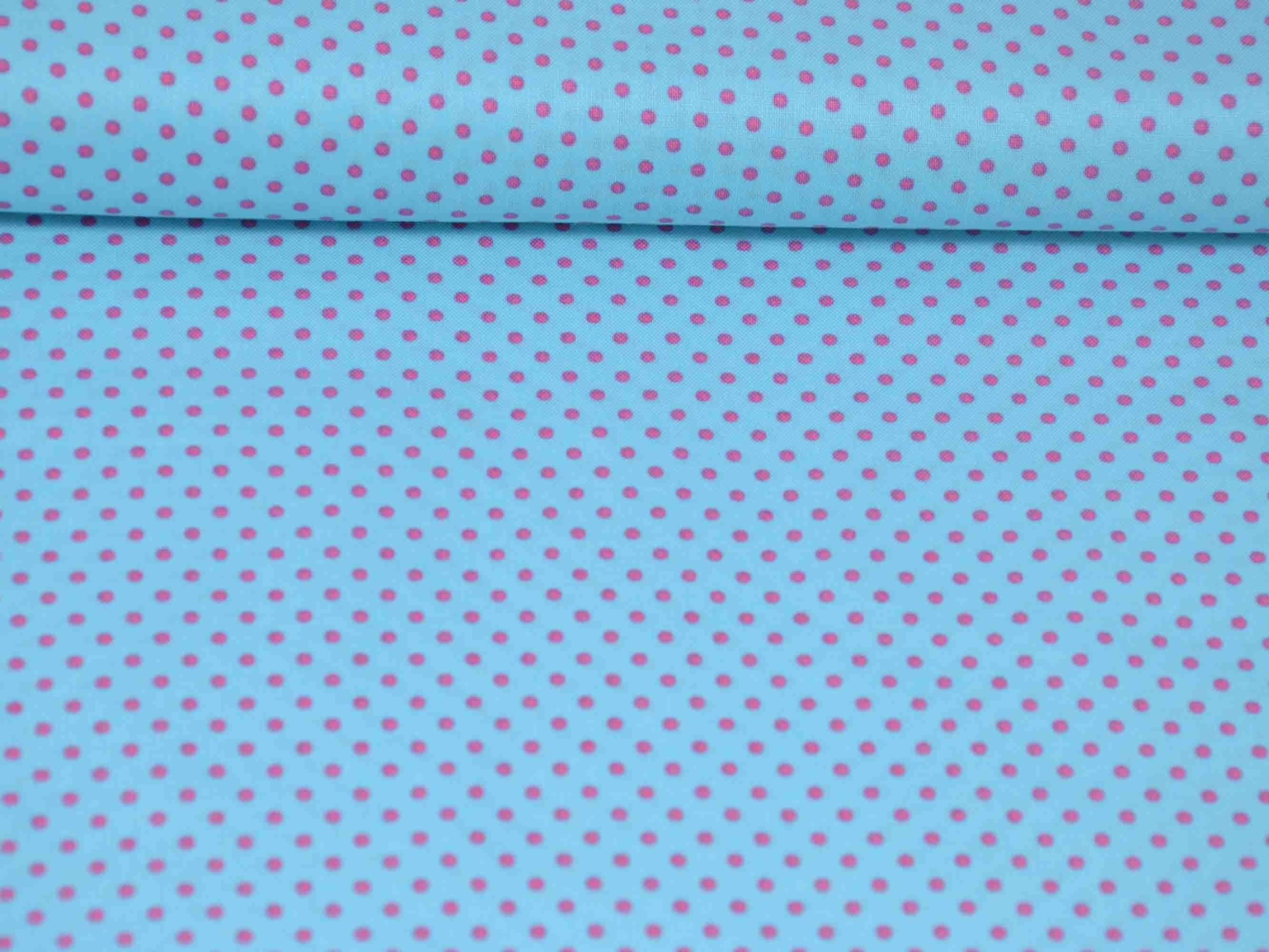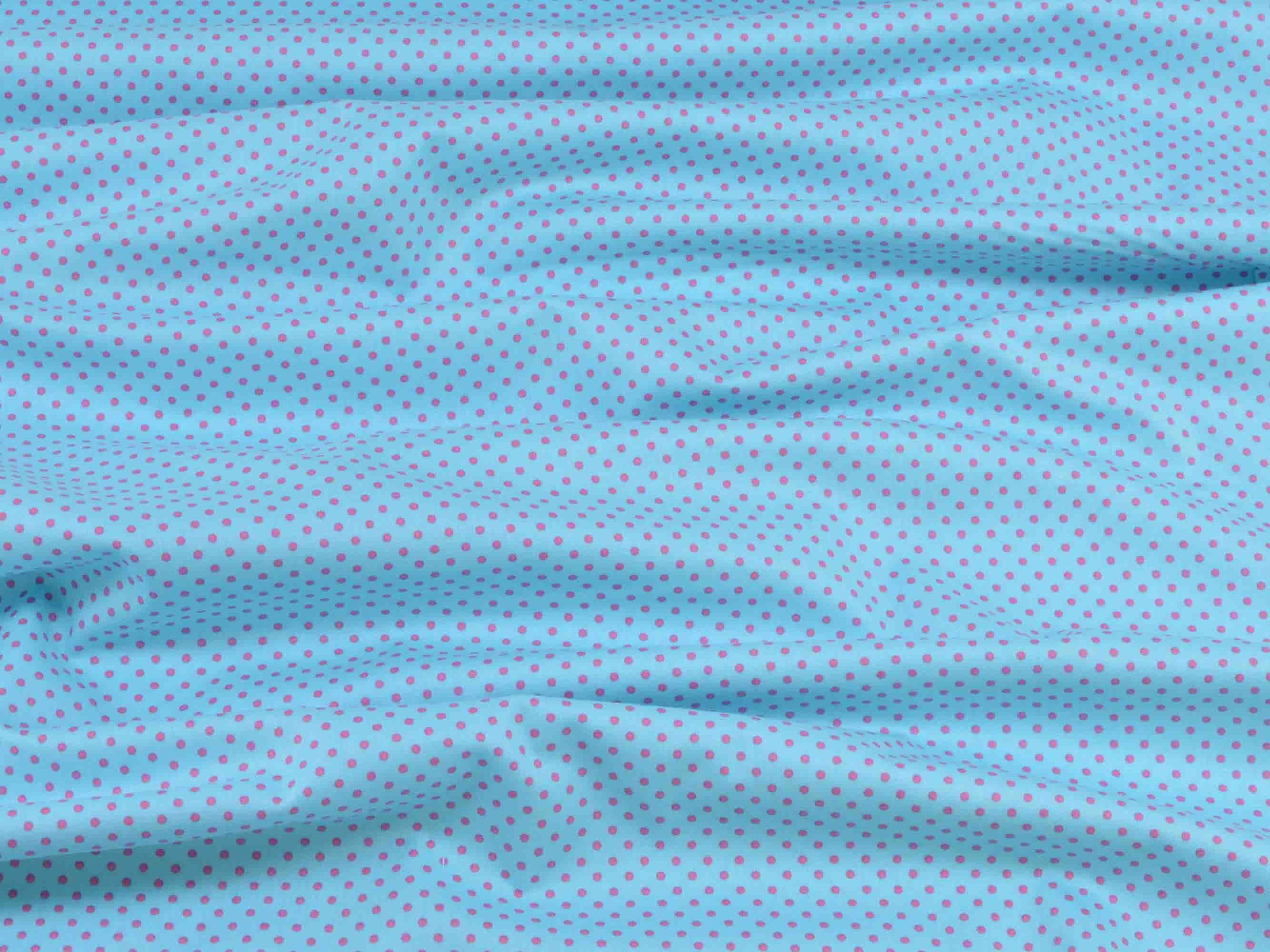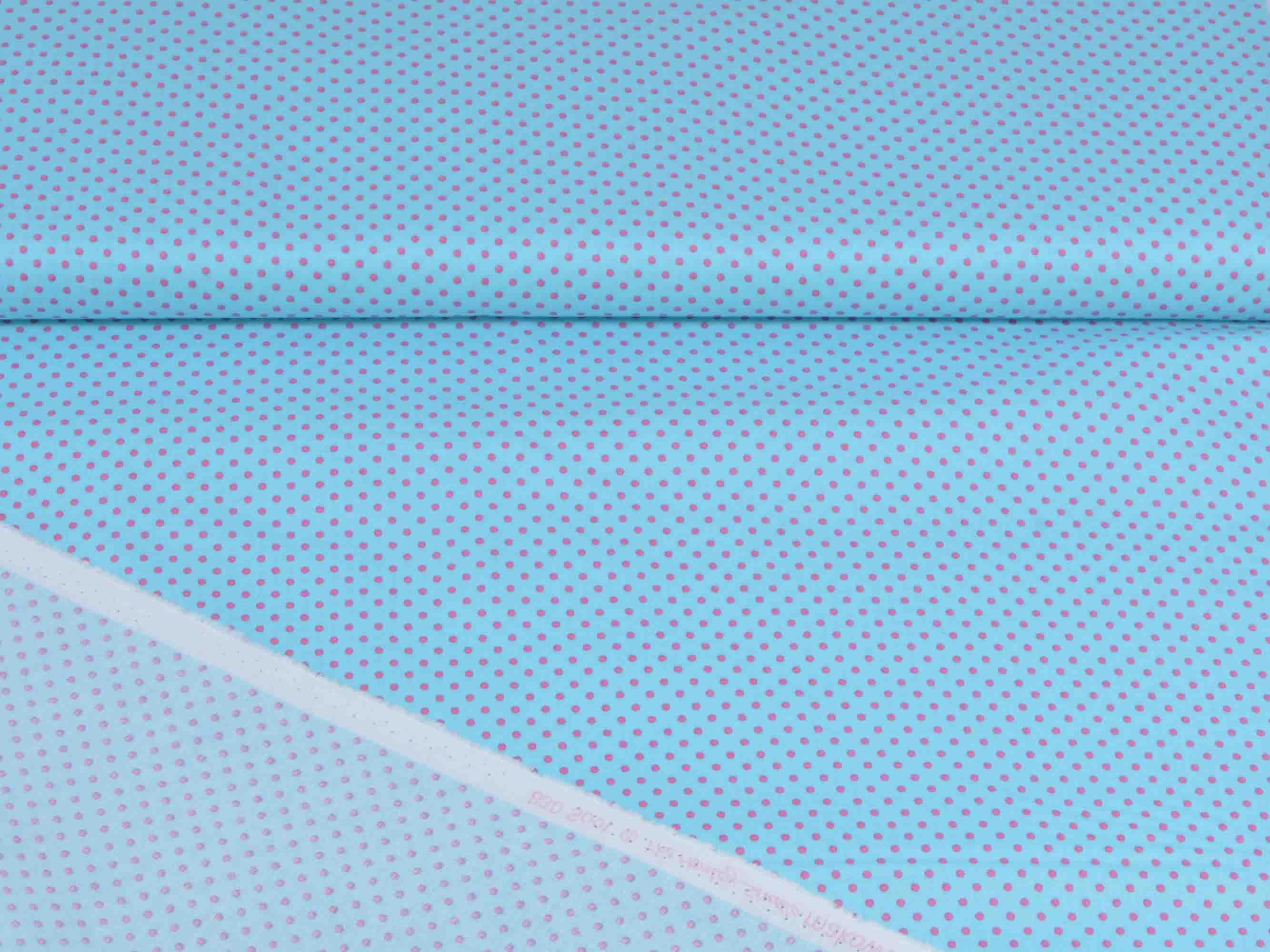 Baumwollstoff zum Patchworken mit kleinen pinkten Punkten auf türkisem Stoff.