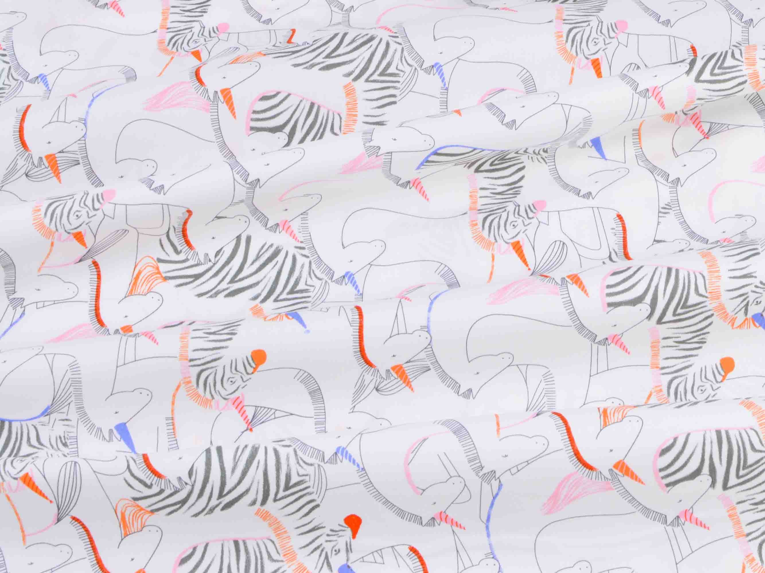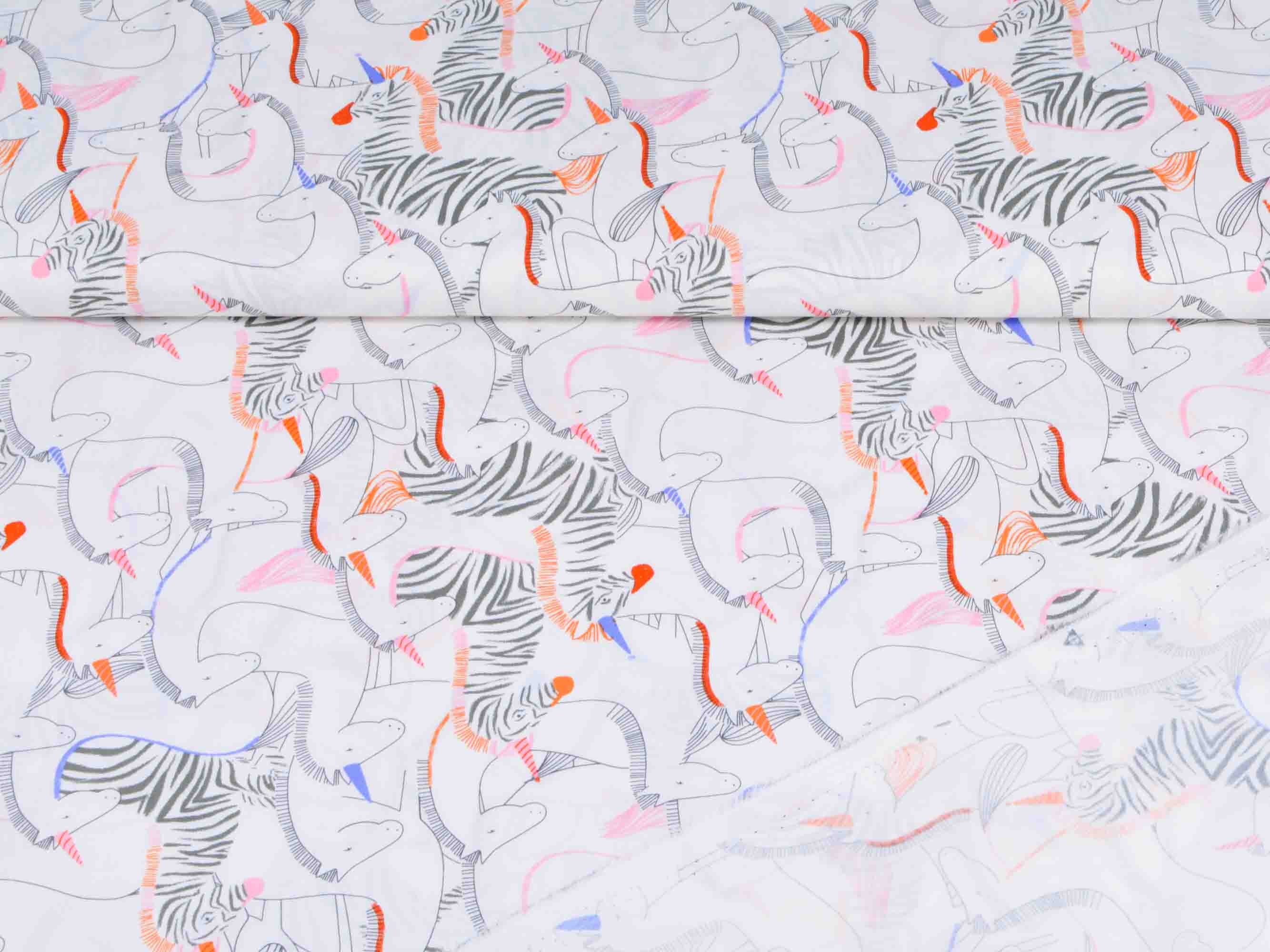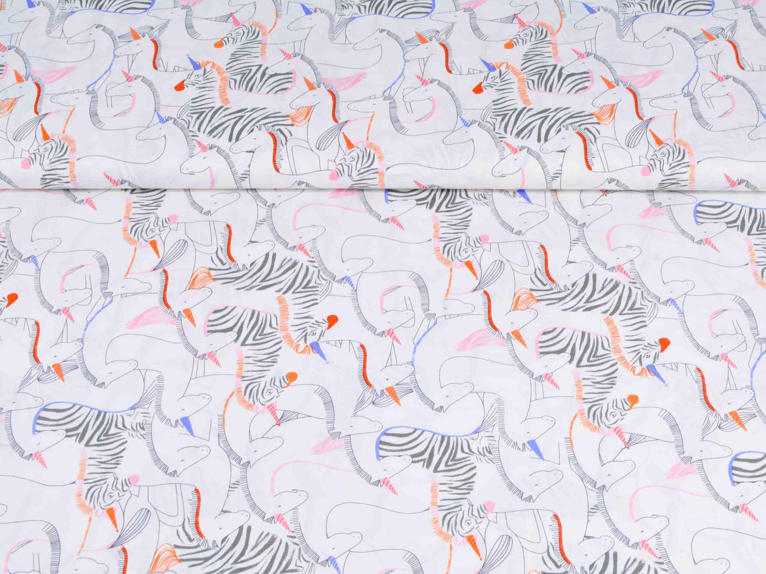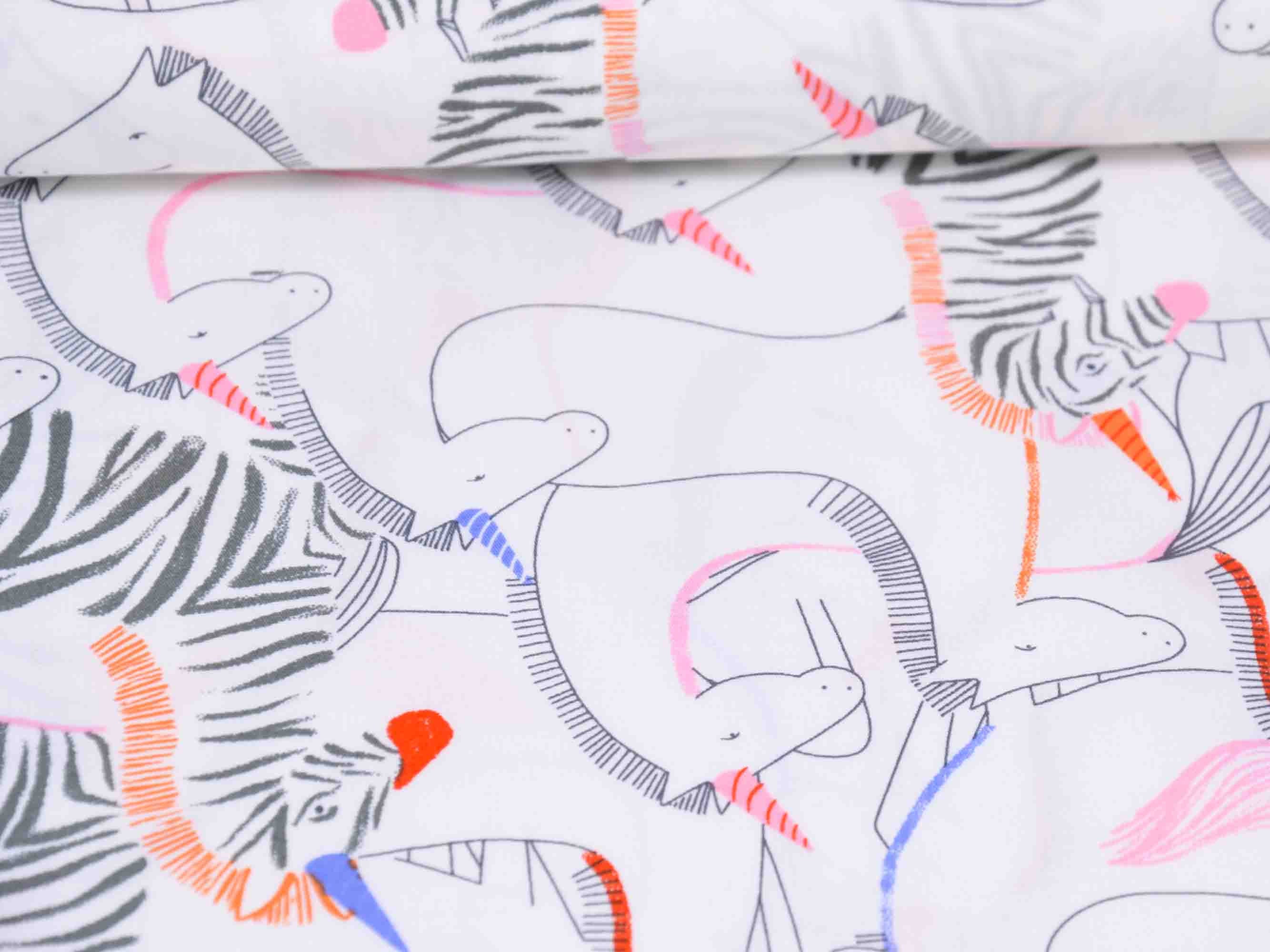 Popeline aus Baumwolle mit abstrakten Zebras und Einhörnern. Wunderbar für Sommerkleider, Blusen oder zum nähen von Kissen.