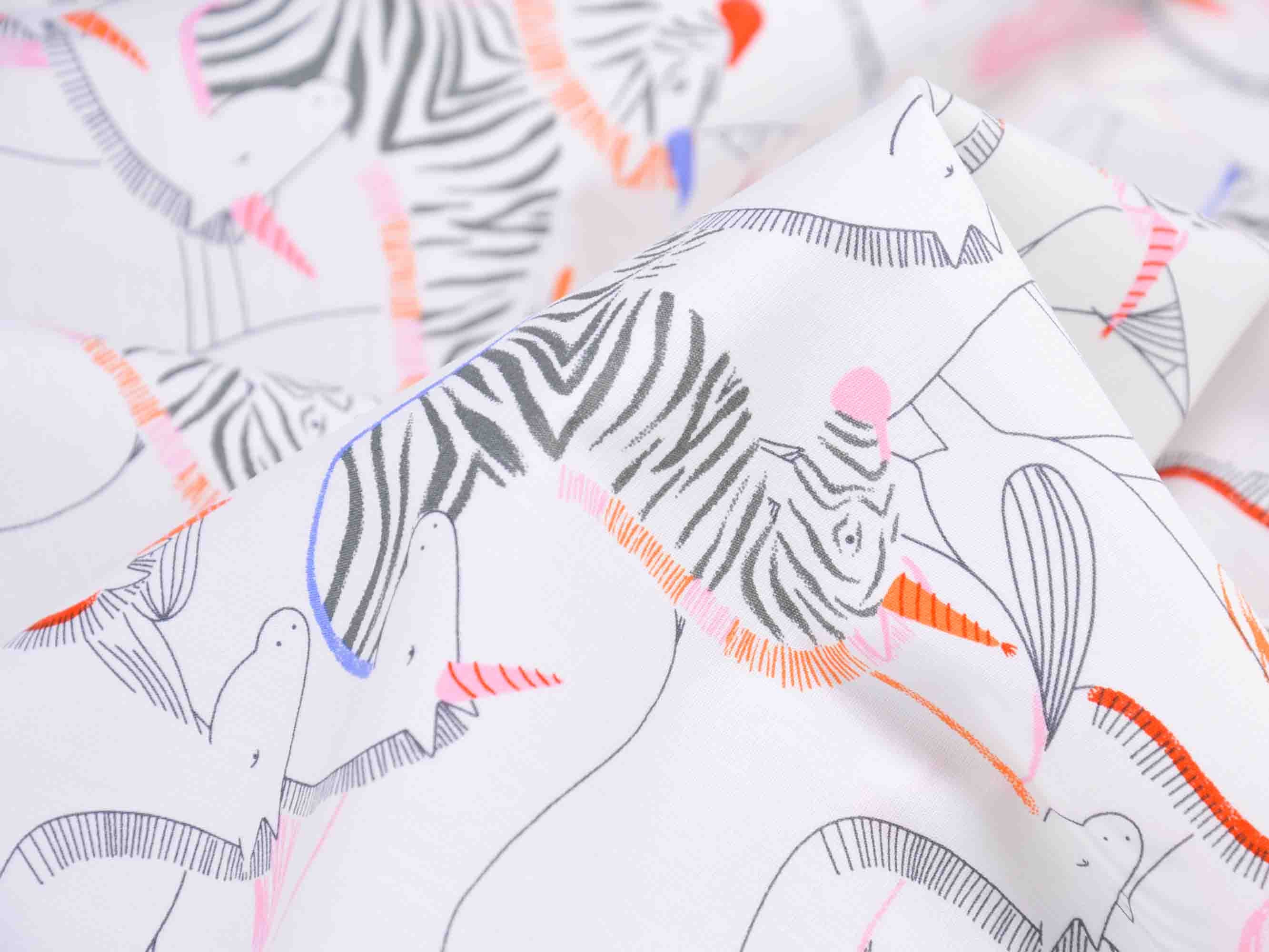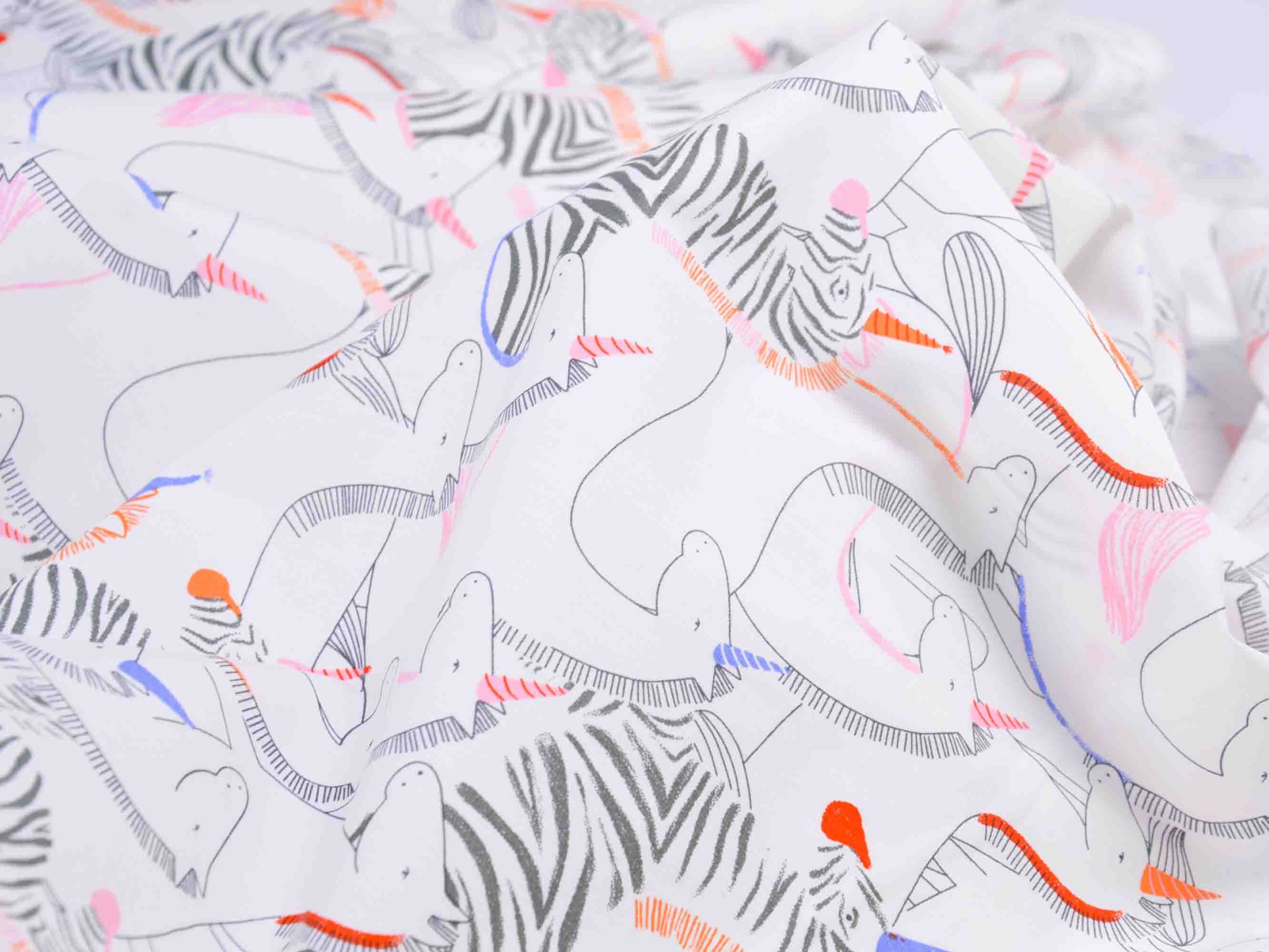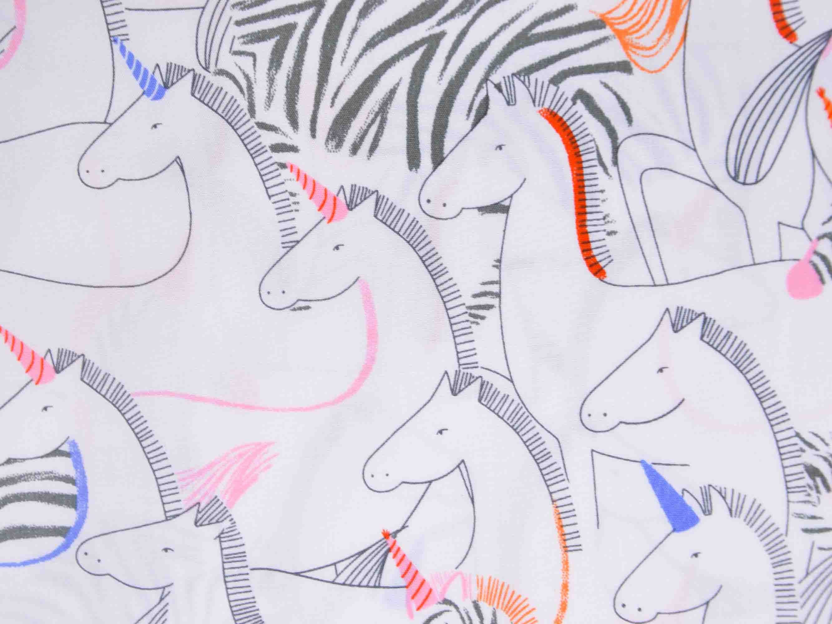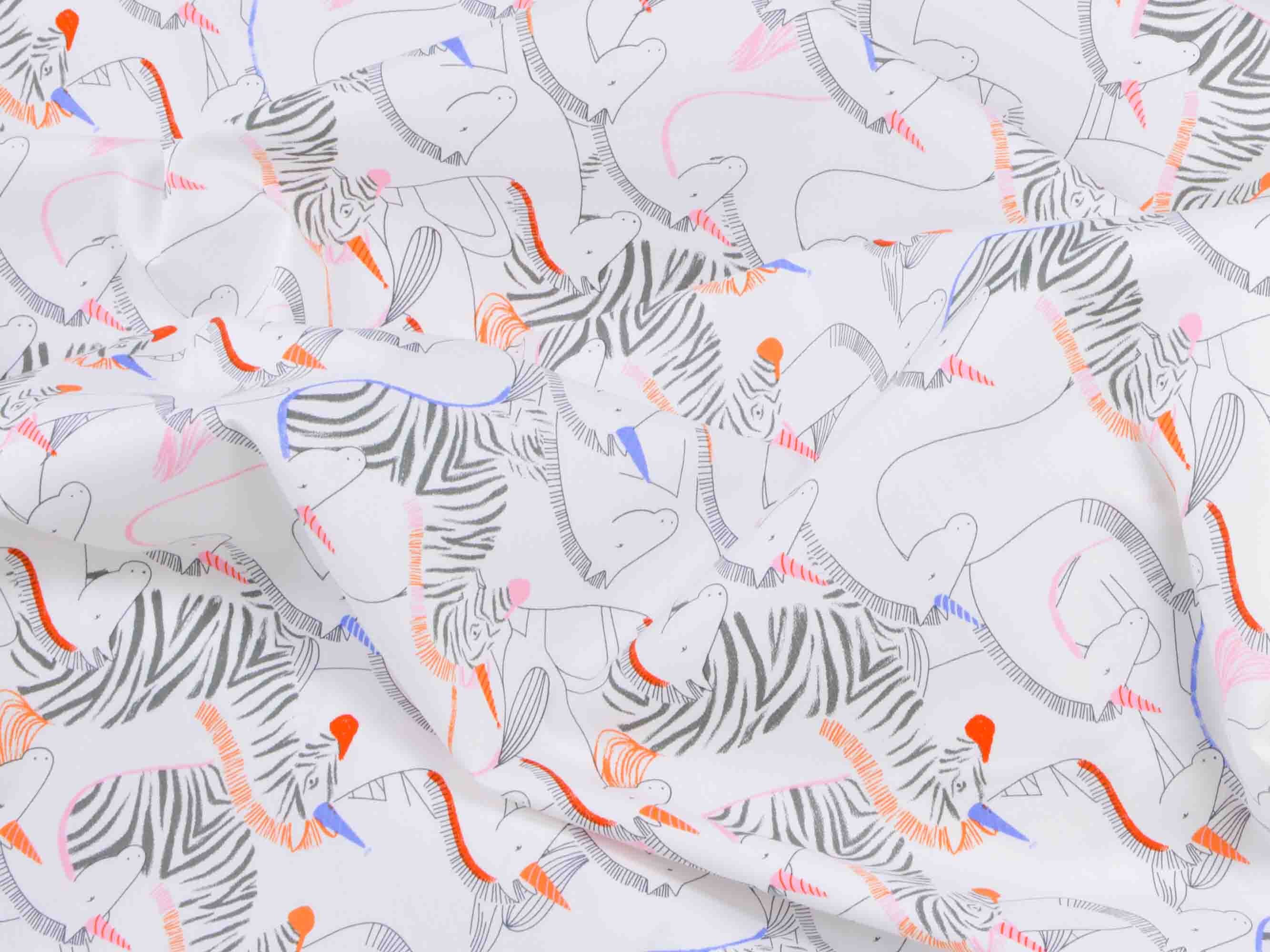 Popeline aus Baumwolle mit abstrakten Zebras und Einhörnern. Wunderbar für Sommerkleider, Blusen oder zum nähen von Kissen.