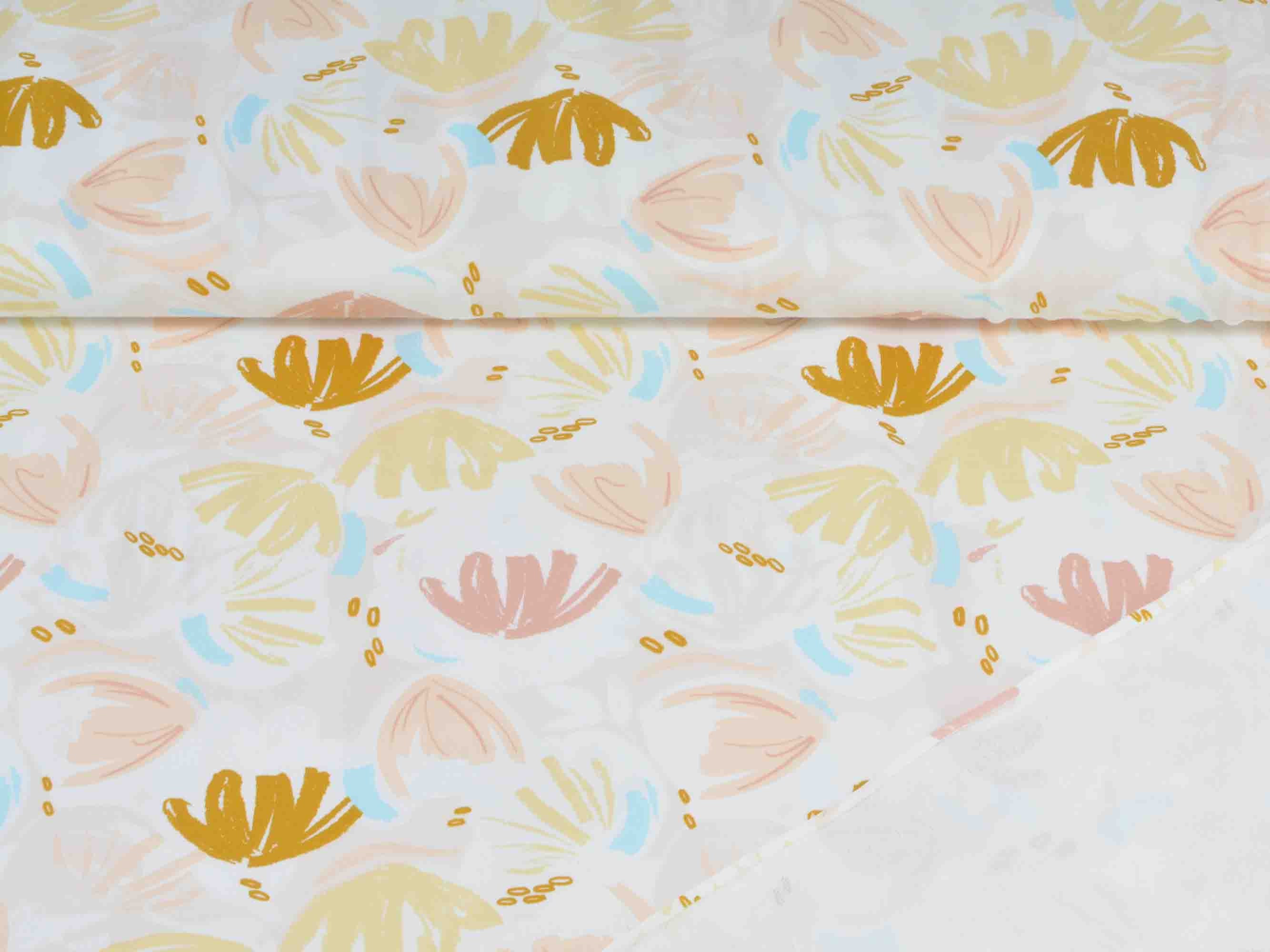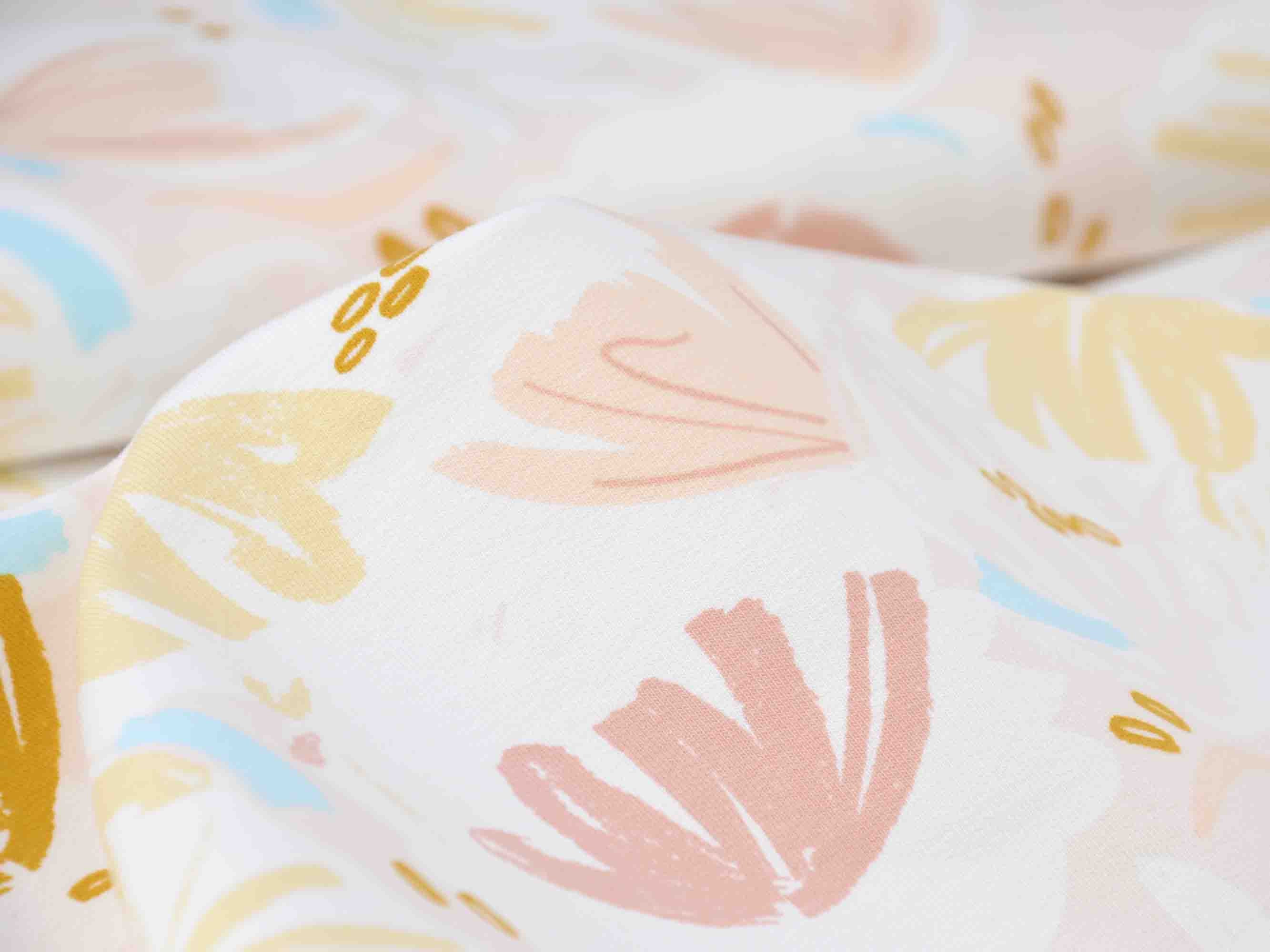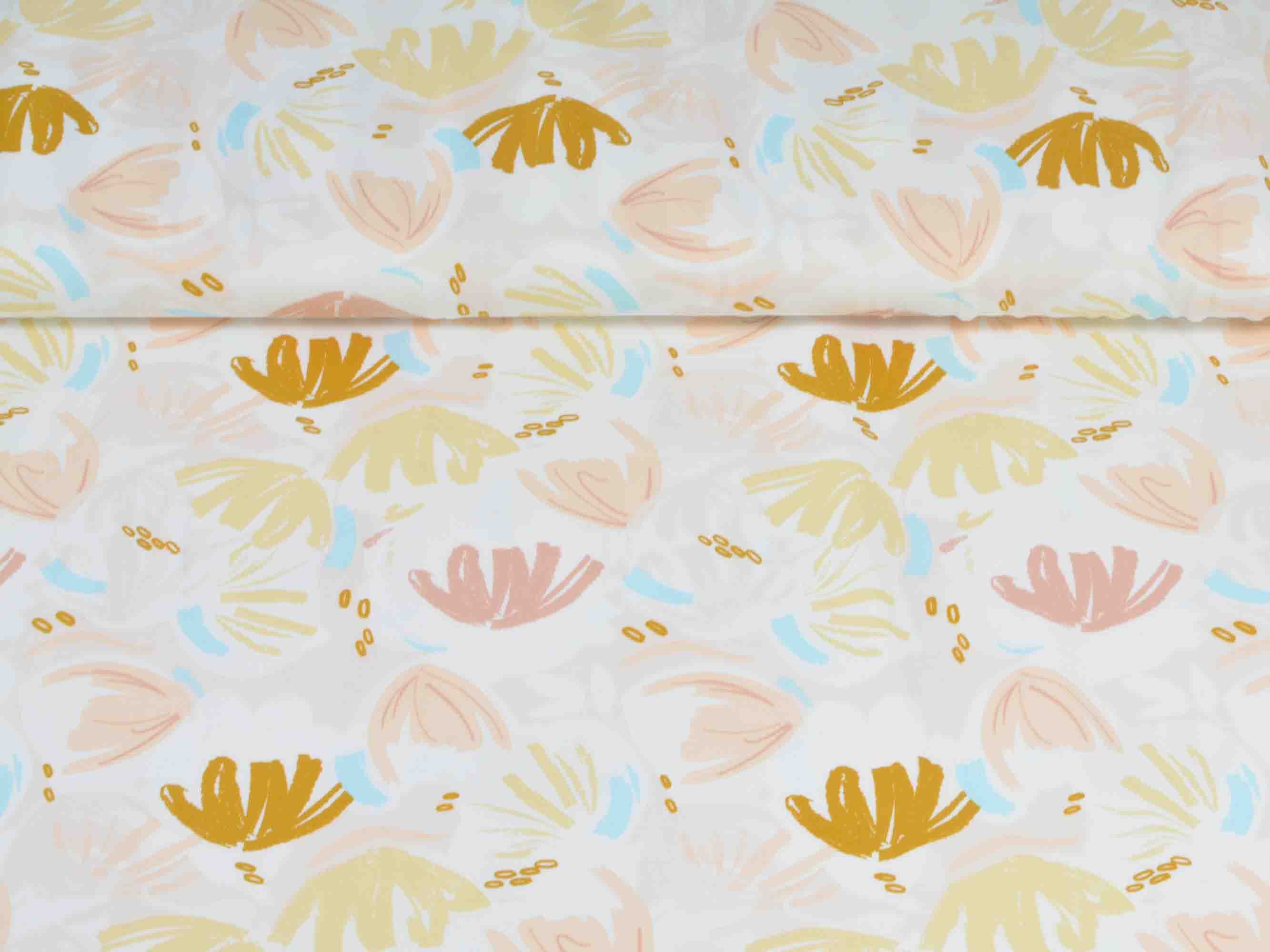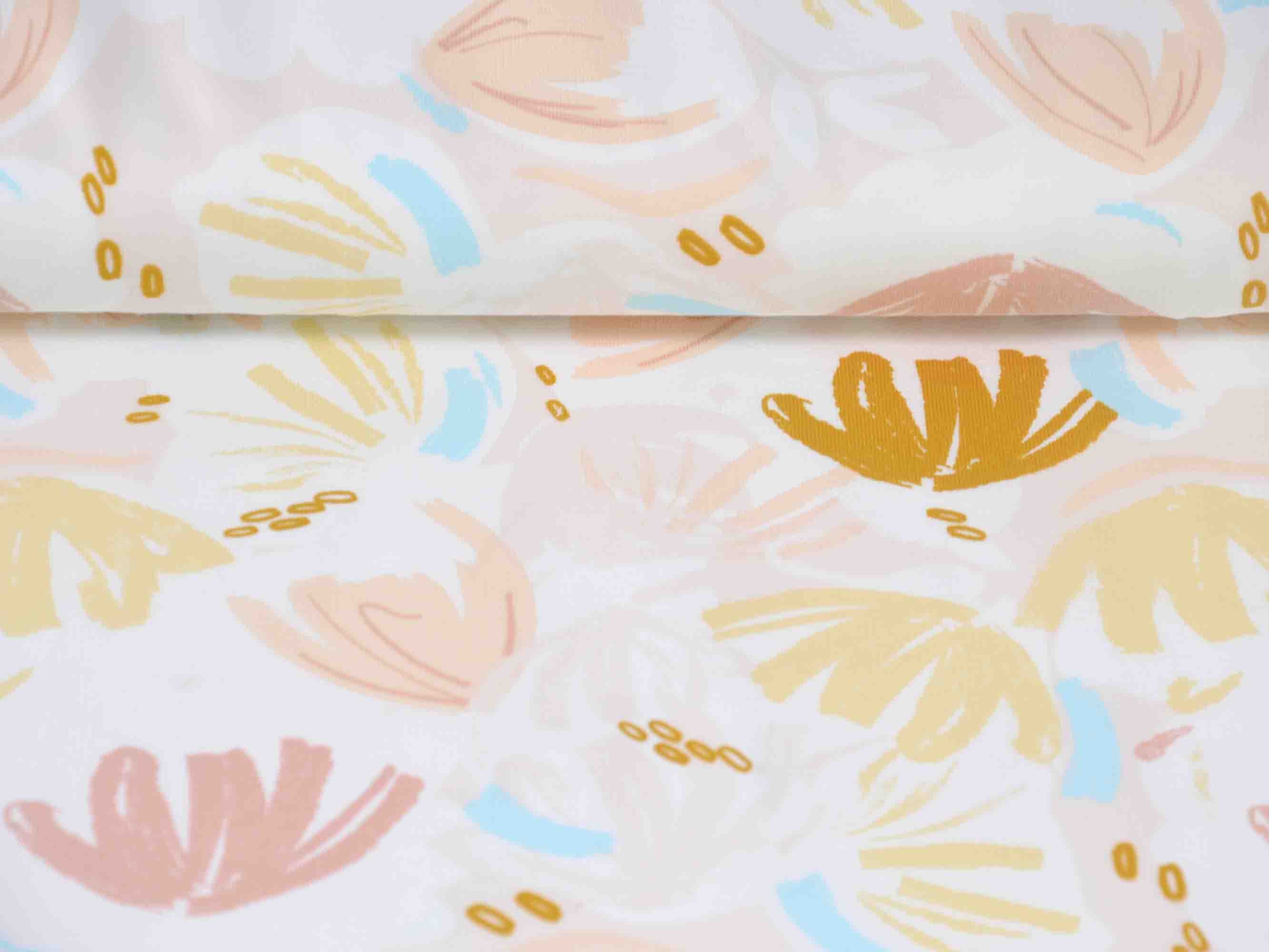 Sweatstoff mit Blumen. Die Innenseite ist weiß. Schöner leichter Sweat für den Übergang.