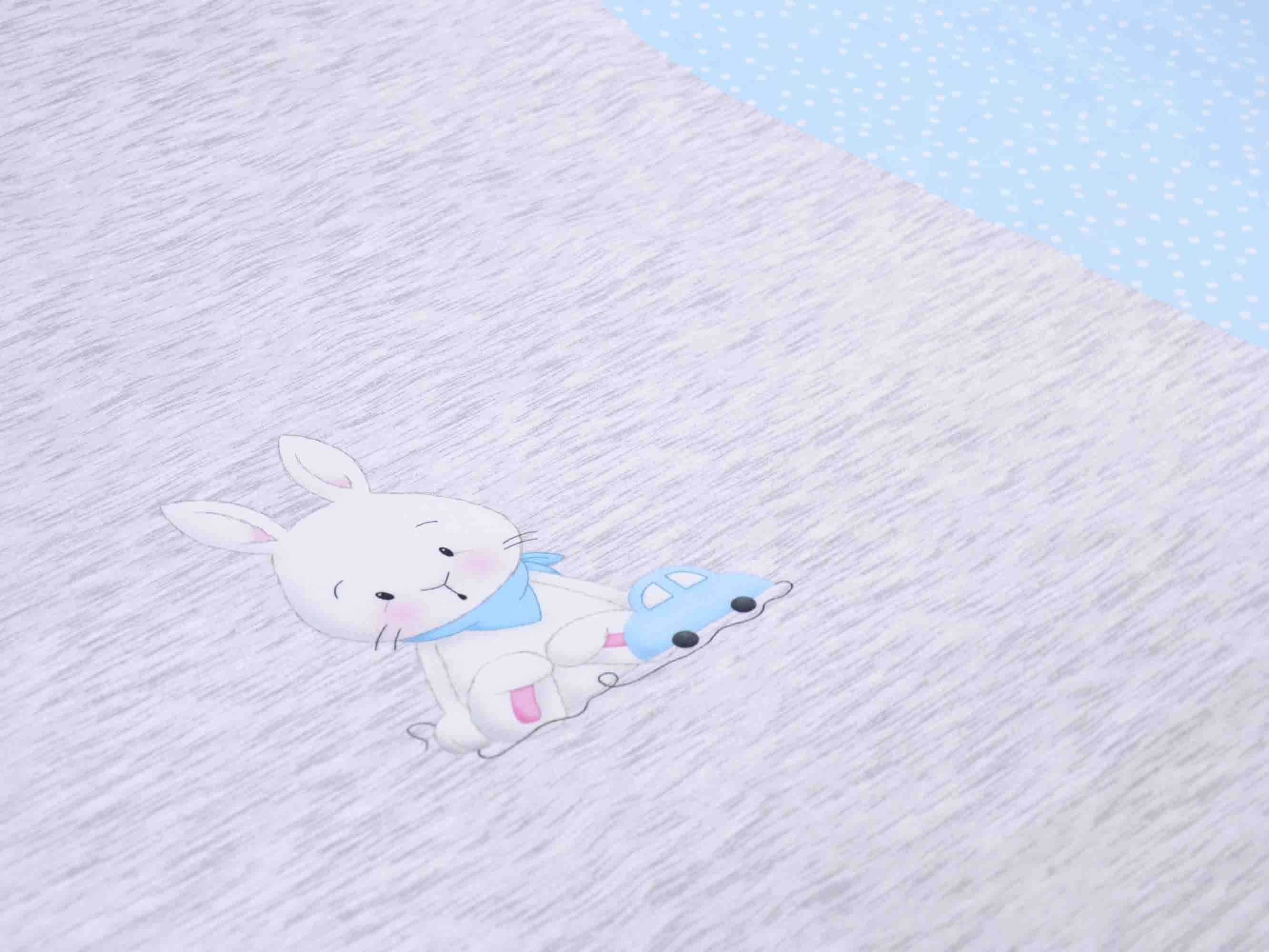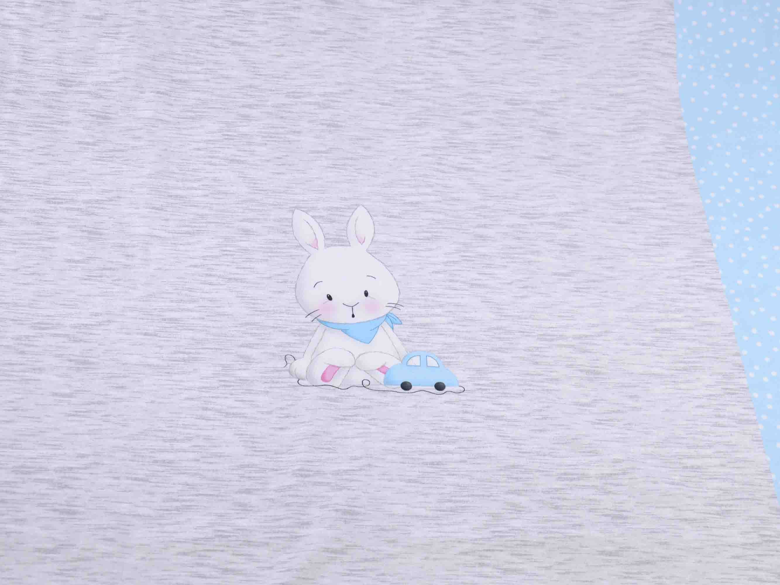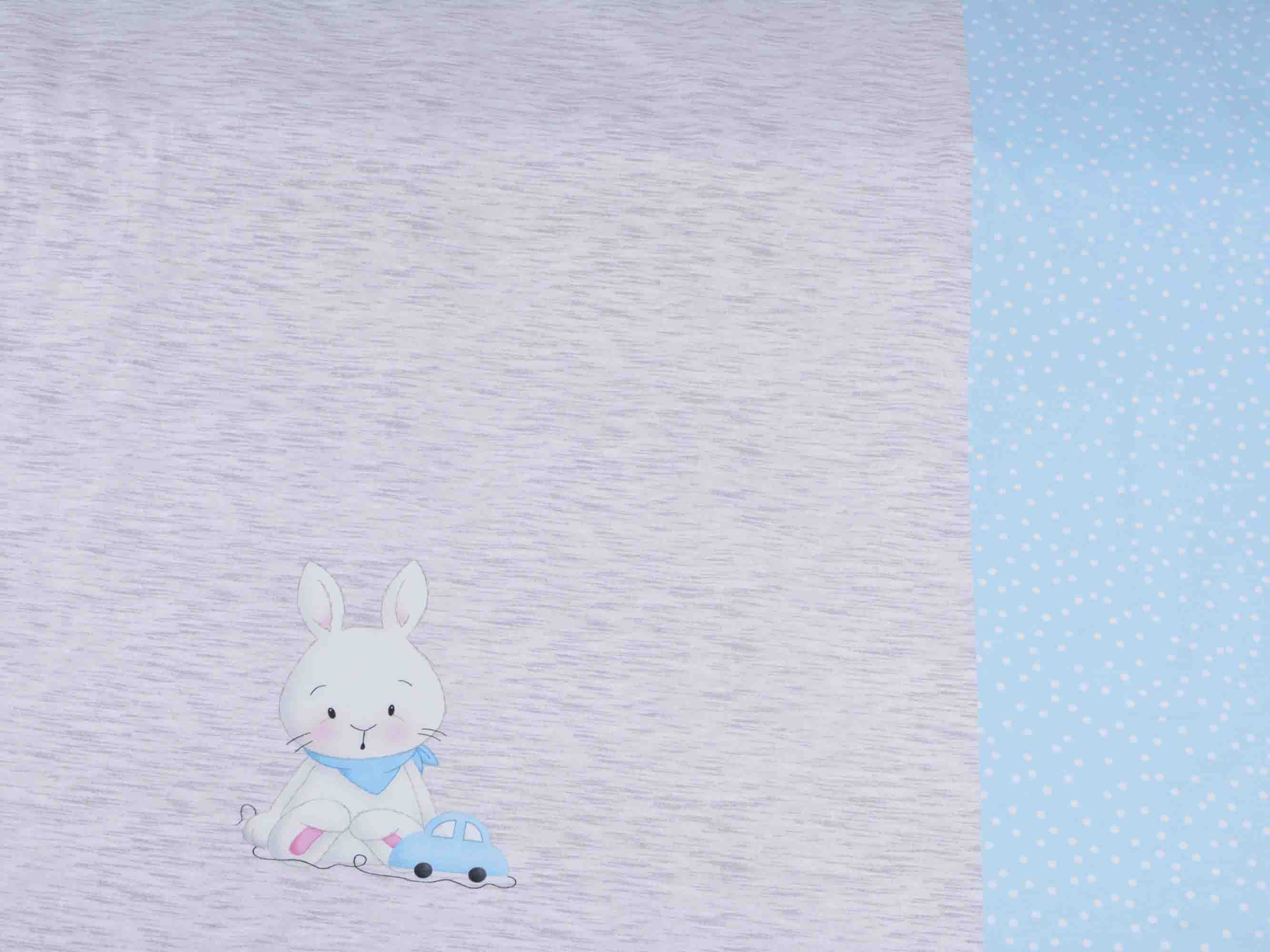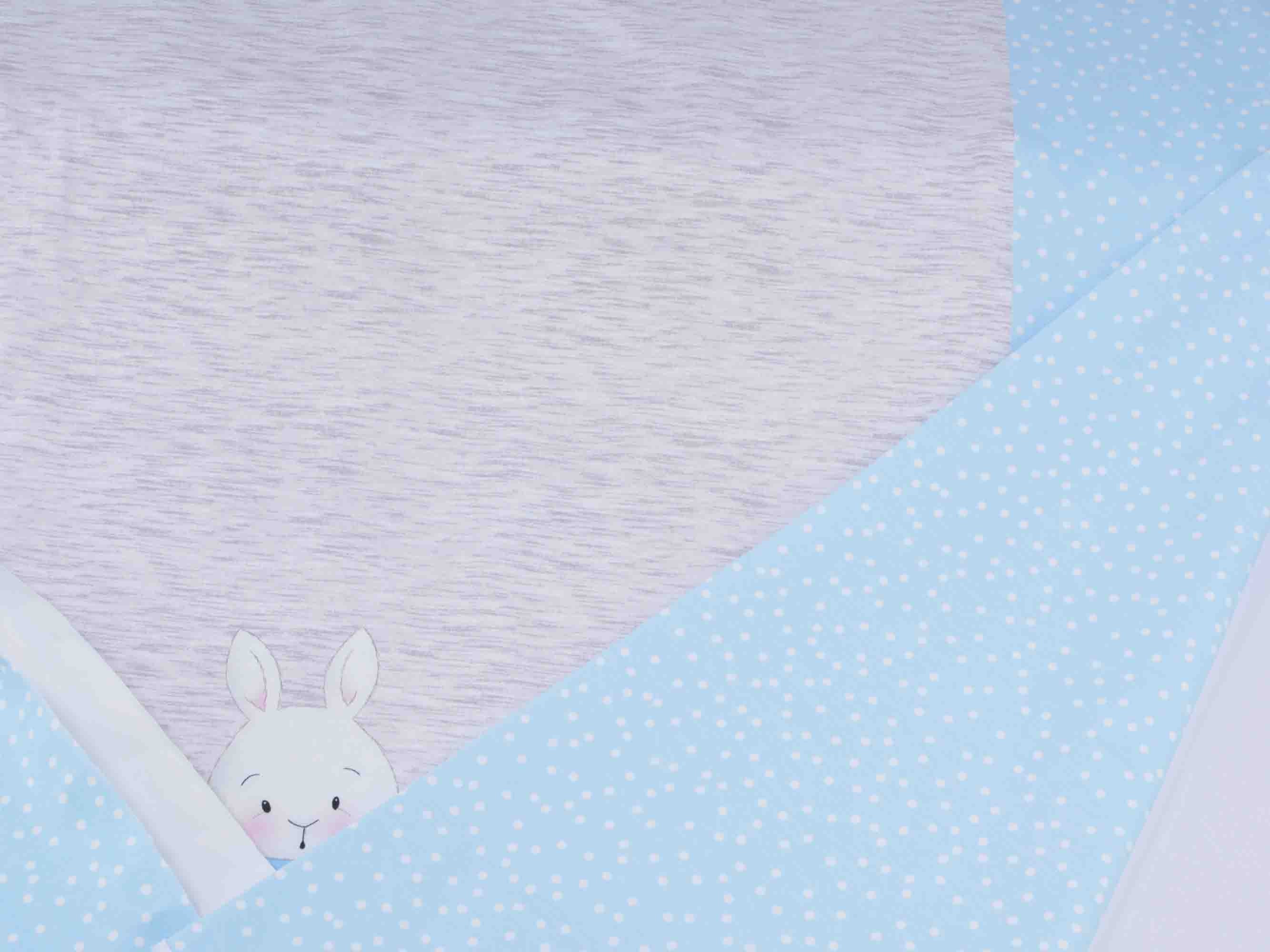 Baumwolljersey Panel mit einem Hasen. Hellblaue Rückseite mit kleinen, weißen Pünktchen. Ein Panel ist ca 56cm lang.