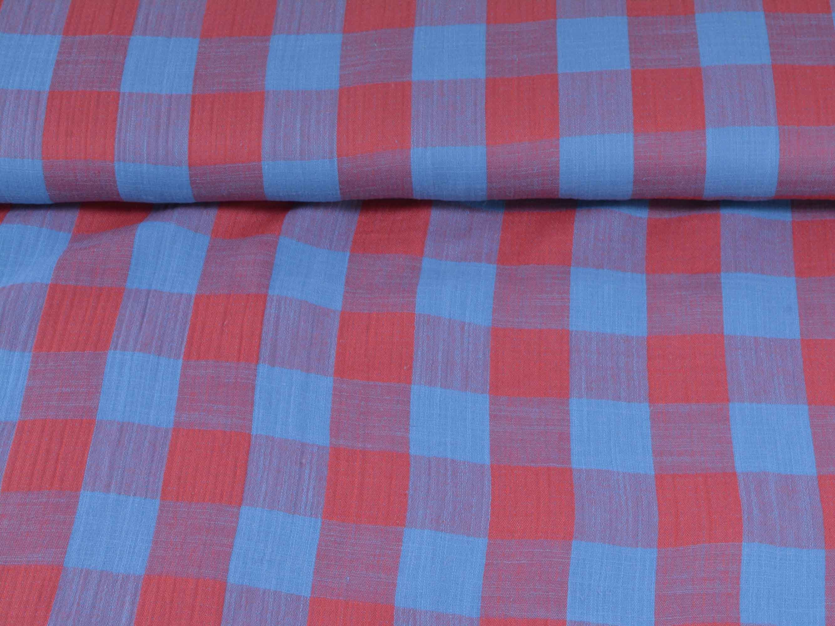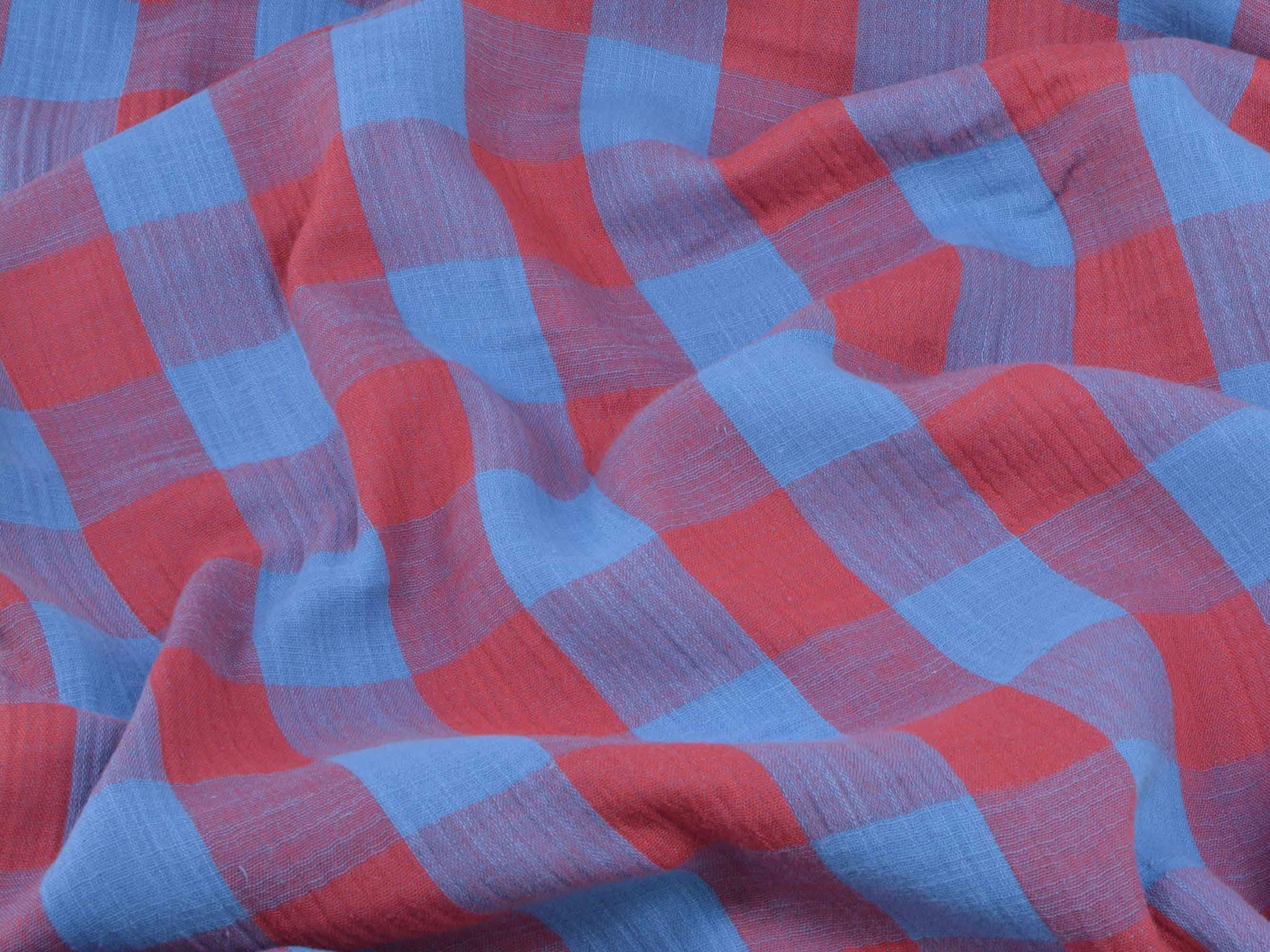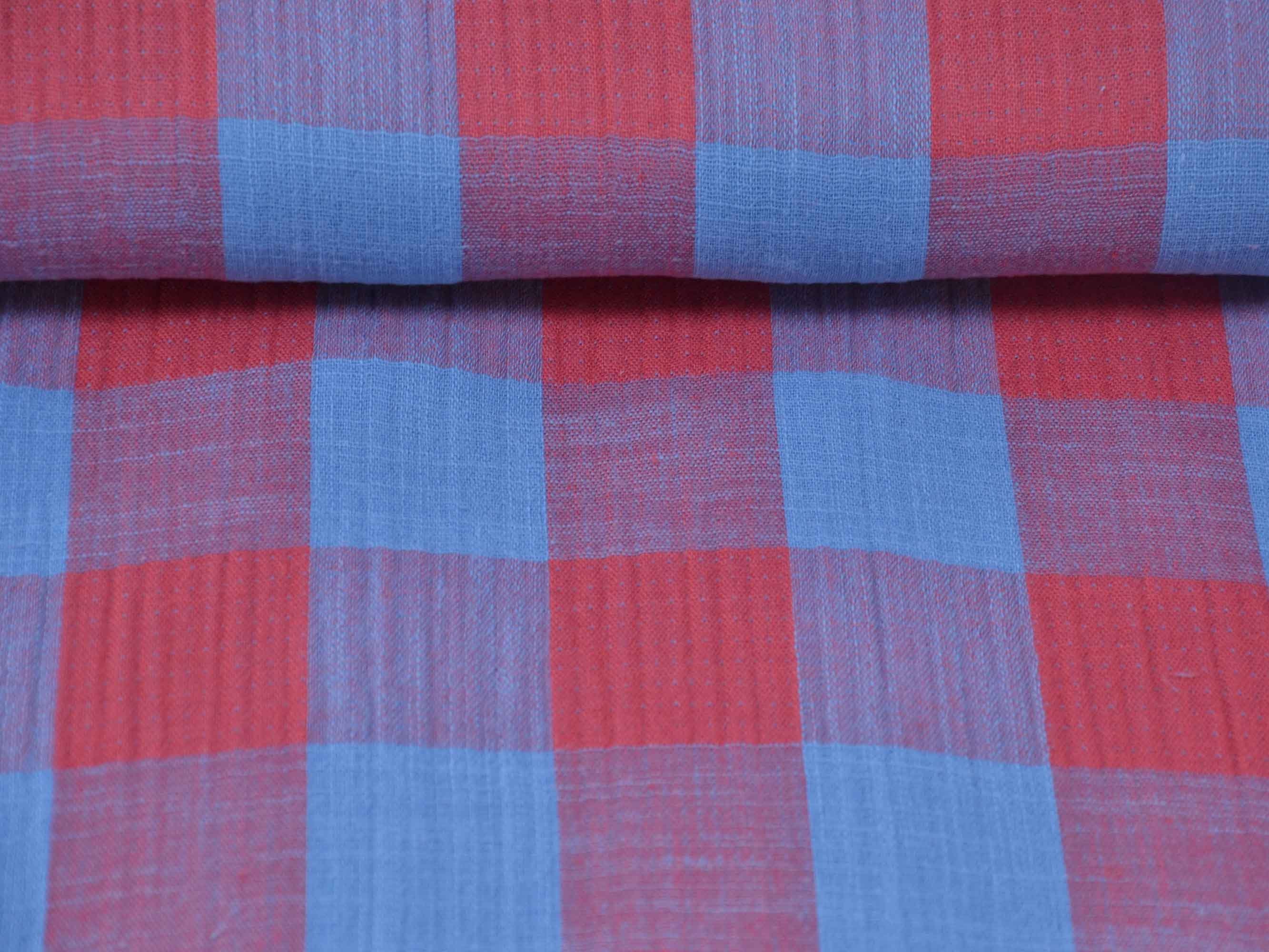 Baumwoll-Musselin für Kinder. Auf dem Stoff große Karos in rot blau die Rückseite ist einfarbig blau. Der hochwertige Musselin kommt aus dem Hause Katia. Er eignet sich perfekt für Kleider, Blusen, Röcke, Kuscheldecken und so vieles mehr.