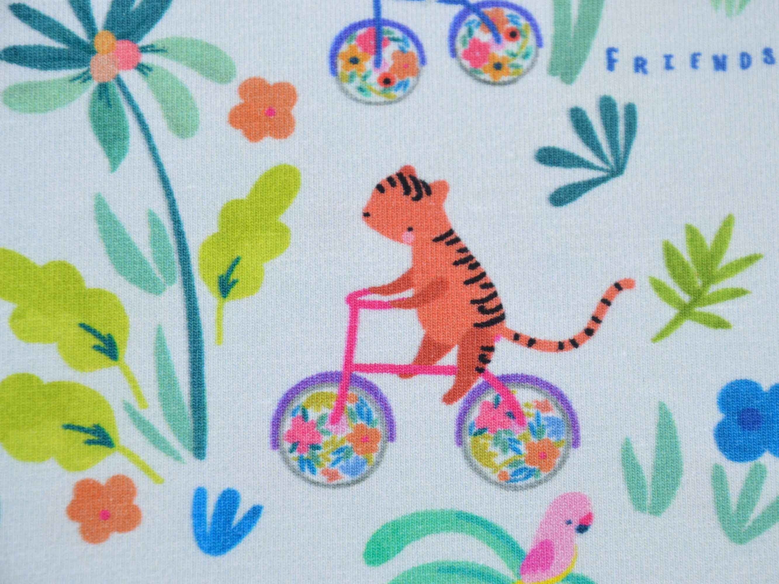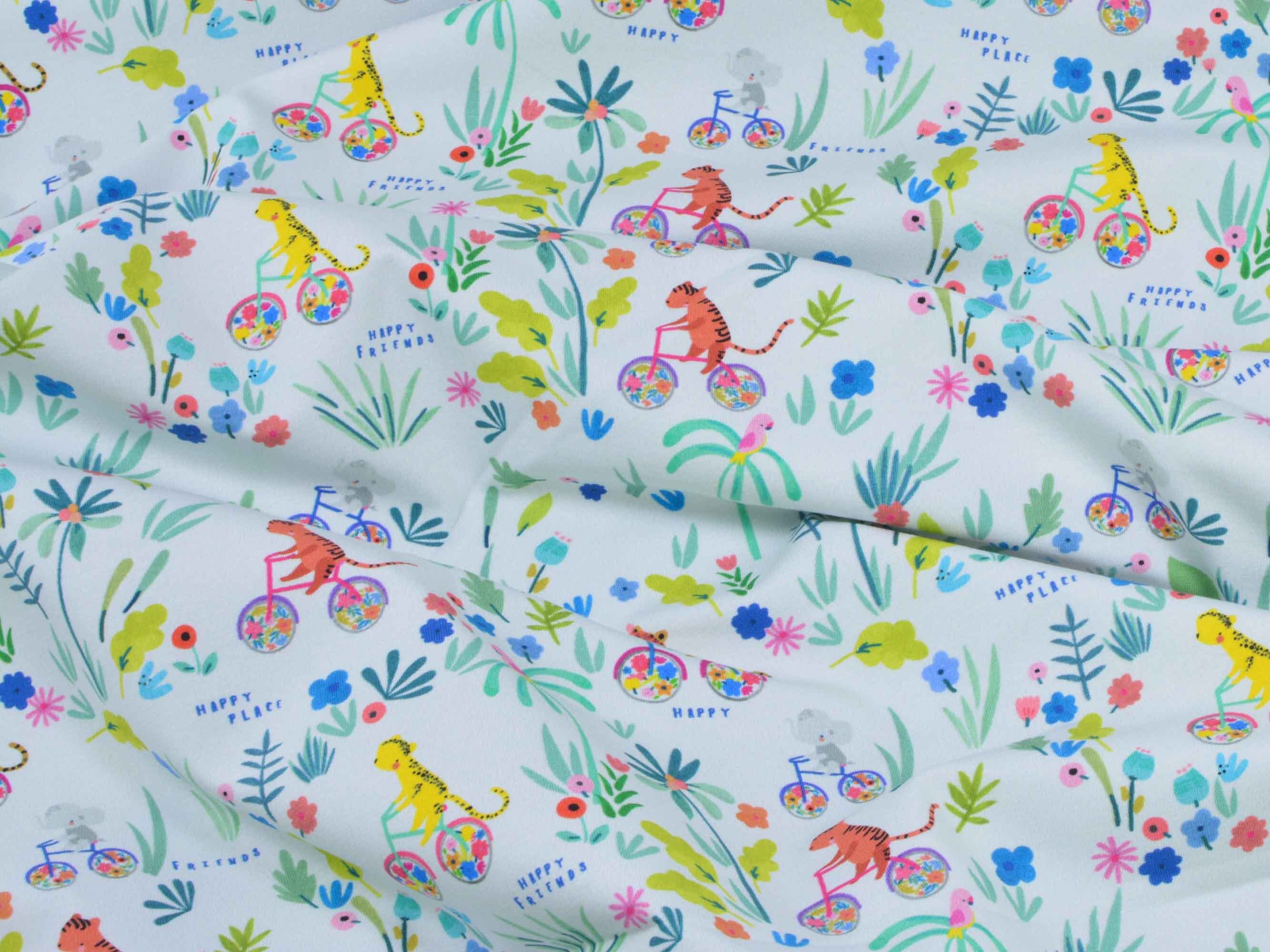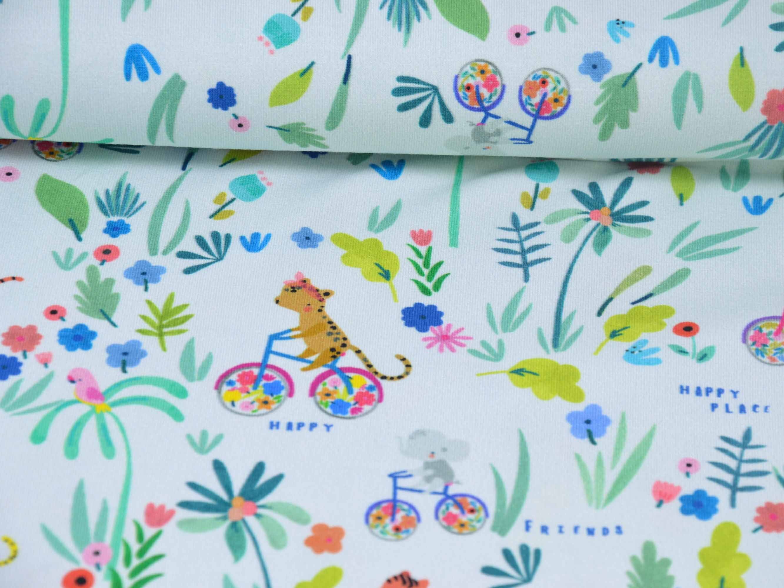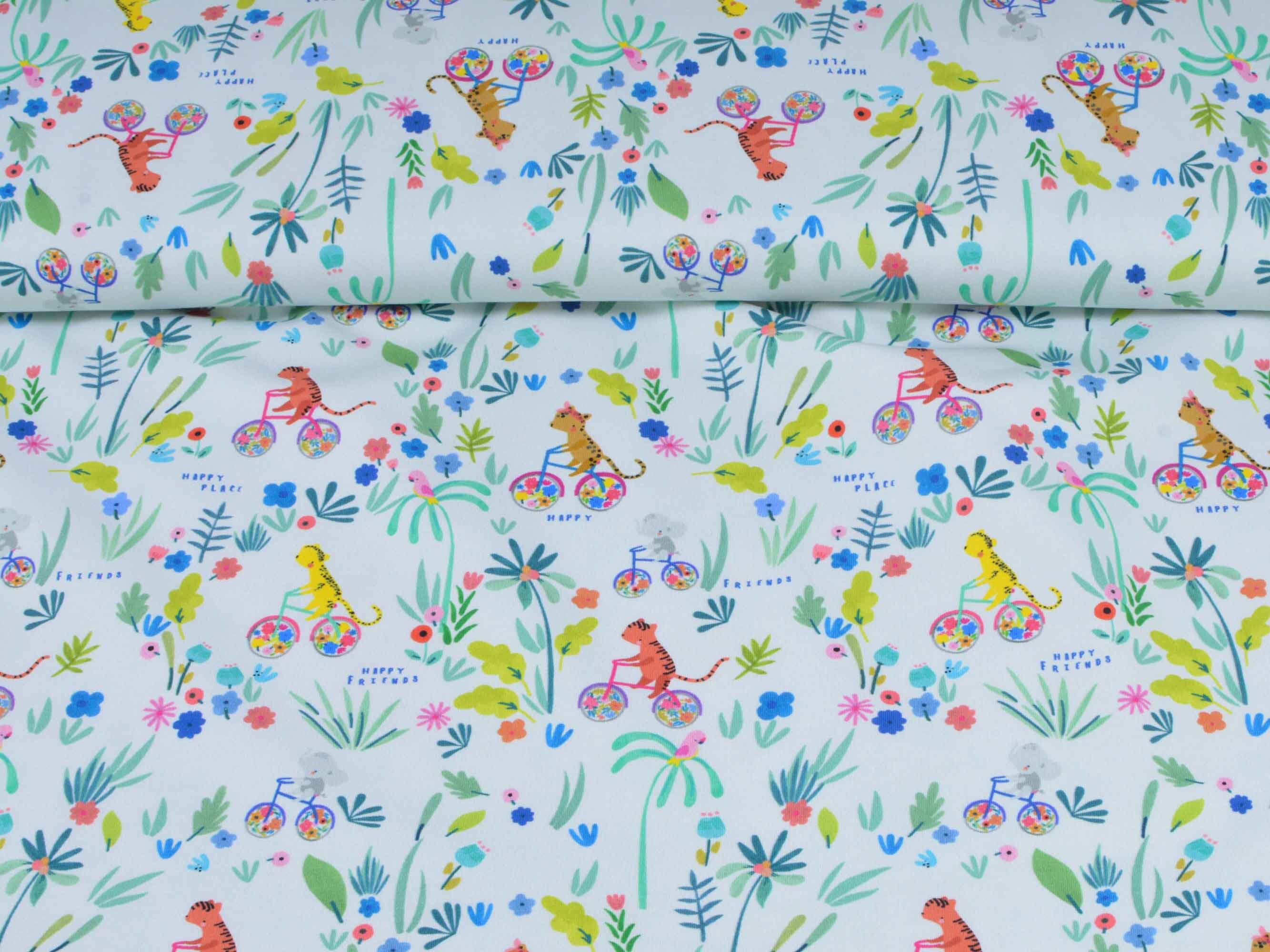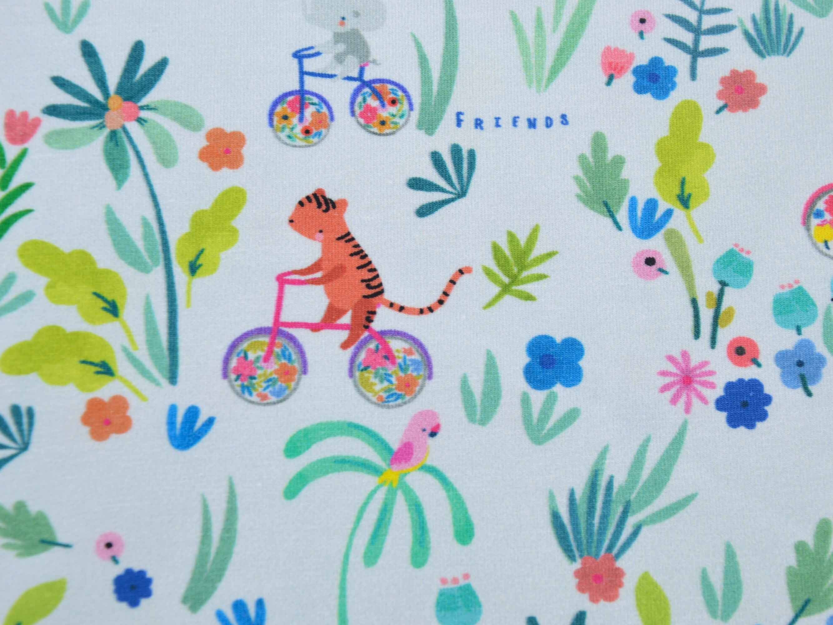 Weißer Baumwolljersey mit grünen Blättern und Blumen und Fahrrad fahrenden Tieren in gelb, braun und rot. Ein Tier mit Fahrrad ist ca 6 cm groß. Der Stoff ist dünn und glatt. Er eignet sich wunderbar zum Nähen von T-Shirts, Kleidern, Röcken, Pumphosen, Shorts und vielem mehr.