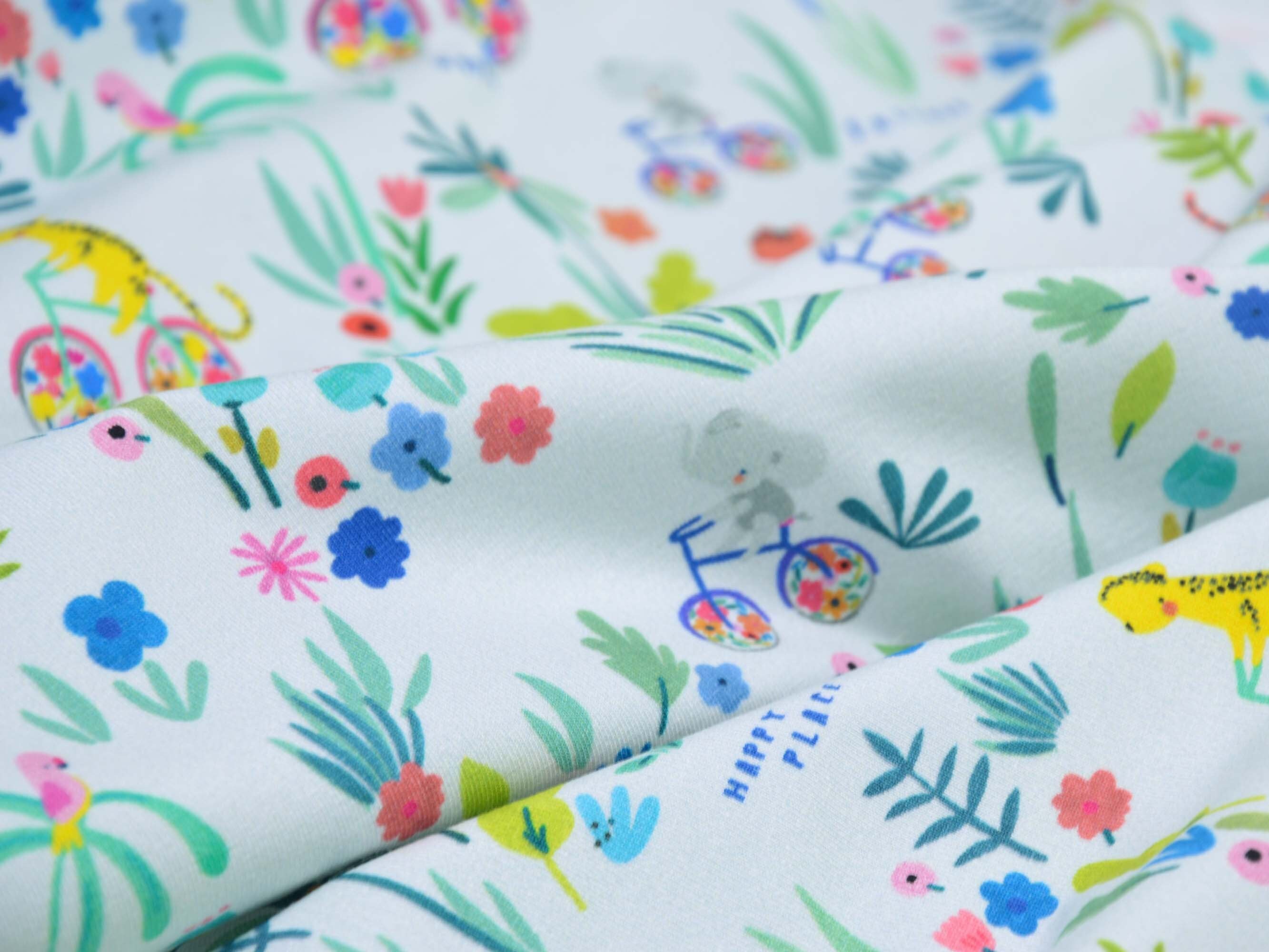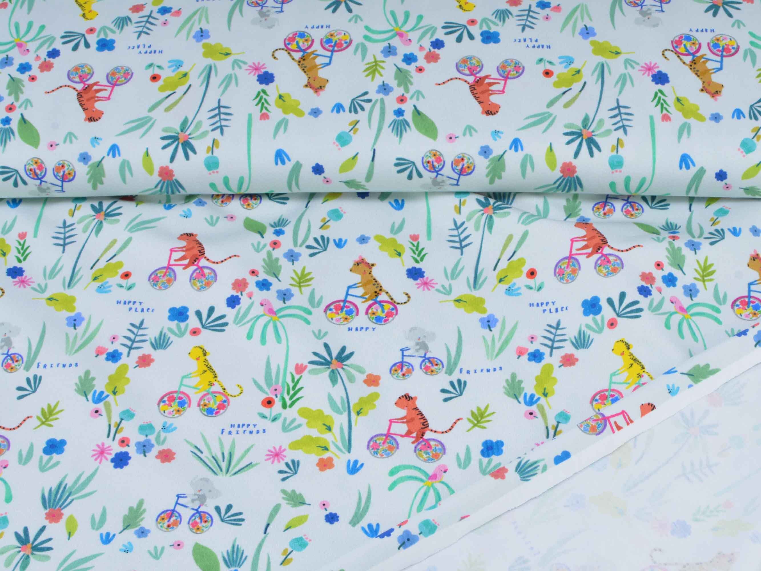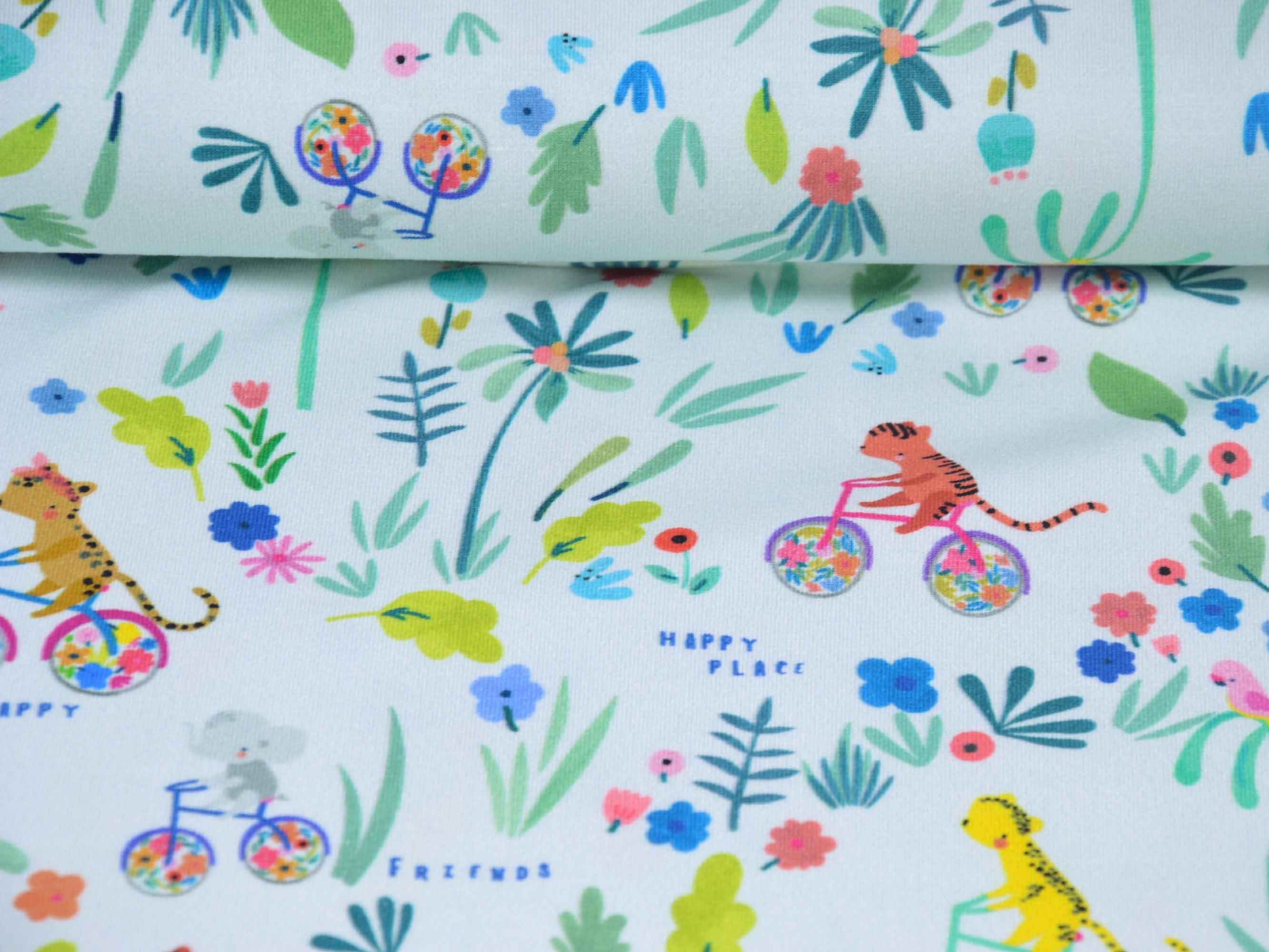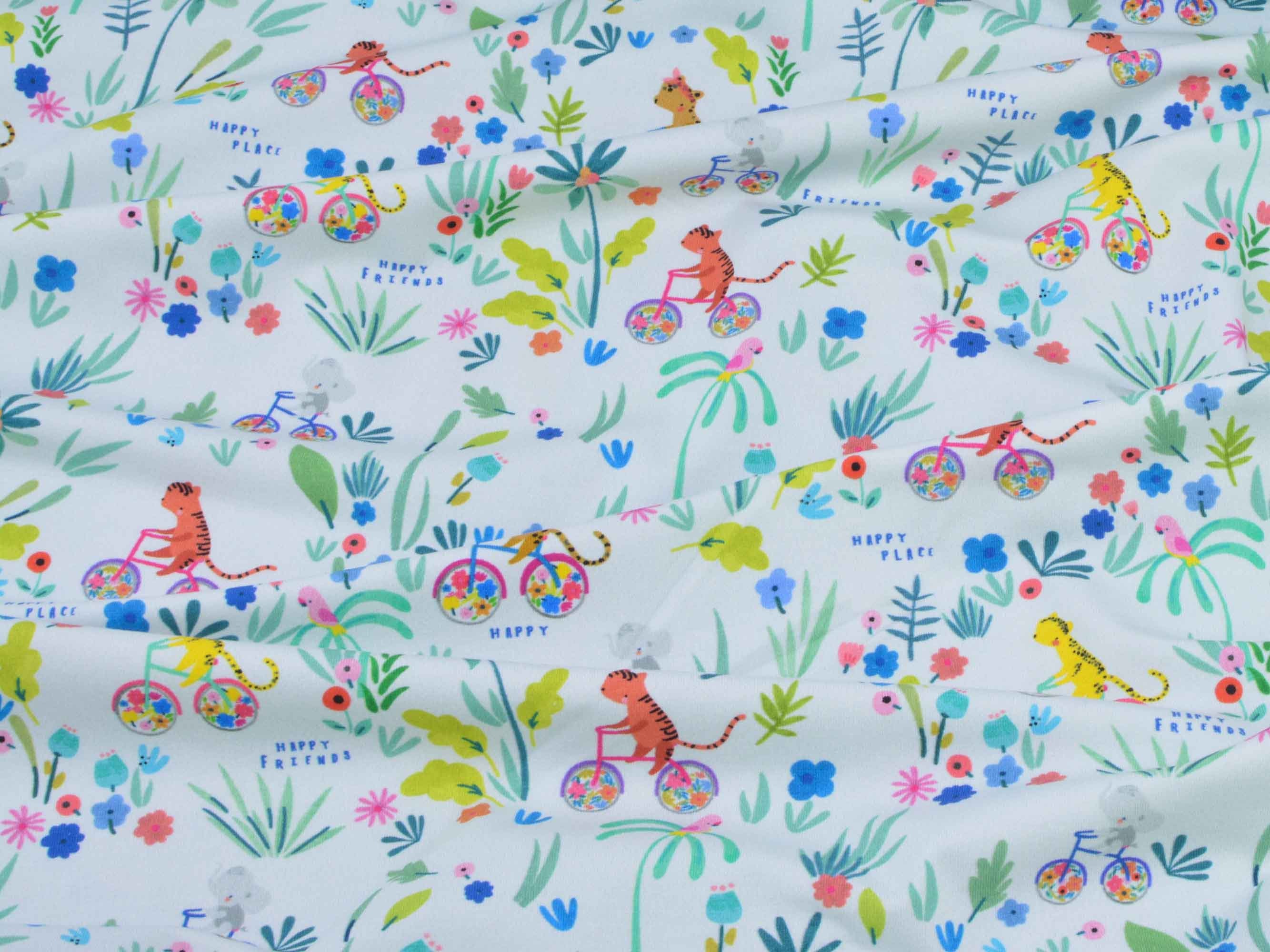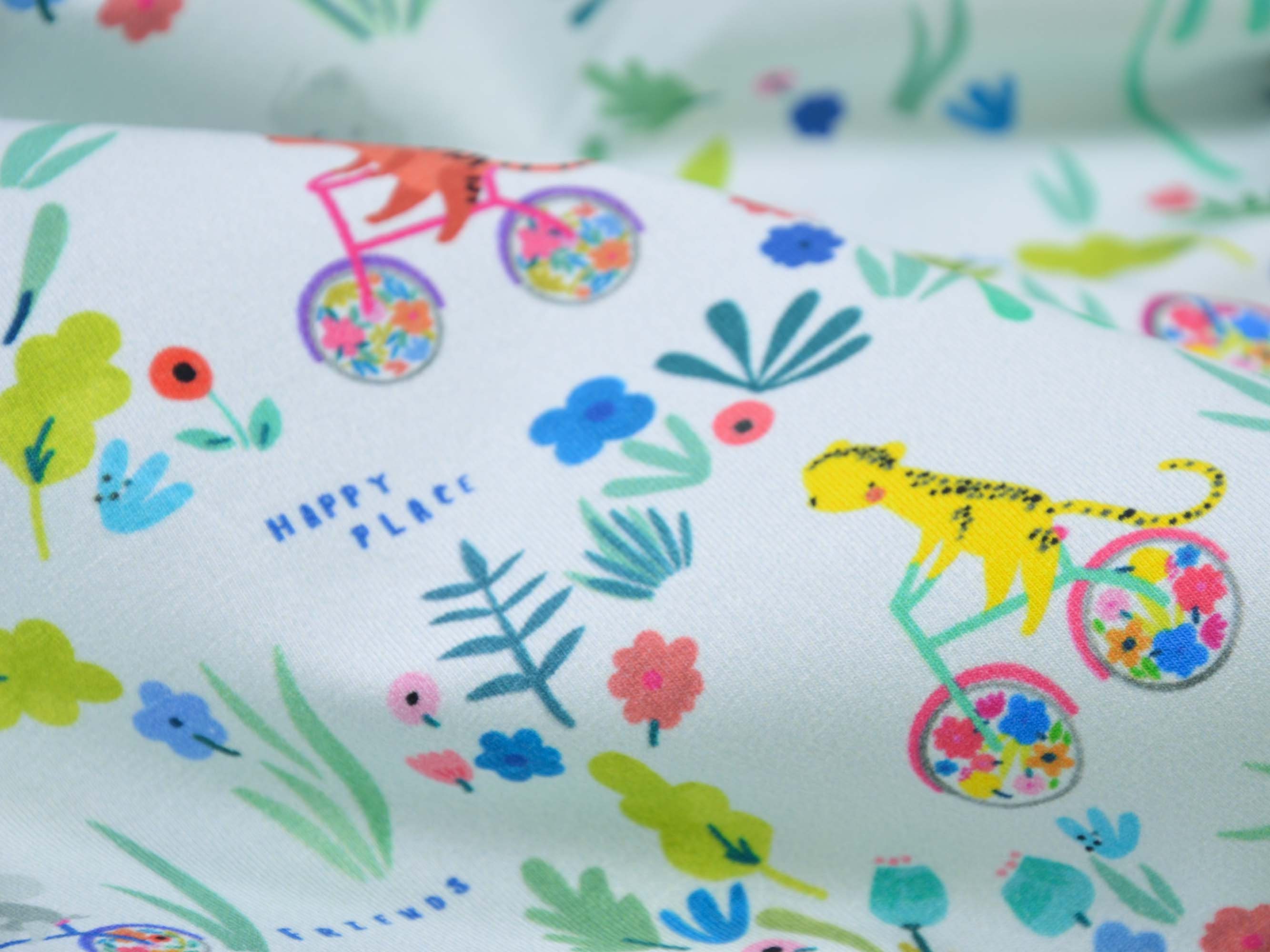 Weißer Baumwolljersey mit grünen Blättern und Blumen und Fahrrad fahrenden Tieren in gelb, braun und rot. Ein Tier mit Fahrrad ist ca 6 cm groß. Der Stoff ist dünn und glatt. Er eignet sich wunderbar zum Nähen von T-Shirts, Kleidern, Röcken, Pumphosen, Shorts und vielem mehr.
