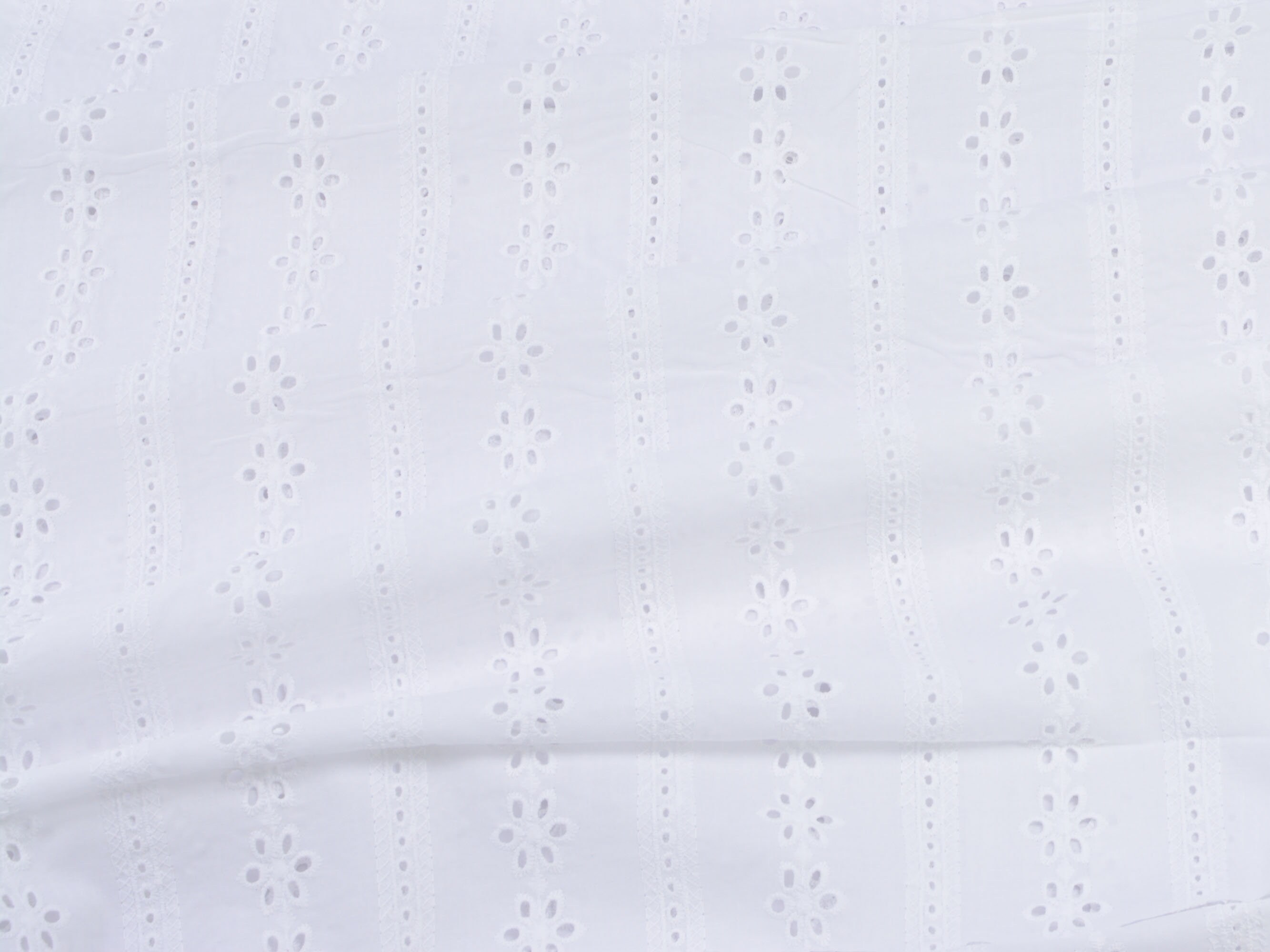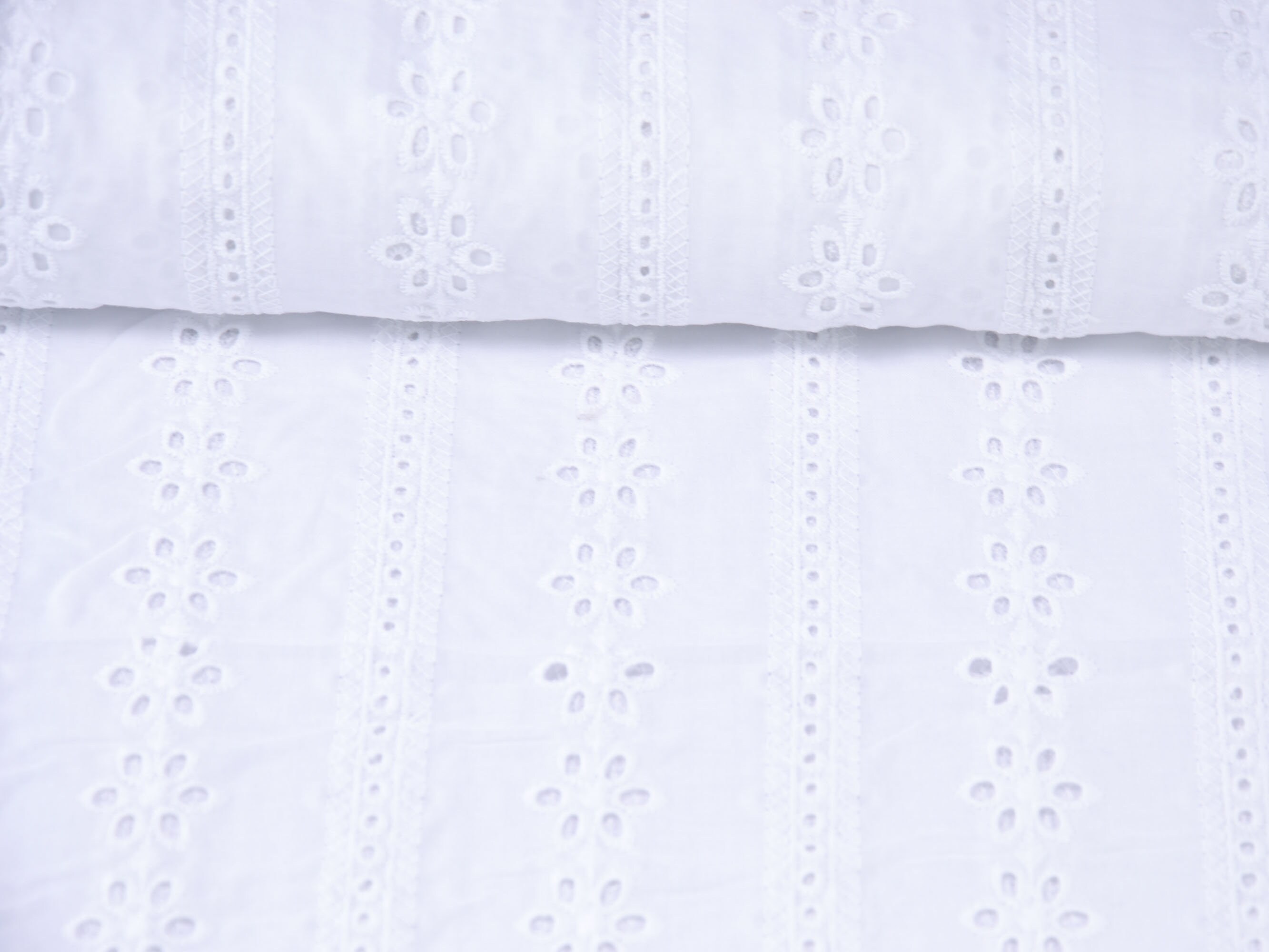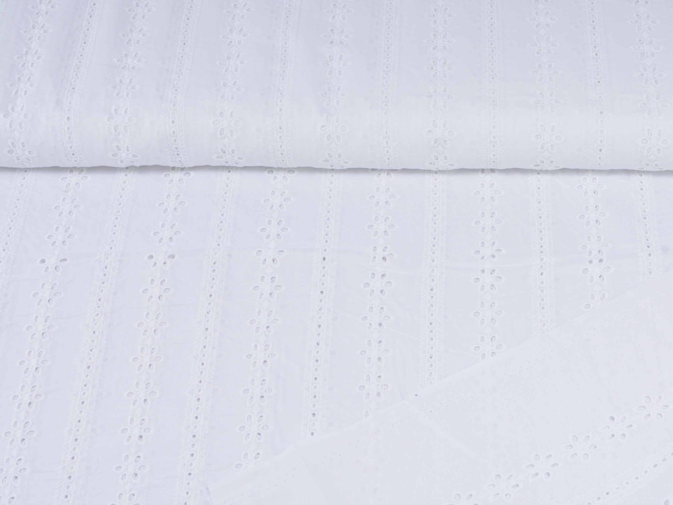 Blusenstoff aus 100% Baumwolle in weiß mit Lochstickerei. Die Stickerei verläuft in Längsstreifen. Daraus lassen sich tolle Sommerkleider, Blusen und Röcke nähen.