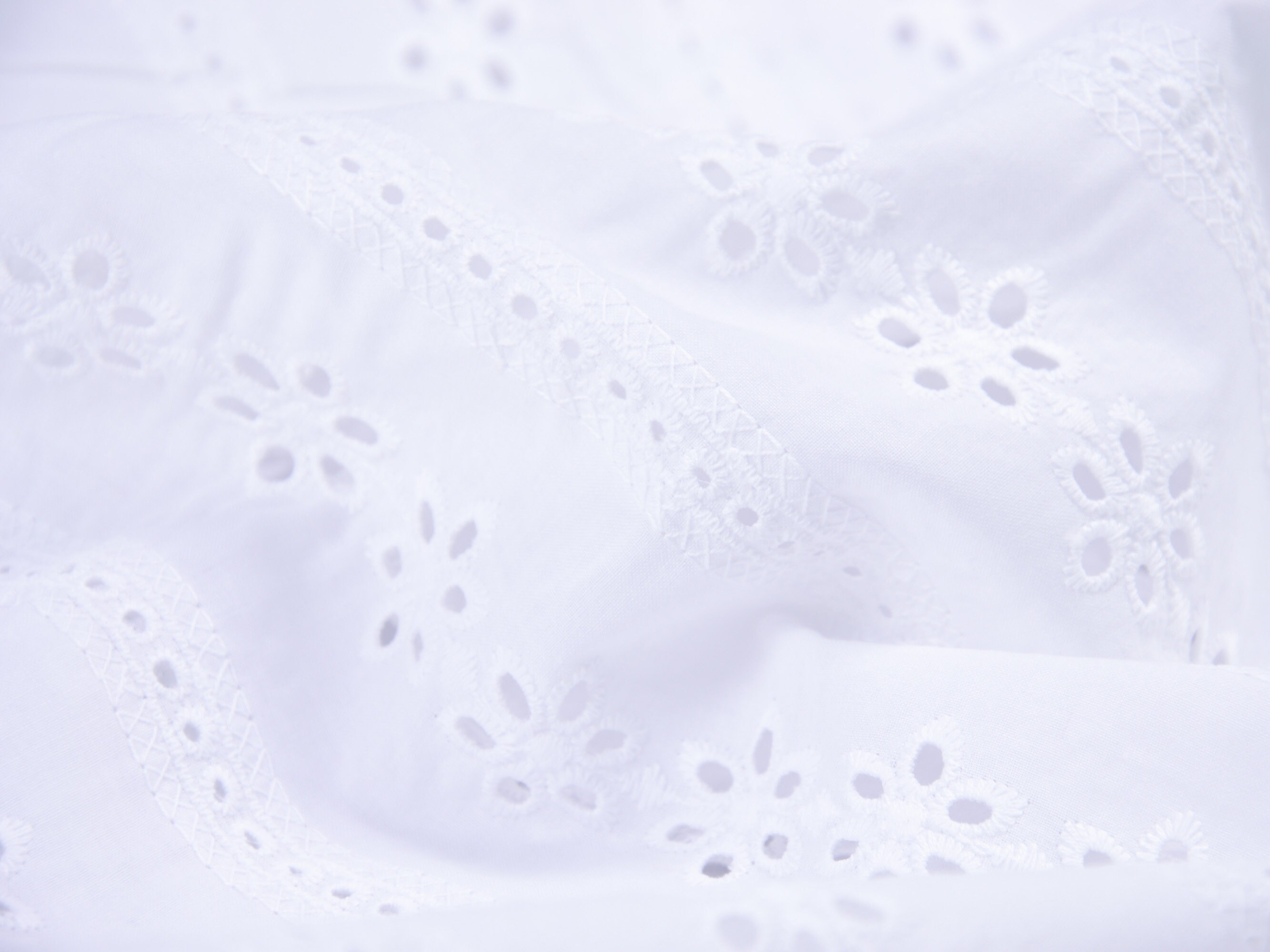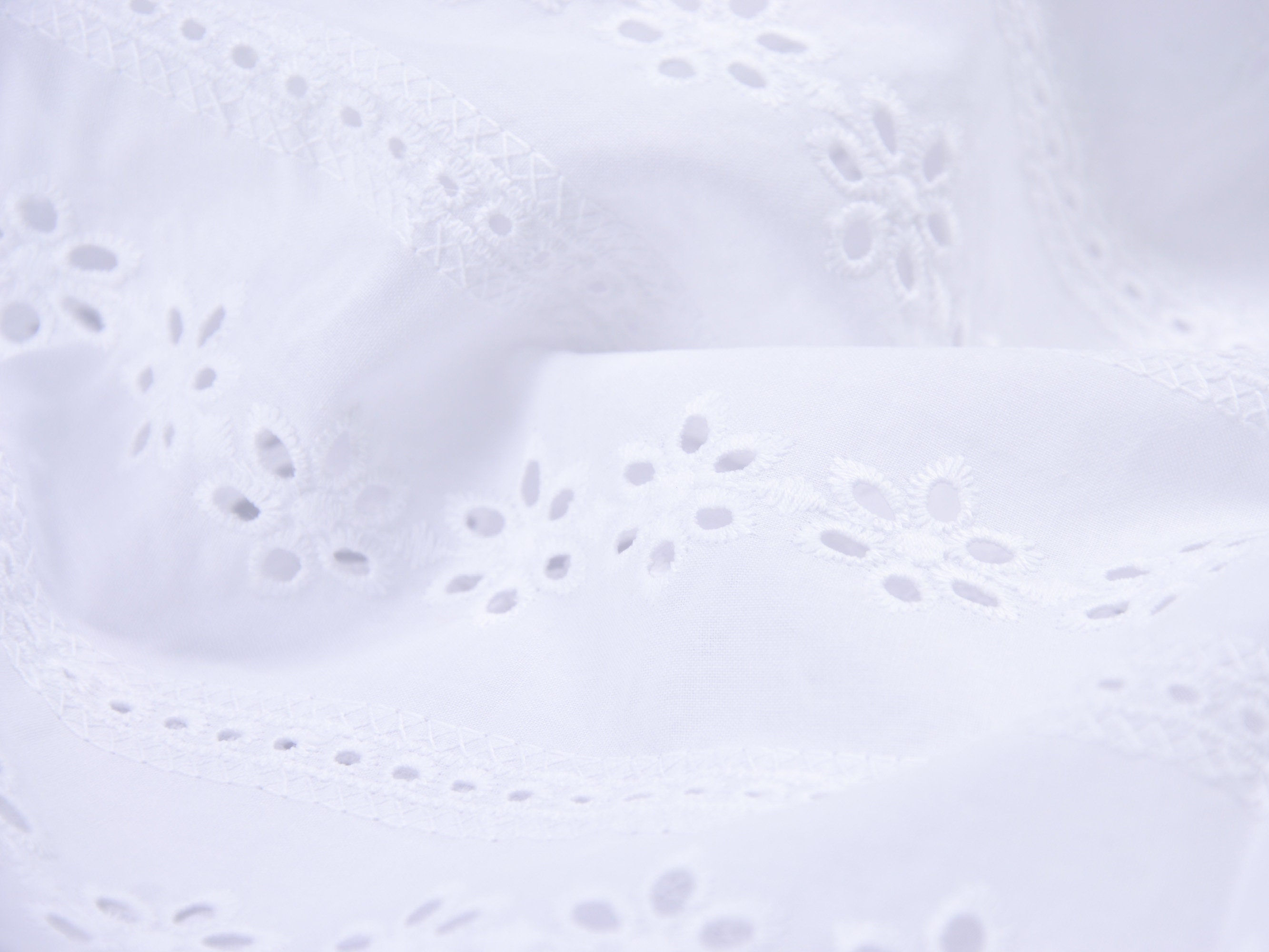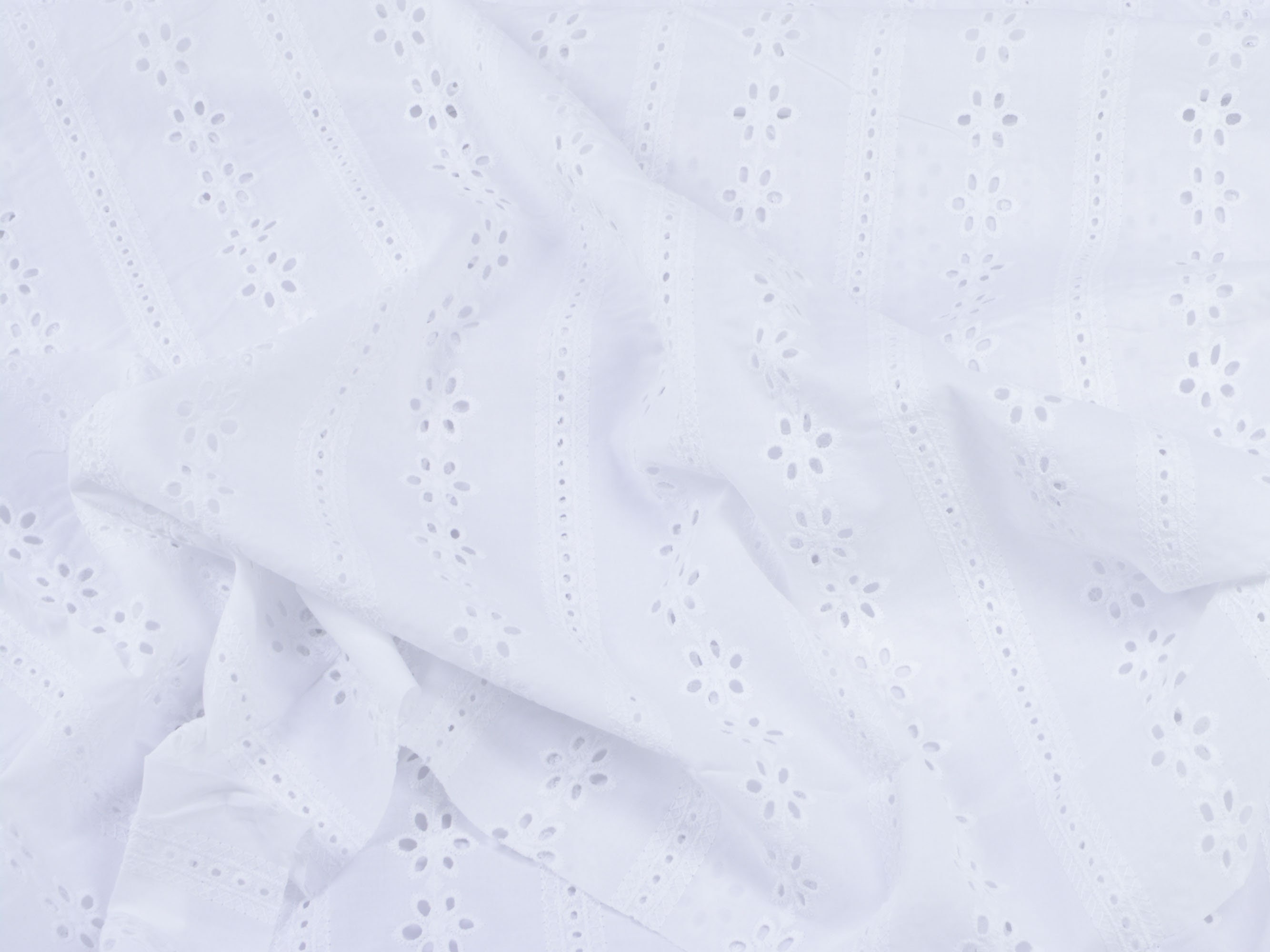 Blusenstoff aus 100% Baumwolle in weiß mit Lochstickerei. Die Stickerei verläuft in Längsstreifen. Daraus lassen sich tolle Sommerkleider, Blusen und Röcke nähen.