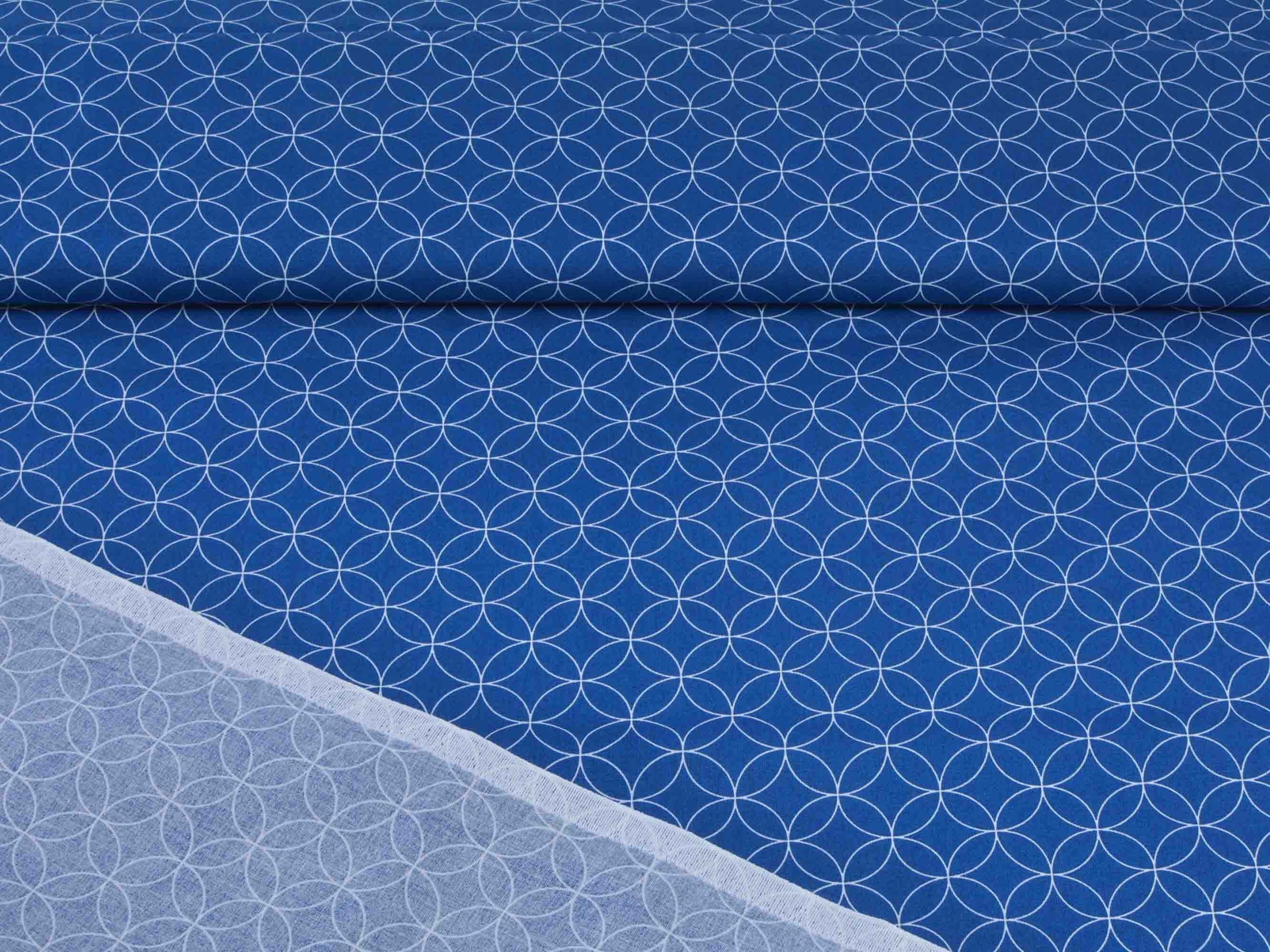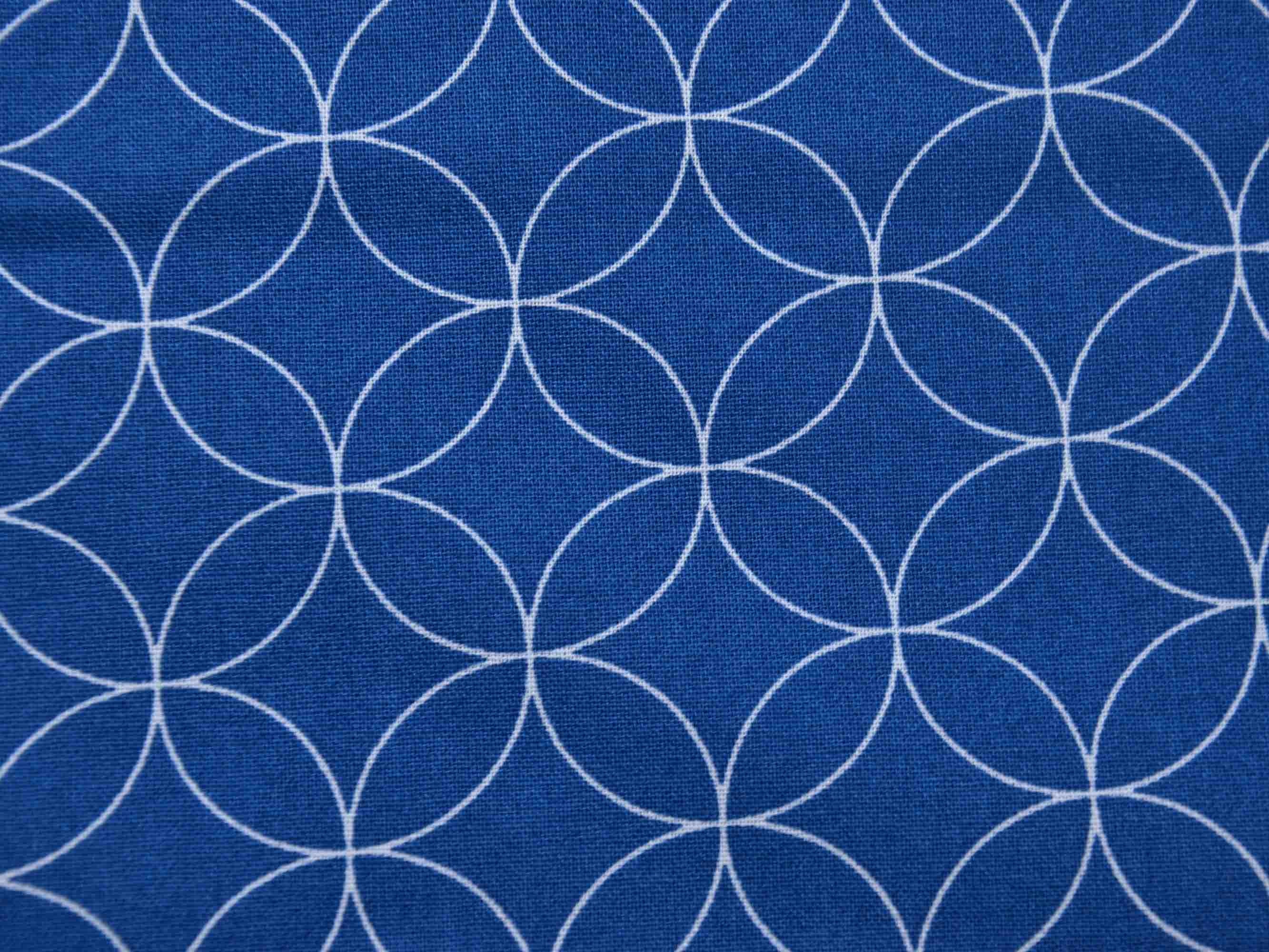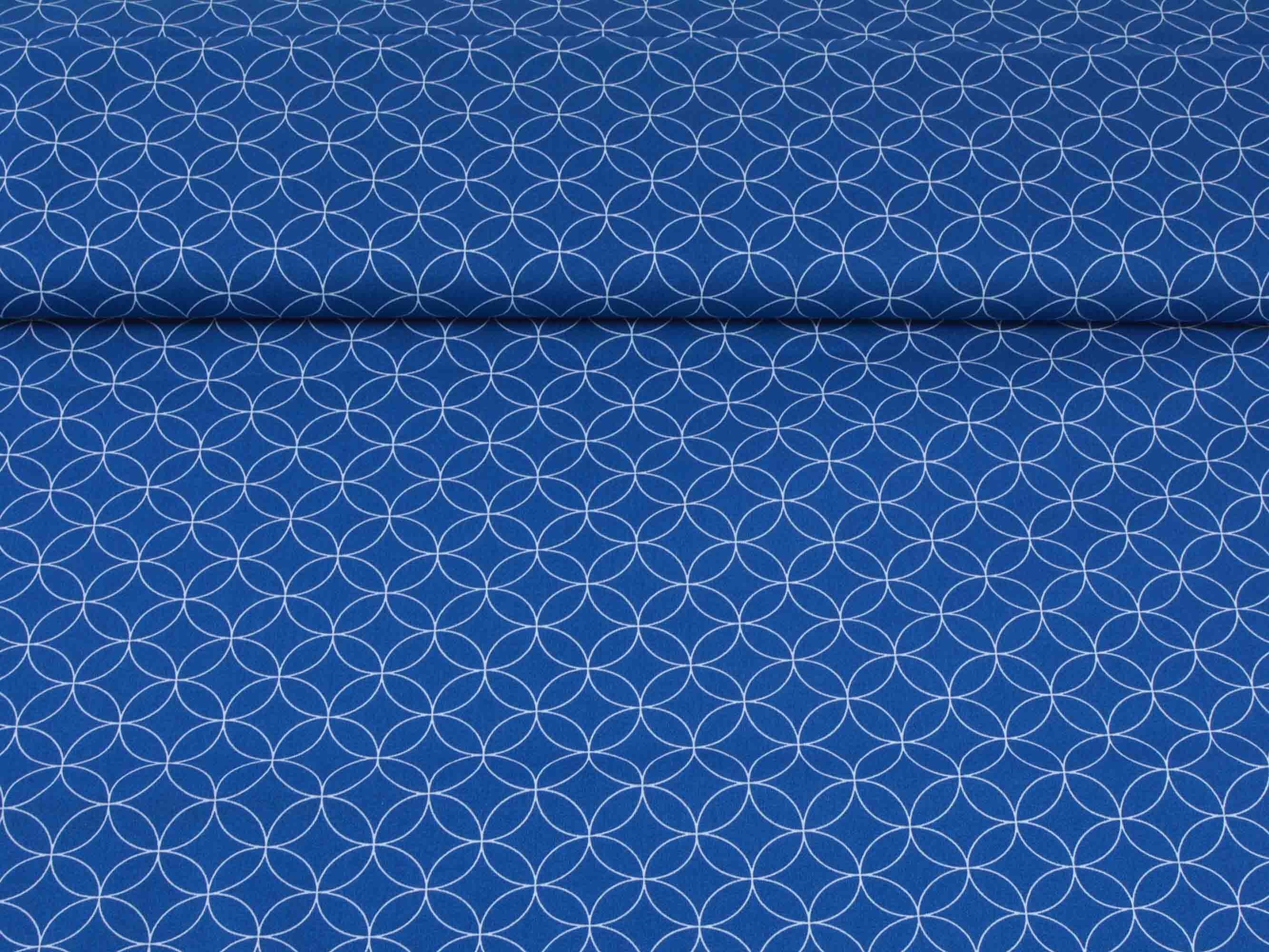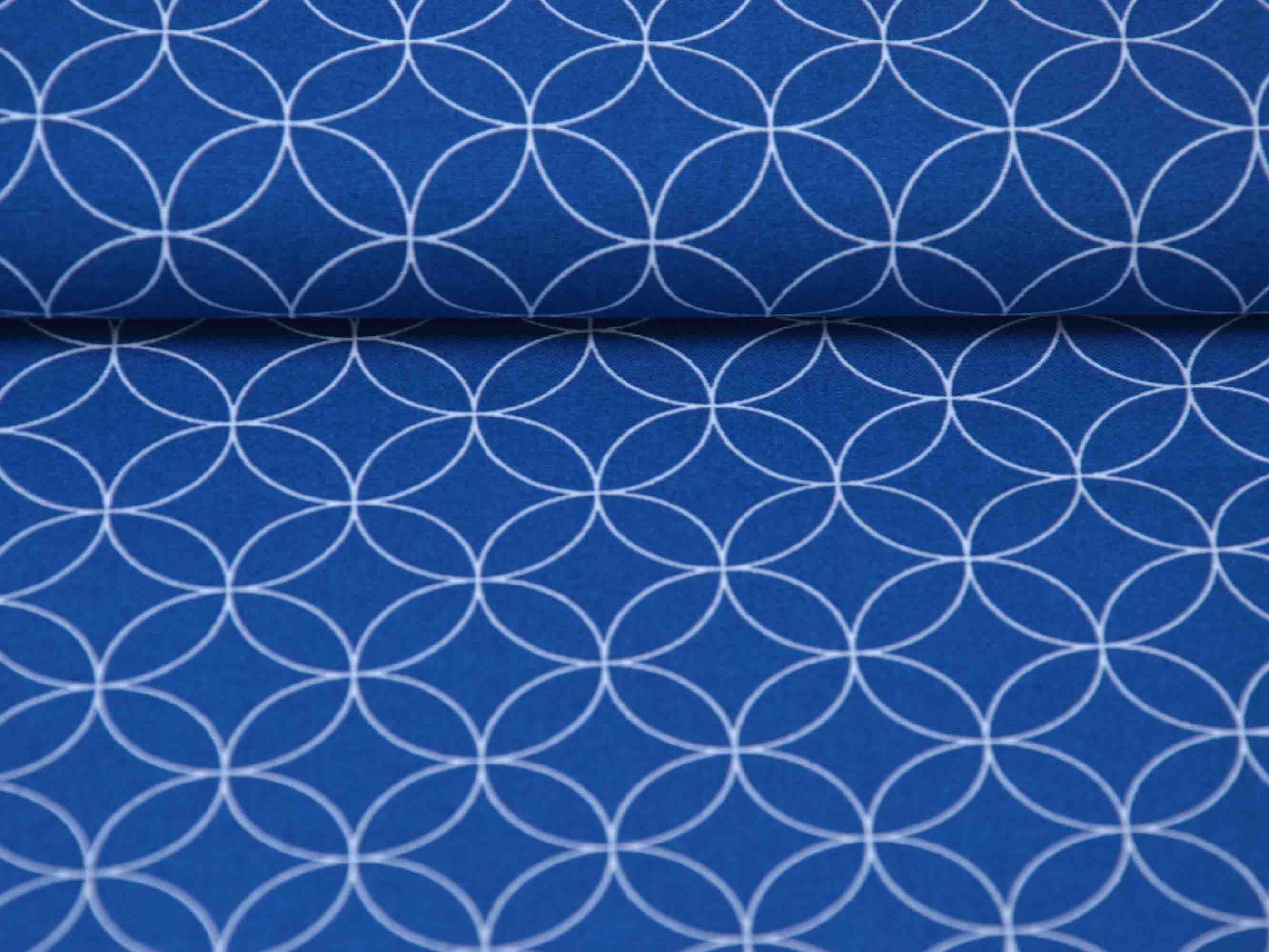 50cm Druckstoff Kopenhagen von Westfalenstoffe. Hochwertiger Baumwollstoff mit weißen Kreisen auf blauem Stoff.