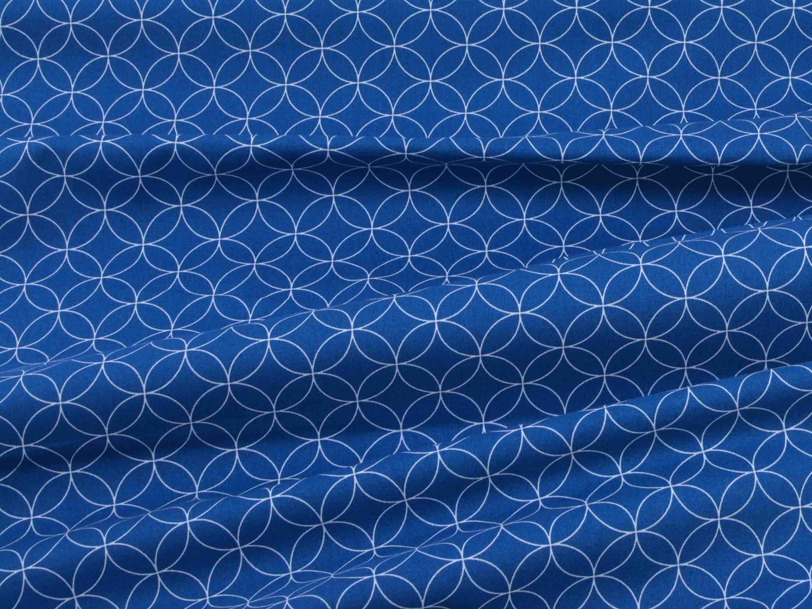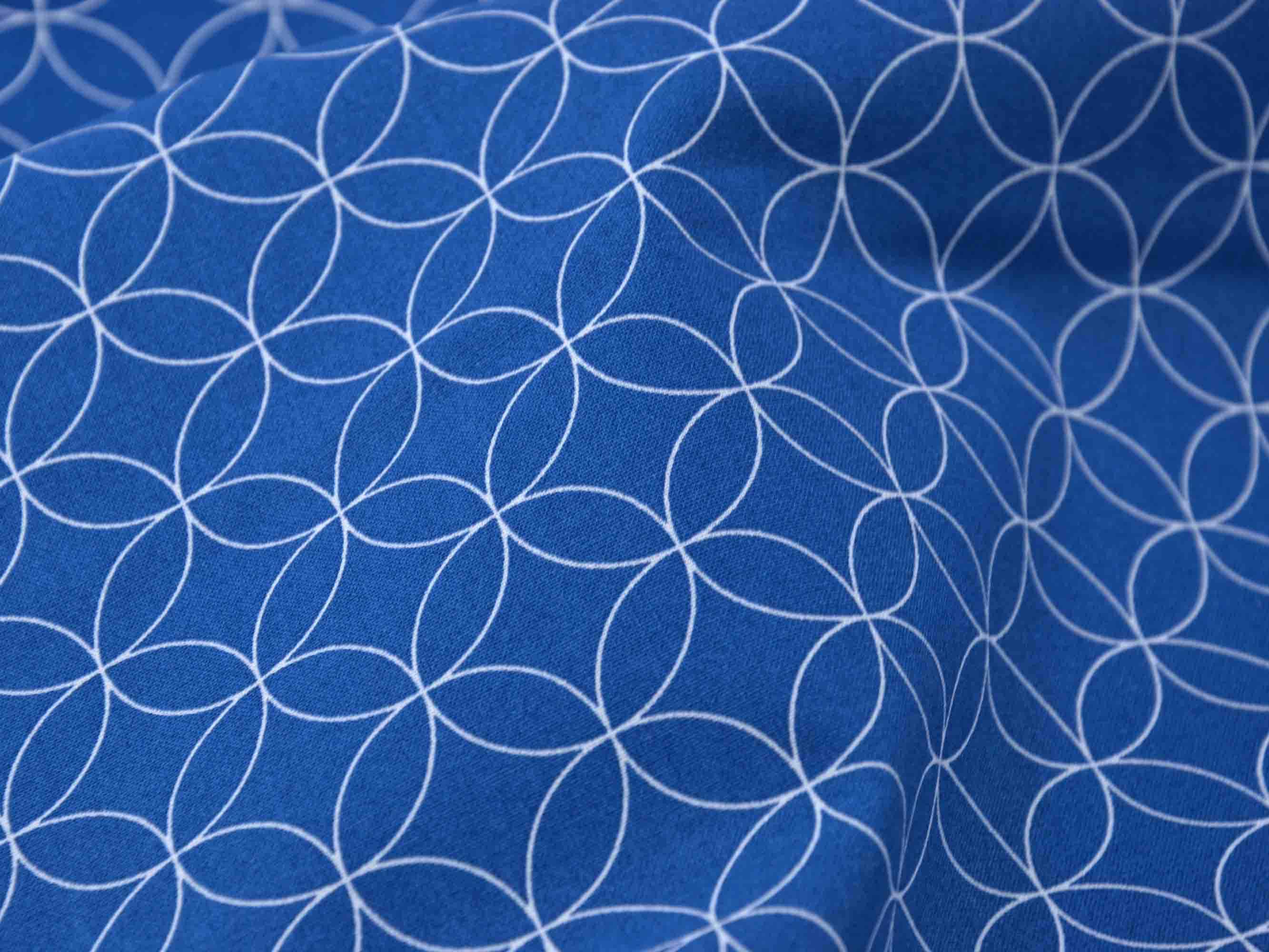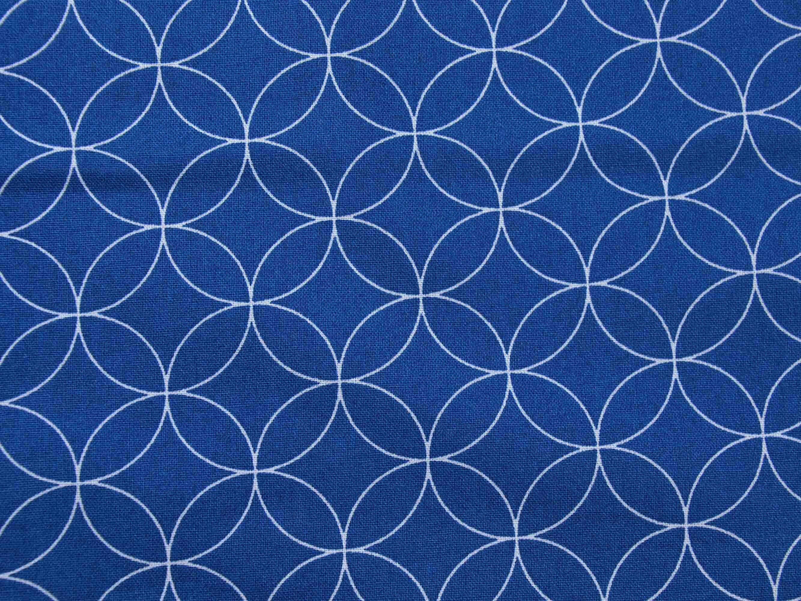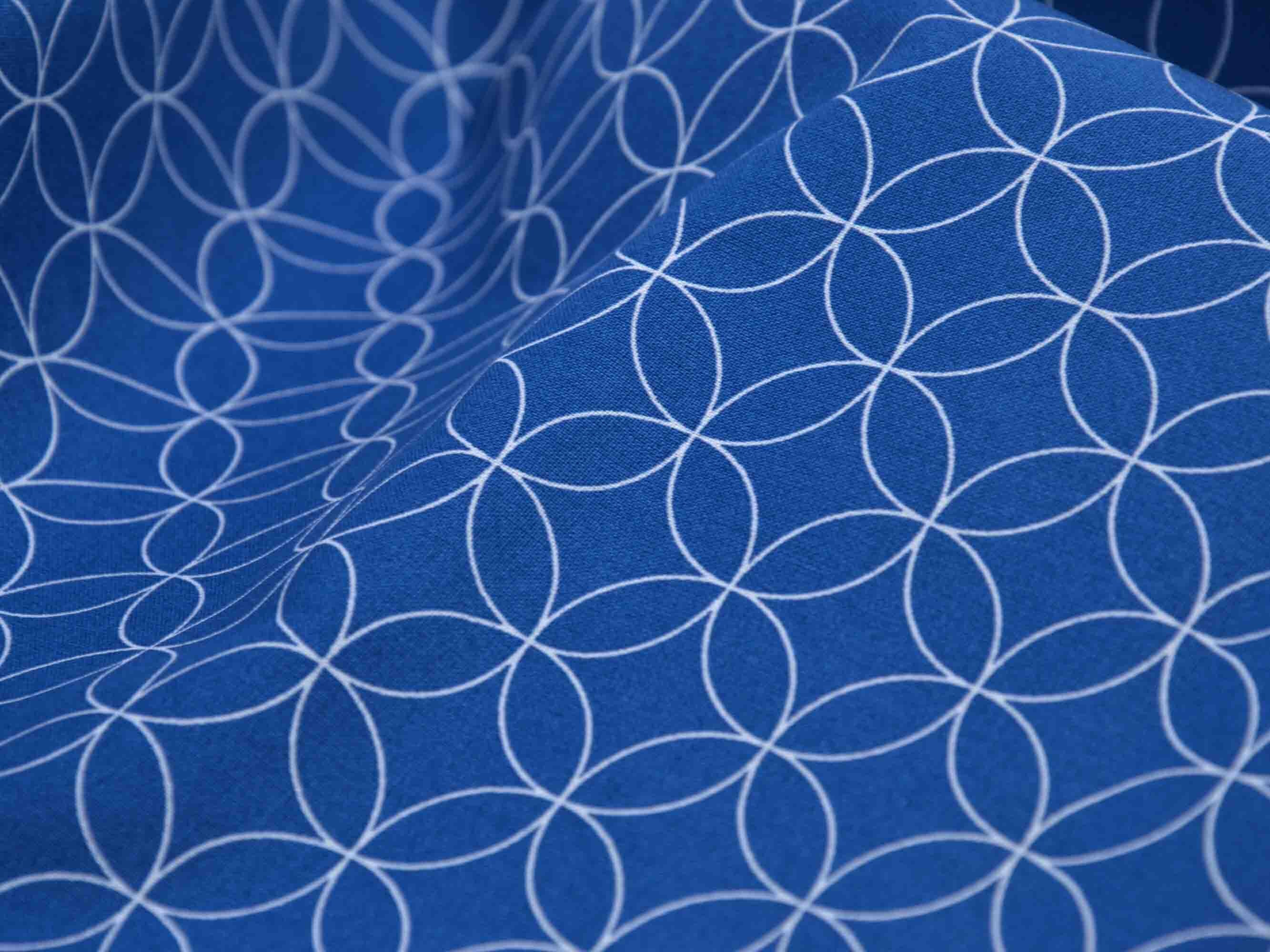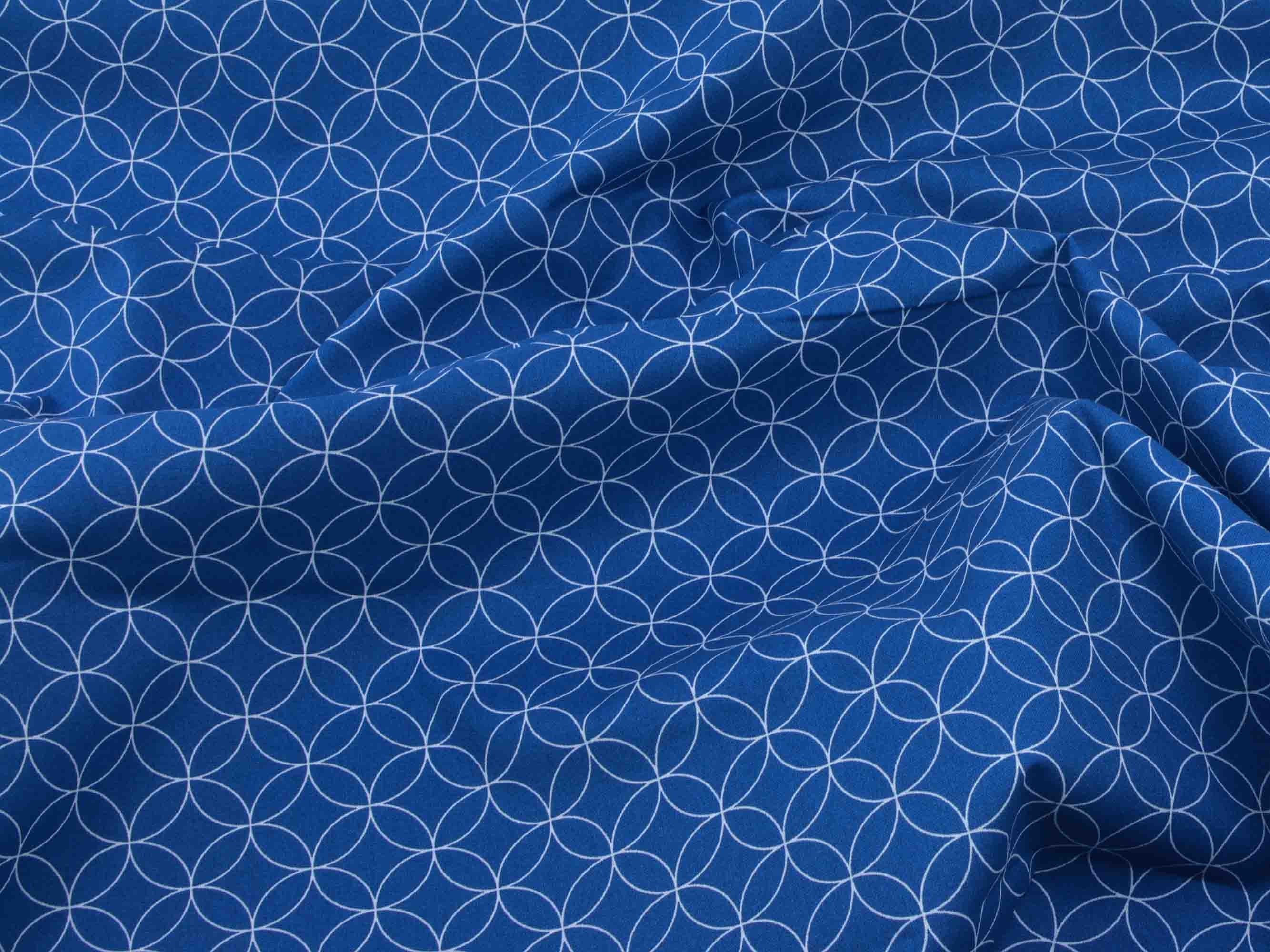 50cm Druckstoff Kopenhagen von Westfalenstoffe. Hochwertiger Baumwollstoff mit weißen Kreisen auf blauem Stoff.