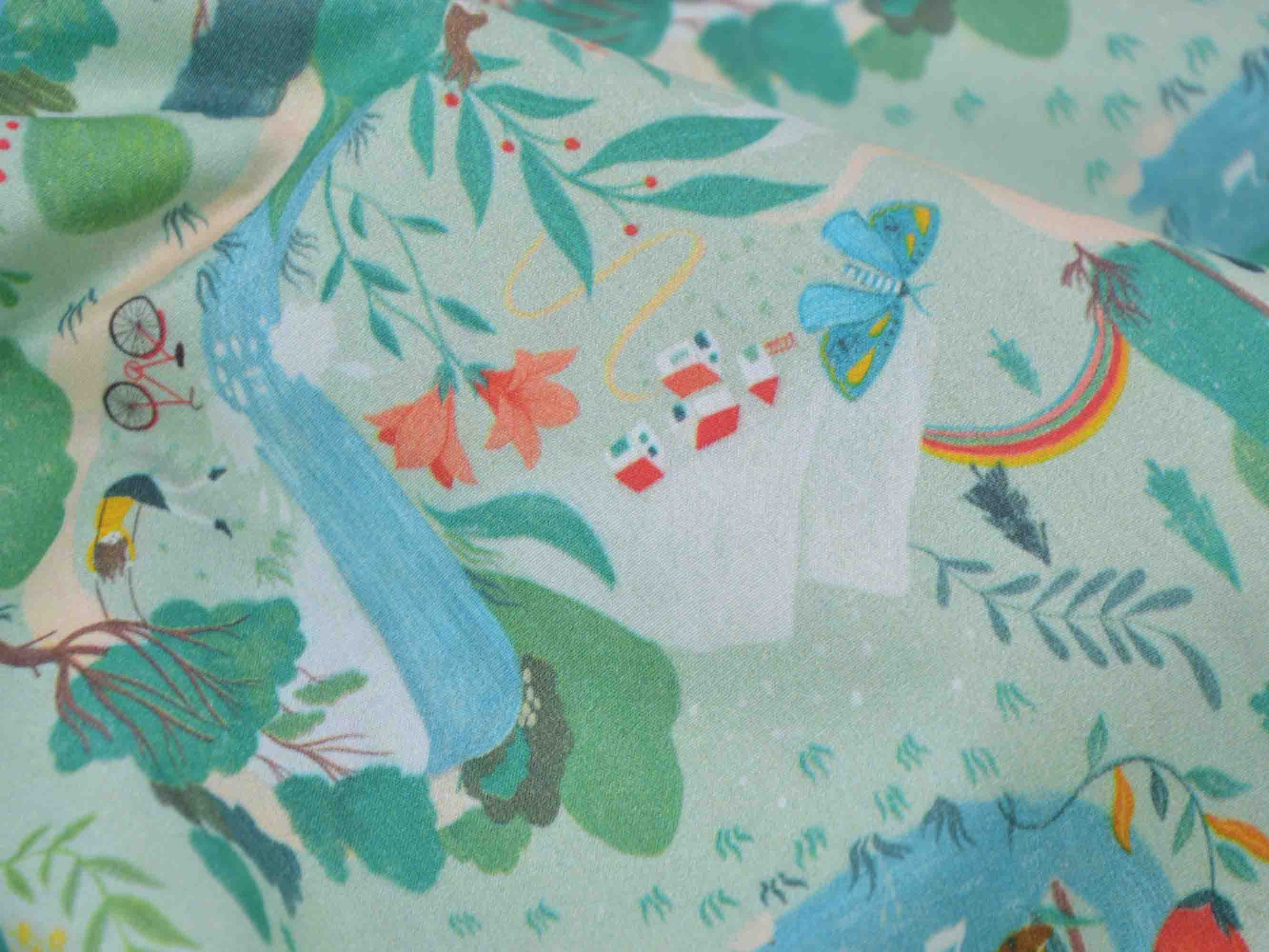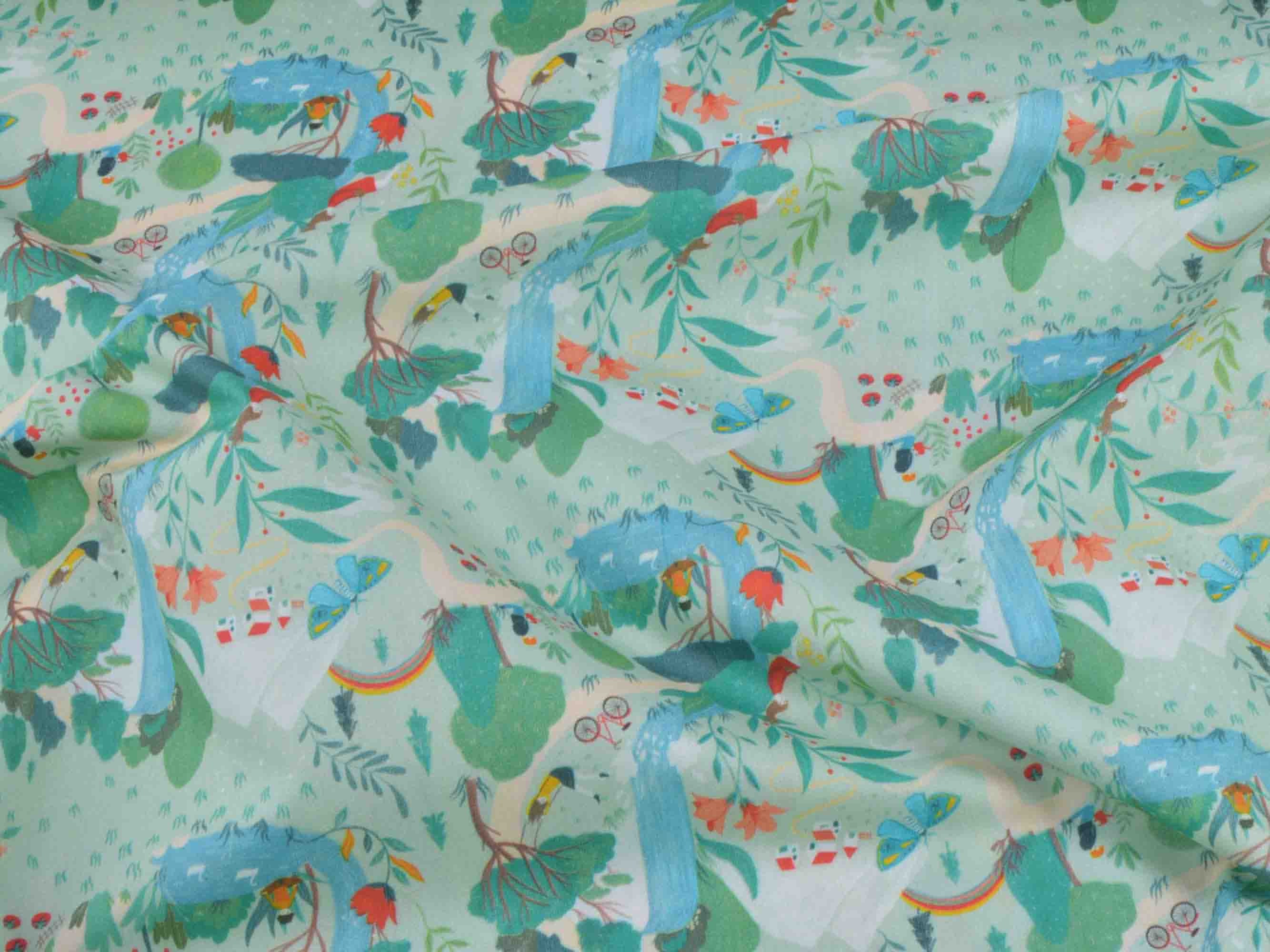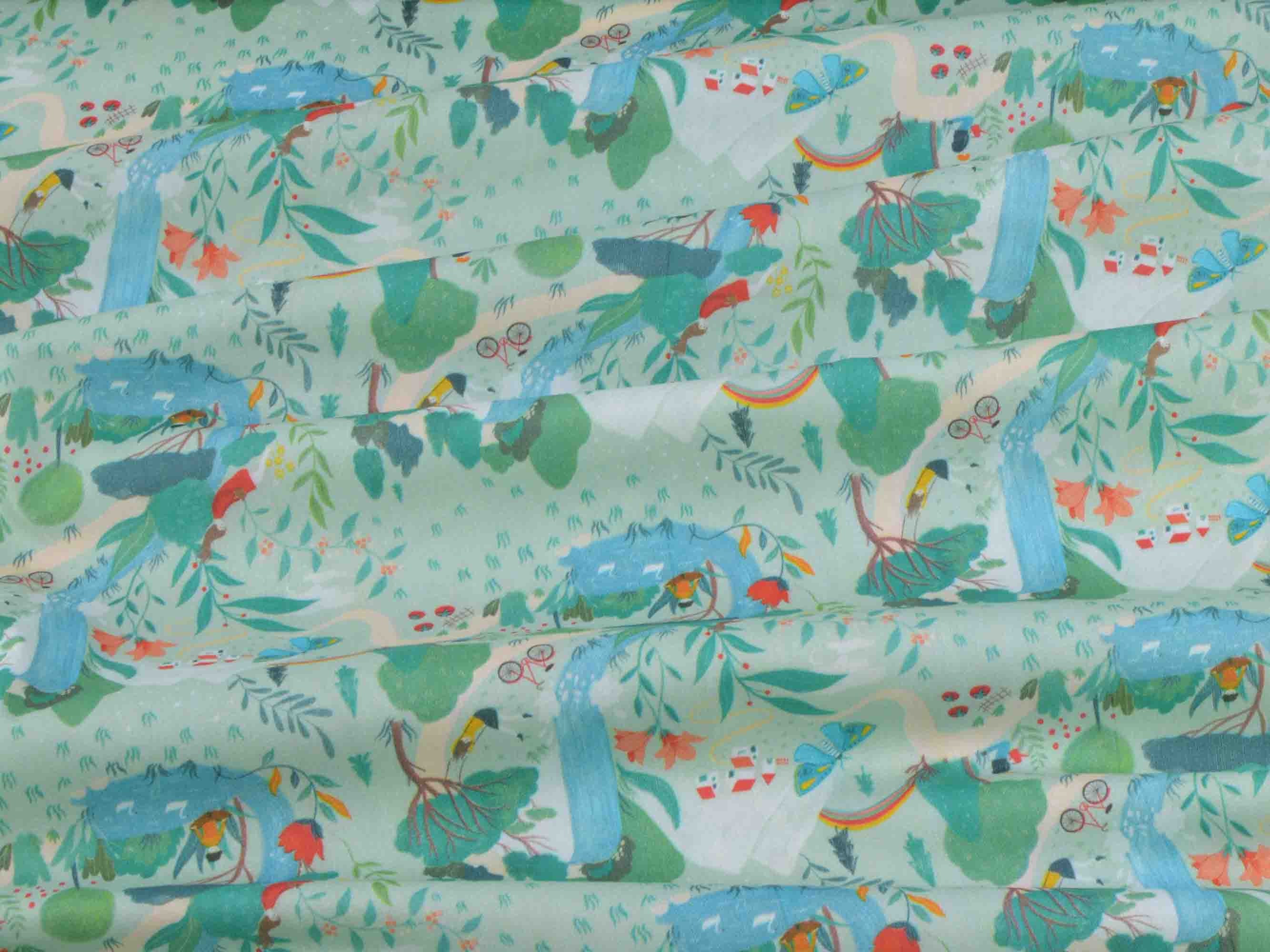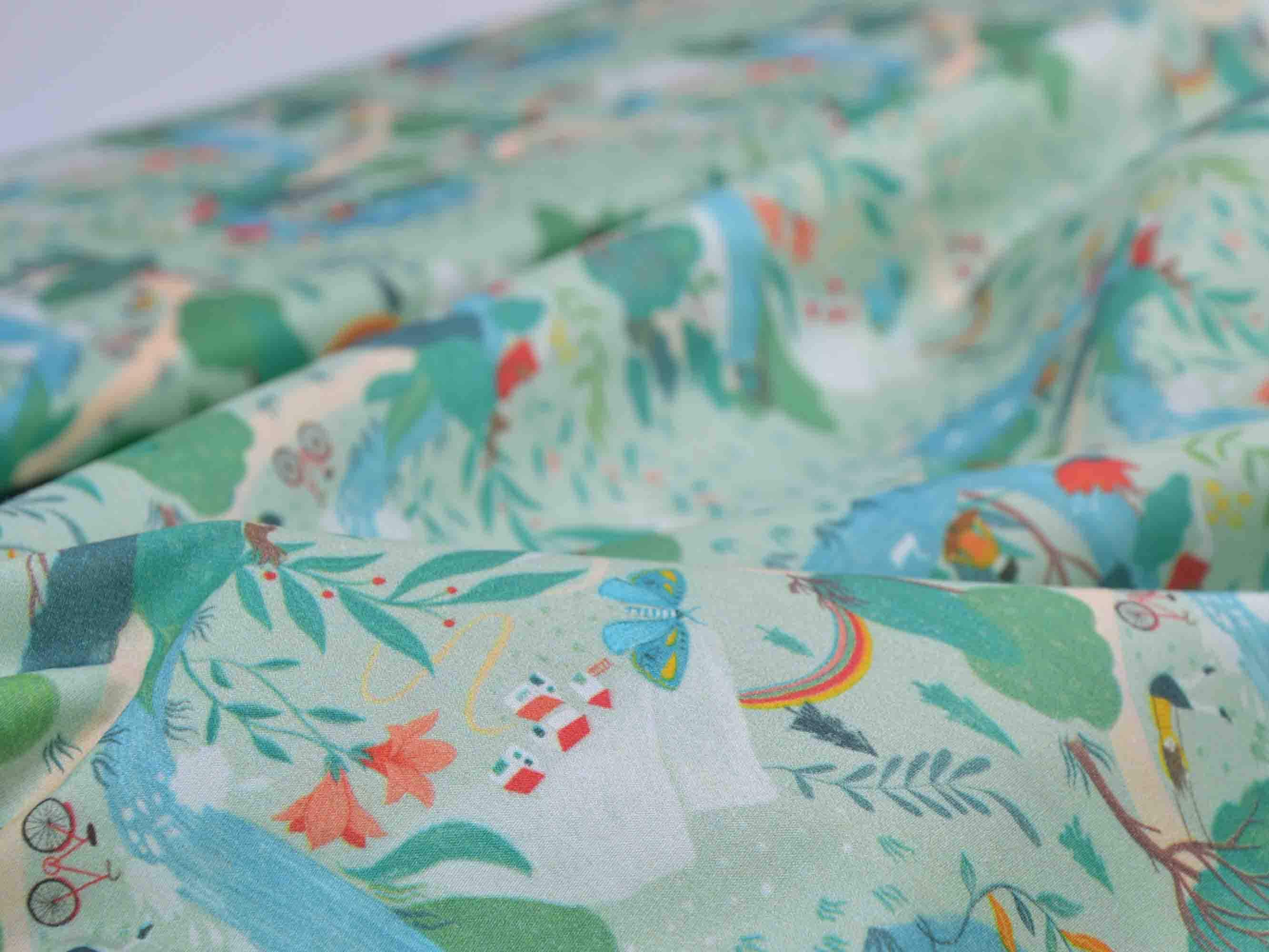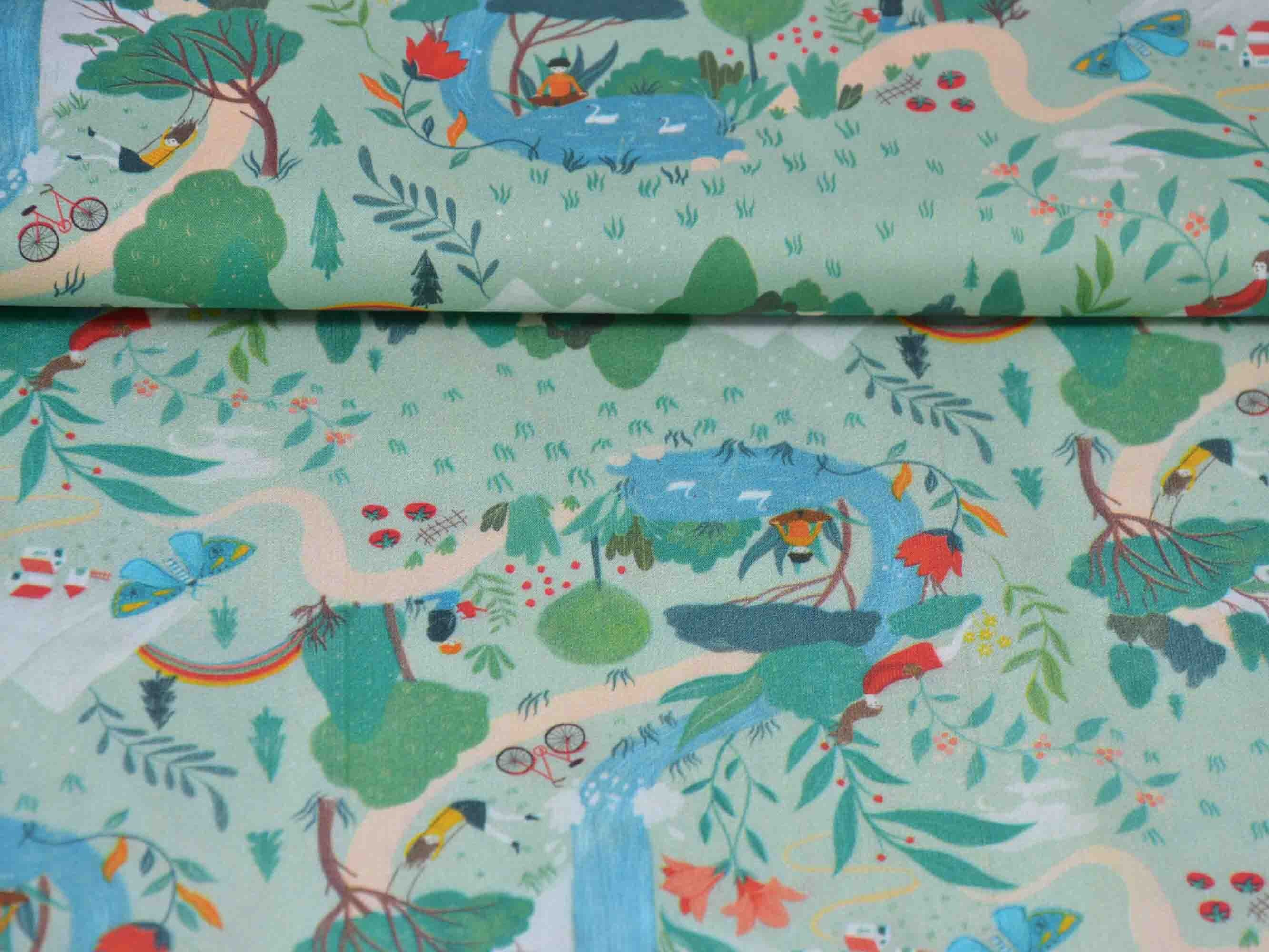 Popeline aus Baumwolle mit Bäumen, Flüssen, Schmetterlingen und vielen, schönen weiteren Motiven. Wunderbar für Sommerkleider, Blusen oder zum nähen von Kissen.