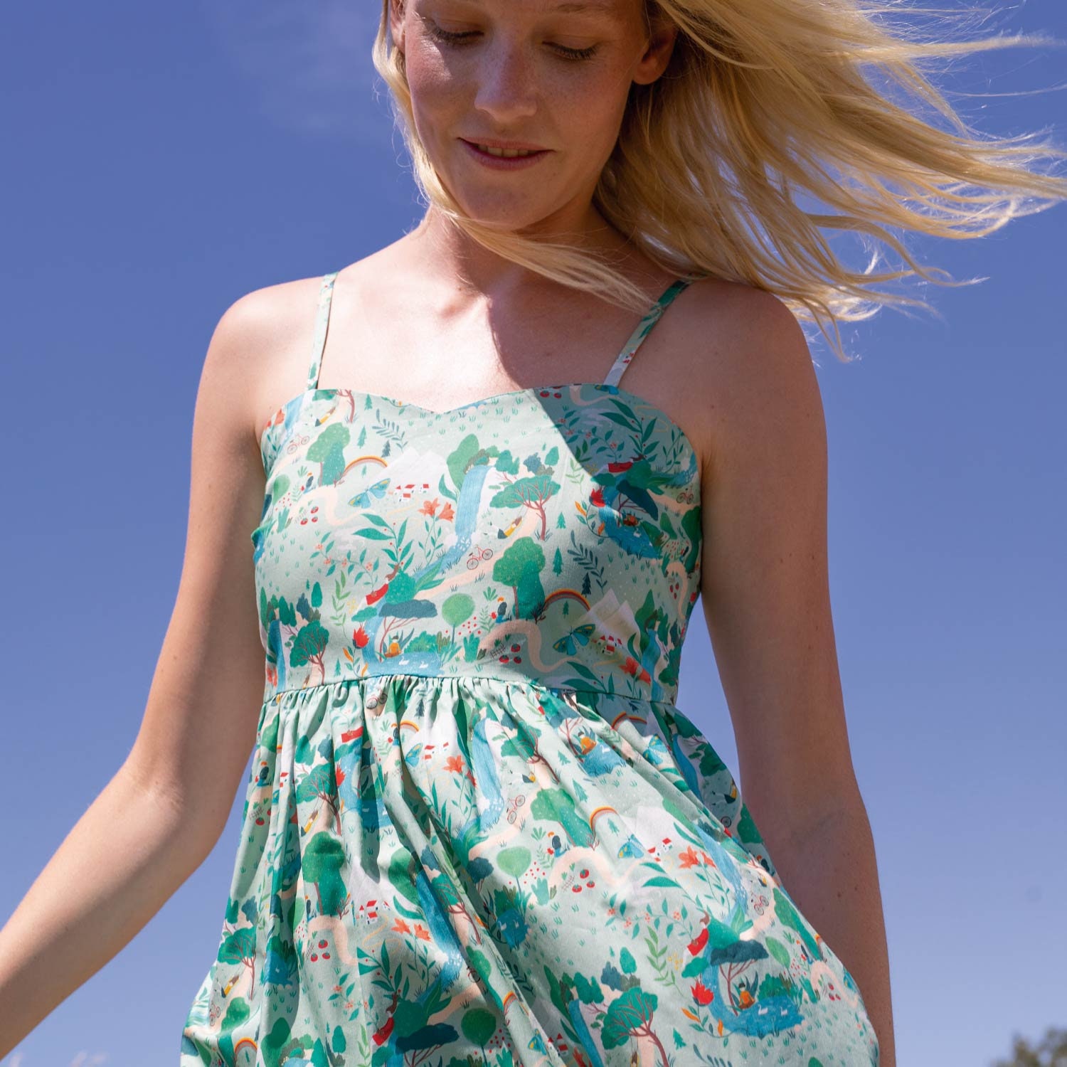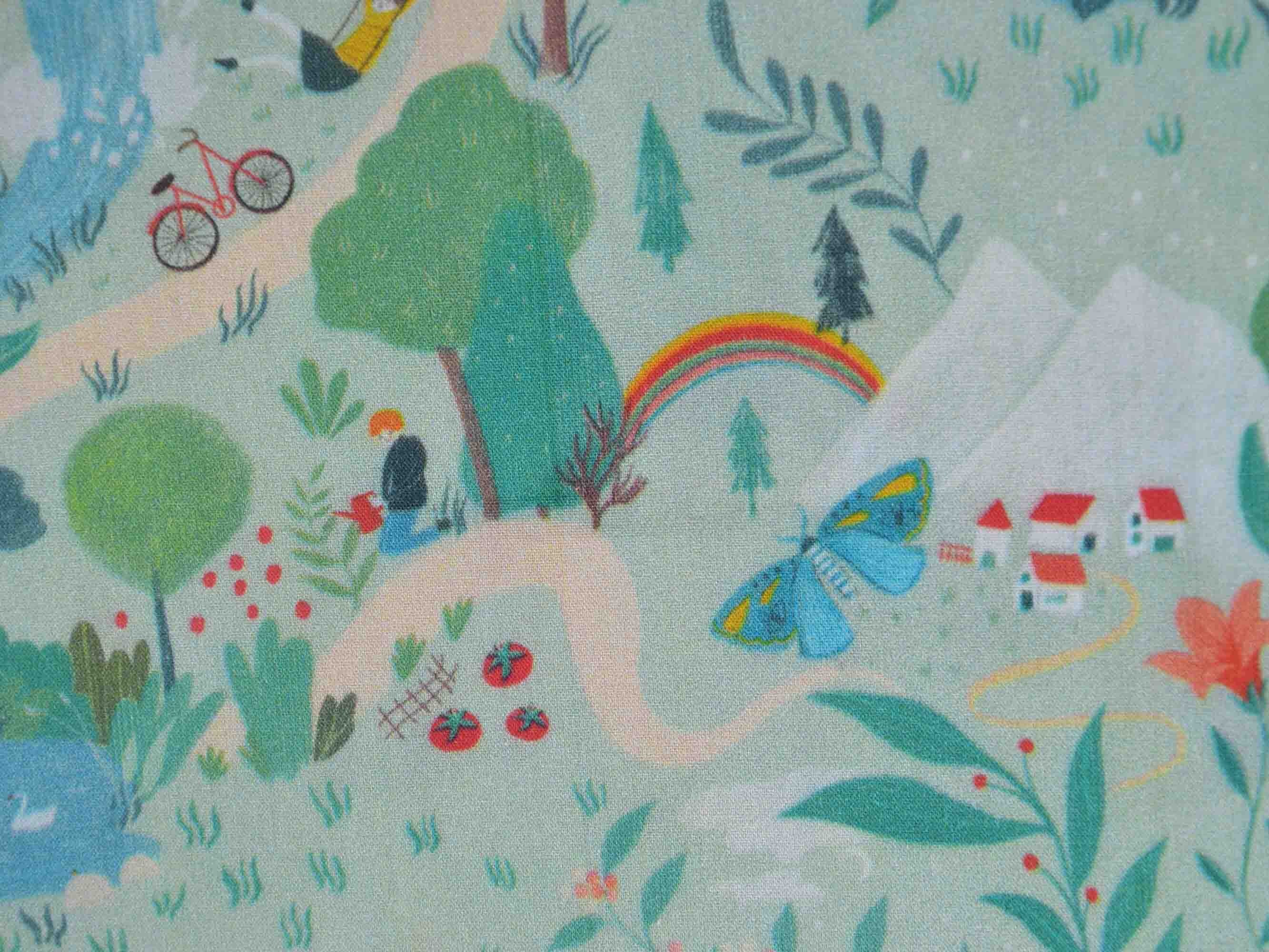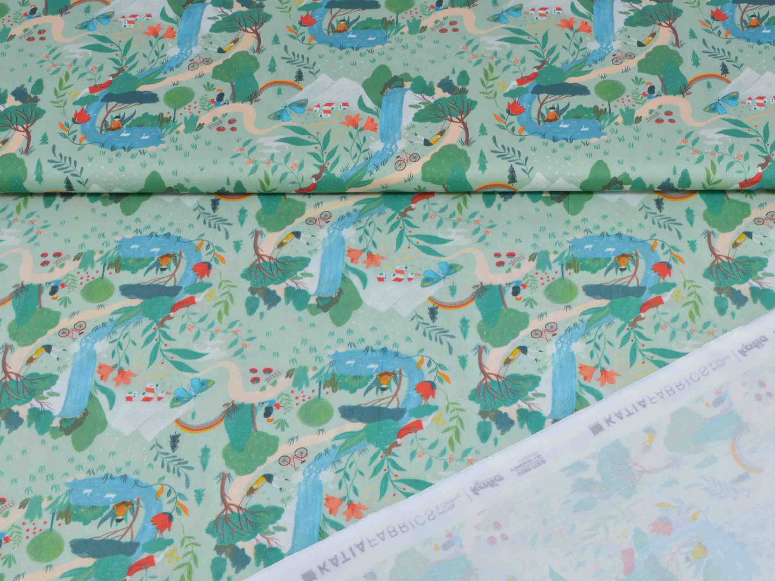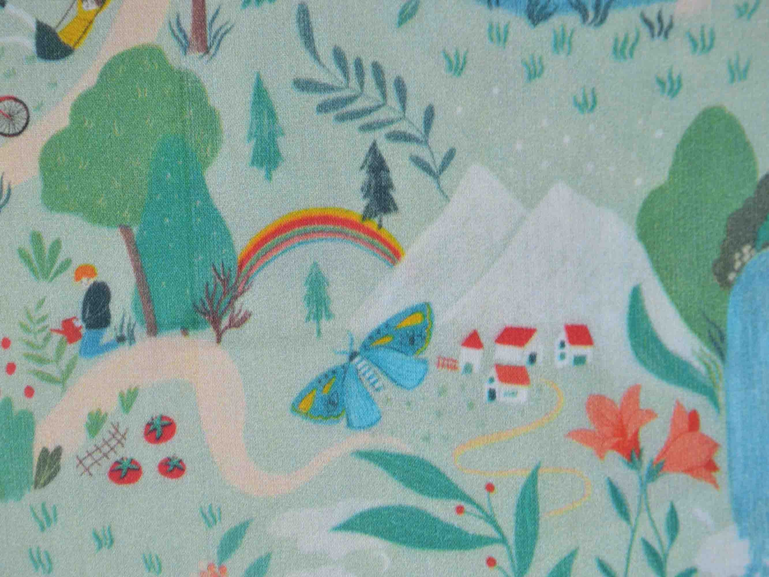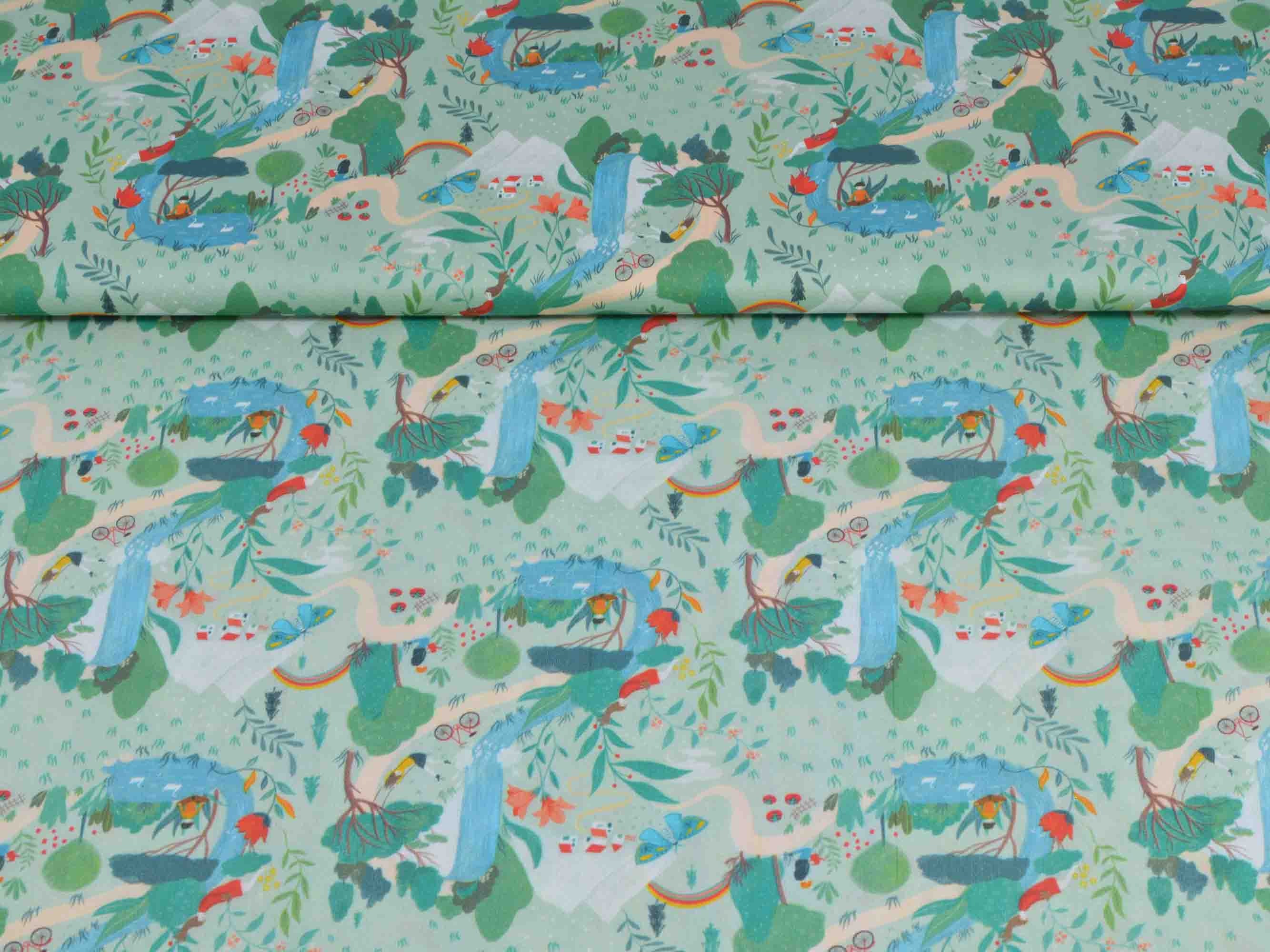Popeline aus Baumwolle mit Bäumen, Flüssen, Schmetterlingen und vielen, schönen weiteren Motiven. Wunderbar für Sommerkleider, Blusen oder zum nähen von Kissen.