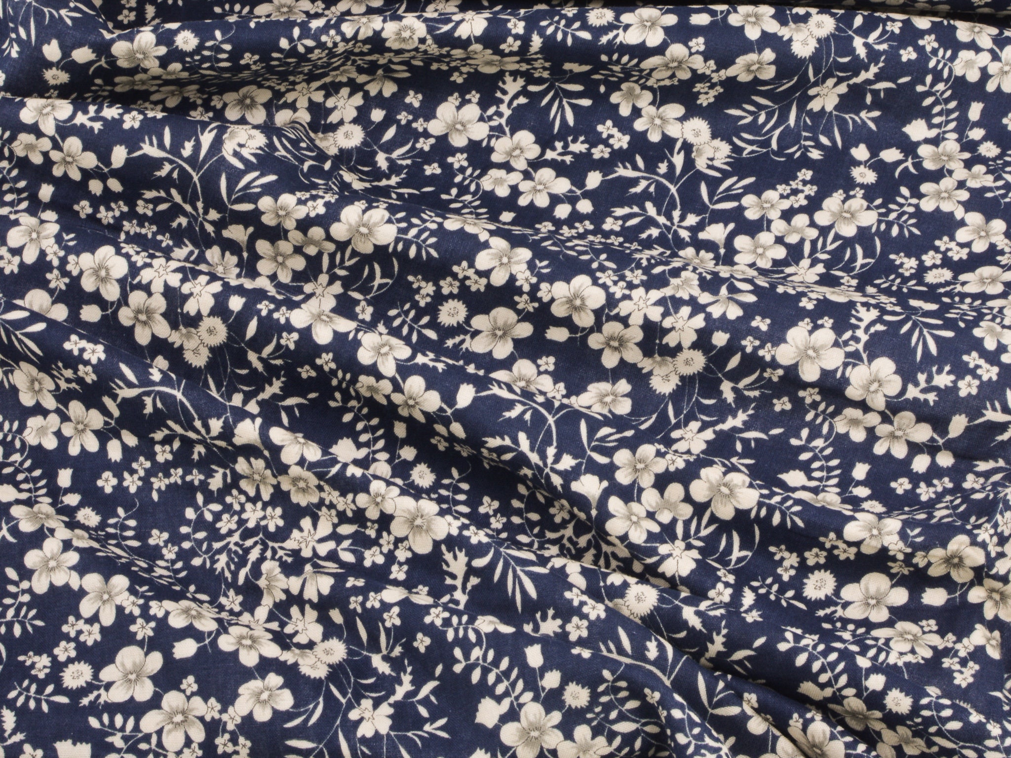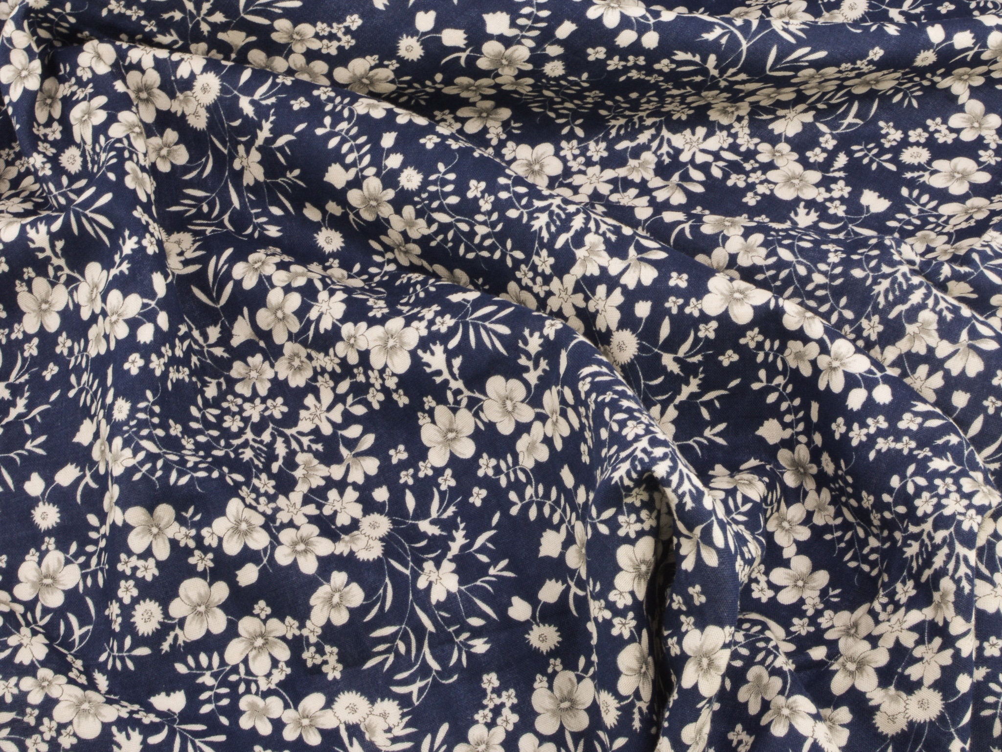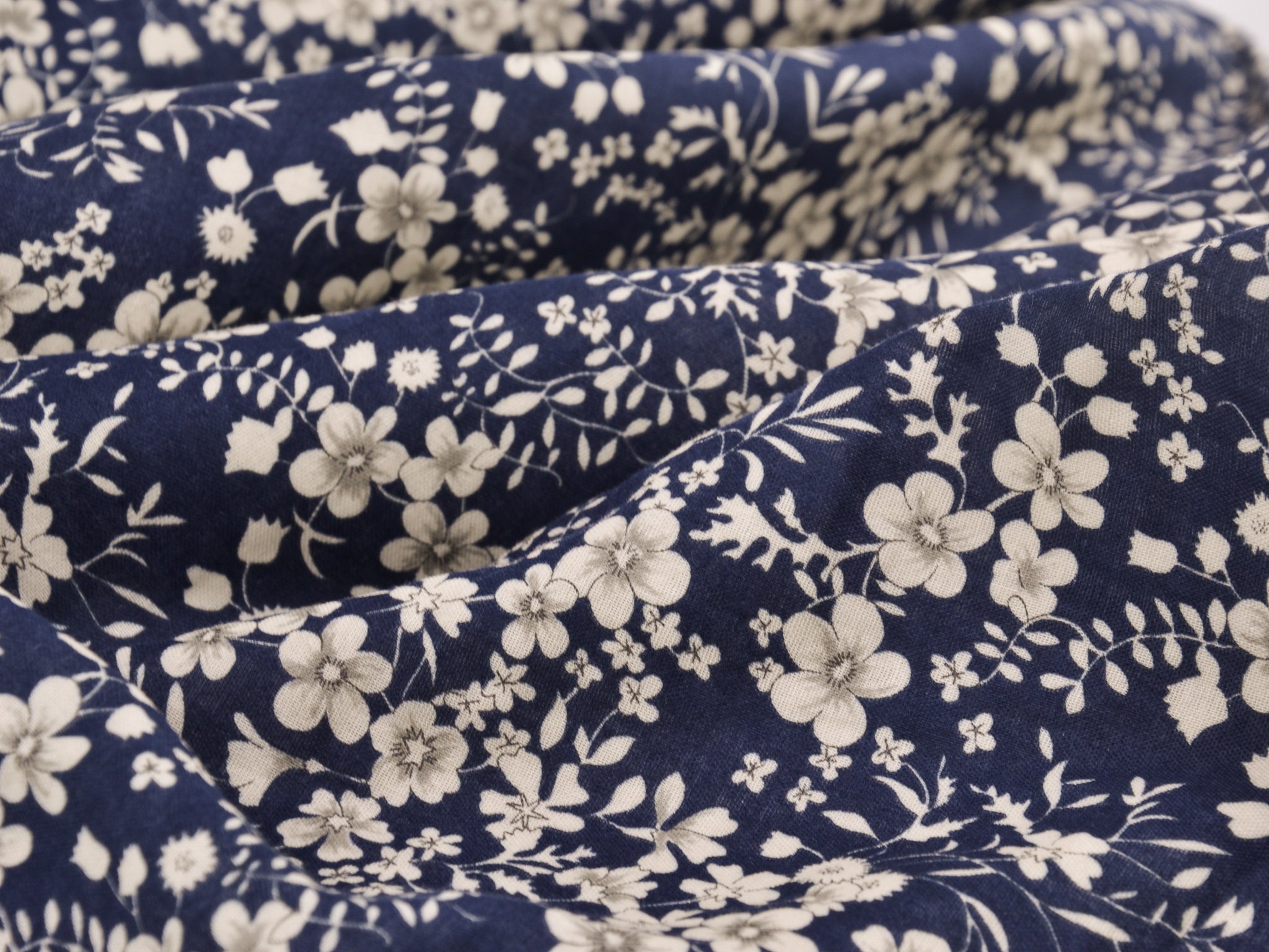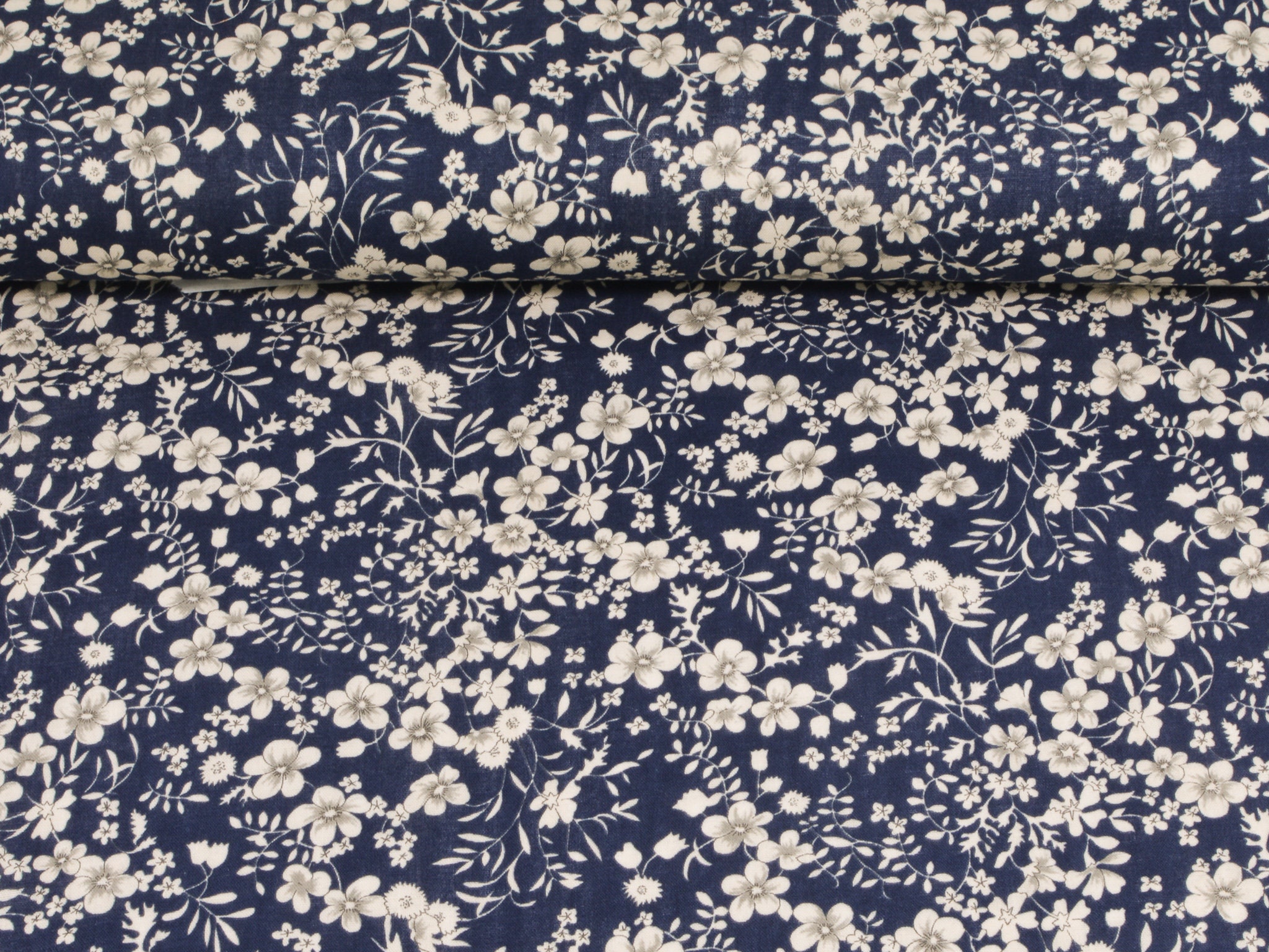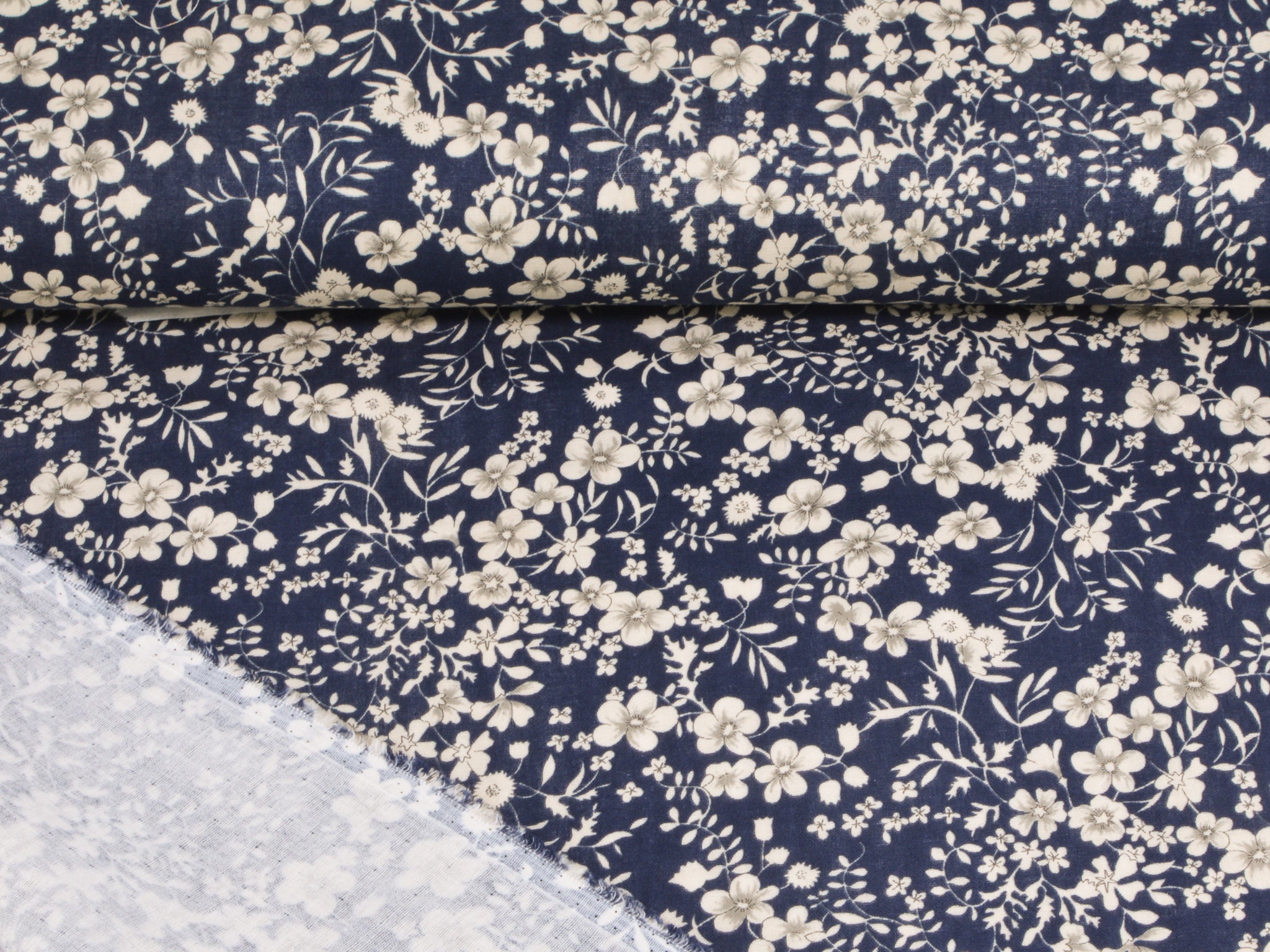 Wunderschöne dünne, doppelte Baumwolle von Kokka. Perfekt für Kleider, Hemden, Röcke, Tücher und so vieles mehr. Auf der rechten Seite sind beige Blumen auf dunkelblauem Untergrund zu sehen. Die linke Seite ist creme-weiß, der Druck schimmerd jedoch durch den feinen Stoff durch. Beide Stofflagen sind durch ganz feine Stiche punktuell miteinander verbunden.