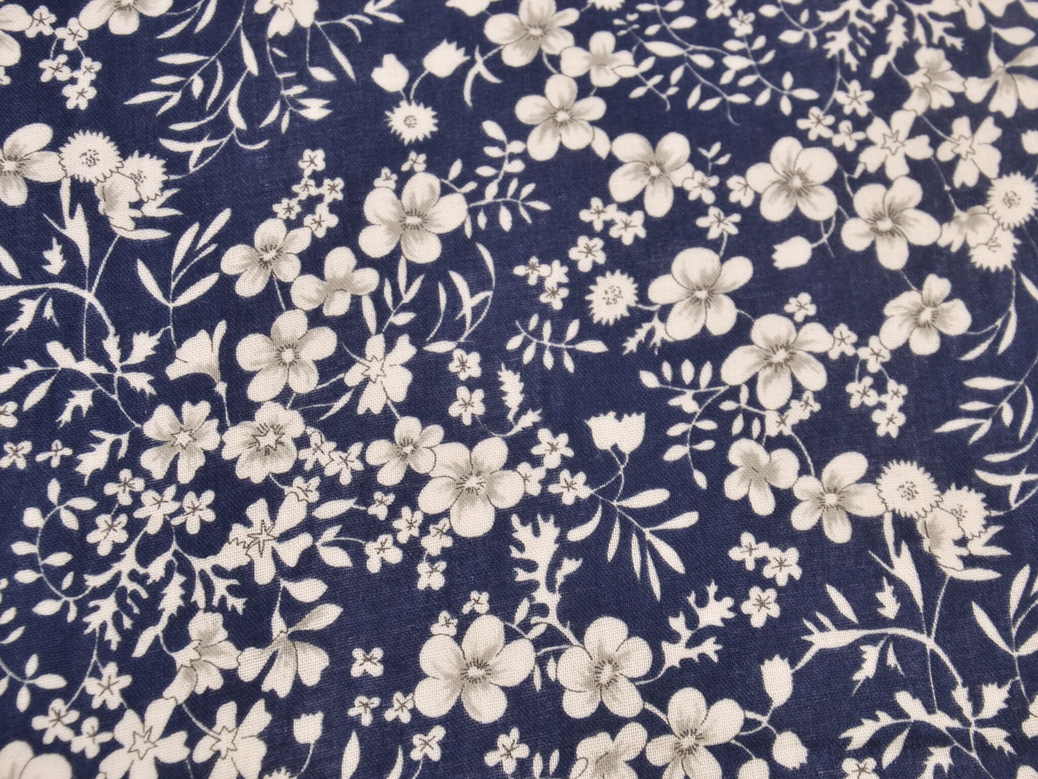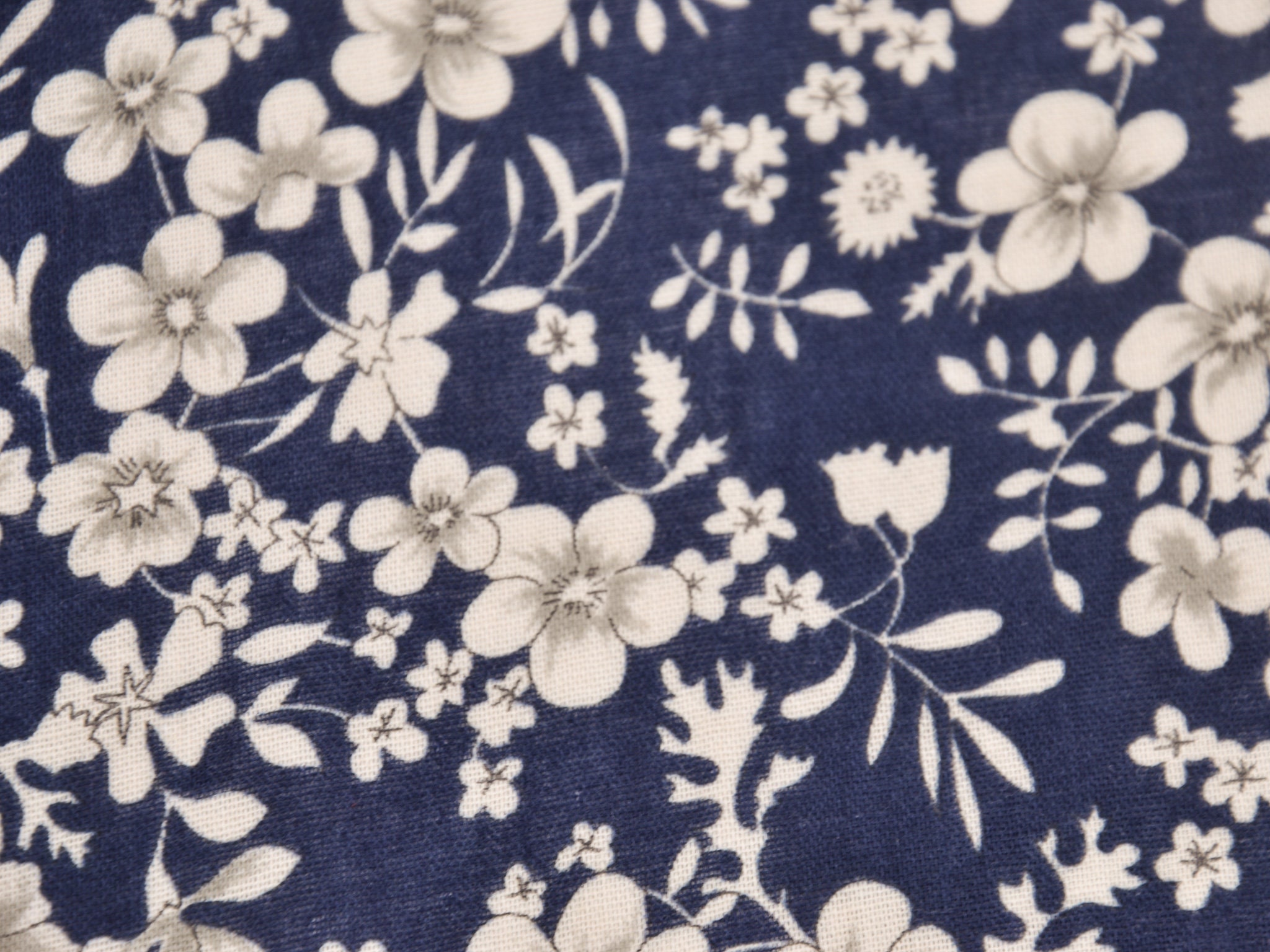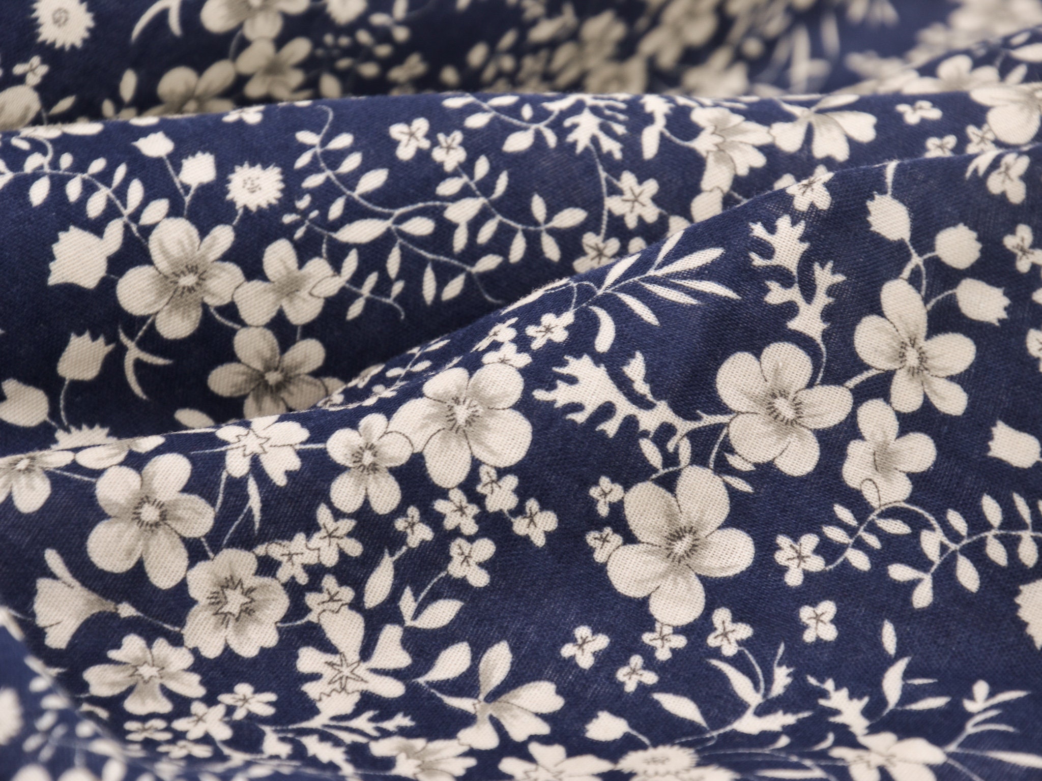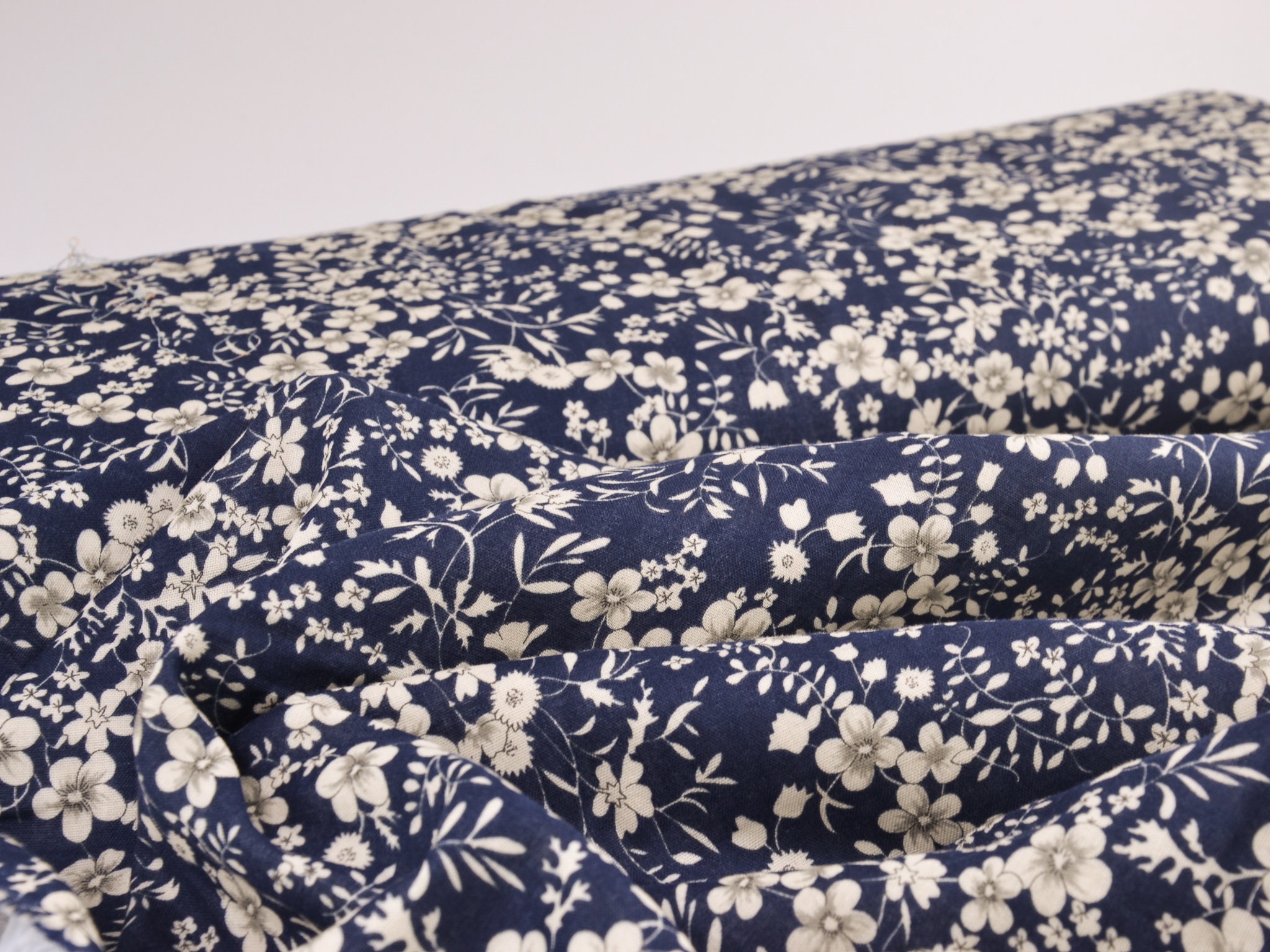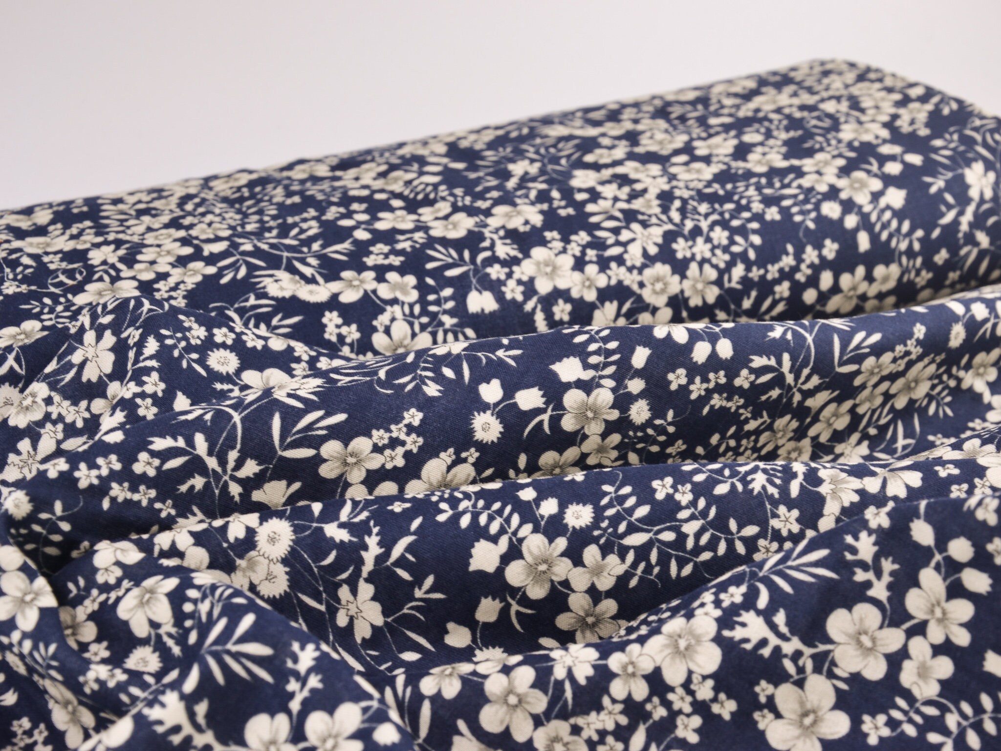 Wunderschöne dünne, doppelte Baumwolle von Kokka. Perfekt für Kleider, Hemden, Röcke, Tücher und so vieles mehr. Auf der rechten Seite sind beige Blumen auf dunkelblauem Untergrund zu sehen. Die linke Seite ist creme-weiß, der Druck schimmerd jedoch durch den feinen Stoff durch. Beide Stofflagen sind durch ganz feine Stiche punktuell miteinander verbunden.