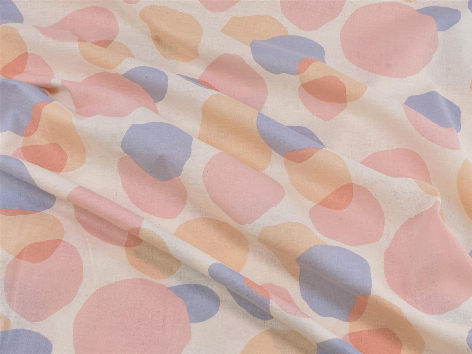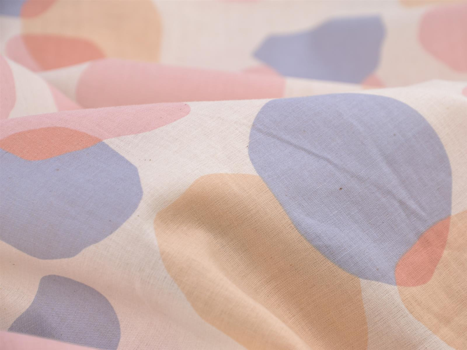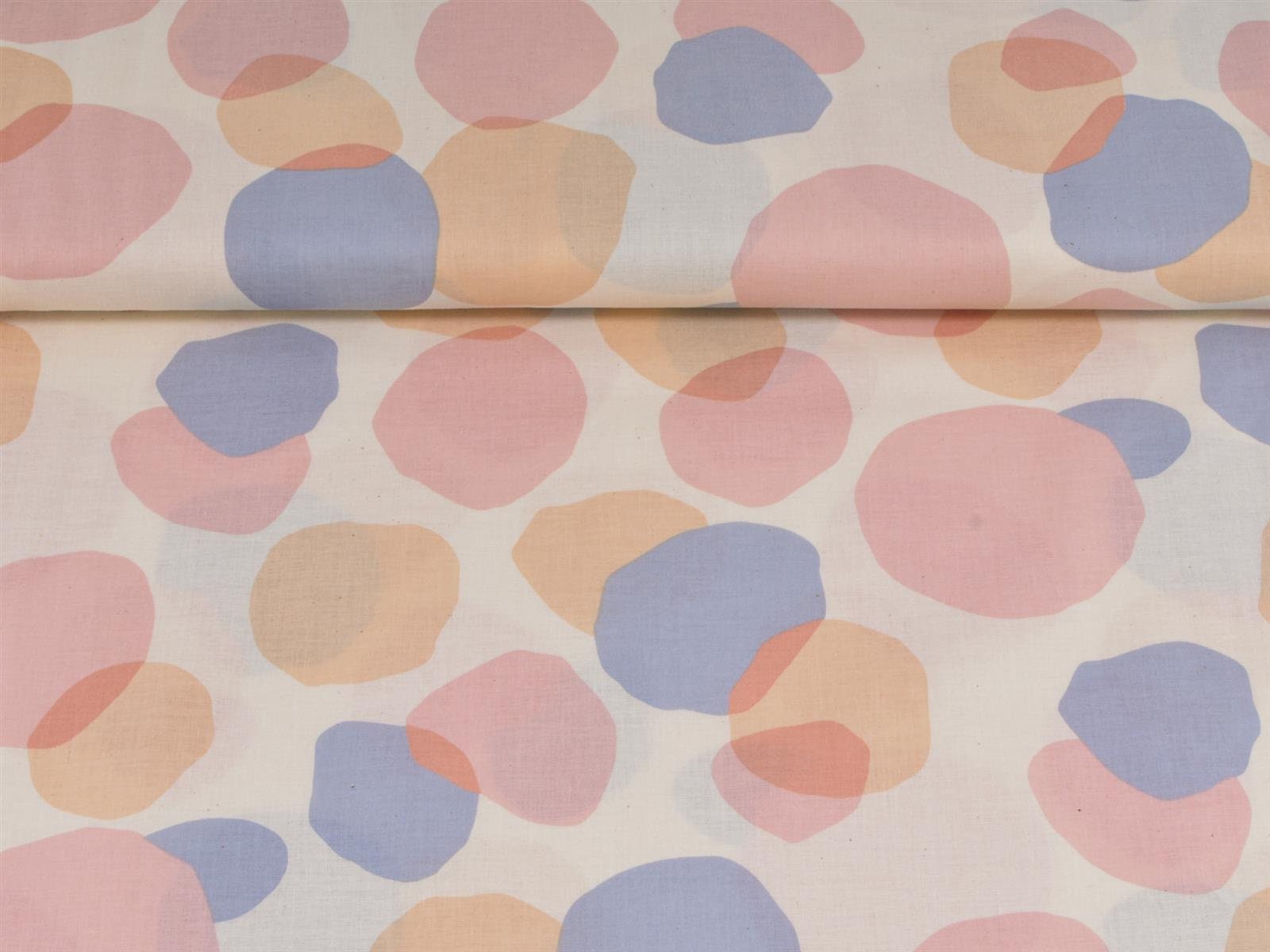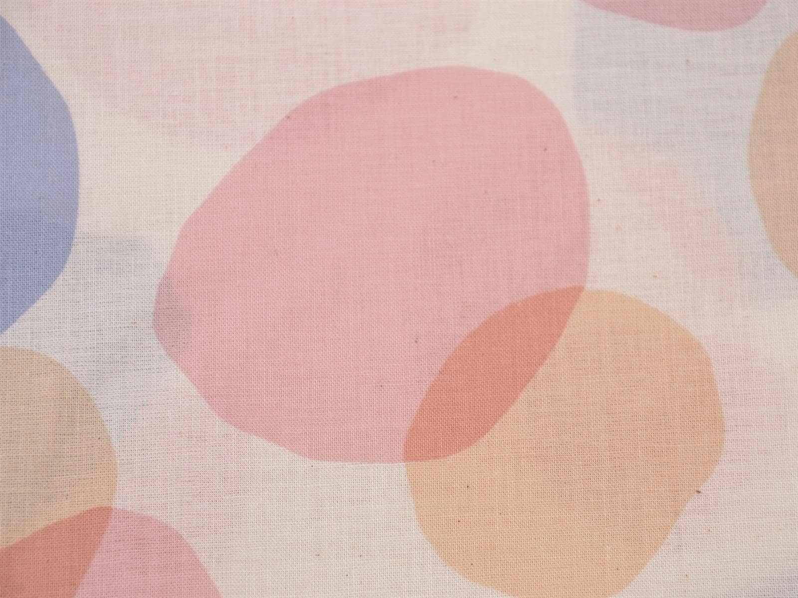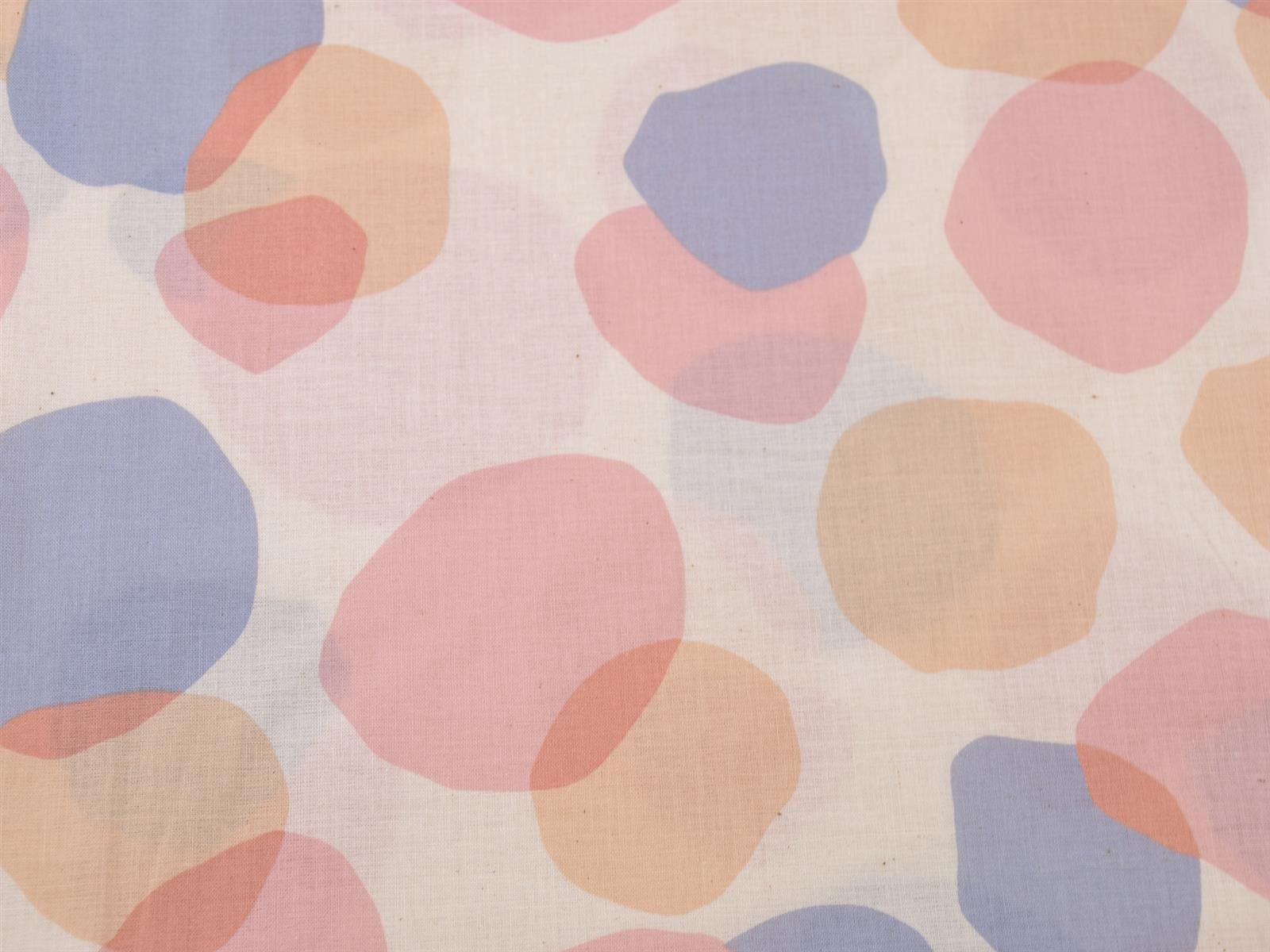 Dünner Stoff aus 100% Baumwolle mit Kreisen in blau, rosa und beige.