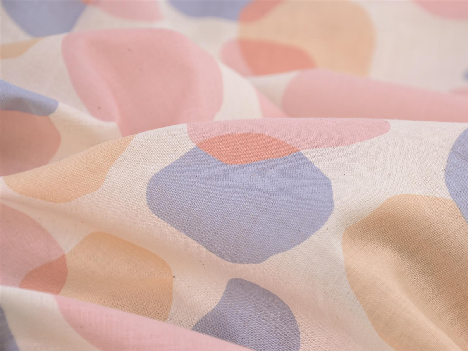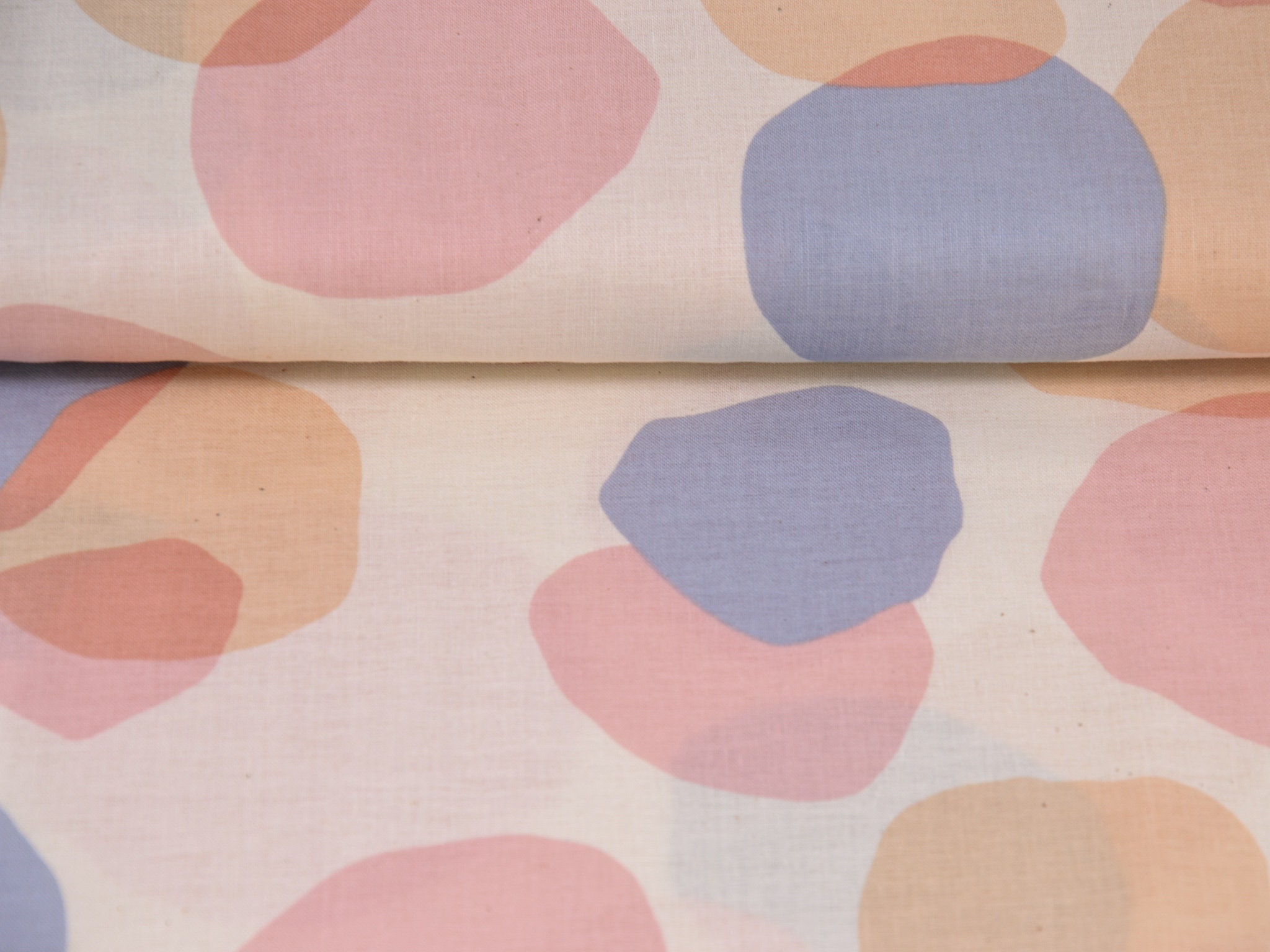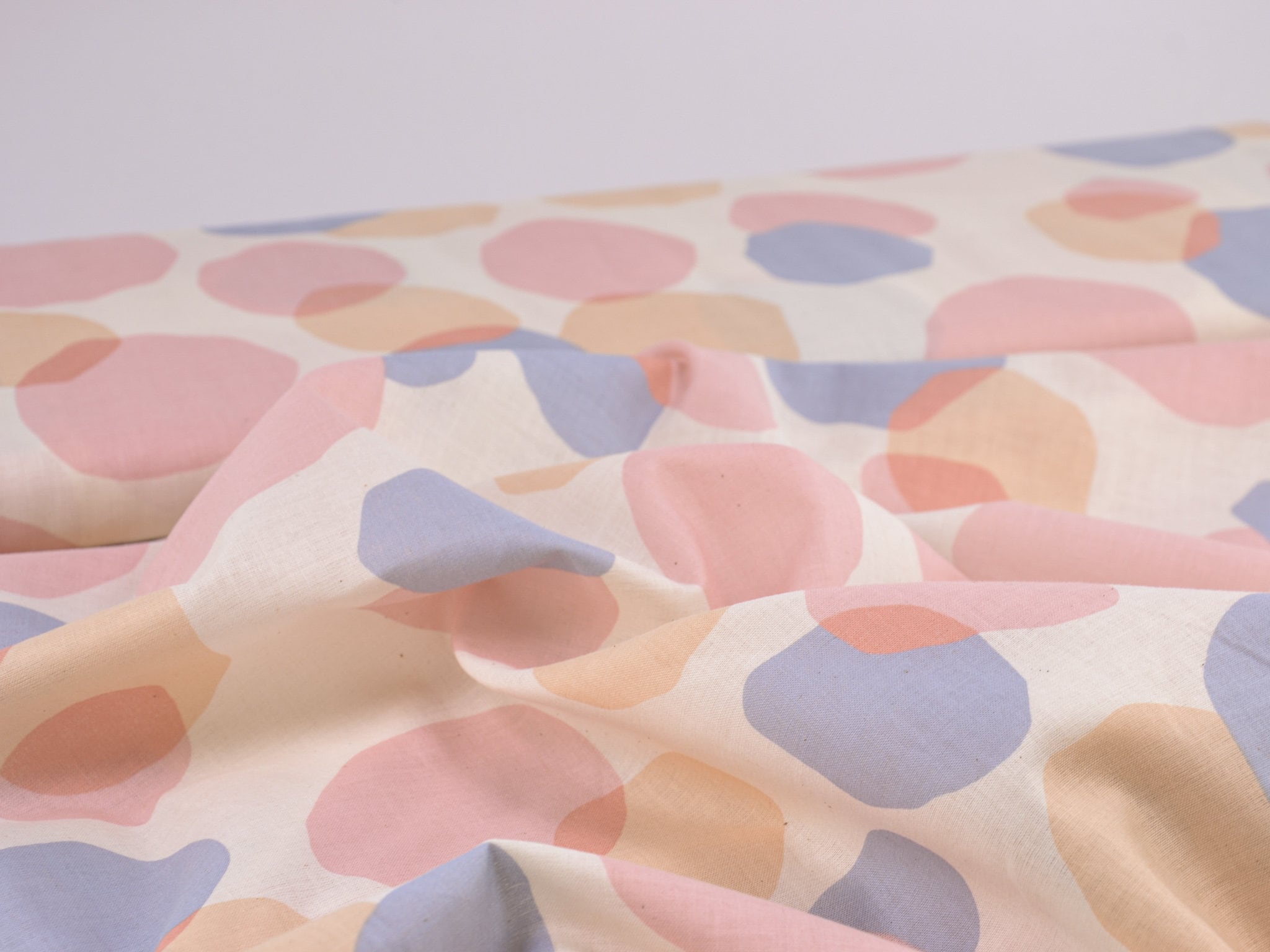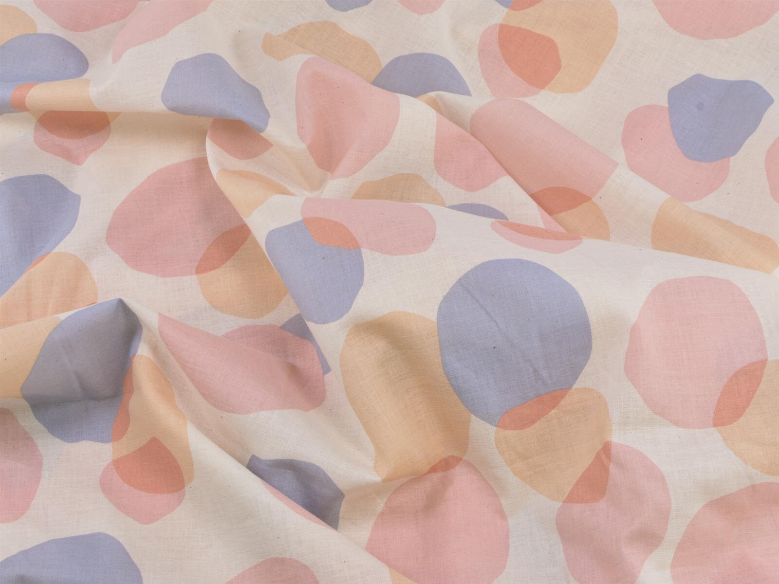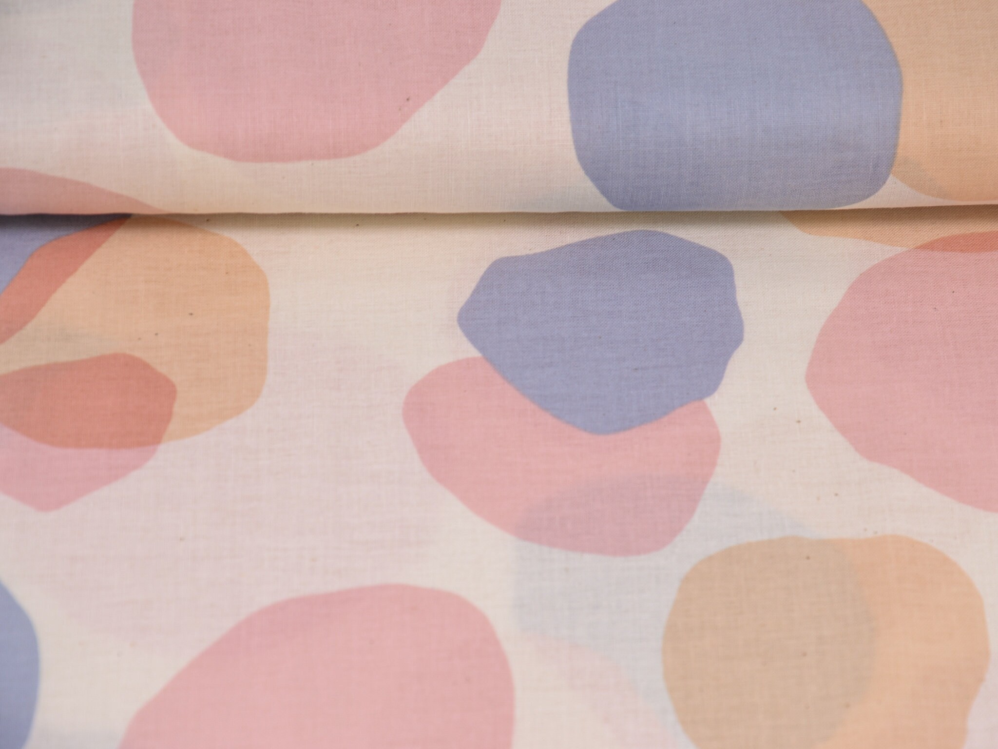 Dünner Stoff aus 100% Baumwolle mit Kreisen in blau, rosa und beige.