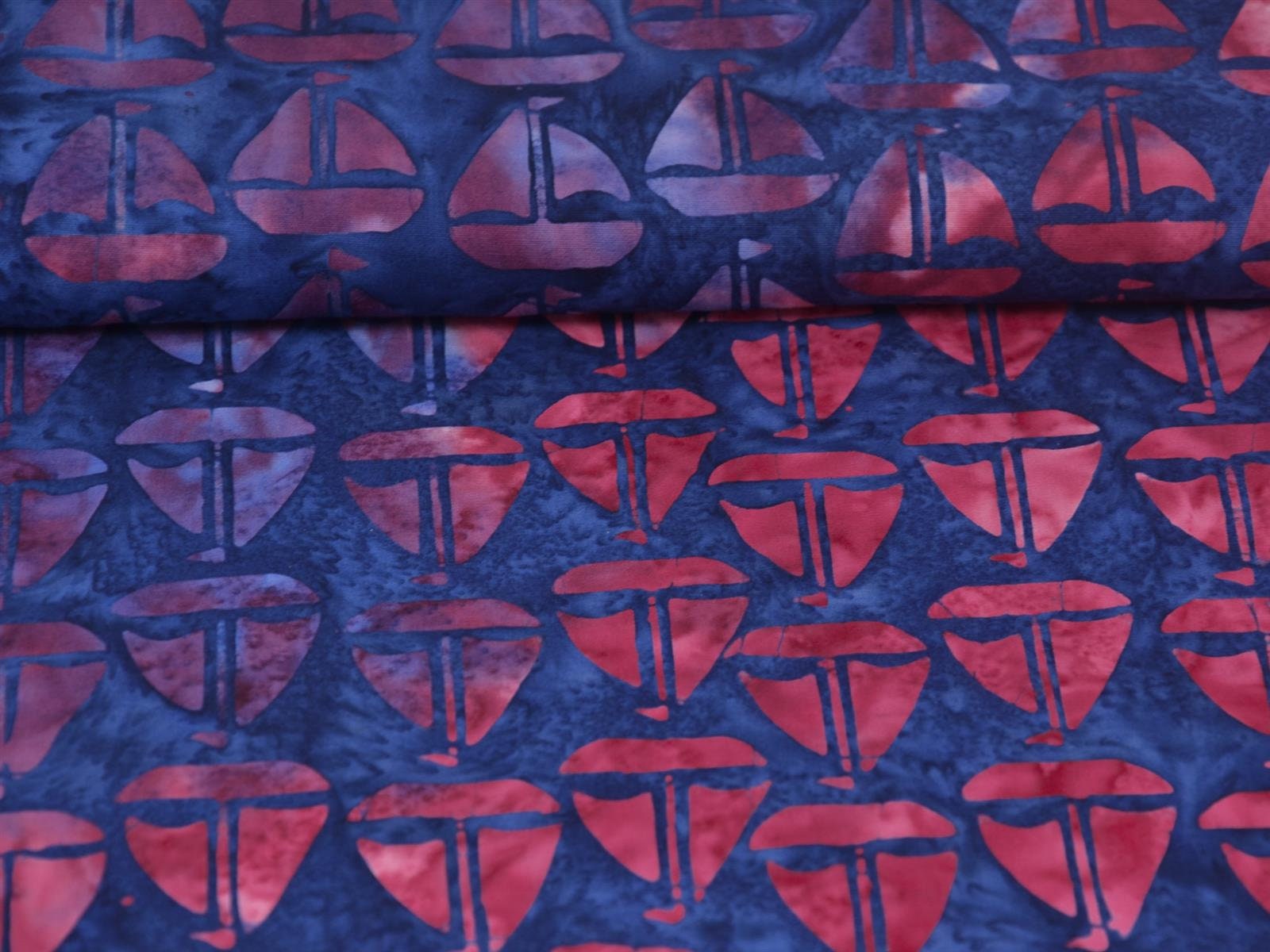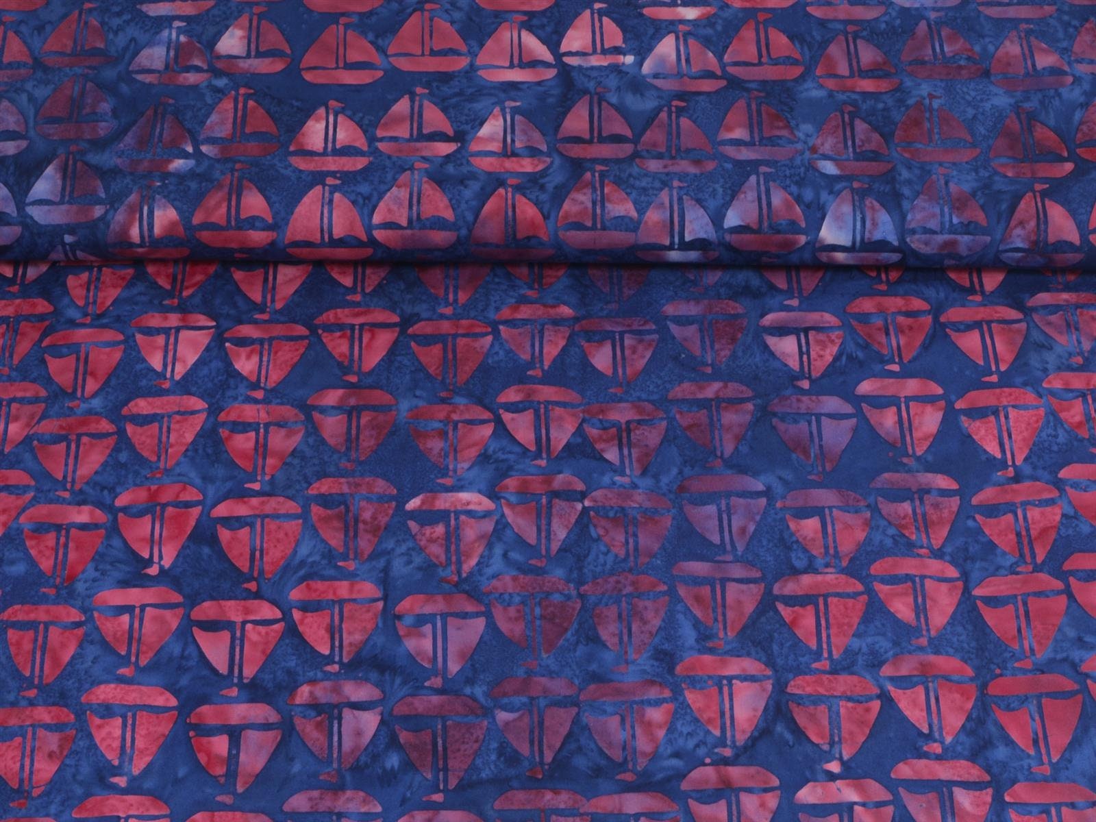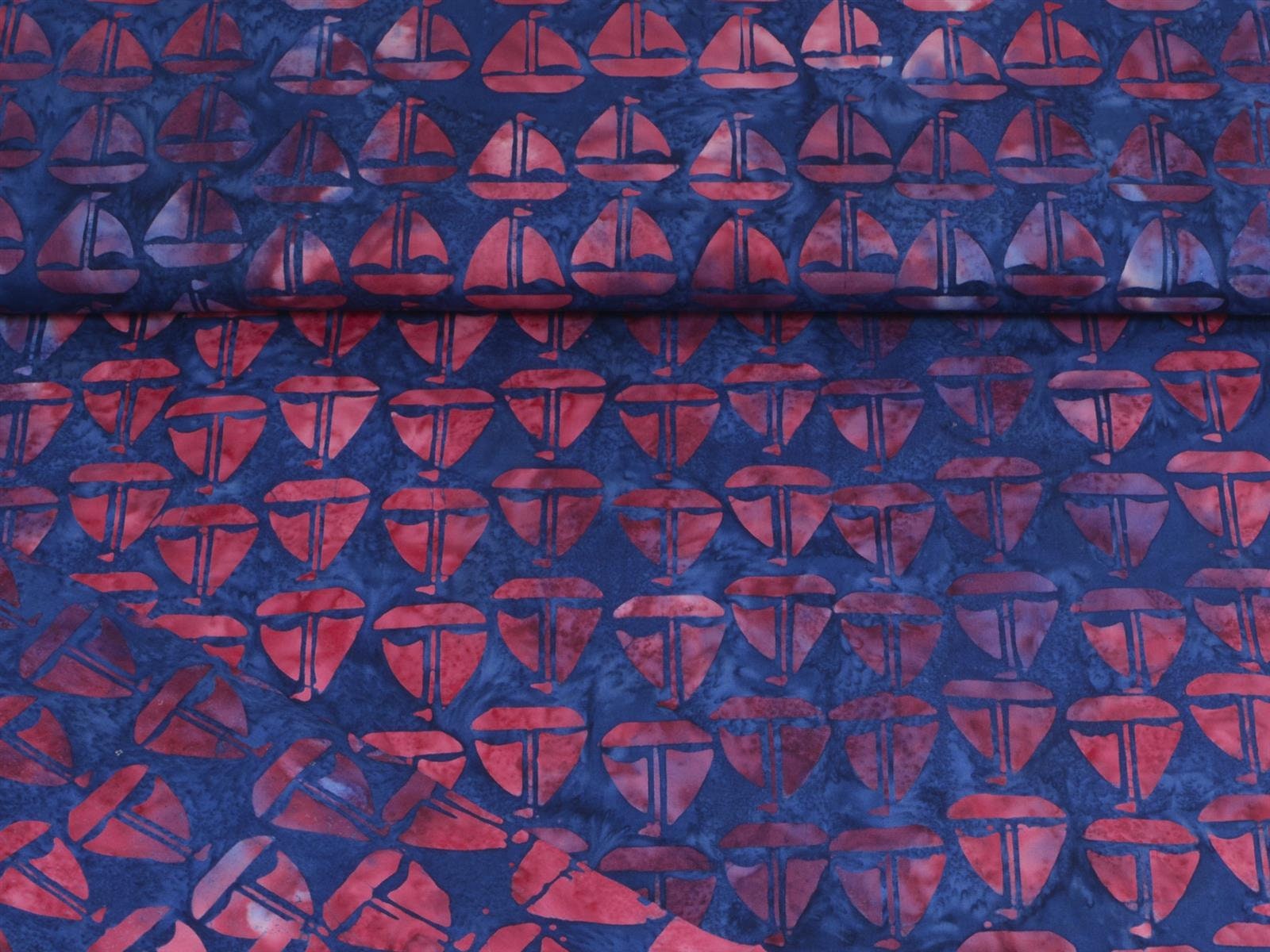 Baumwollstoff der Firma Island Batik zum Patchworken. Der Stoff zeigt rote Batik-Boote. Das Batik-Muster eigent sich wunderbar für Patchwork-Arbeiten, für Decken, Kissen, Taschen, Dekoartikel und andere kreative Arbeiten. Er lässt sich außerdem super mit unseren anderen Maritimen-Baumwollstoffen kombinieren
