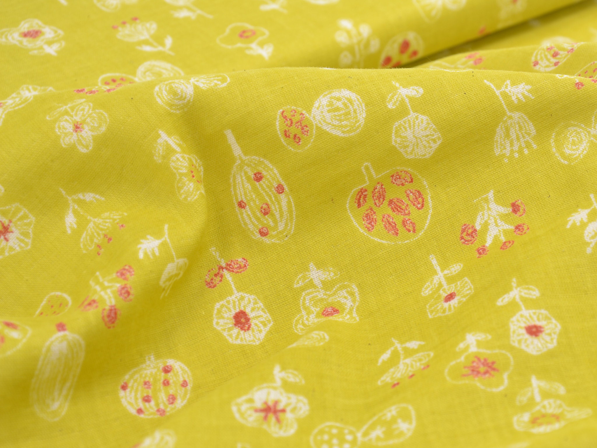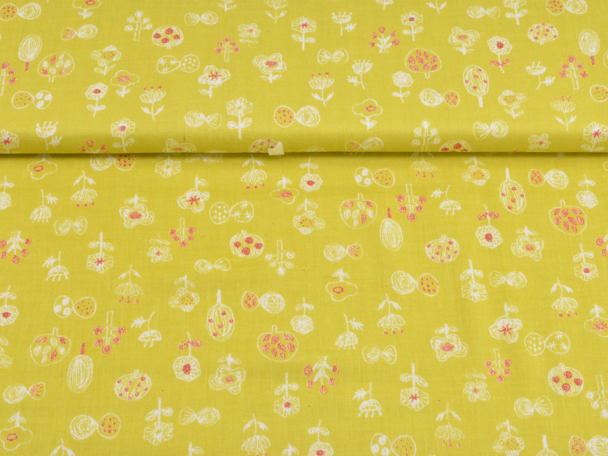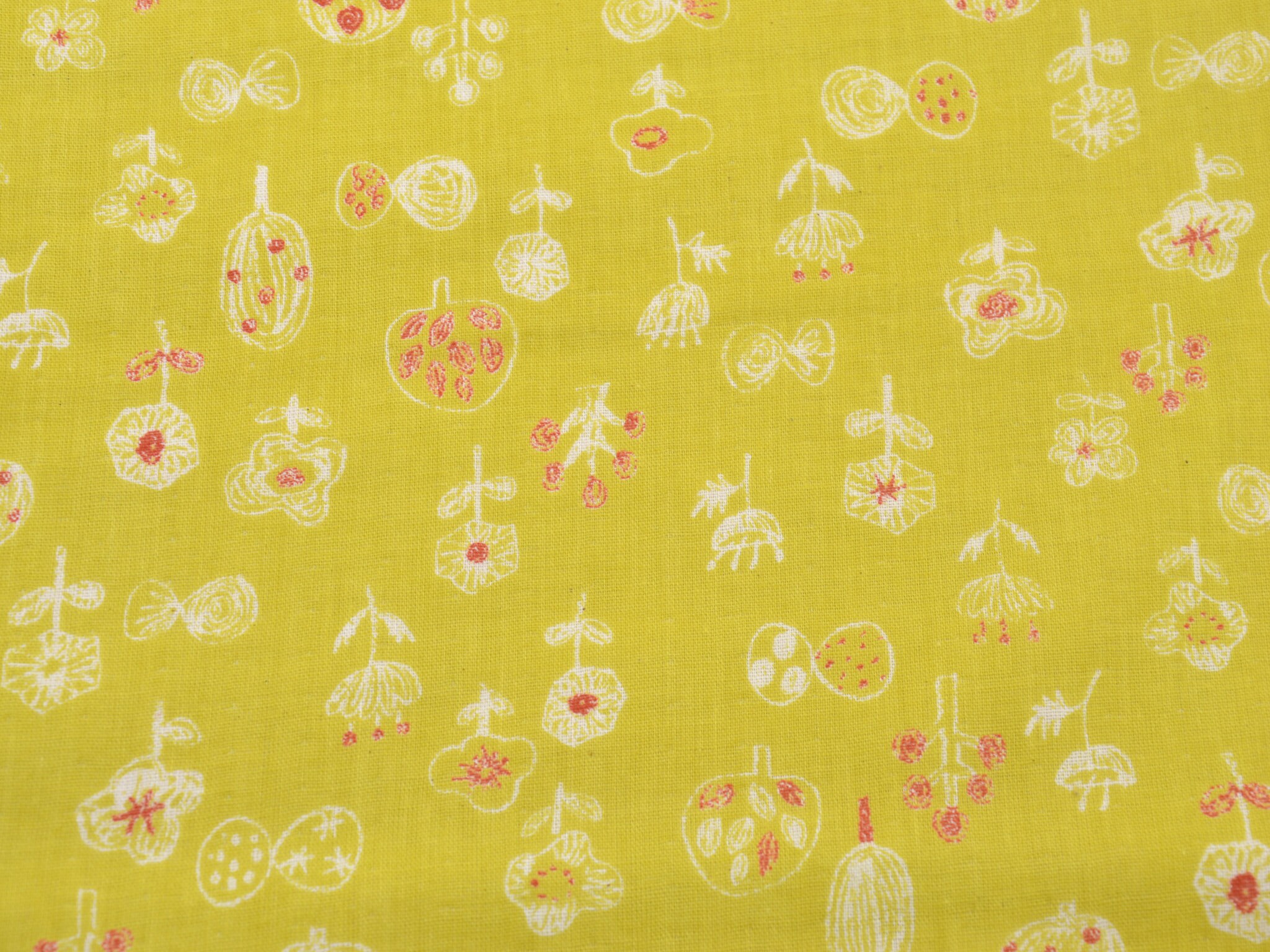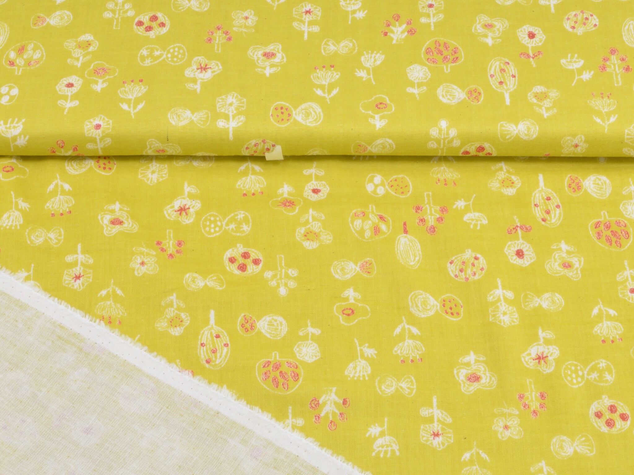 Double gauze made in Japan by Kokka. A uniquely lightweight, double-layered fabric with flowers and trees on a light green background. Ideal for blouses, scarves, skirts, and dresses.
