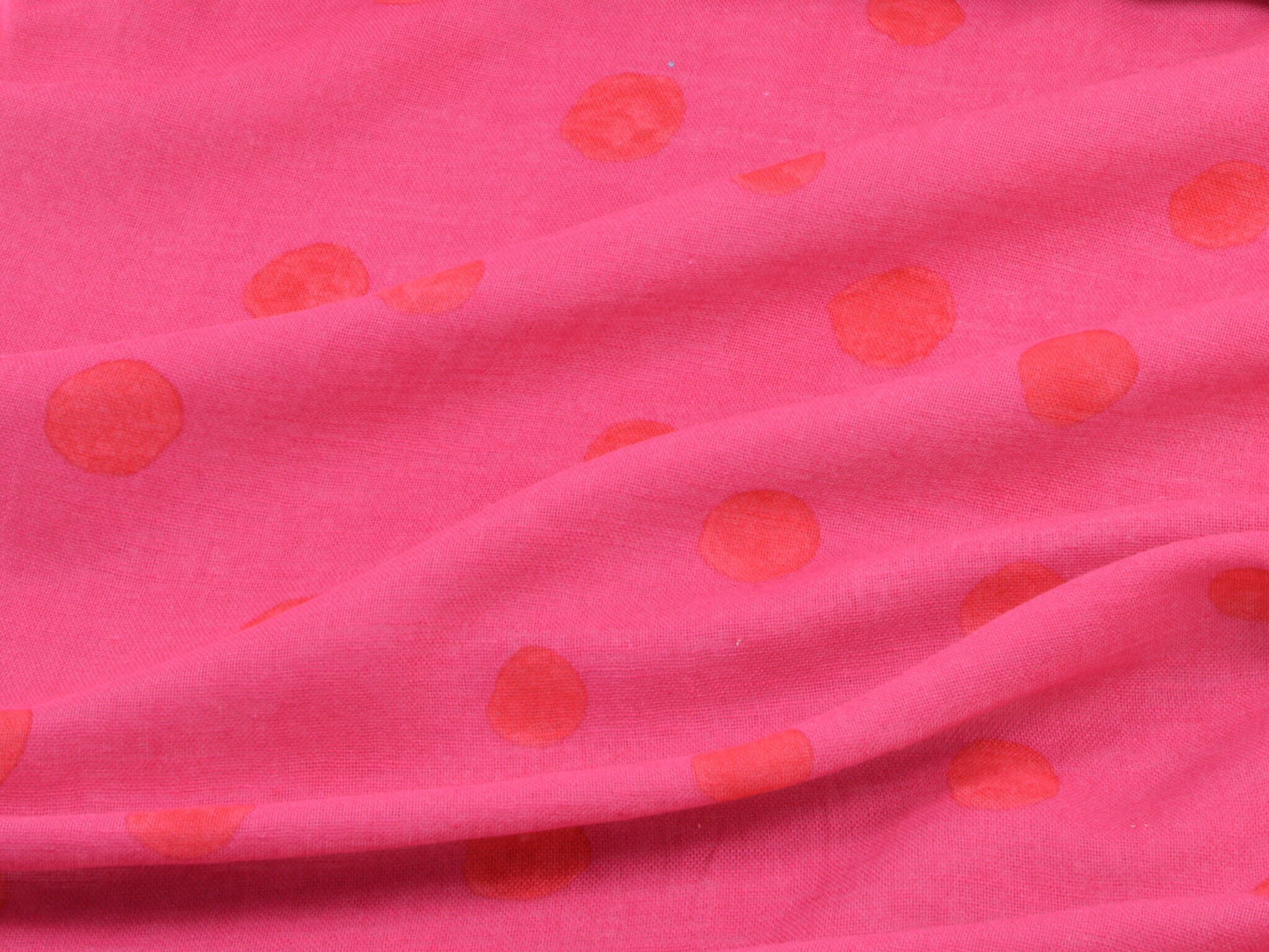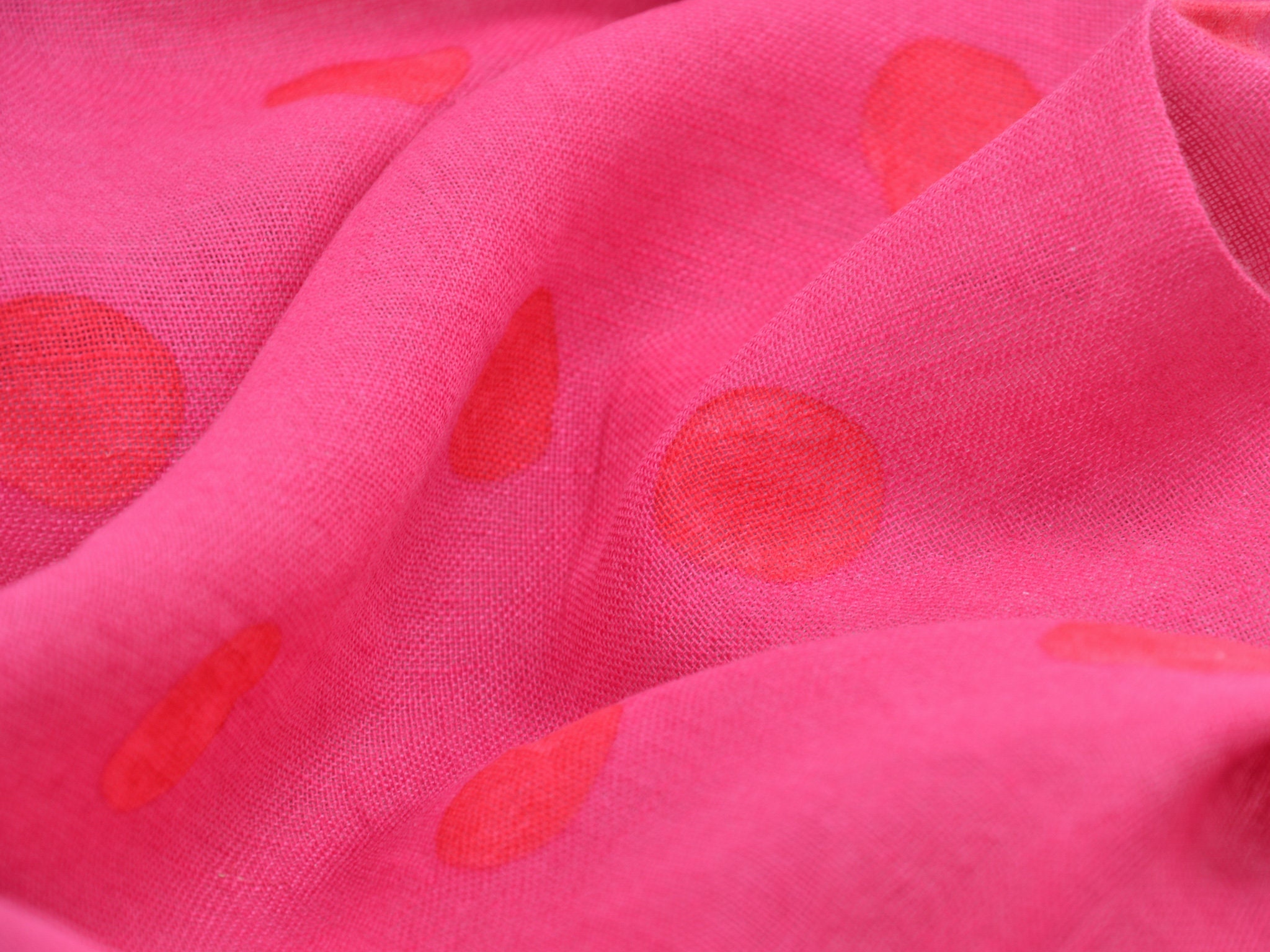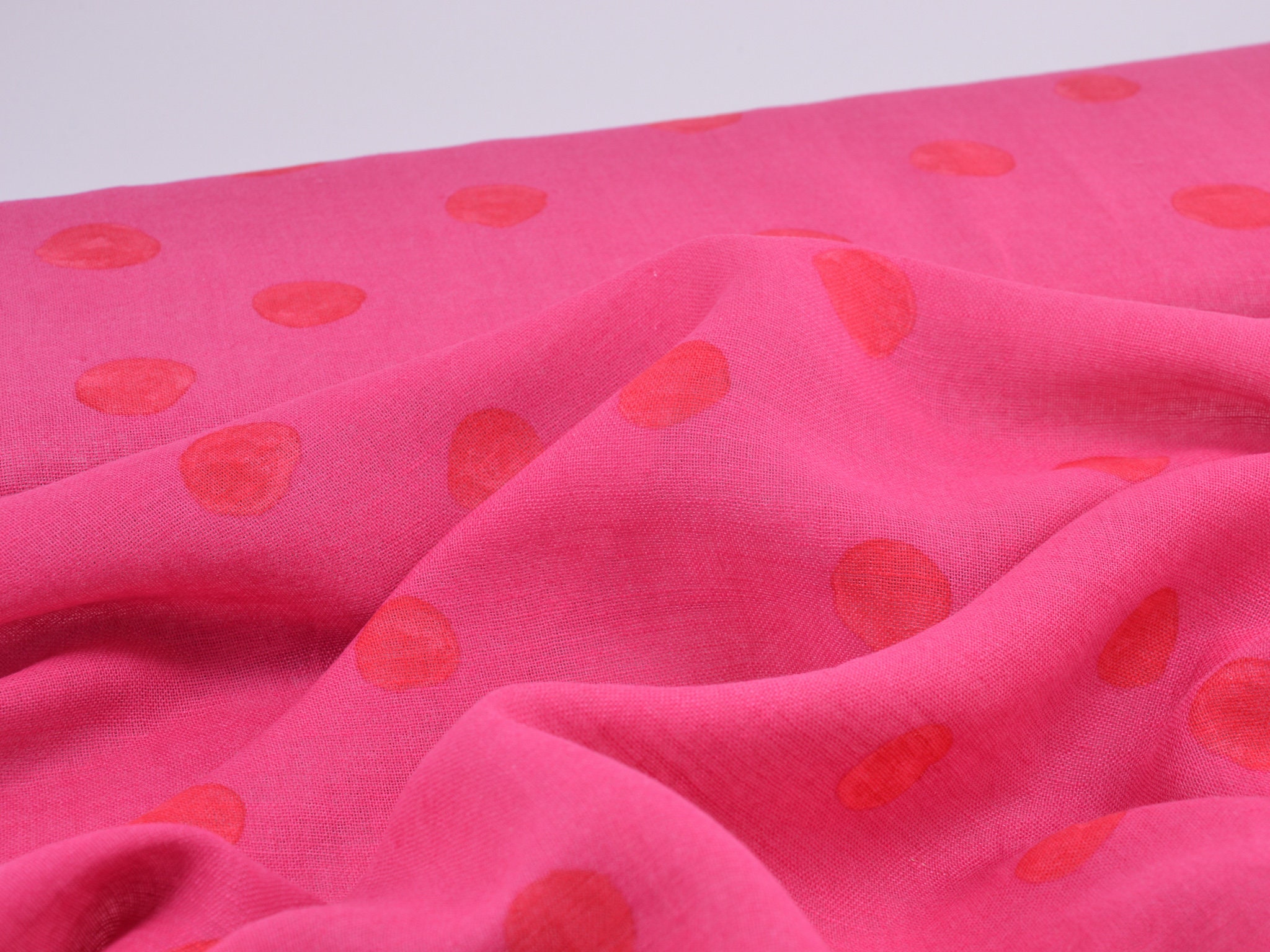 Dünner Stoff aus Leinen und Baumwolle in pink mit roten Punkten. Die Punkte sind unregelmäßig und ca 3 cm groß. Der Stoff ist leicht und etwas transparent. Er eigent sich für Blusen, Jacken, Kleider, Röcke und Schals. Für Bekleidung empfehlen wir einen Futterstoff zu nutzen, da der Stoff sonst durchscheinend ist.
