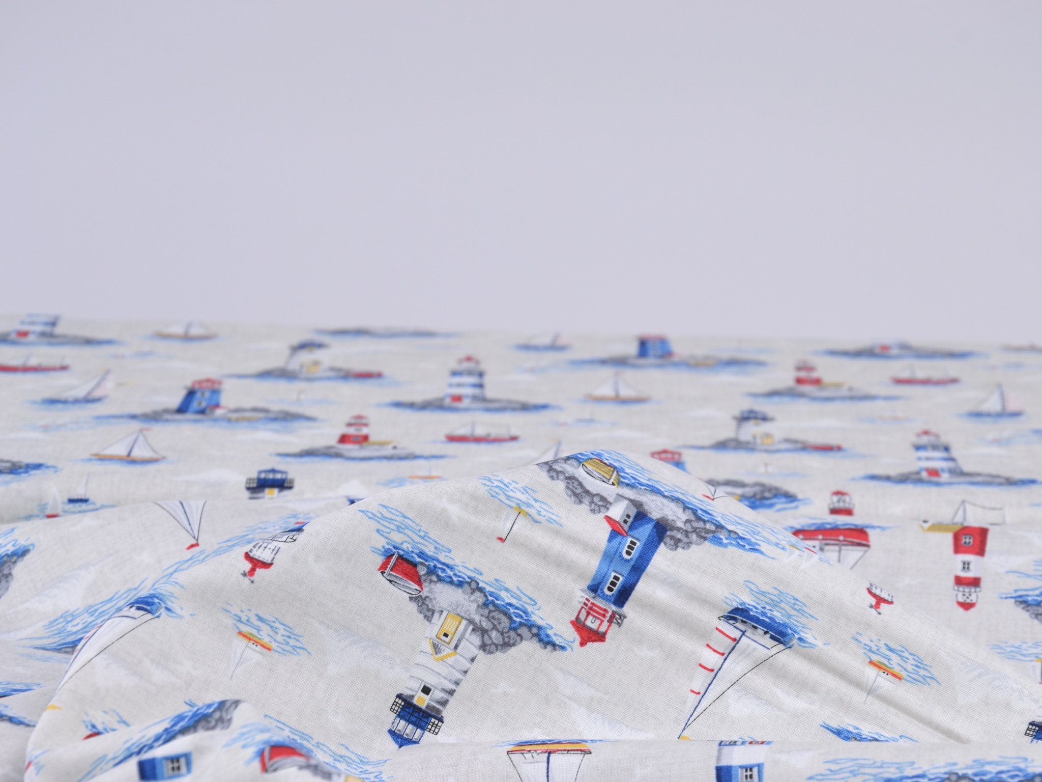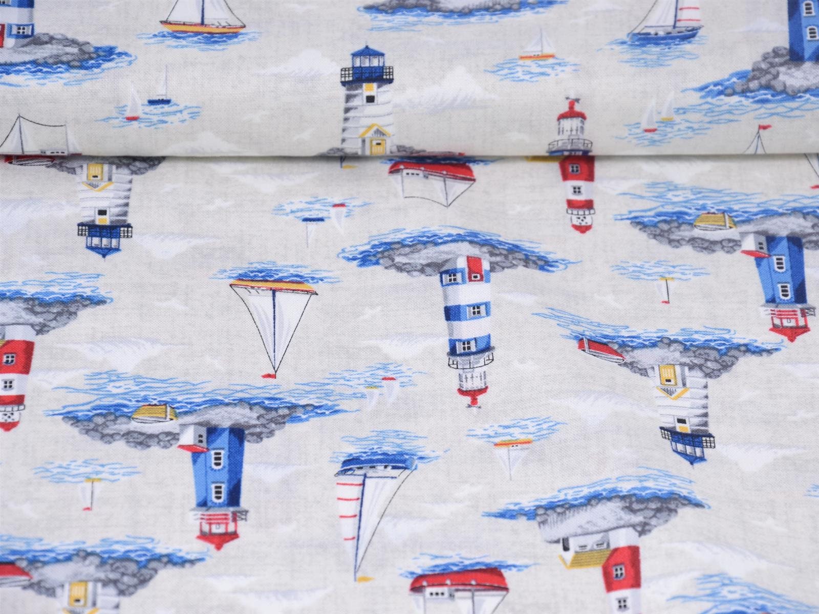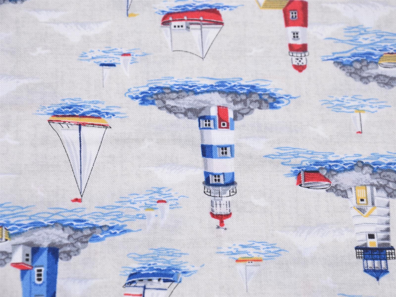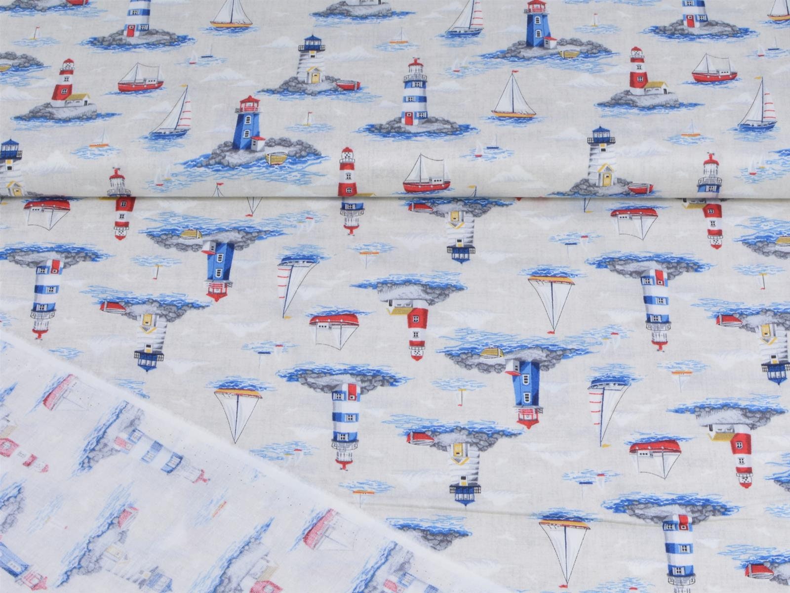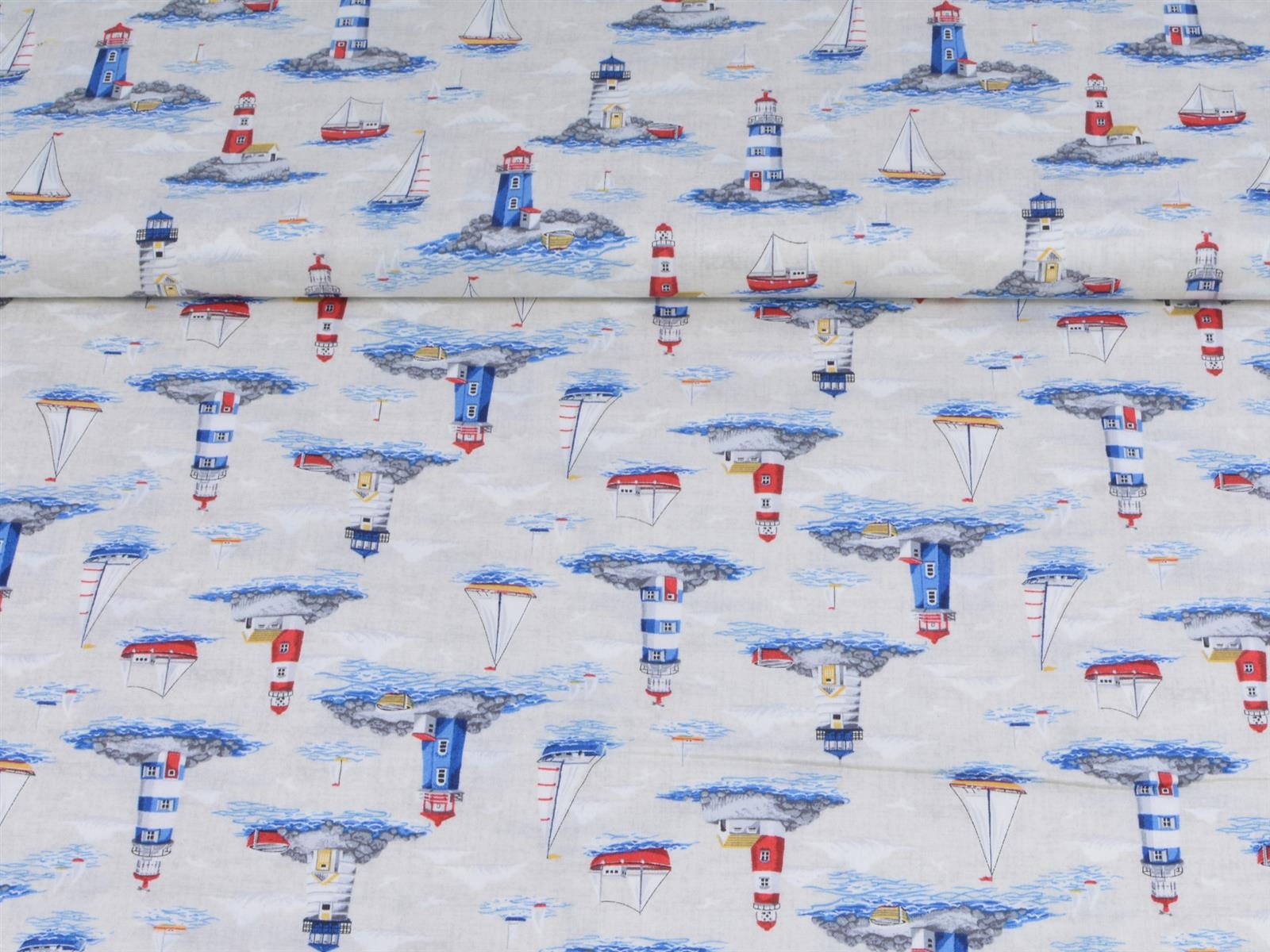Premium Baumwollstoff von Makower. Stoff zum Patchworken und Quilten mit Leuchttürmen und Segelbooten darauf. Stoff Maritim.