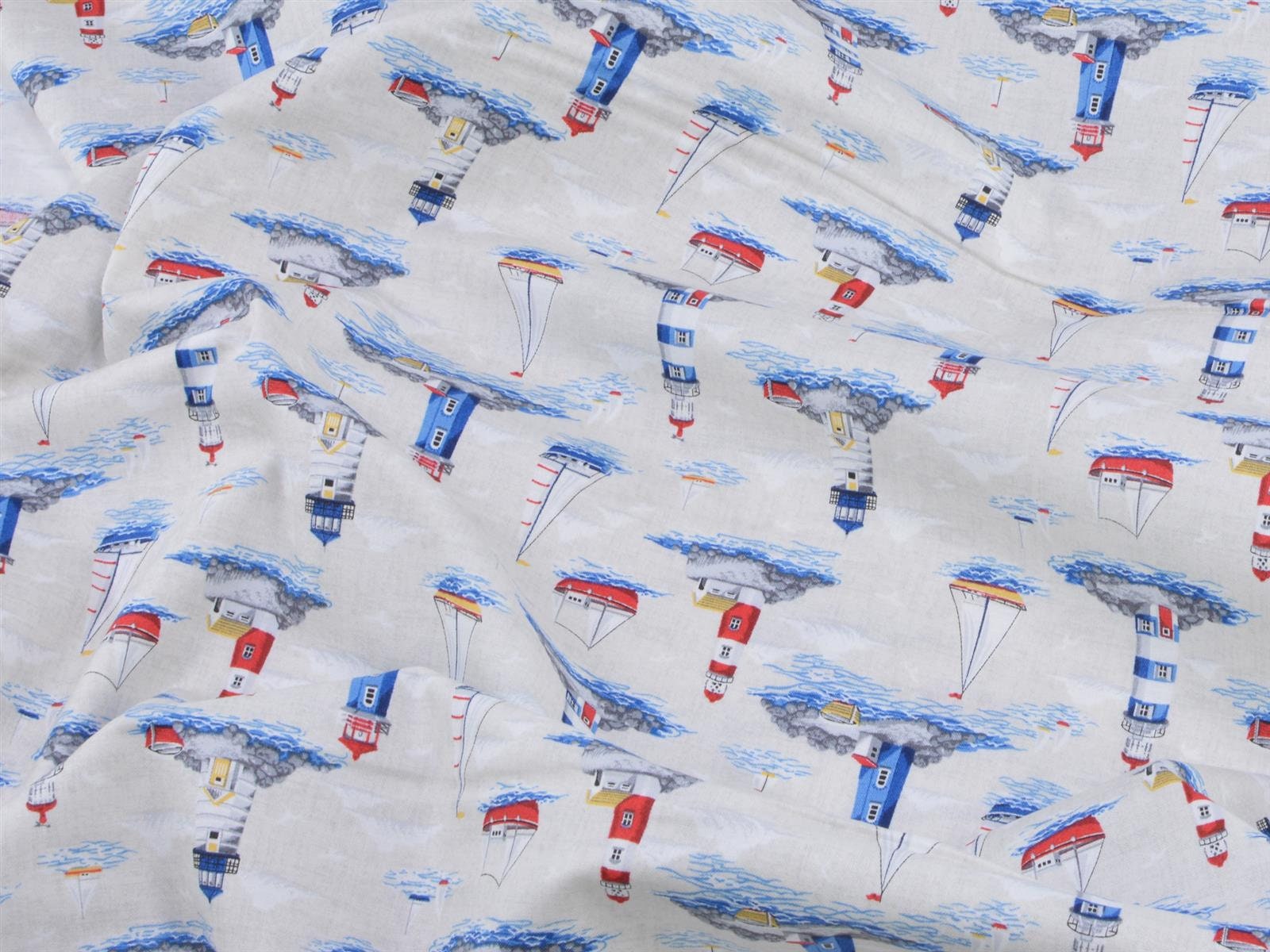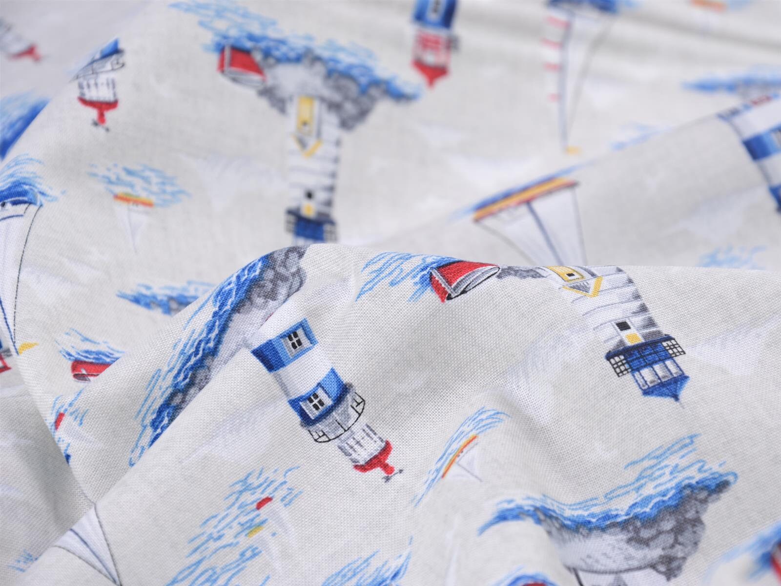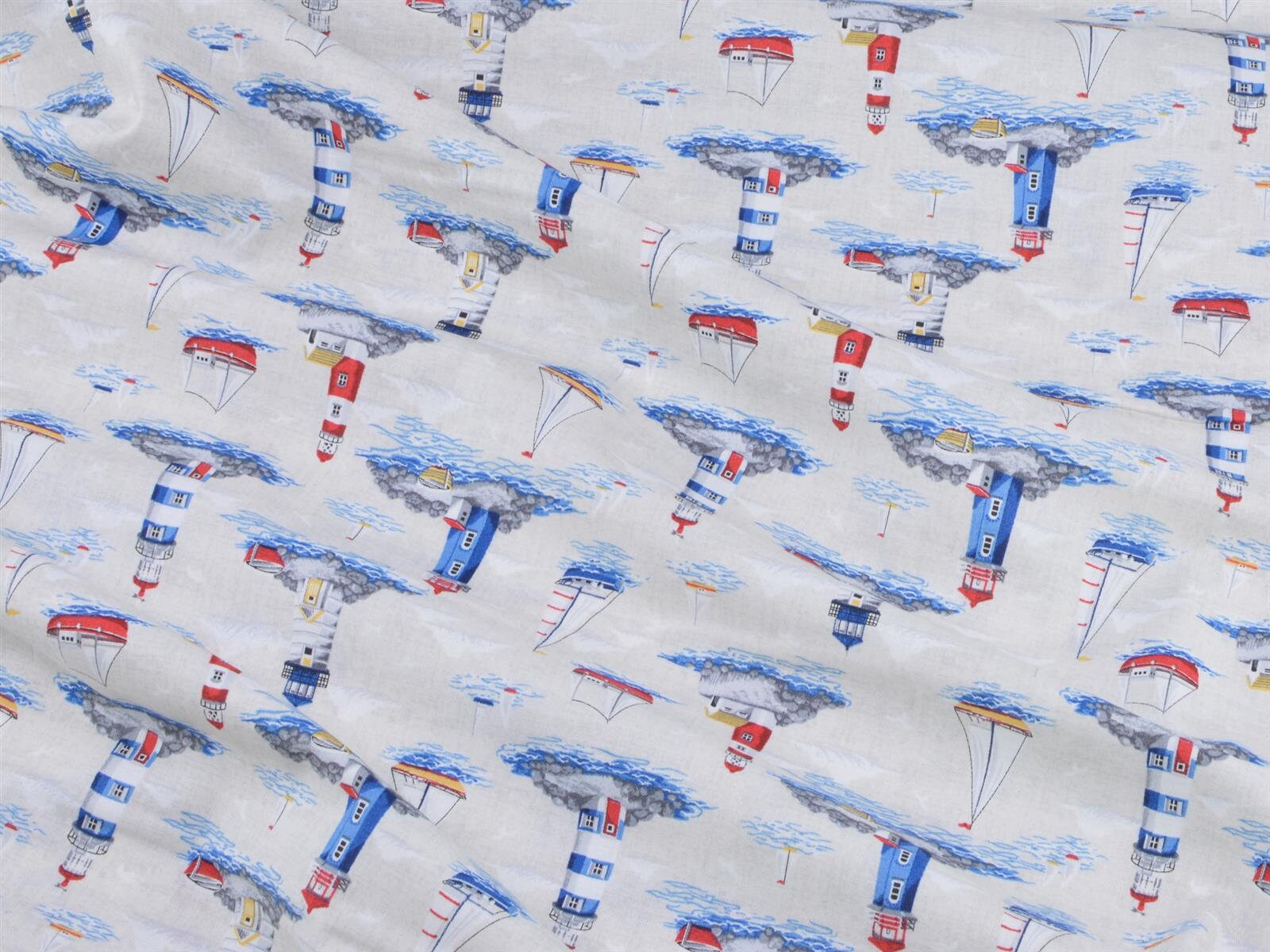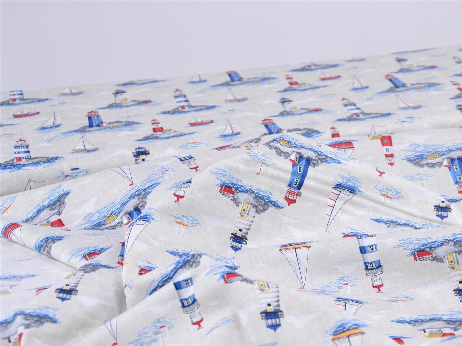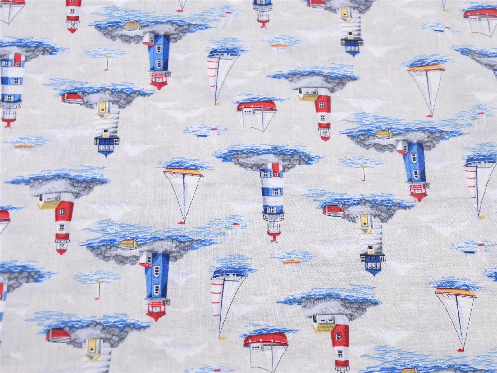Premium Baumwollstoff von Makower. Stoff zum Patchworken und Quilten mit Leuchttürmen und Segelbooten darauf. Stoff Maritim.