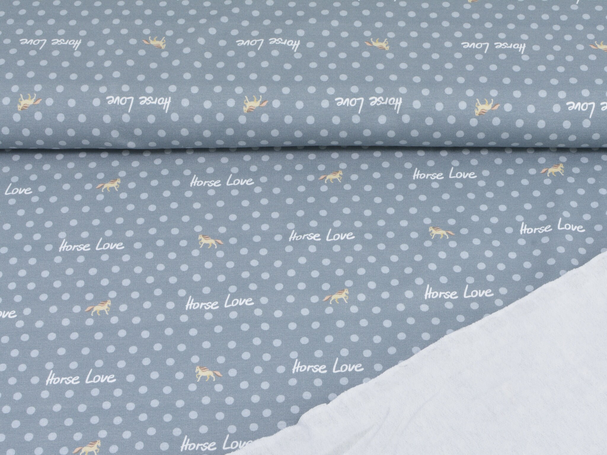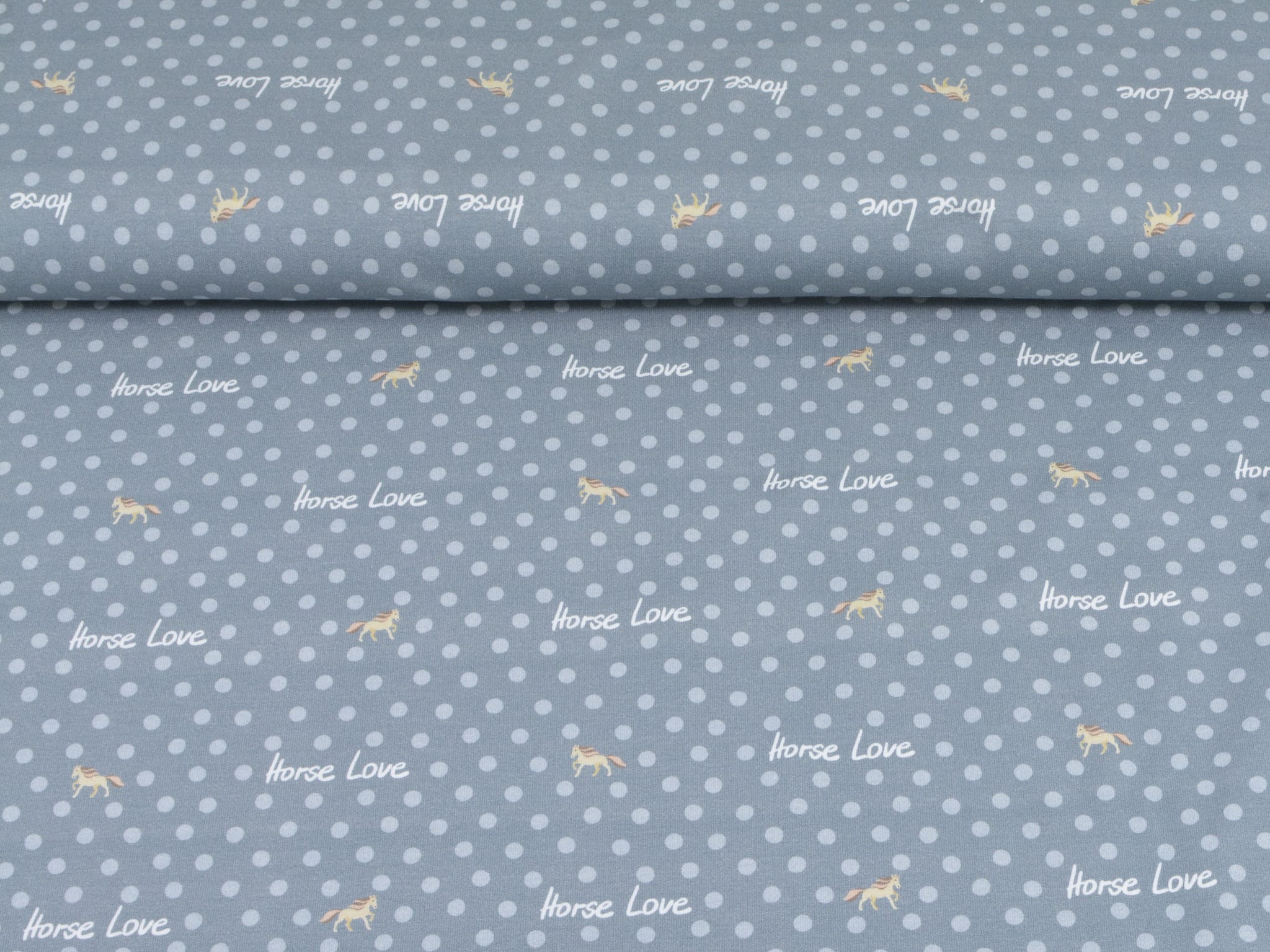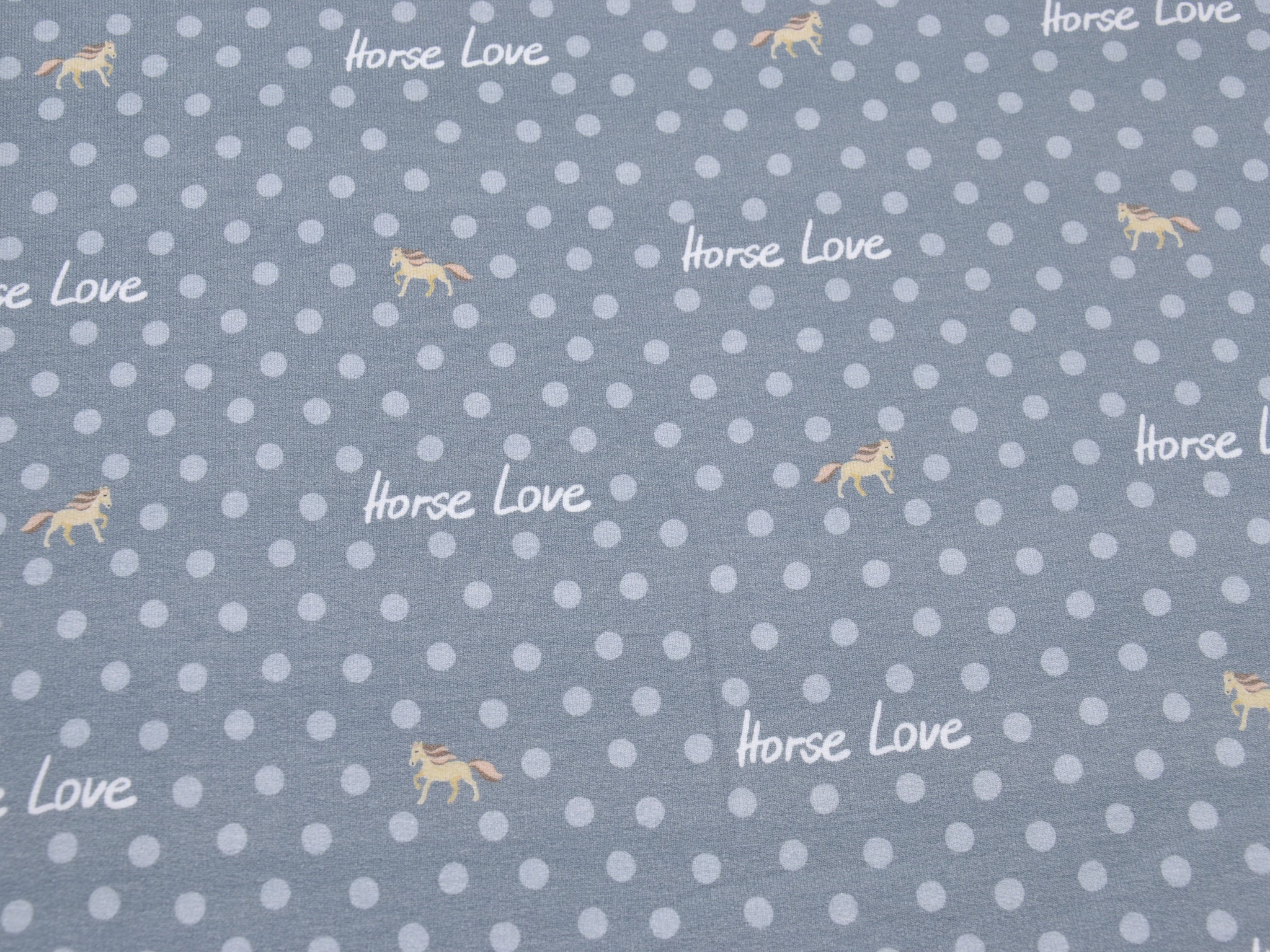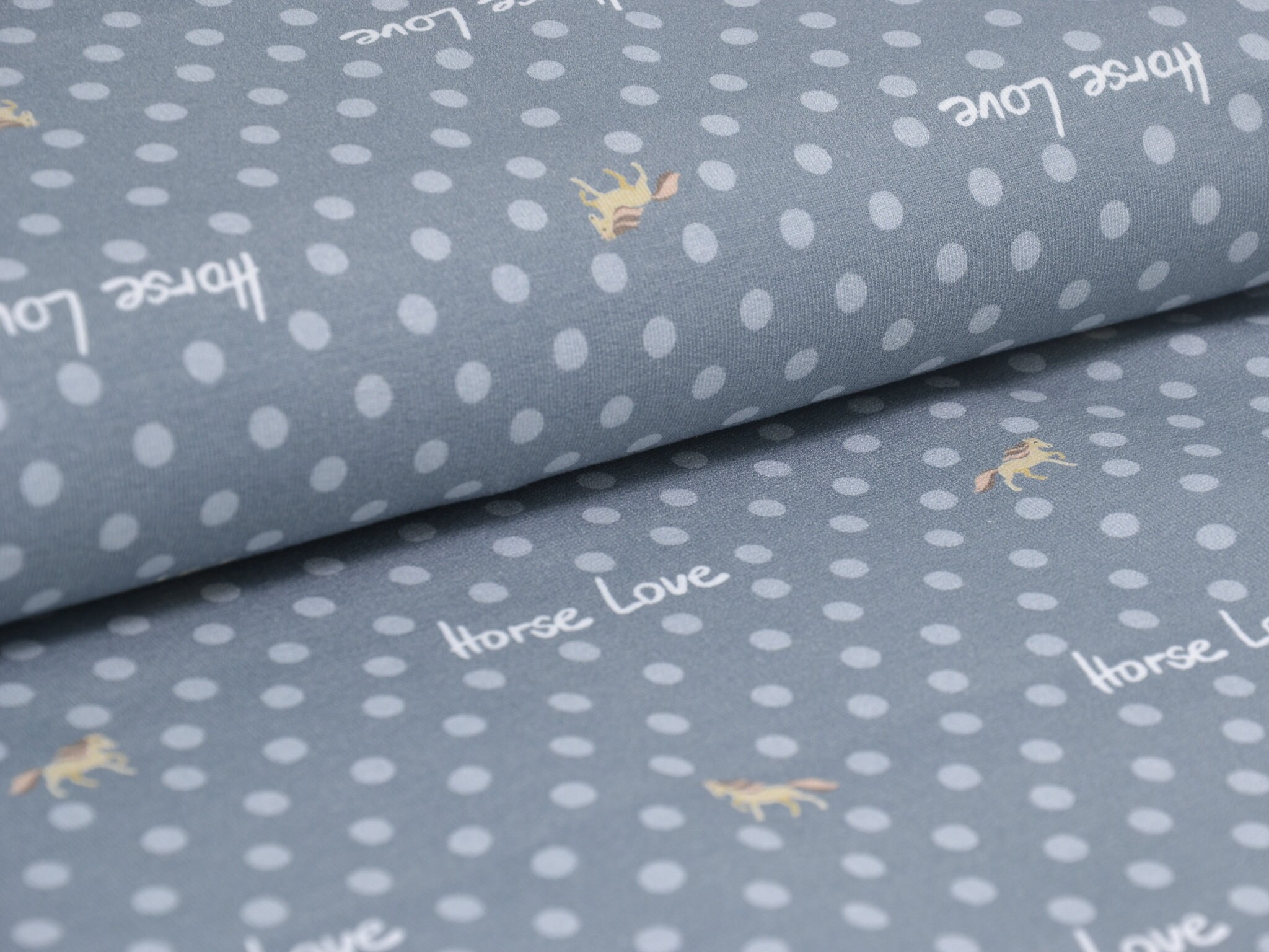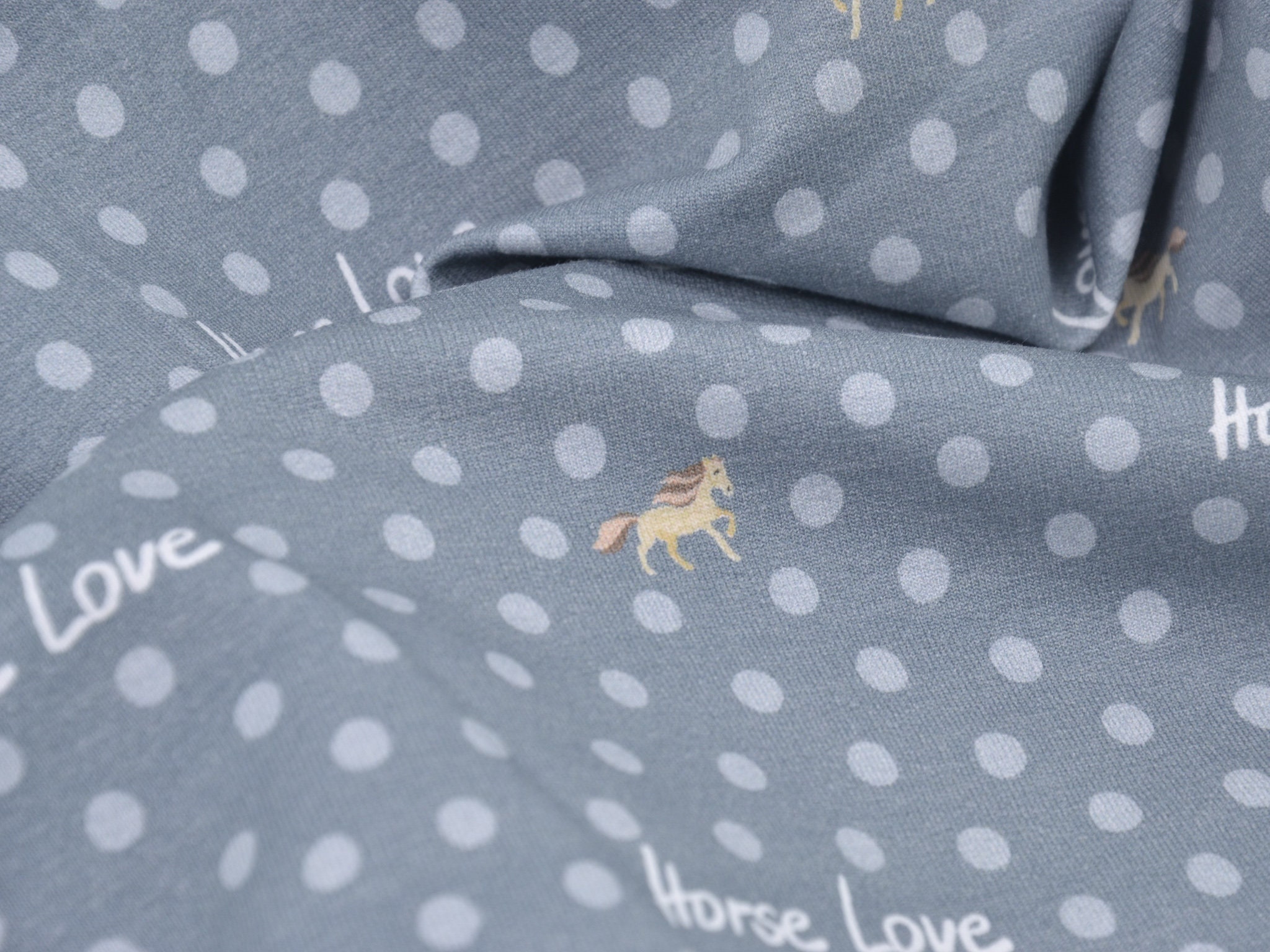 Hochwertiger Sommersweat Stoff aus dem Hause Hilco. Der Stoff ist grau mit hellgrauen Punkten. Zwischen den Punkten sind abwechselnd mini Pferde in beige oder der Schriftzug "Horse Love" in weiß zu sehen. Die gemusterte Stoffseite ist glatt und matt. Die Rückseite ist weiß und weich. Sommersweat ist die perfekte Mischung zwischen Jersey und Sweat. Deshalb eignet sich der Stoff toll für die Übergangszeit. Sweatshirts, Kleider, Röcke oder auch Jogginghosen lassen sich daraus toll nähen.