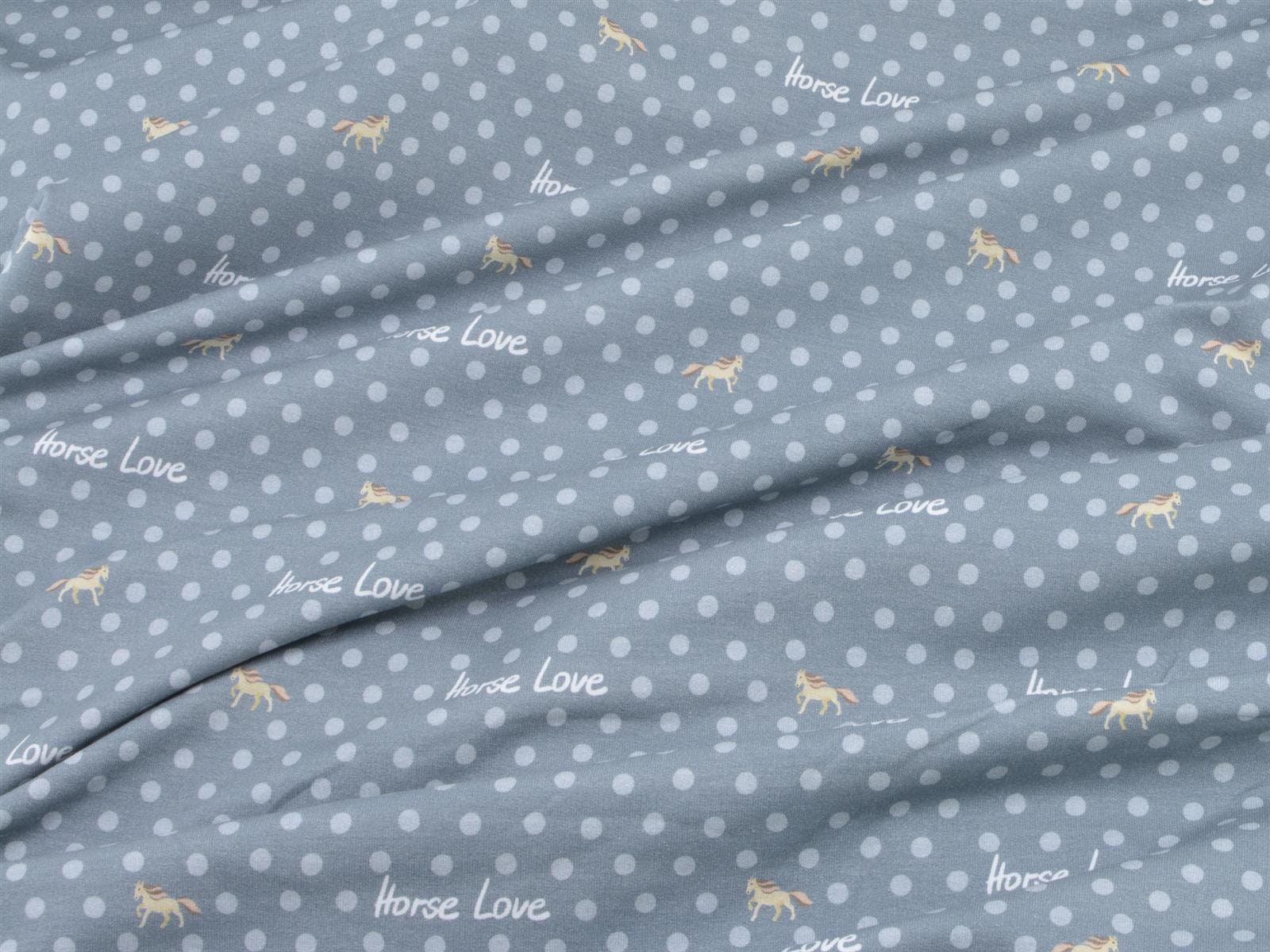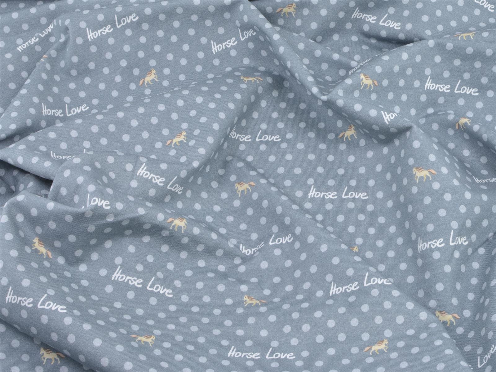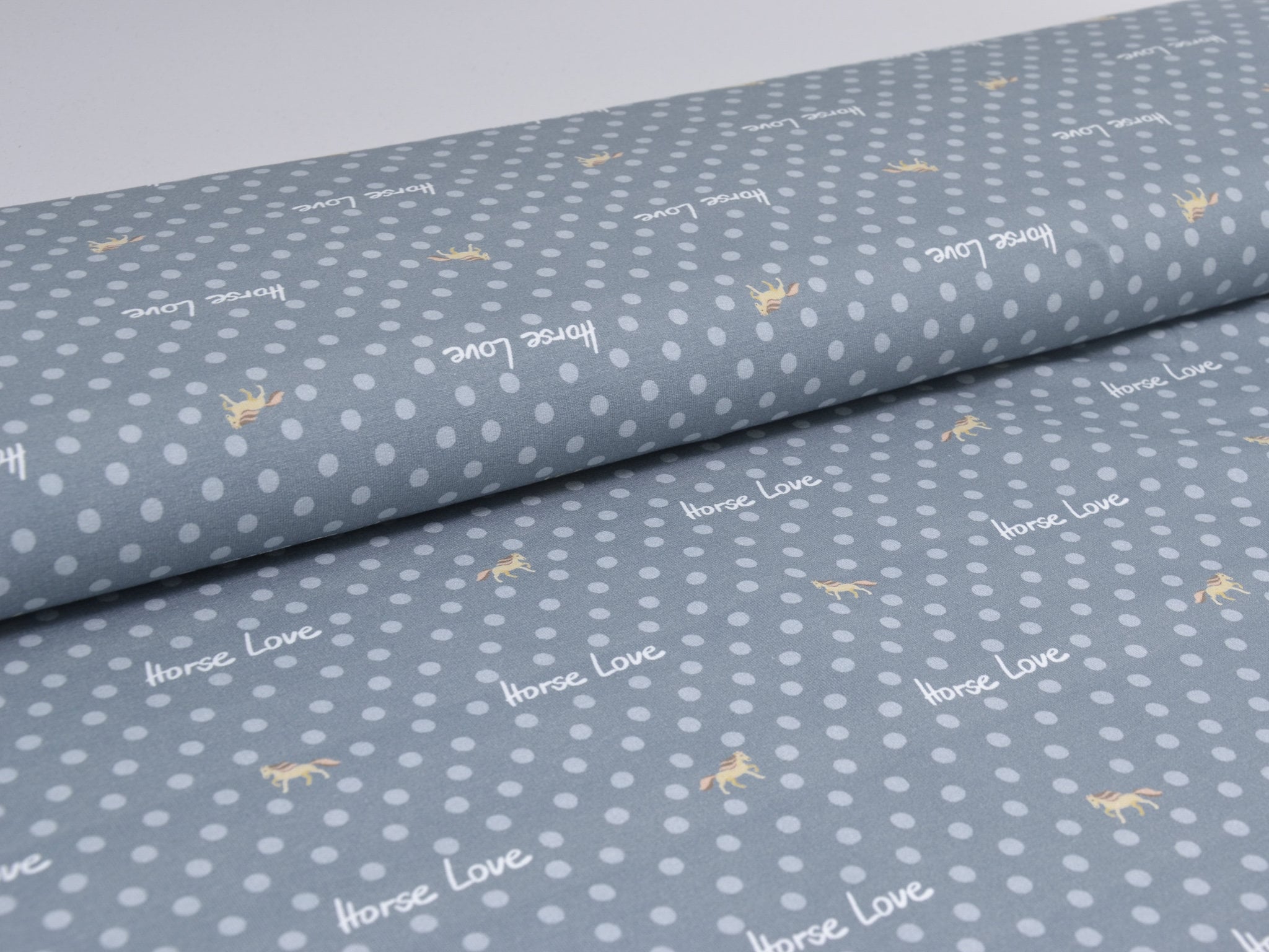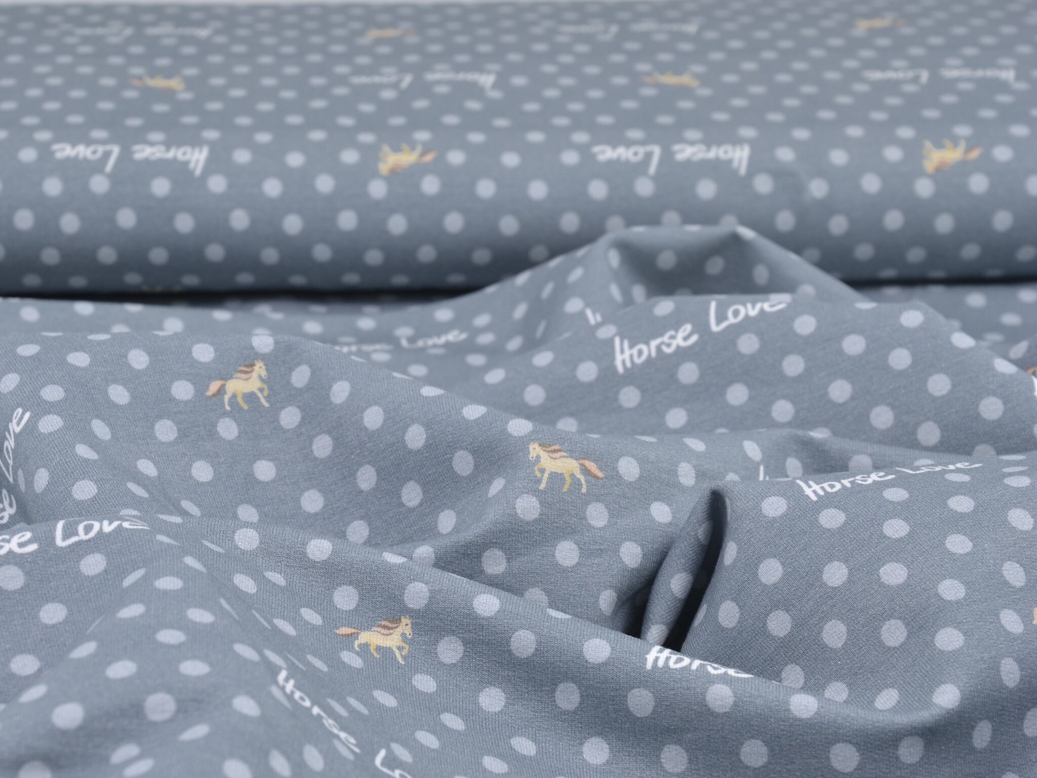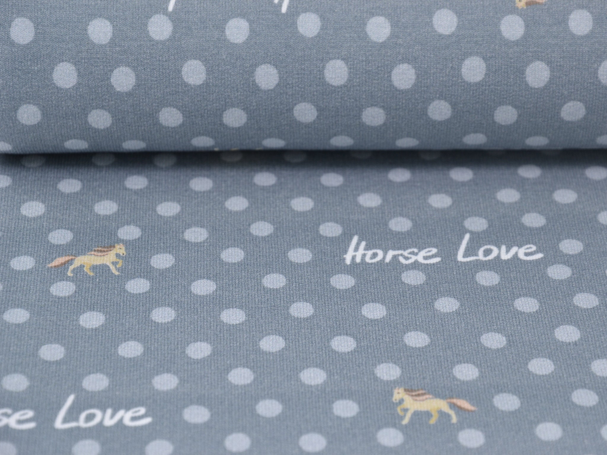Hochwertiger Sommersweat Stoff aus dem Hause Hilco. Der Stoff ist grau mit hellgrauen Punkten. Zwischen den Punkten sind abwechselnd mini Pferde in beige oder der Schriftzug "Horse Love" in weiß zu sehen. Die gemusterte Stoffseite ist glatt und matt. Die Rückseite ist weiß und weich. Sommersweat ist die perfekte Mischung zwischen Jersey und Sweat. Deshalb eignet sich der Stoff toll für die Übergangszeit. Sweatshirts, Kleider, Röcke oder auch Jogginghosen lassen sich daraus toll nähen.