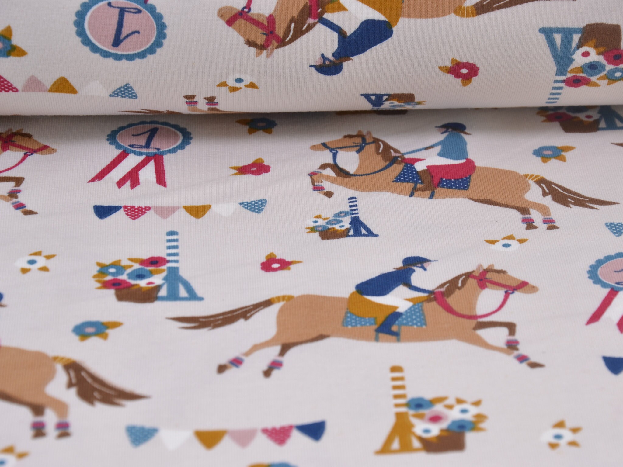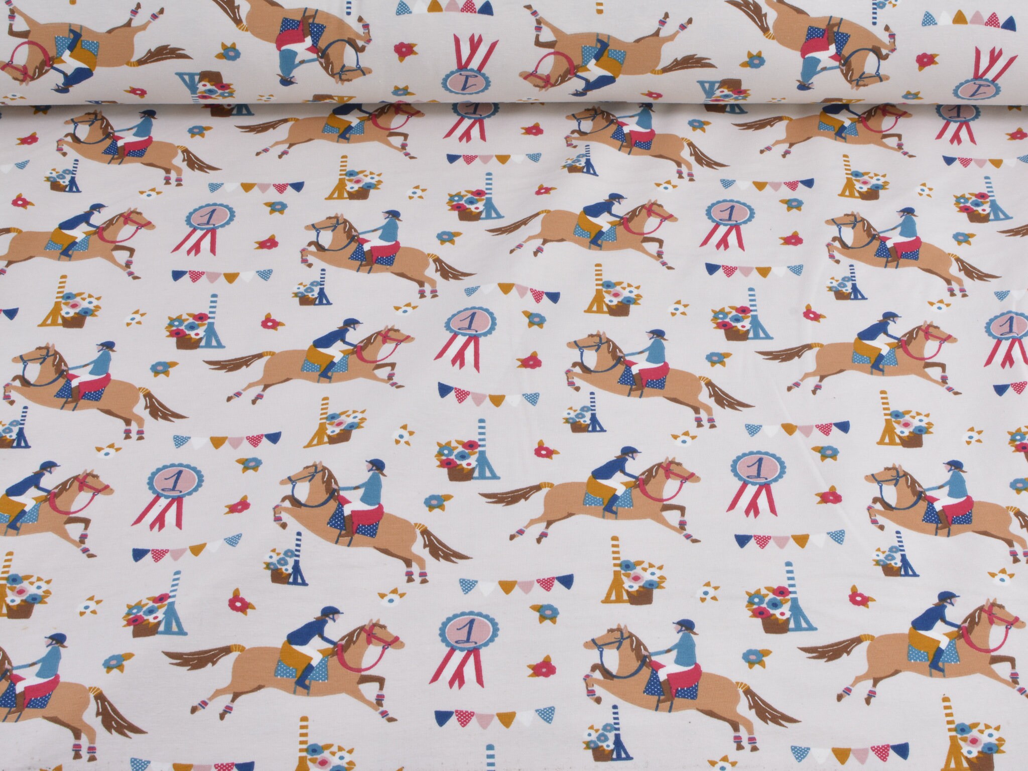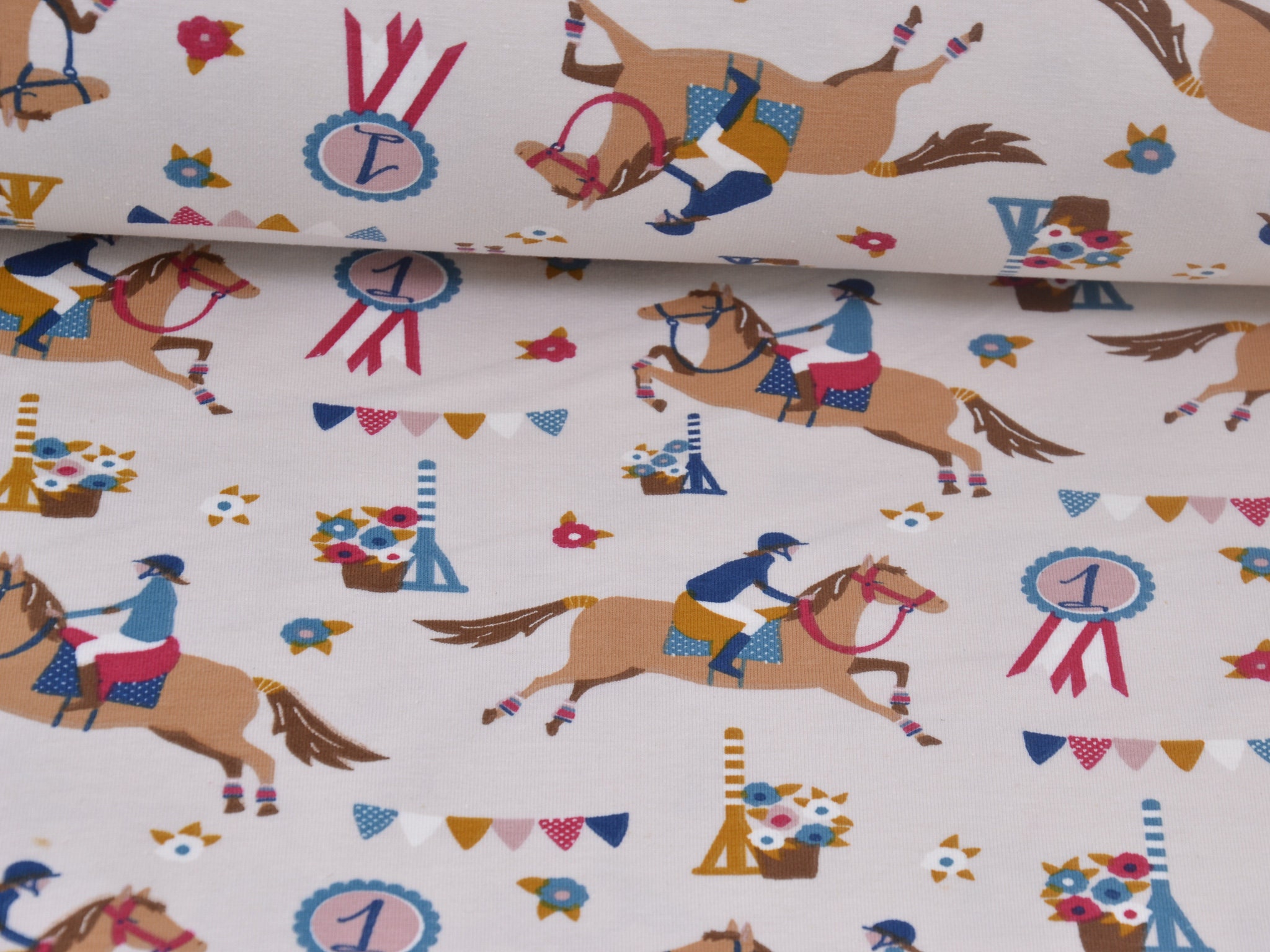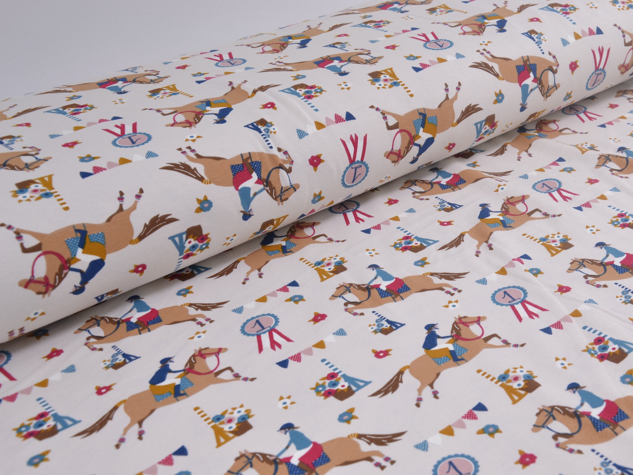 Baumwoll-Jersey für Kinder mit Pferden. Auf dem Jersey sind Reiter auf Ihren Pferden. Zwischen drin sind Medaillen, Blumen und Gierlanden zusehen. Ein Pferd ist ca. 7 cm hoch und 10 cm breit. Der schöne Jersey eignet sich perfekt für Kleider, T-Shirts, Leggings, Röcke, Pullover und so vieles mehr.