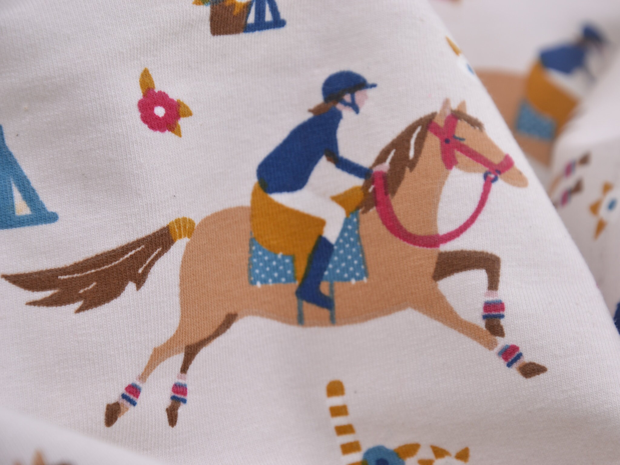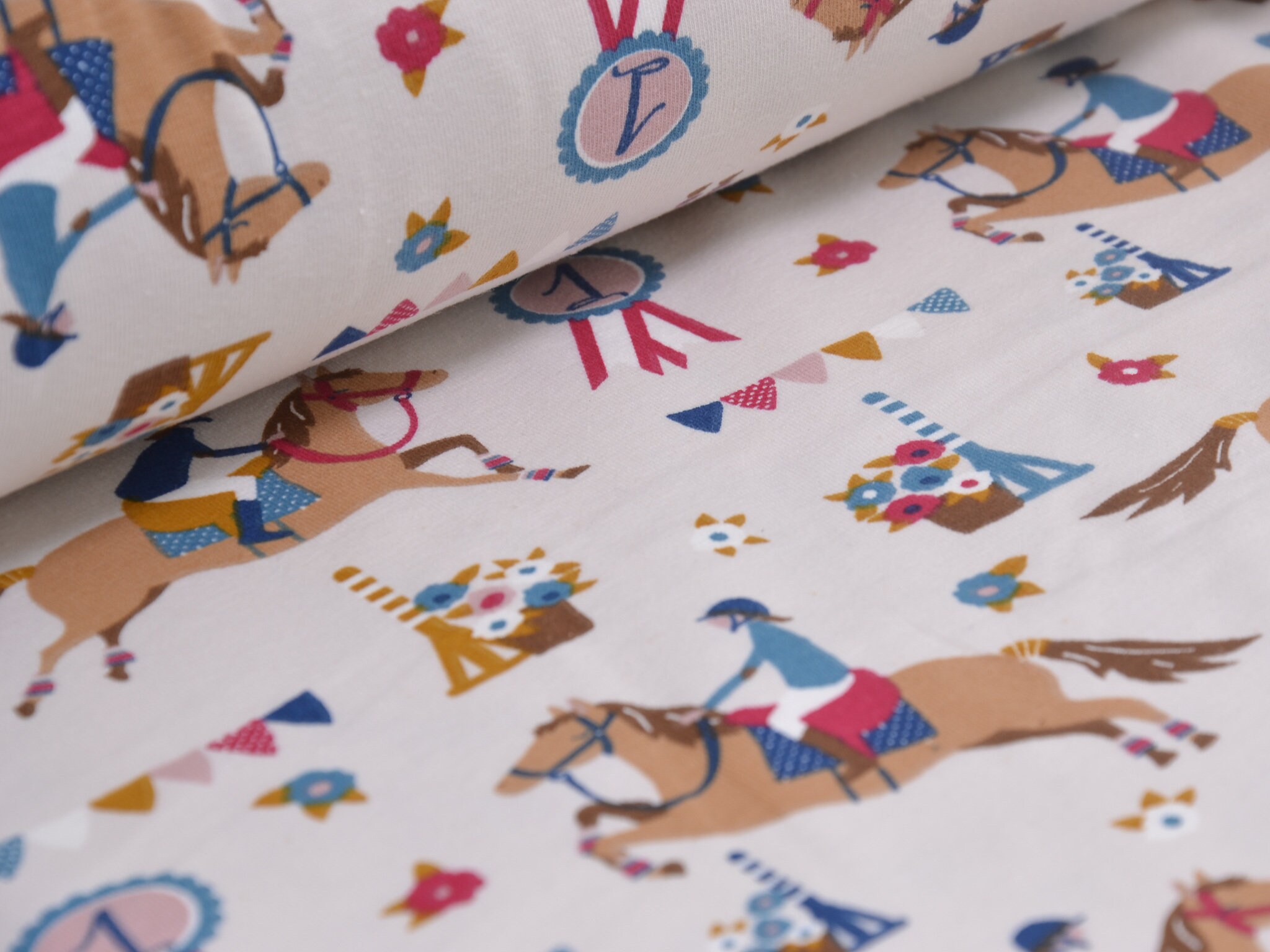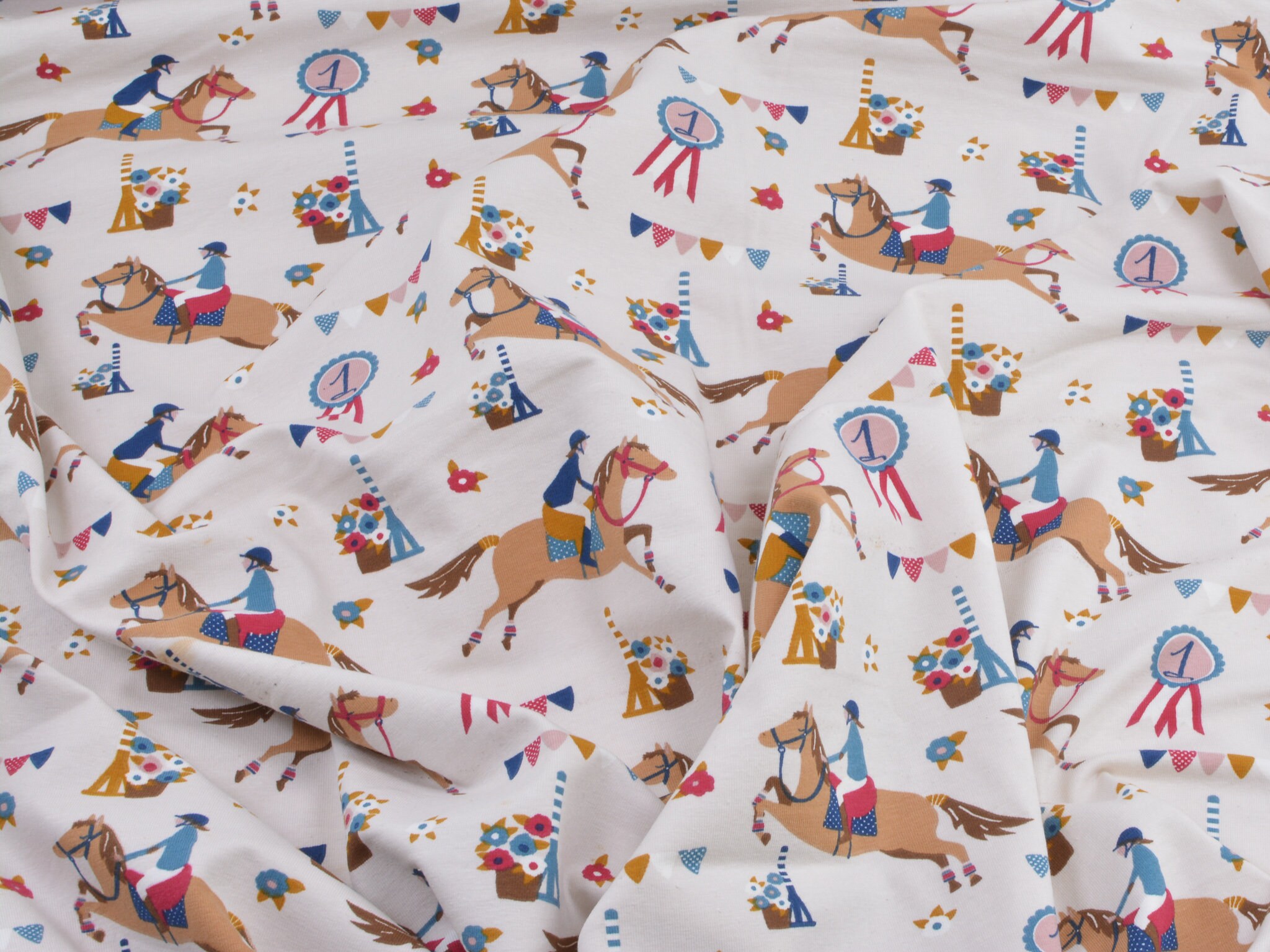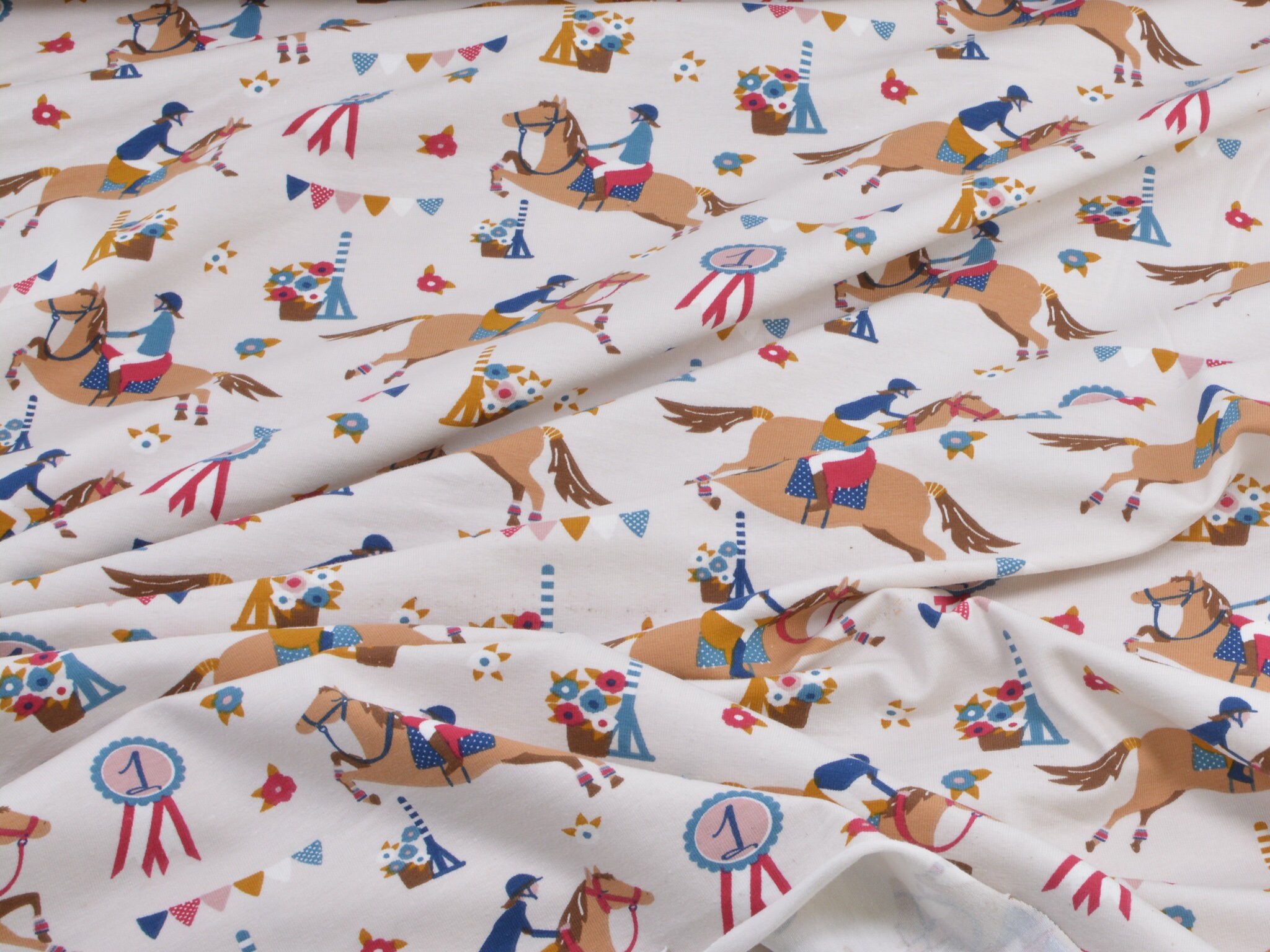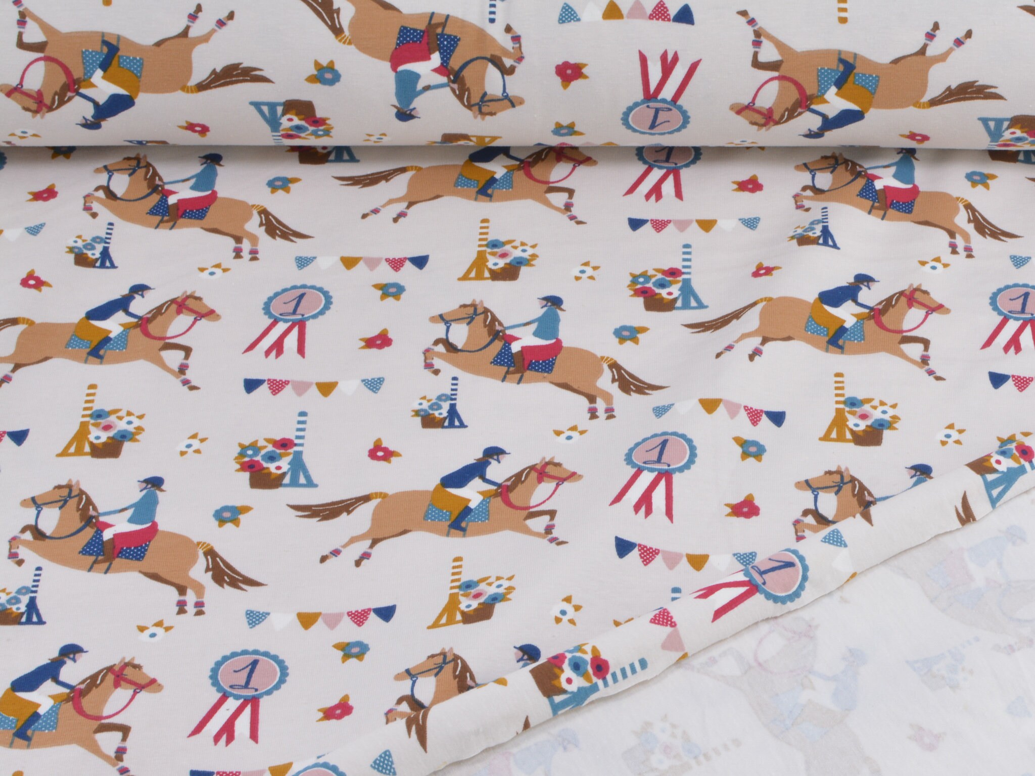 Baumwoll-Jersey für Kinder mit Pferden. Auf dem Jersey sind Reiter auf Ihren Pferden. Zwischen drin sind Medaillen, Blumen und Gierlanden zusehen. Ein Pferd ist ca. 7 cm hoch und 10 cm breit. Der schöne Jersey eignet sich perfekt für Kleider, T-Shirts, Leggings, Röcke, Pullover und so vieles mehr.