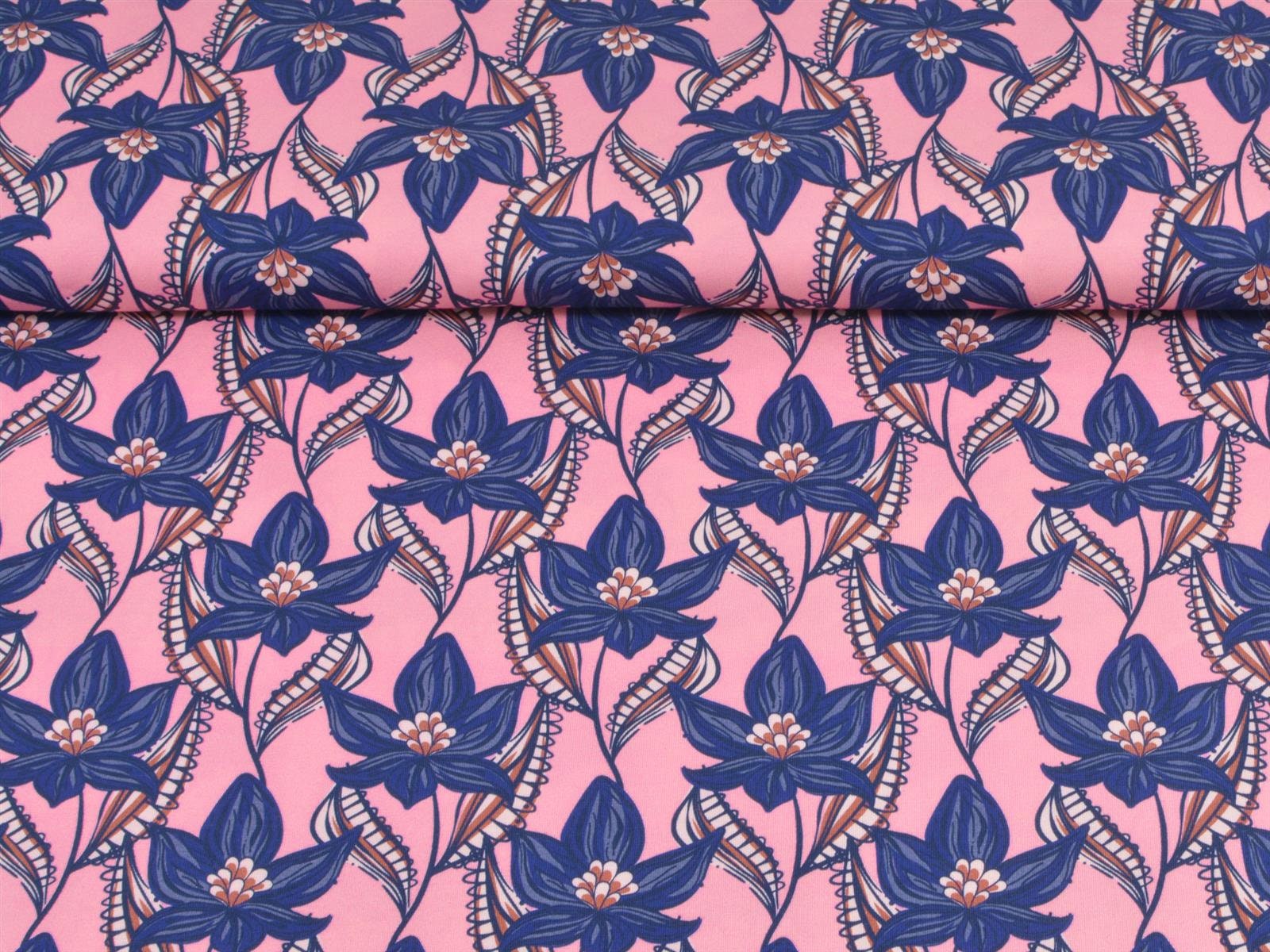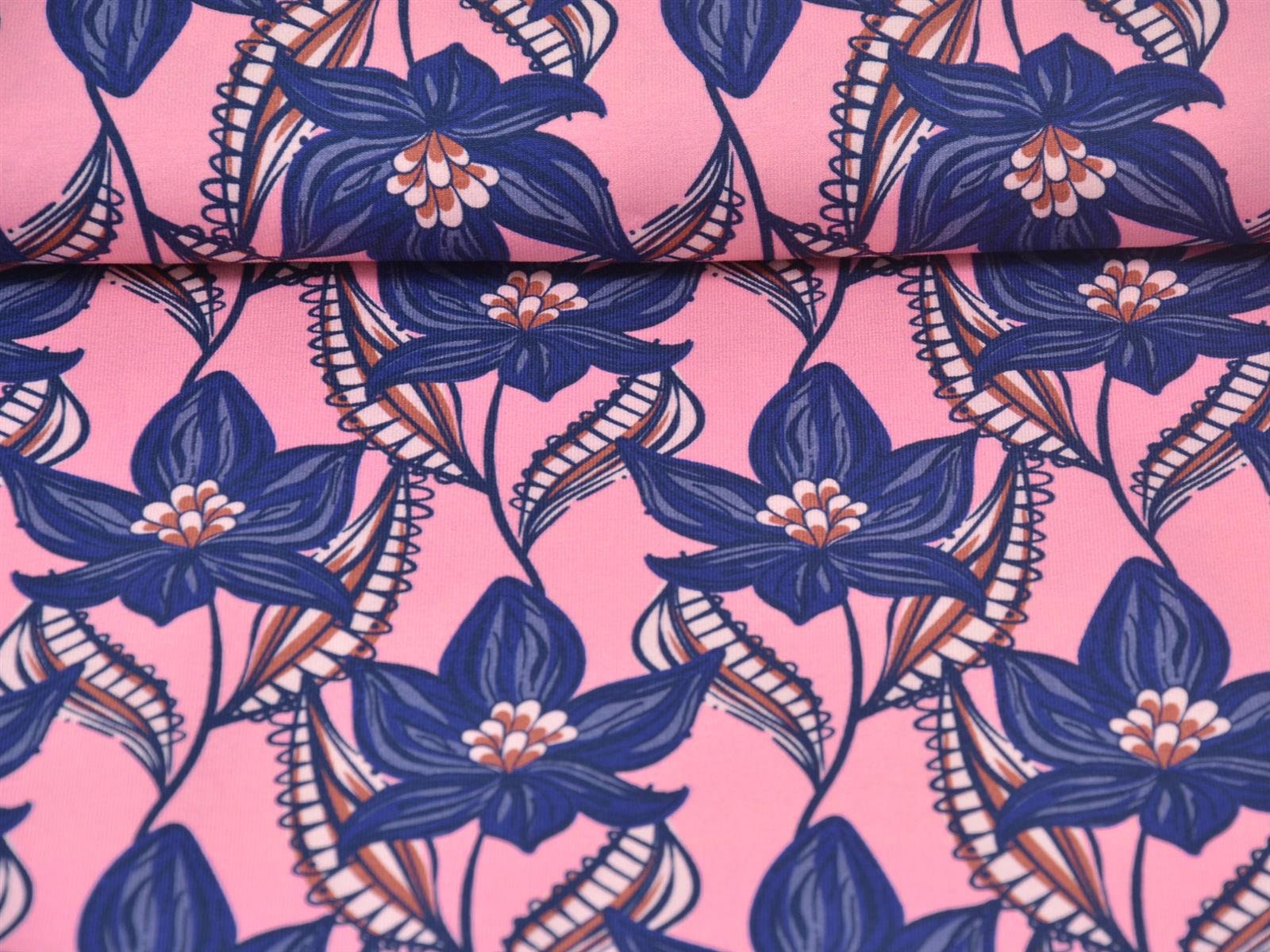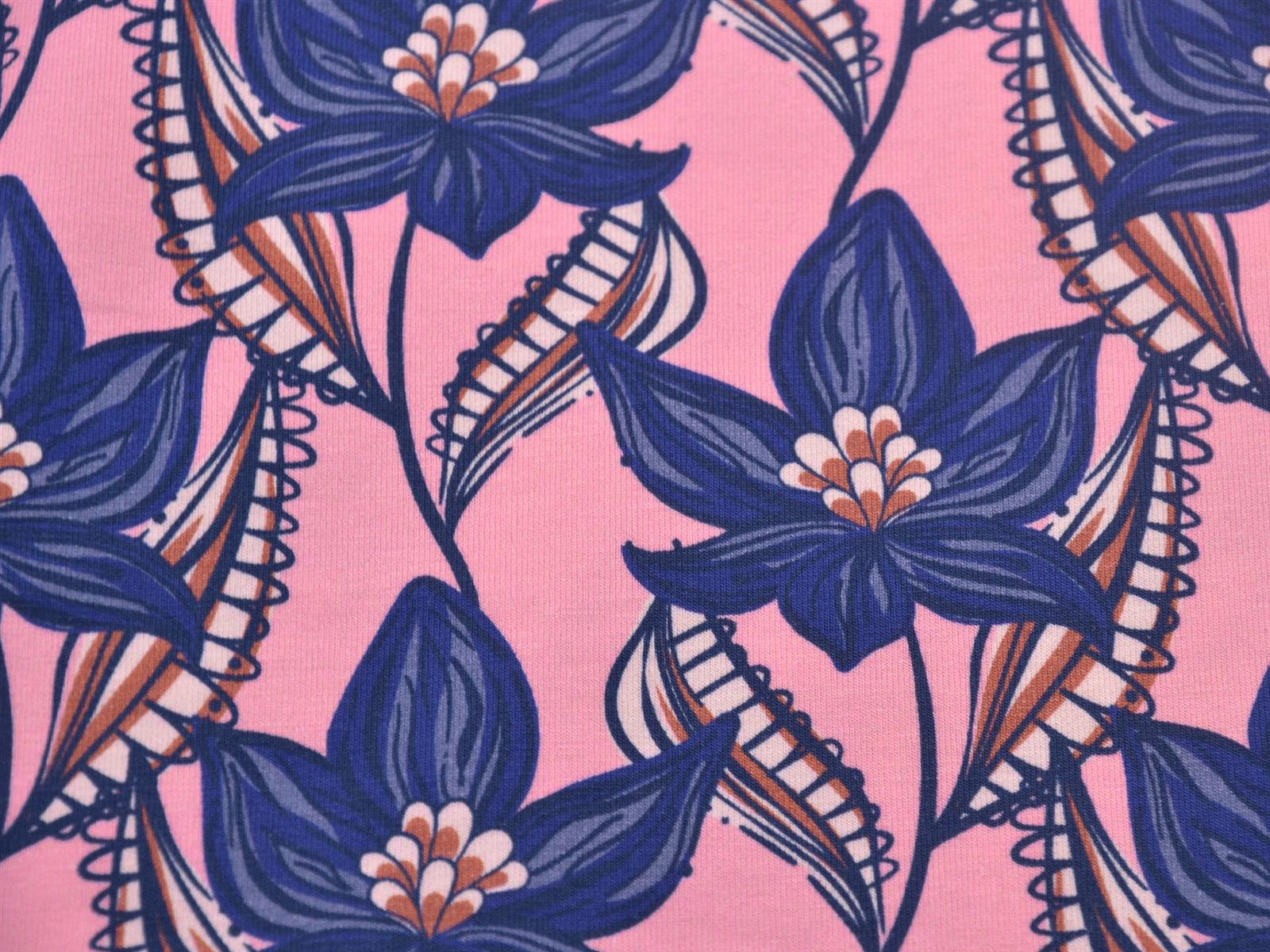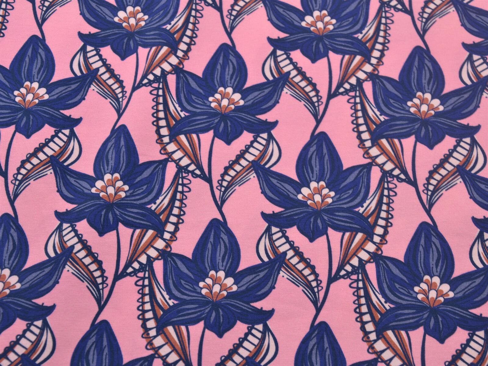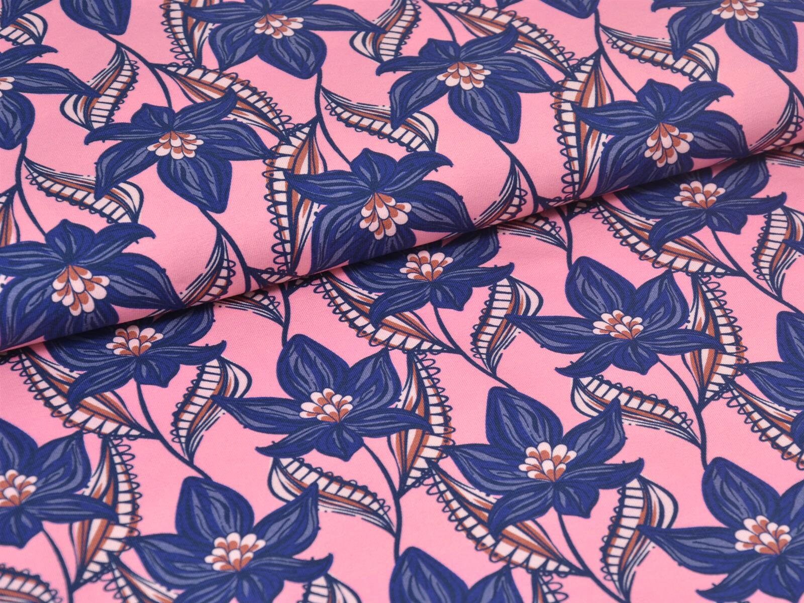 Hochwertiger Baumwoll-Jersey aus dem Hause Hilco. Dunkelblau Lilienblüten aus rosa Stoff. Er hat eine glatte Oberfläche und bietet ein tolles Tragegefühl dank Elastan. Dieser dünne Stoff ist super geeignet für T-Shirts, Langarmshirts, Kleider, Tops etc.