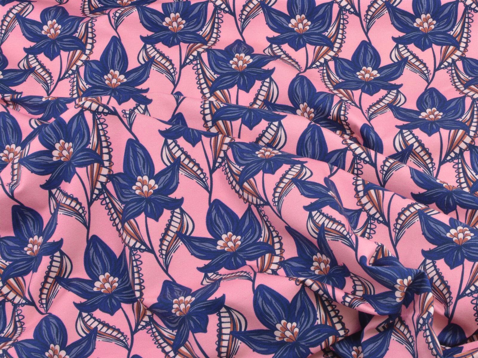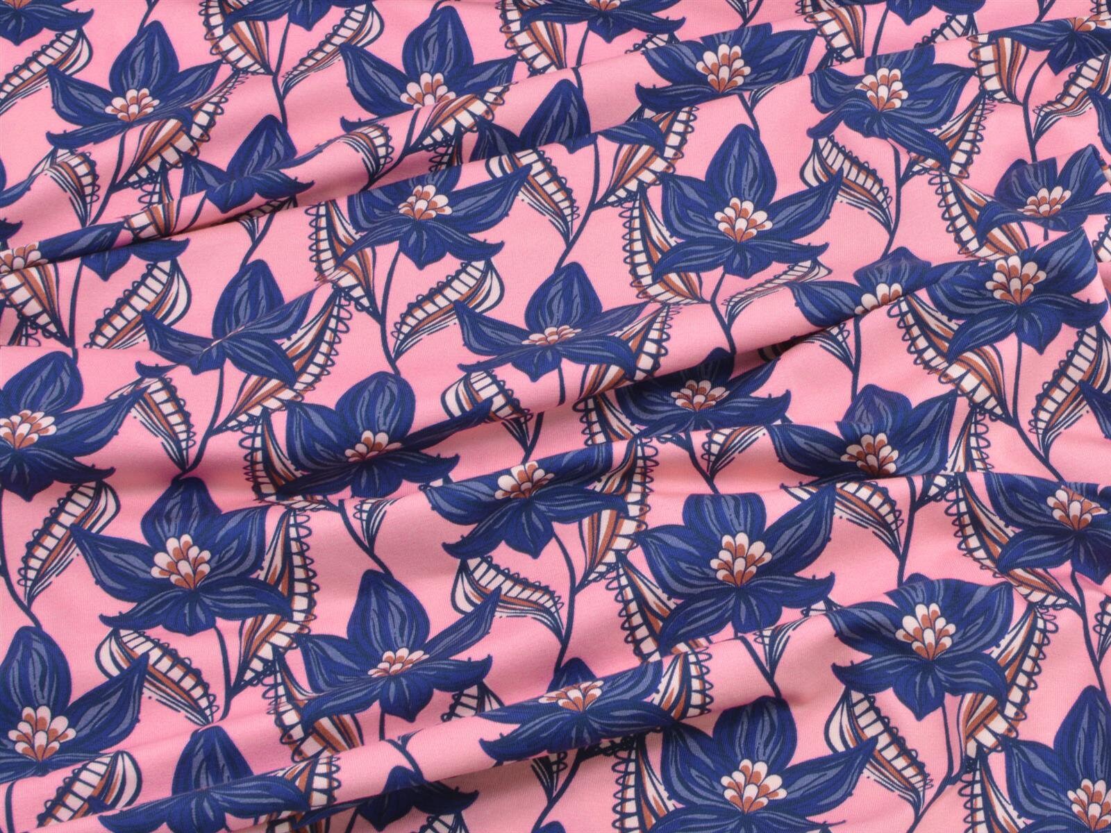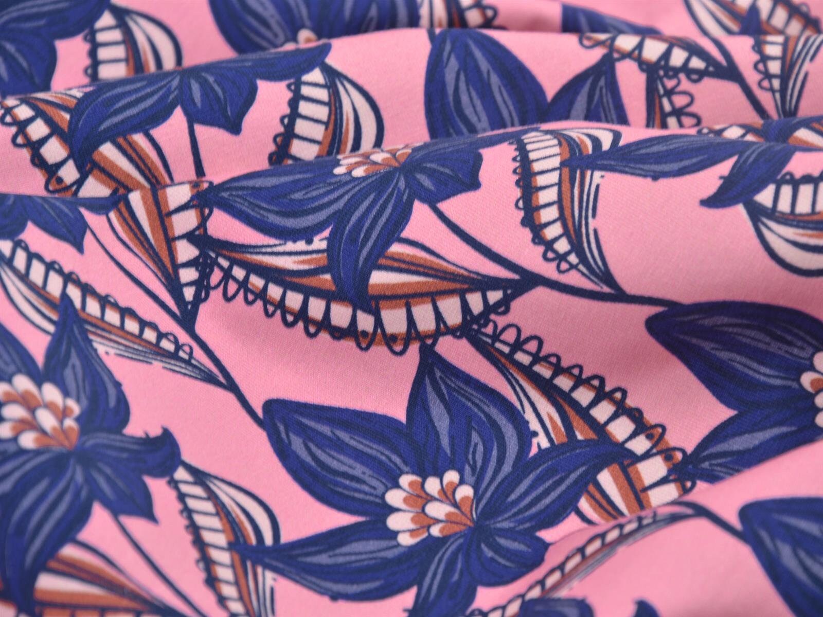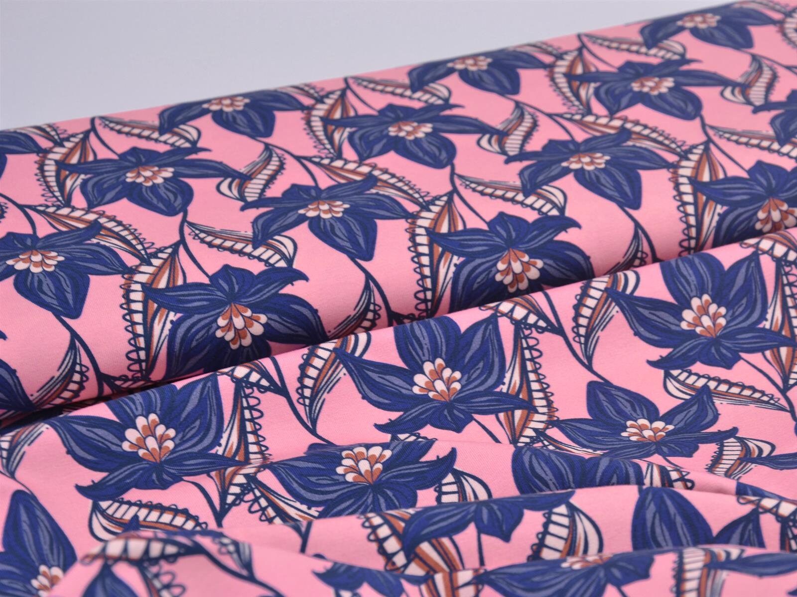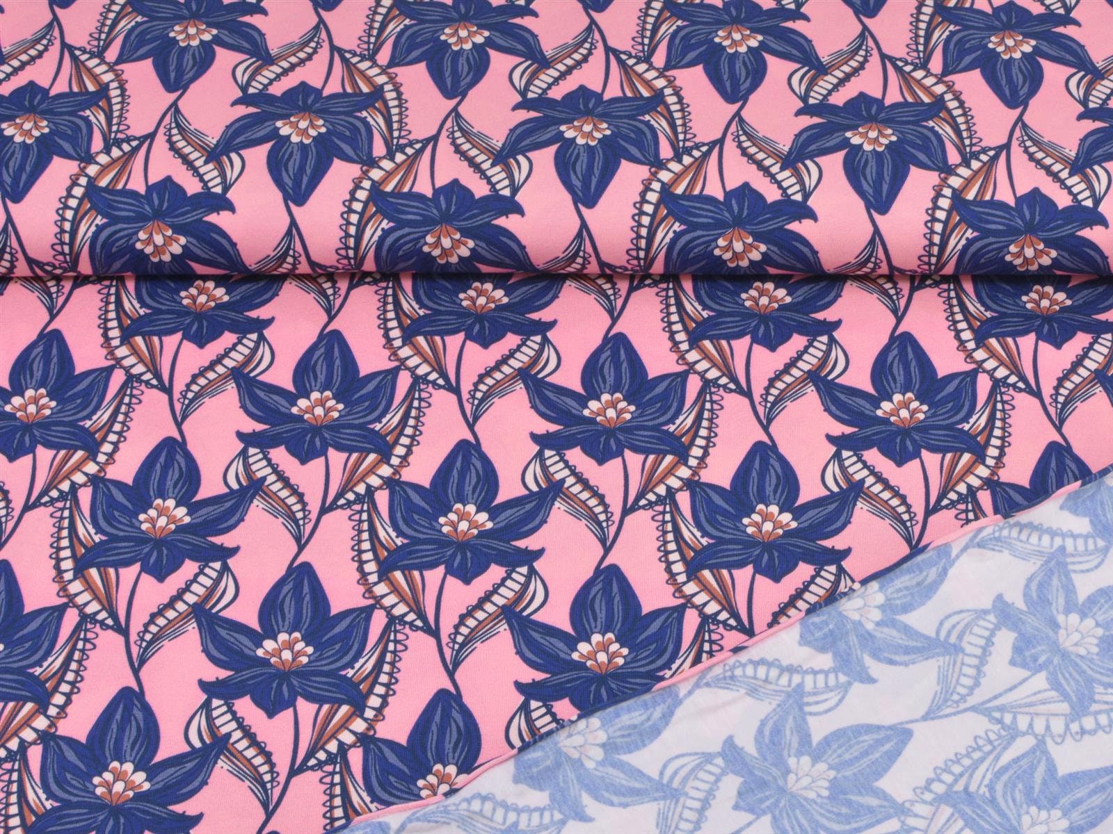 Hochwertiger Baumwoll-Jersey aus dem Hause Hilco. Dunkelblau Lilienblüten aus rosa Stoff. Er hat eine glatte Oberfläche und bietet ein tolles Tragegefühl dank Elastan. Dieser dünne Stoff ist super geeignet für T-Shirts, Langarmshirts, Kleider, Tops etc.