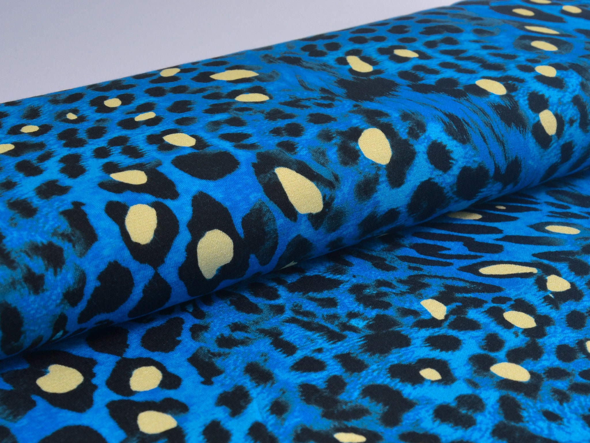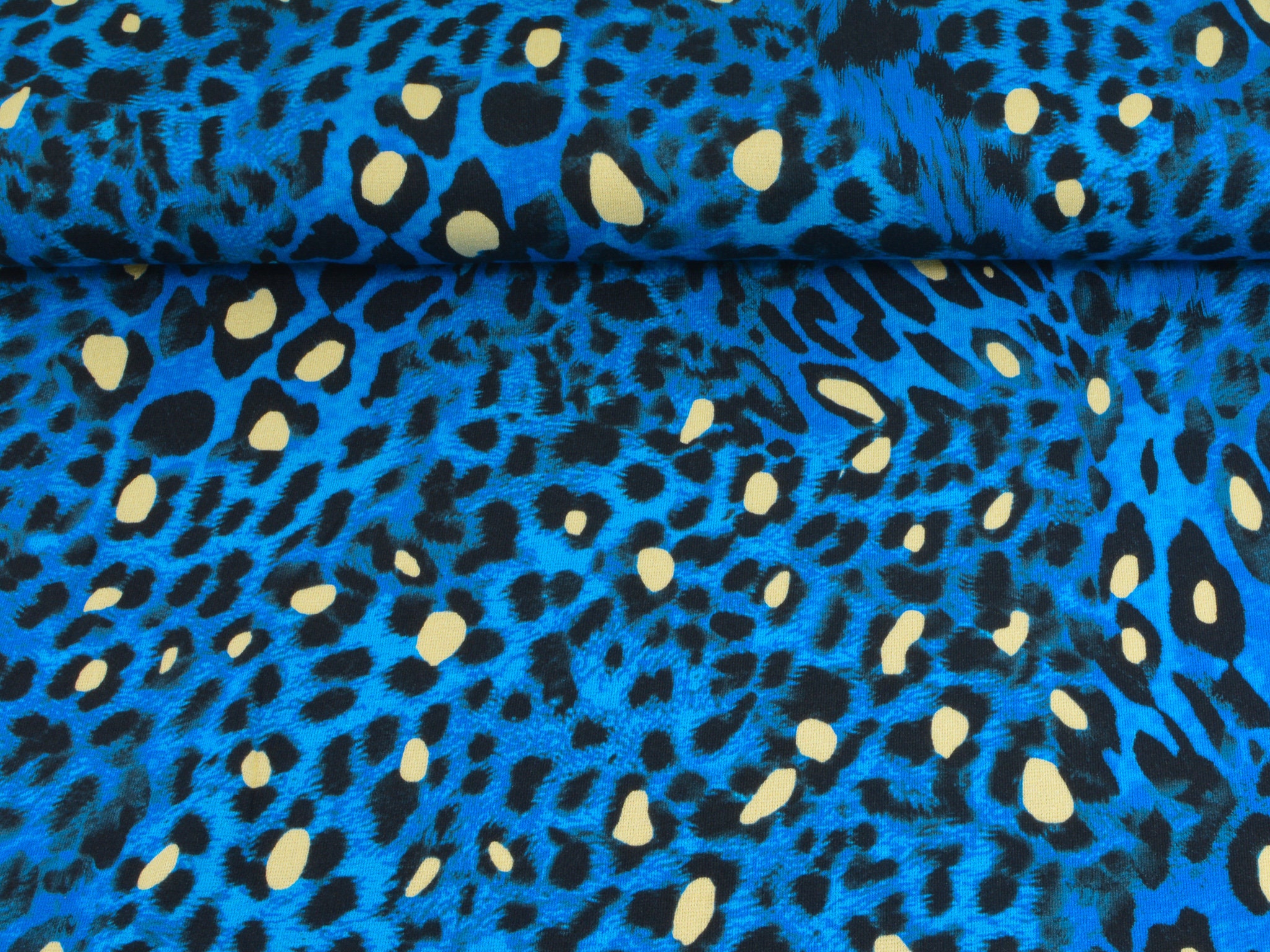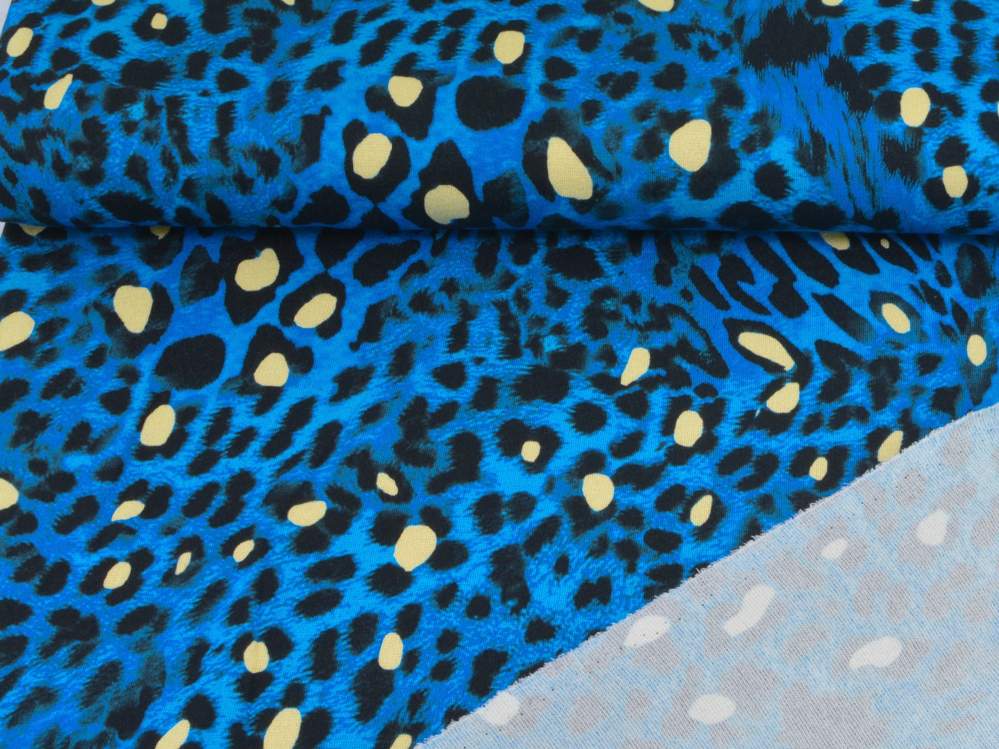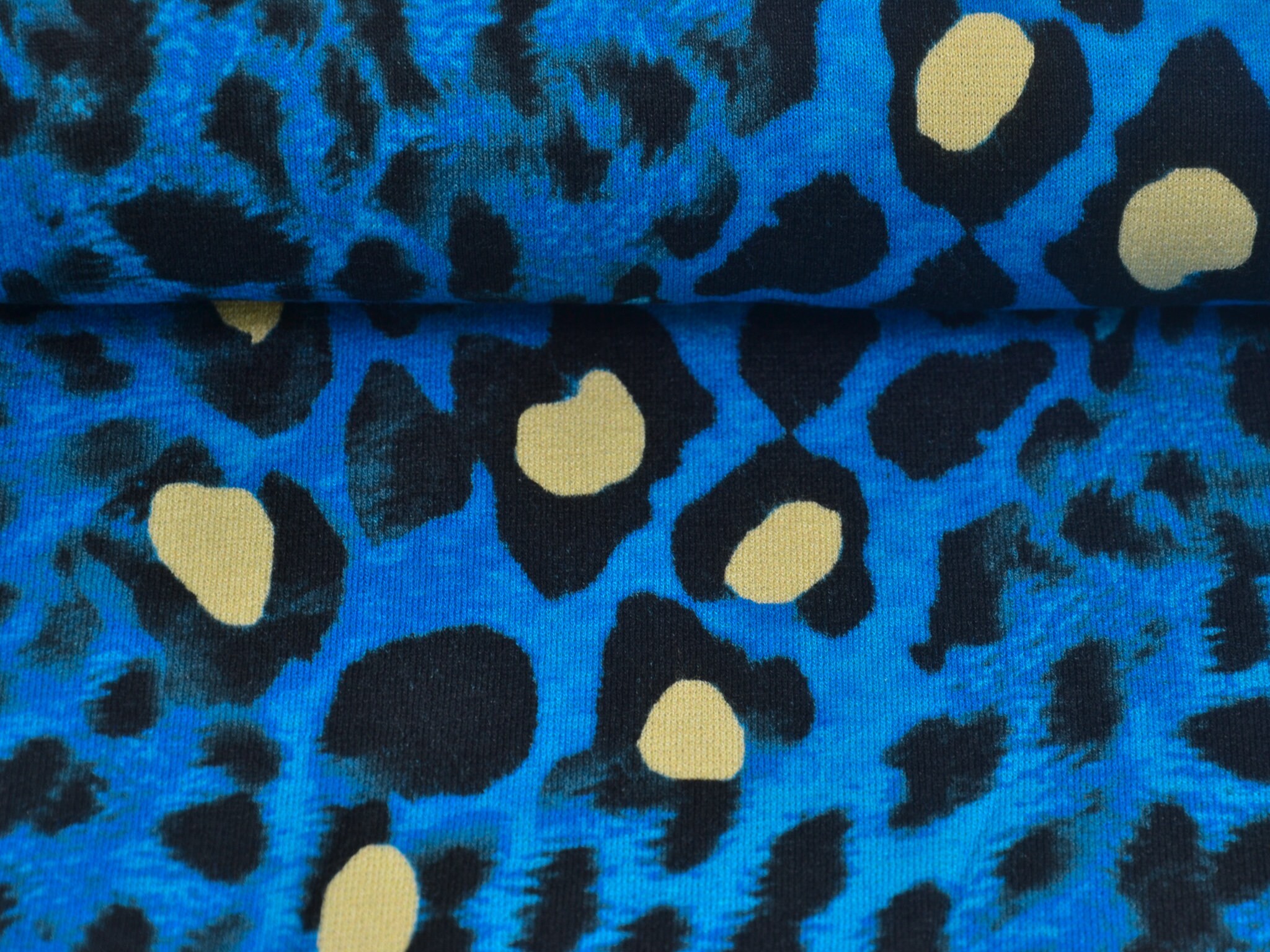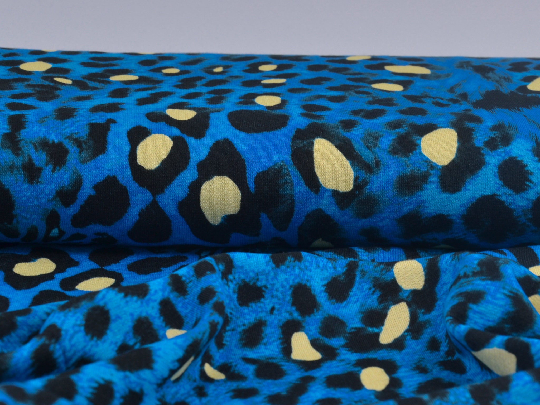 "Conny" ist ein Strickstoff mit Leo-Muster. Der Untergrund ist blau meliert, das Leo-Muster ist schwarz mit gelben Akzenten. Der hochwertige Viskose-Strick kommt aus dem Hause Hilco. Er eignet sich perfekt für Kleider, T-Shirts und Langarmshirts.