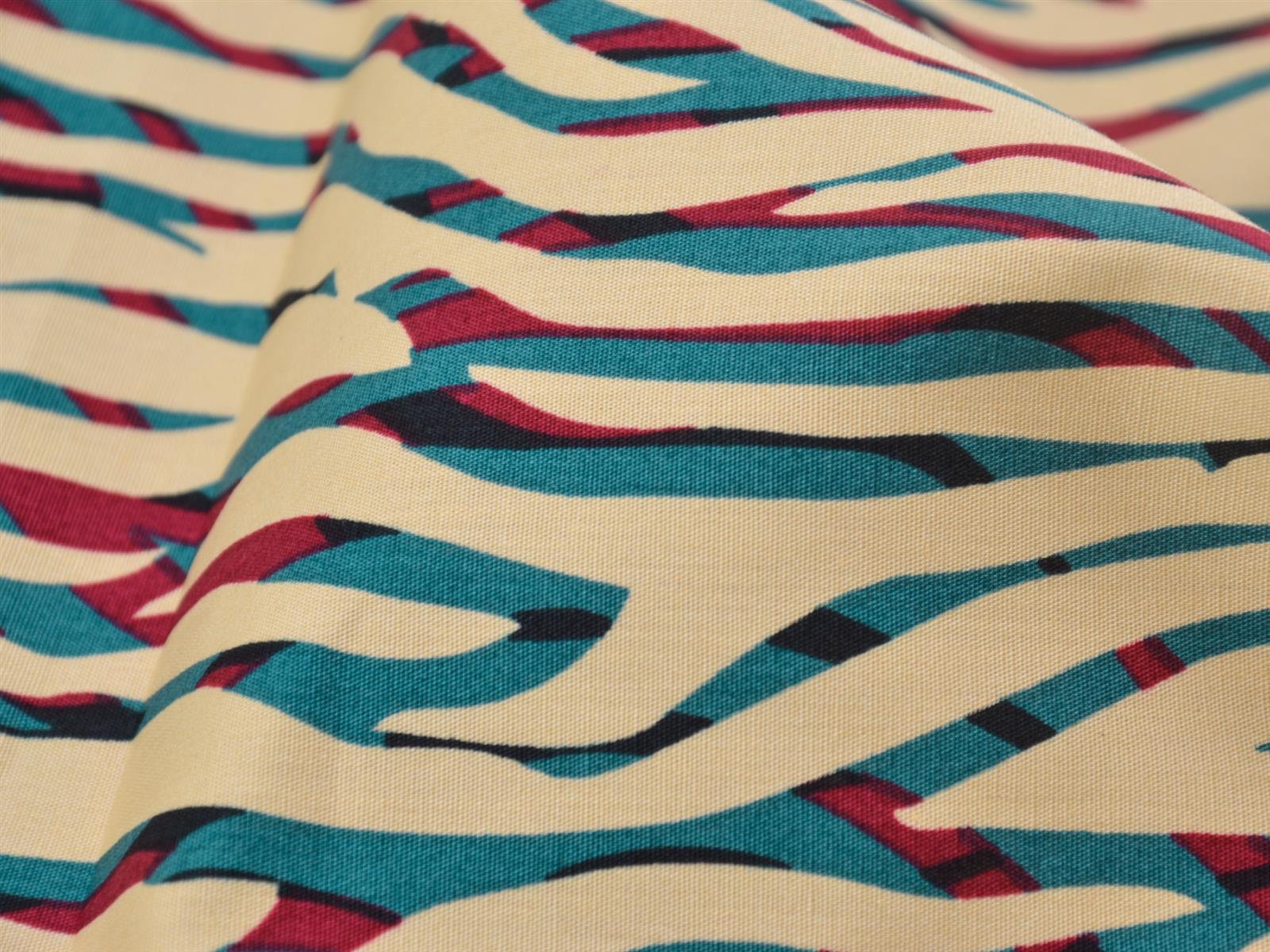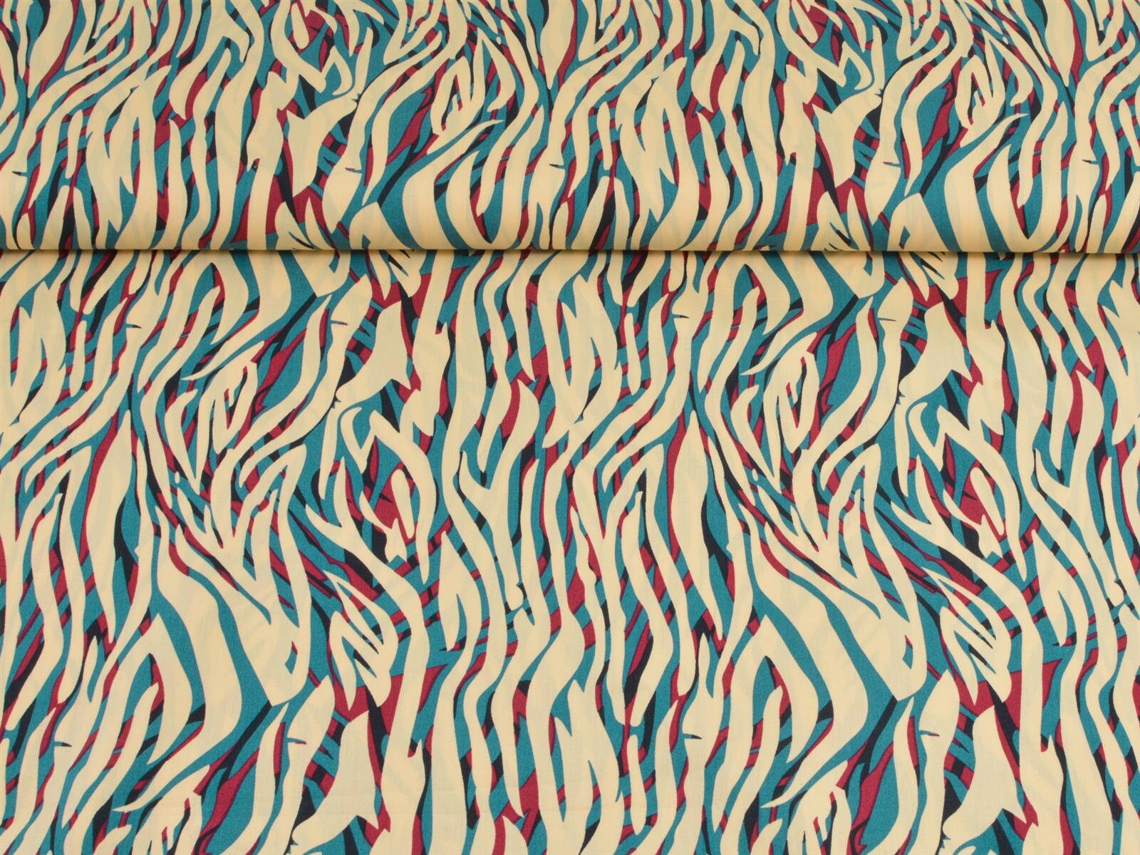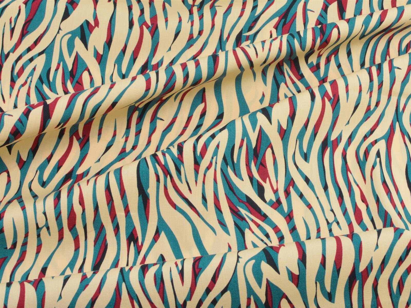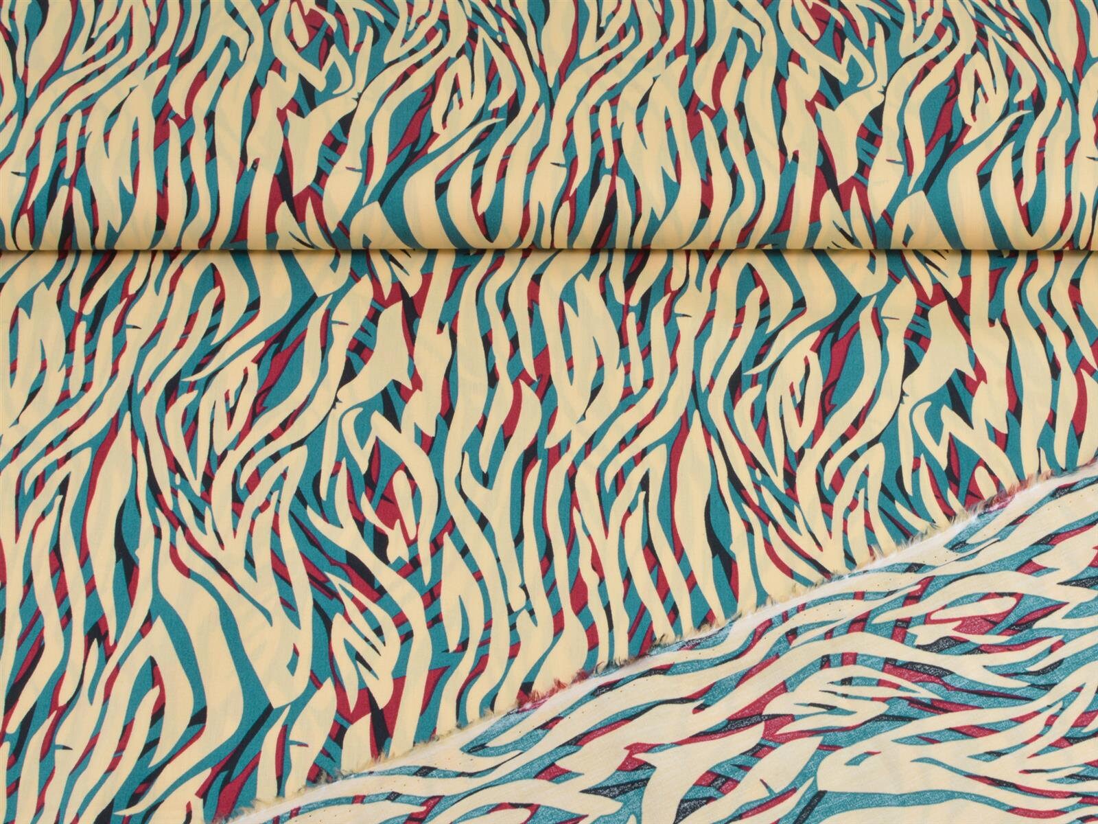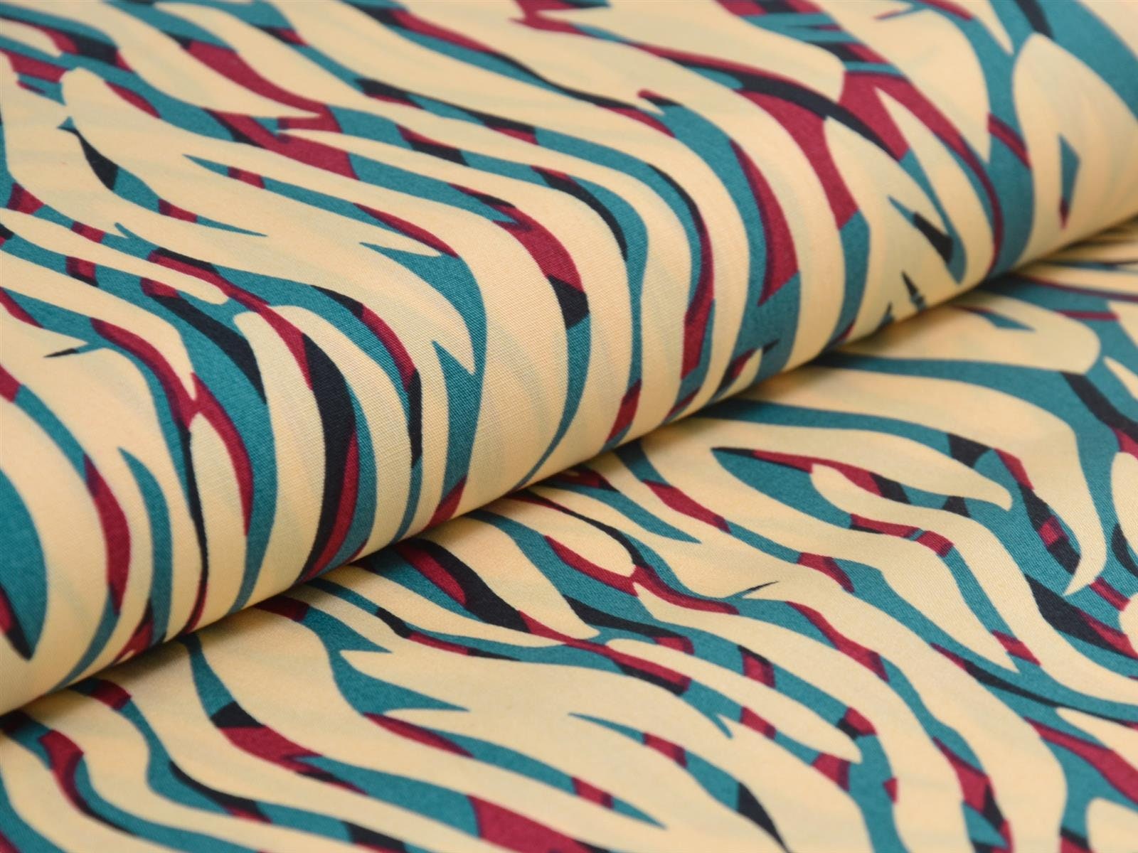 Blusenstoff aus Baumwolle von Fibre Mood. Der Tierprint ist in hellgelb/vanille, petrol und kirschrot gehalten. Es setzt sich aus verschiedenen überlagernden Zebrasteifen zusammen. Der Stoff hat eine matte Optik. Er ist ein wunderbar leichter Blusenstoff, locker luftig und eignet sich deshalb auch für lange Röcke, Kleider, Blusenkleider, fließende Hosen etc. Fibre Mood Modell Josephine.